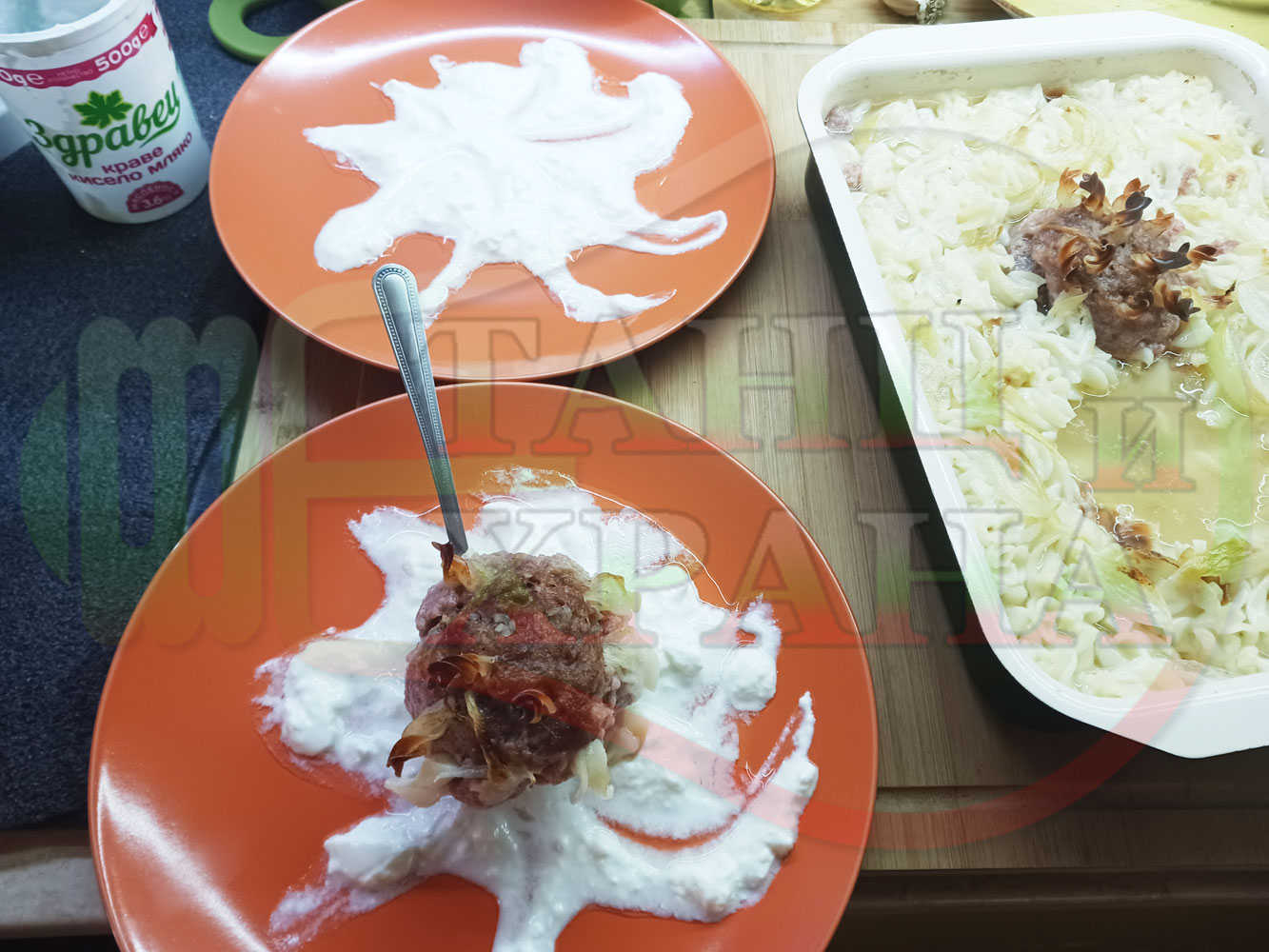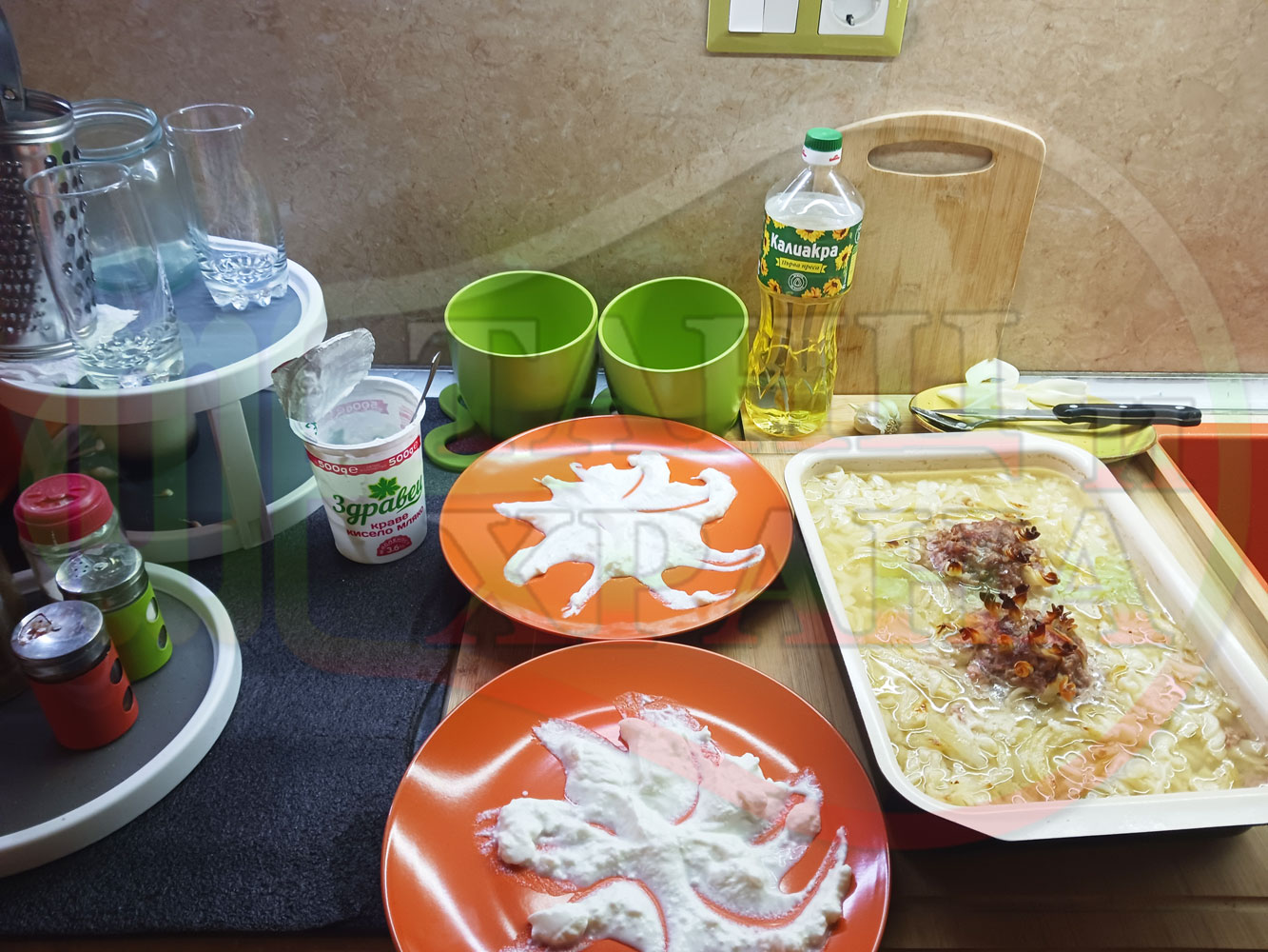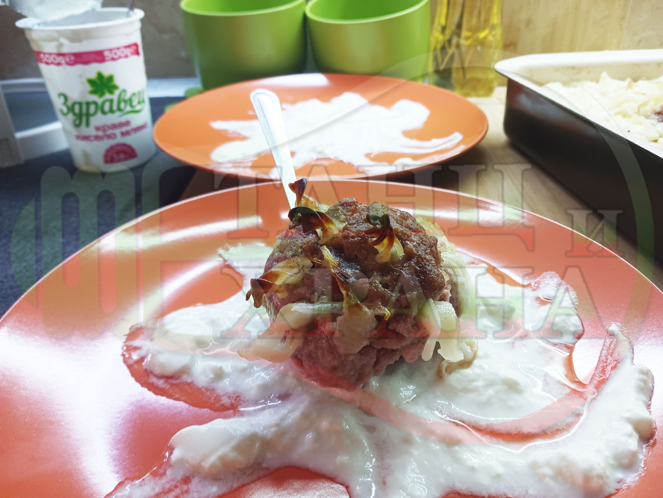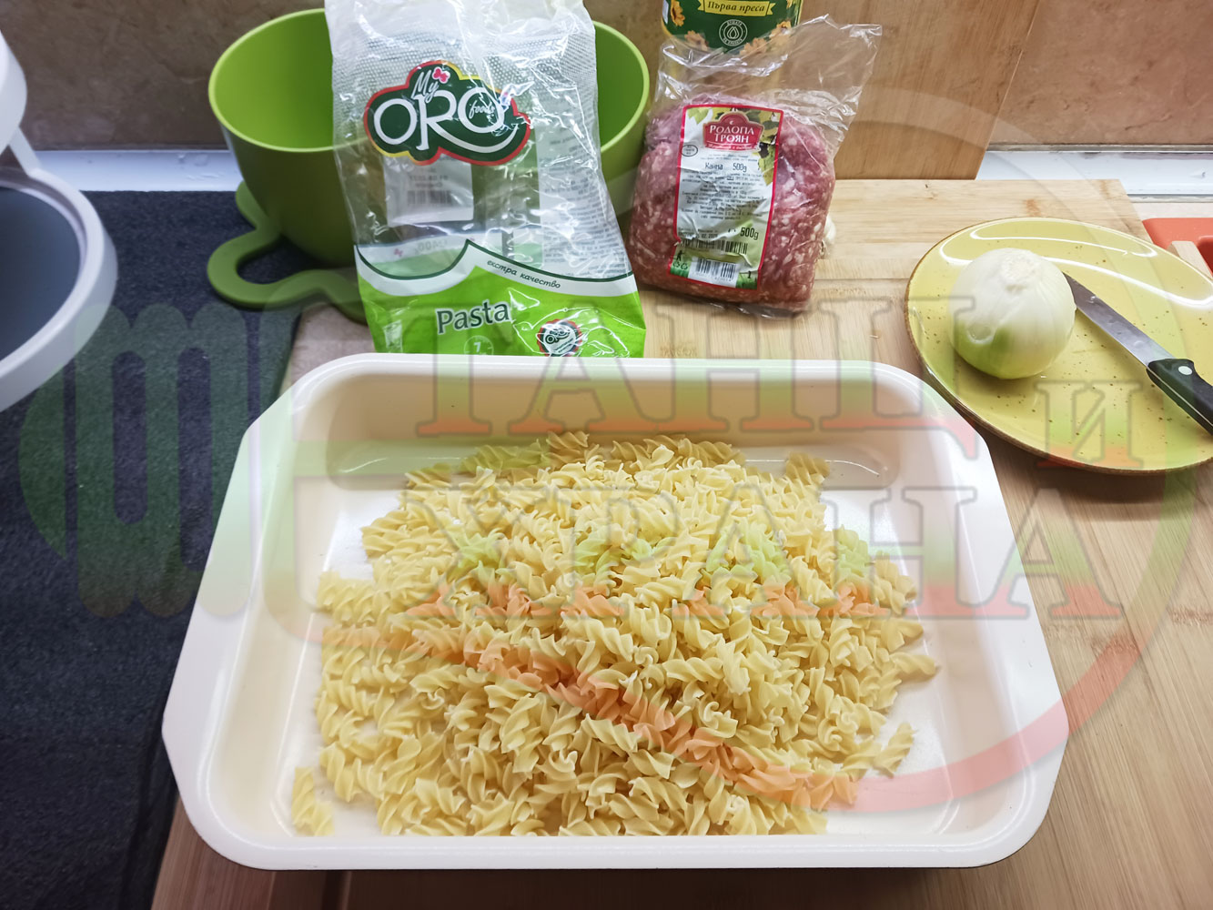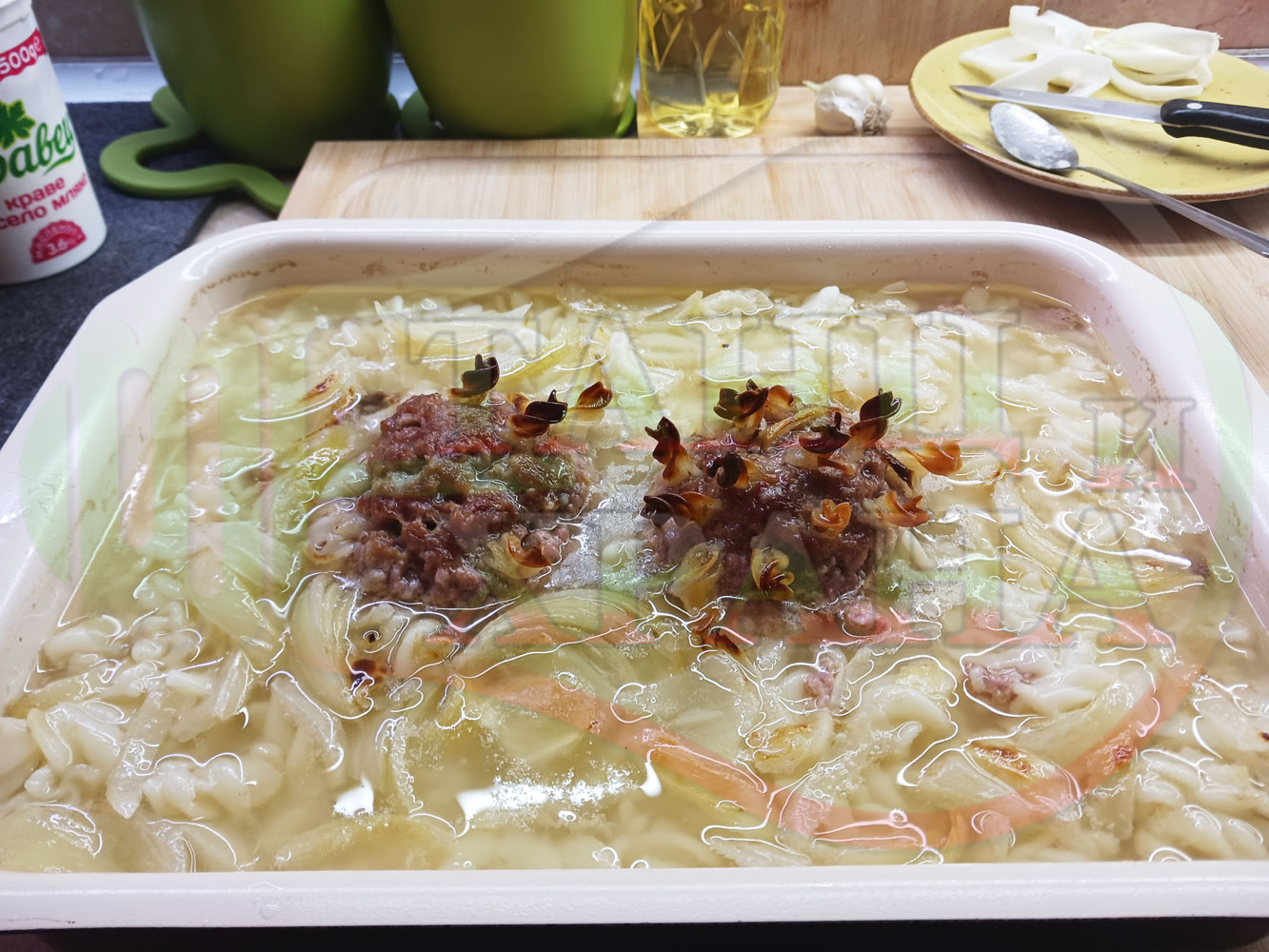 Спретнах изключително вкусни макарони с каймяни топчести кюфтета от неовкусена кайма, които набодох с малка част от витите макарони. Сварих и леко запекох топчестите макарони на фурна с кромид лук и ги гарнирах с млечна основа с българско кисело мляко от България. Макароните се получиха изключително вкусни, обогатени от соковете на каймата и сладостта на леко карамелизирания кромид лук и отново се получи невероятна вкусно, вкусна, вкусотия (вкуснотия). ![]()