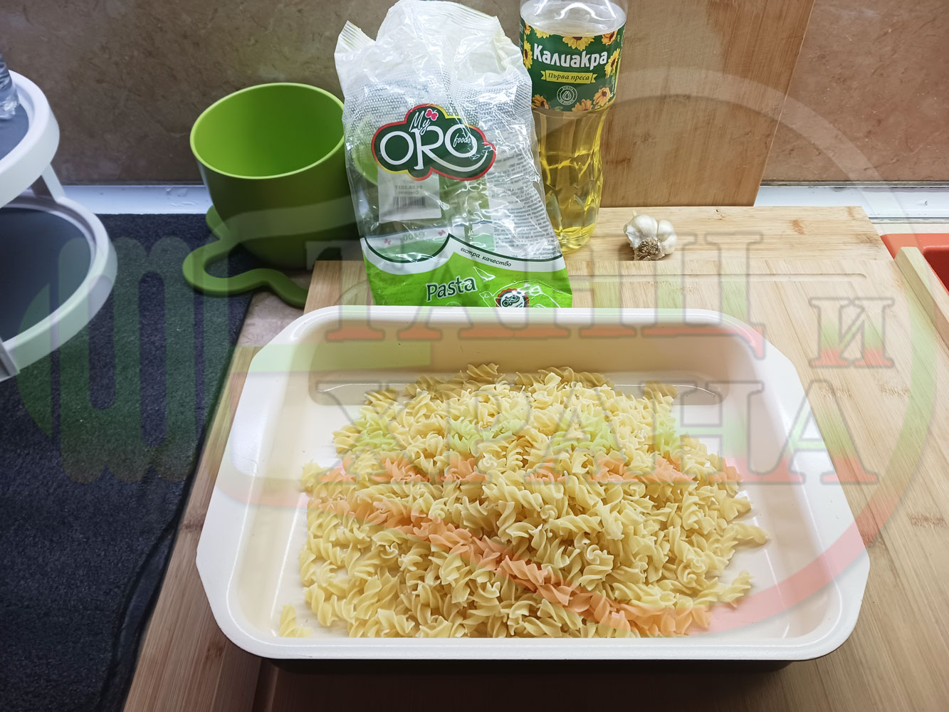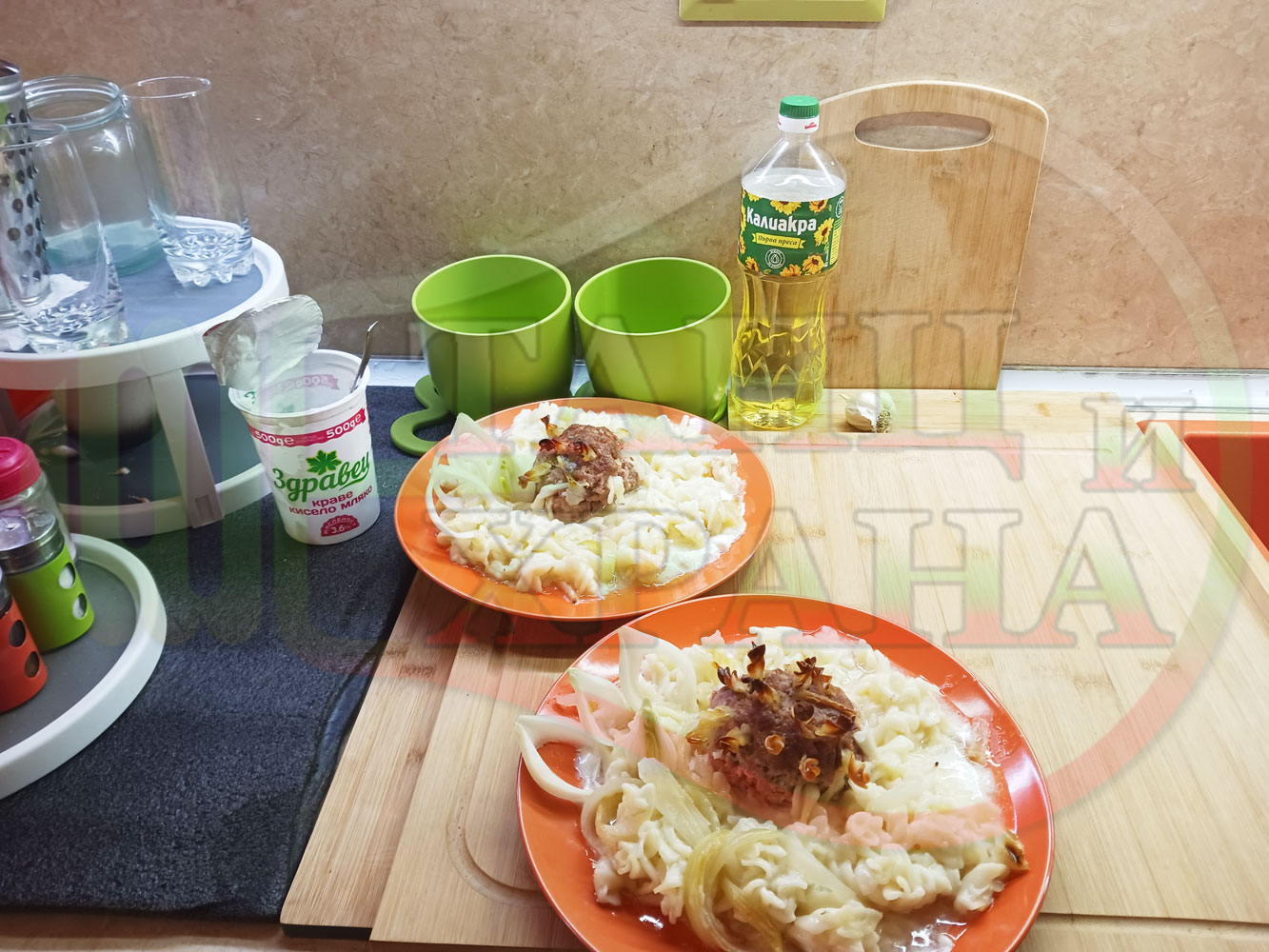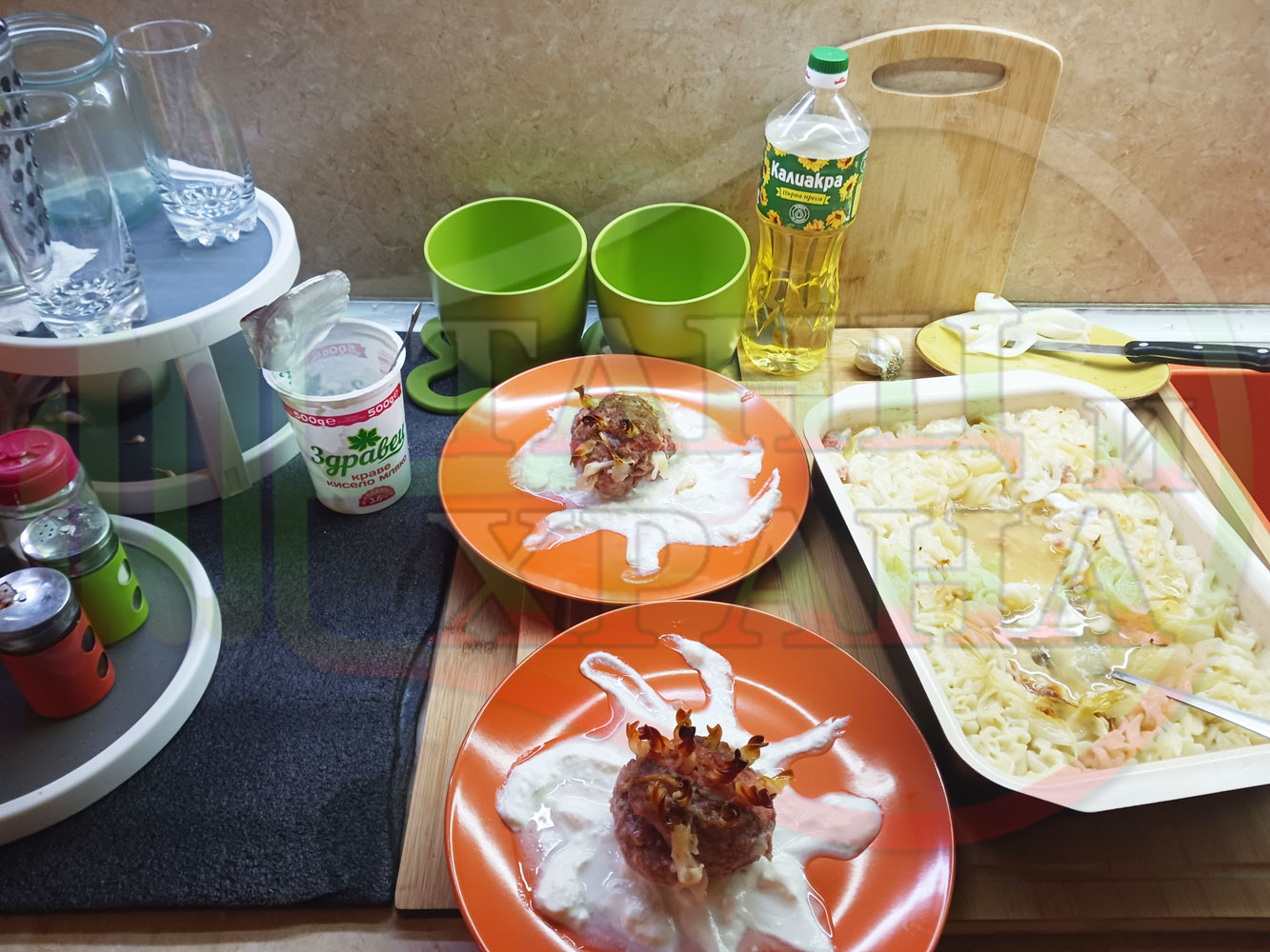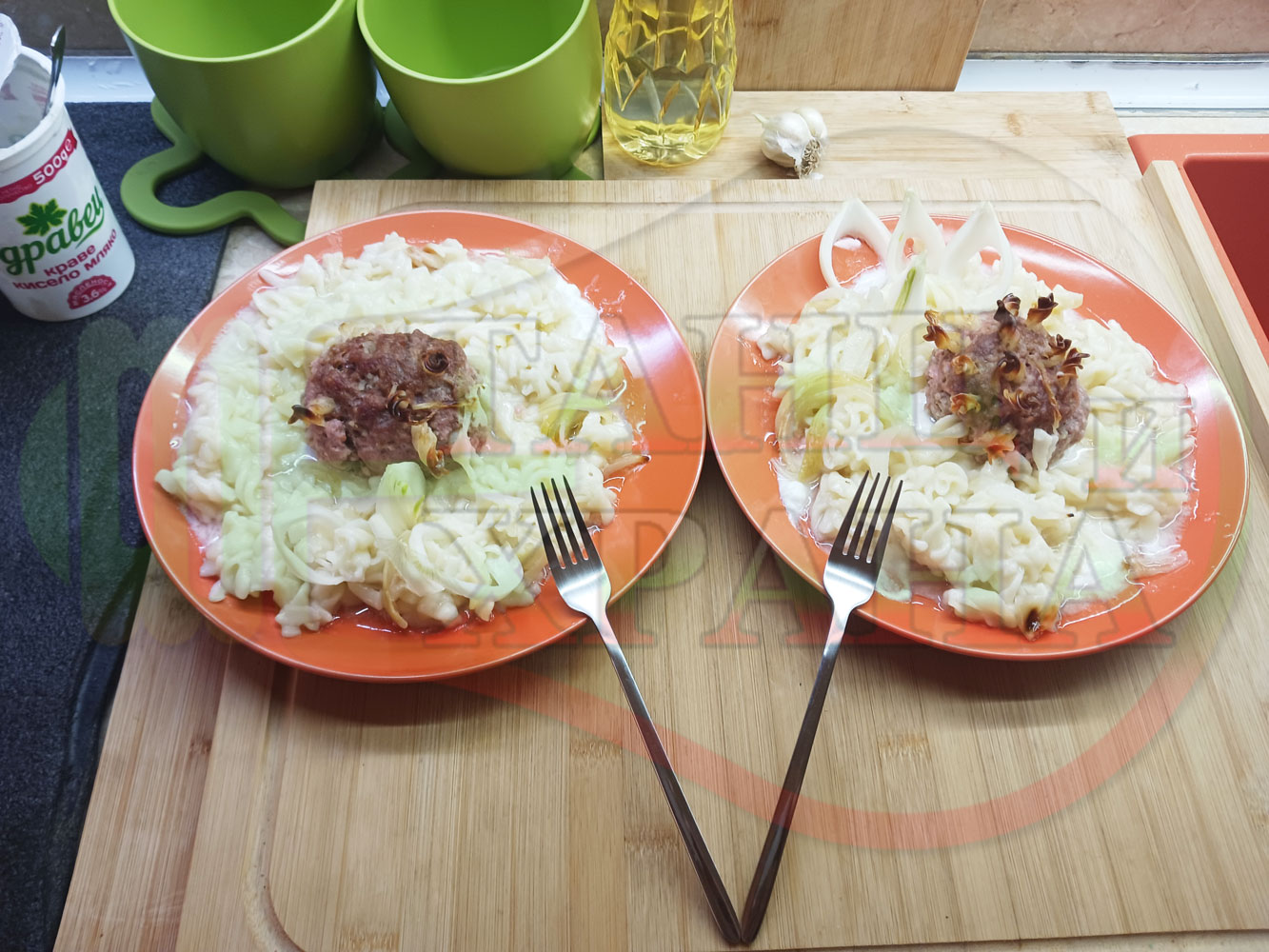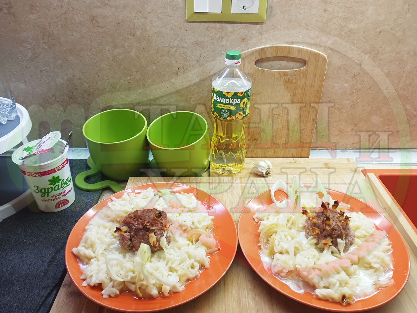Спретнах изключително вкусни макарони с каймяни топчести кюфтета от неовкусена кайма, които набодох с малка част от витите макарони. Сварих и леко запекох топчестите макарони на фурна с кромид лук и ги гарнирах с млечна основа с българско кисело мляко от България. Макароните се получиха изключително вкусни, обогатени от соковете на каймата и сладостта на леко карамелизирания кромид лук и отново се получи невероятна вкусно, вкусна, вкусотия (вкуснотия). ![]()