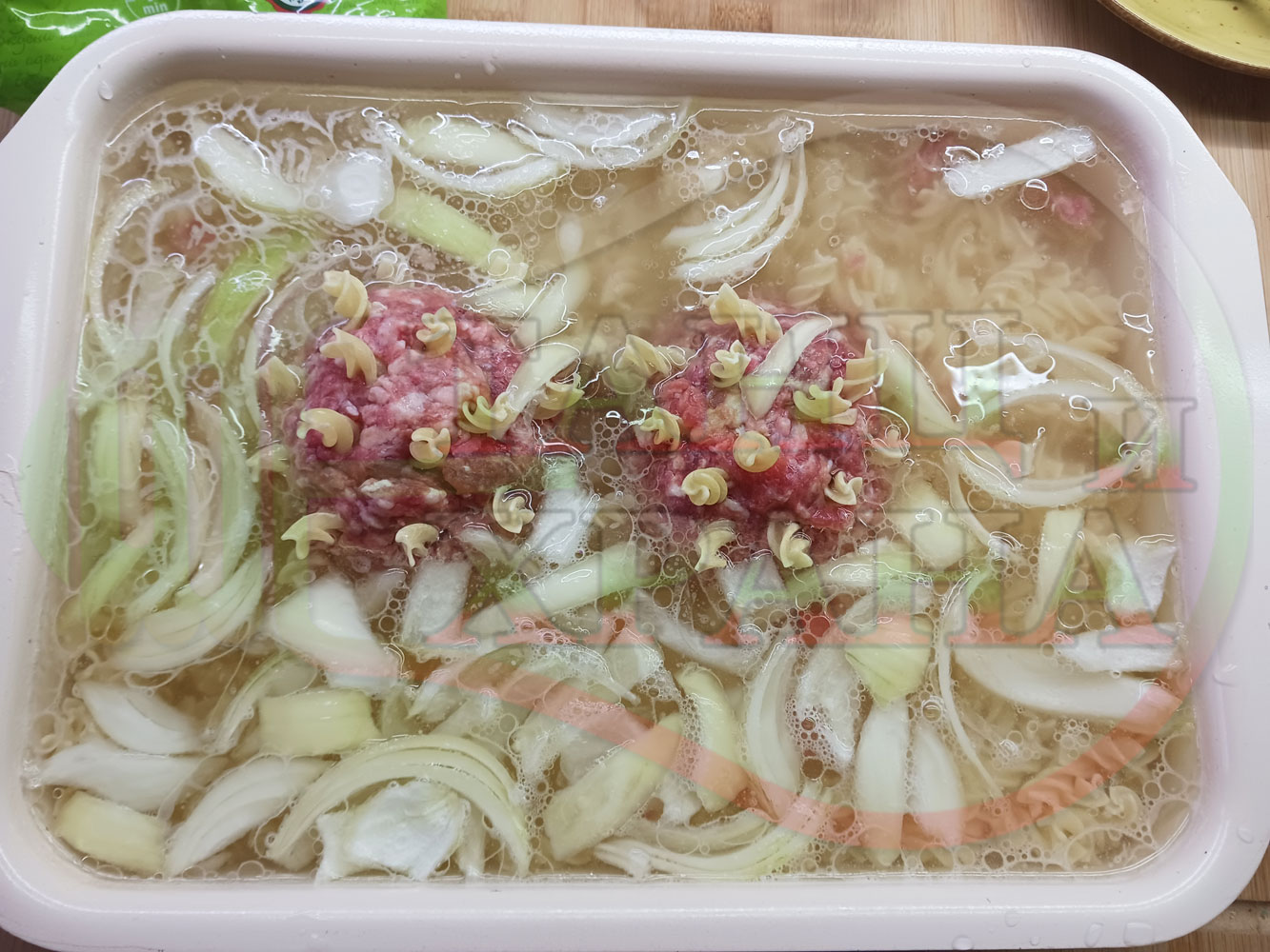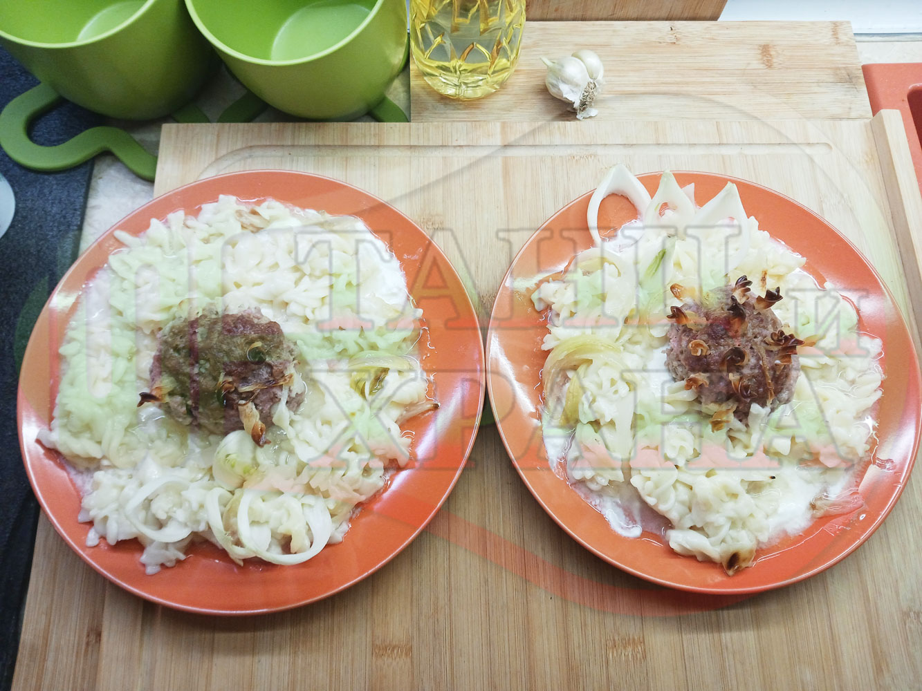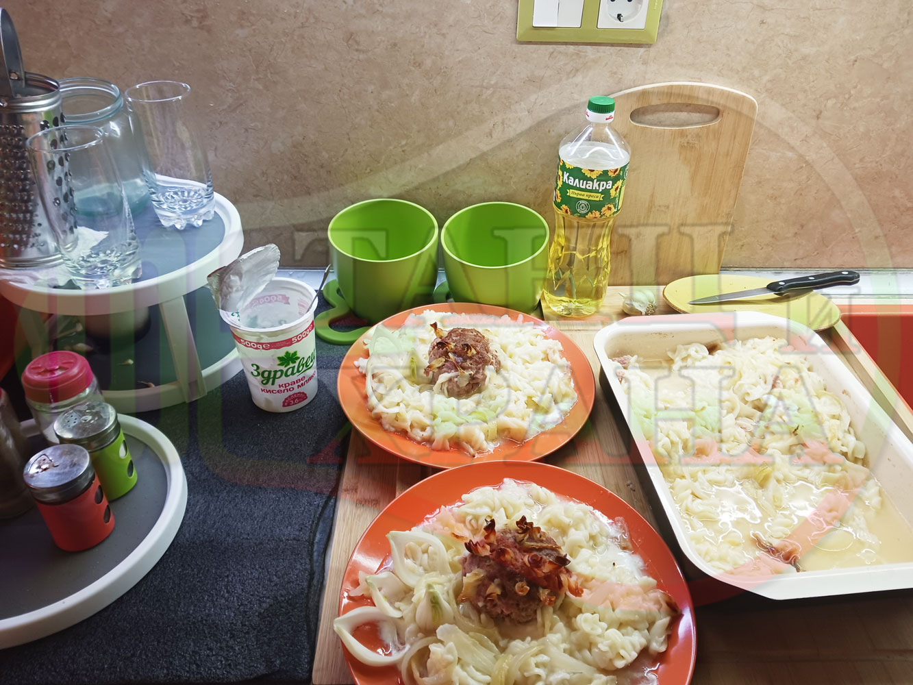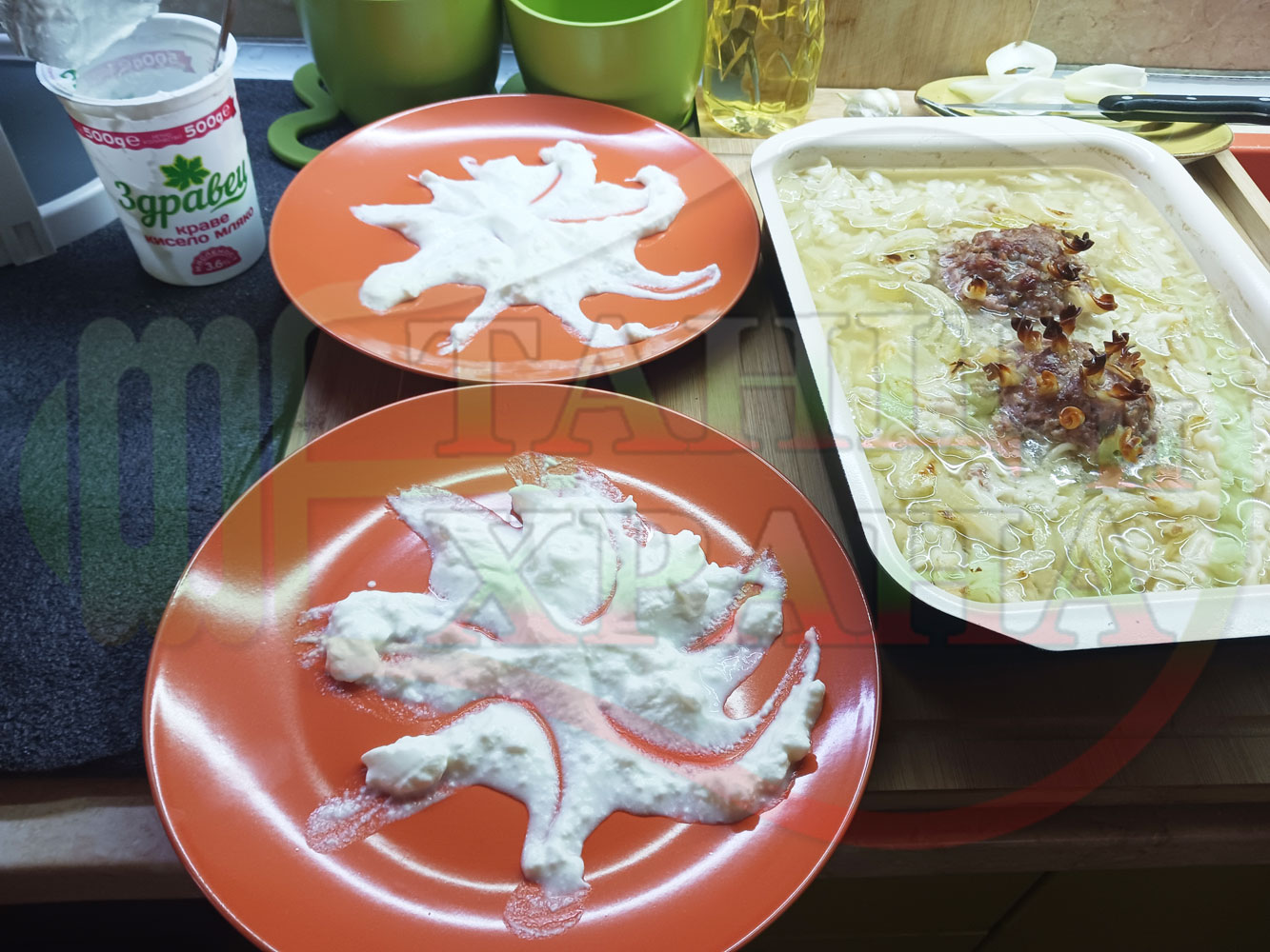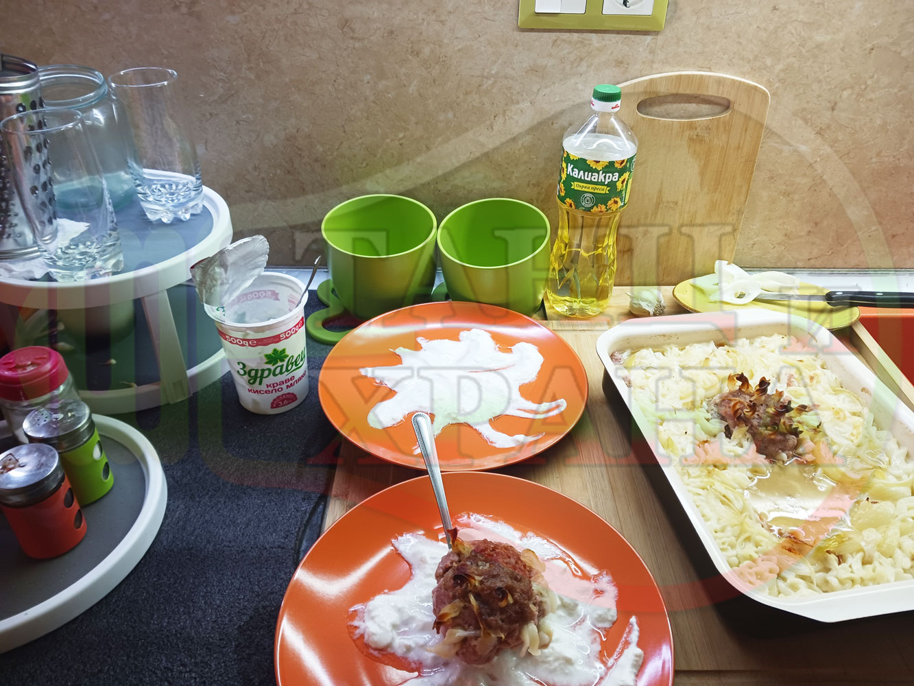 Спретнах изключително вкусни макарони с каймяни топчести кюфтета от неовкусена кайма, които набодох с малка част от витите макарони. Сварих и леко запекох топчестите макарони на фурна с кромид лук и ги гарнирах с млечна основа с българско кисело мляко от България. Макароните се получиха изключително вкусни, обогатени от соковете на каймата и сладостта на леко карамелизирания кромид лук и отново се получи невероятна вкусно, вкусна, вкусотия (вкуснотия). ![]()