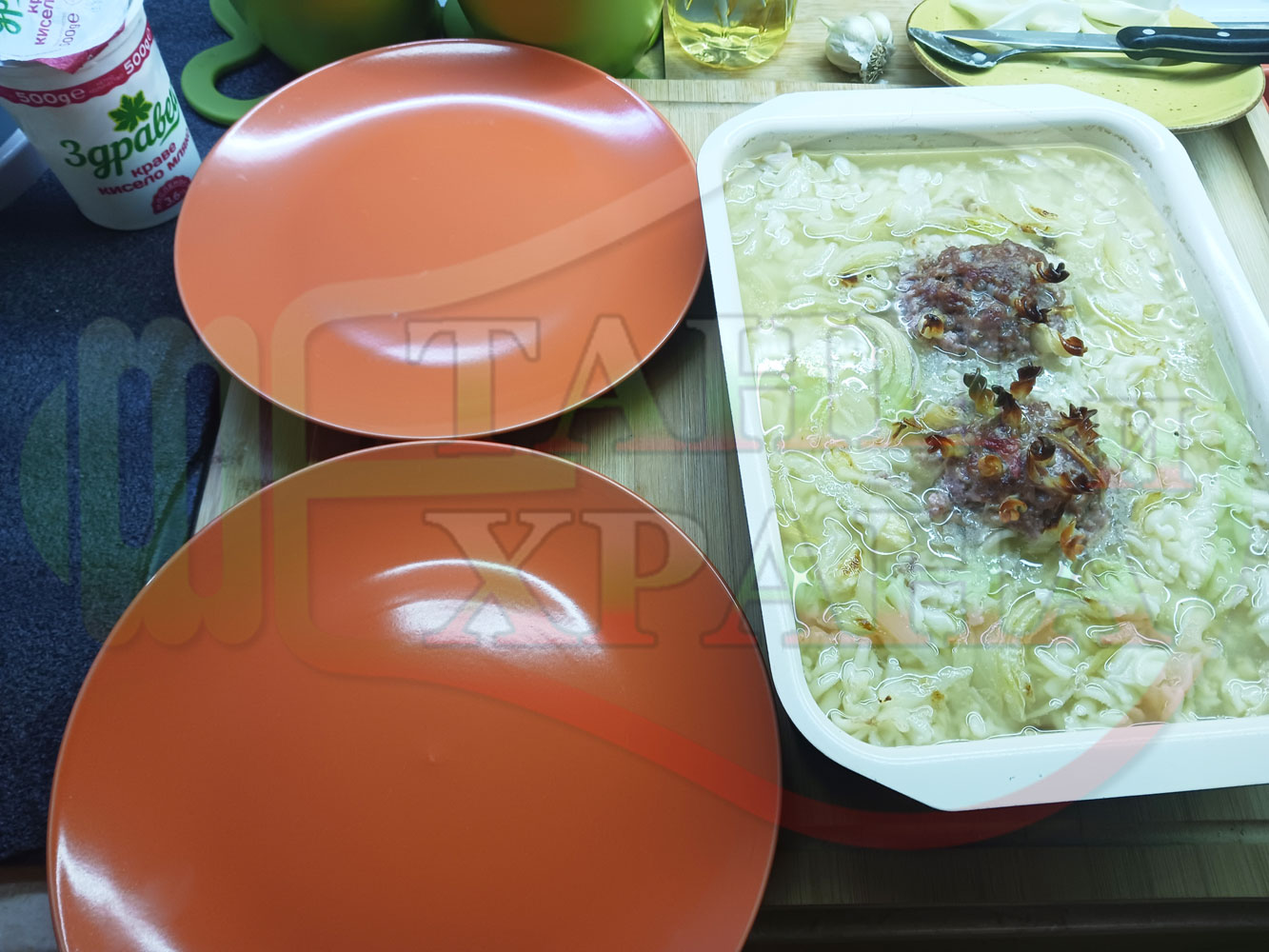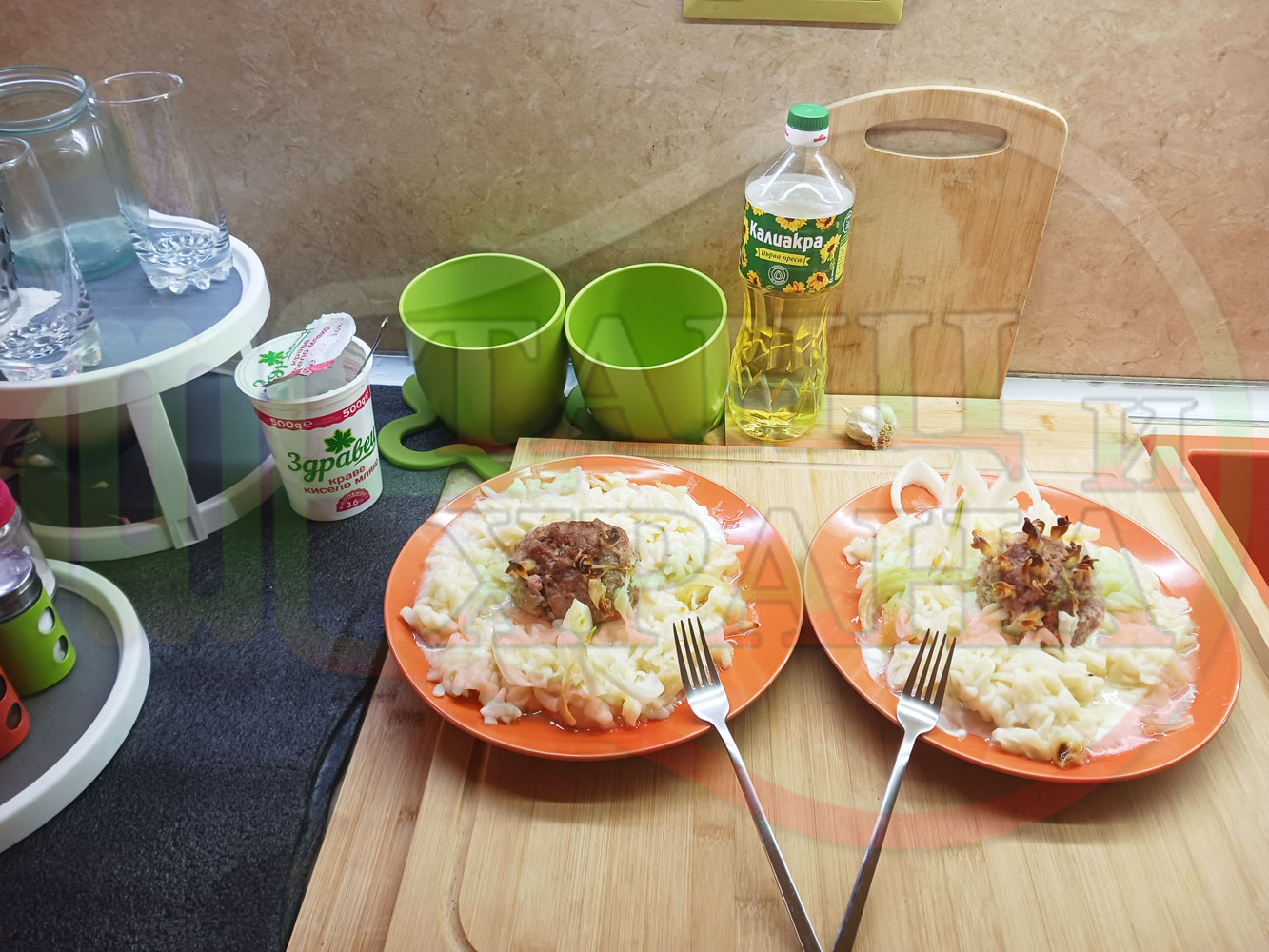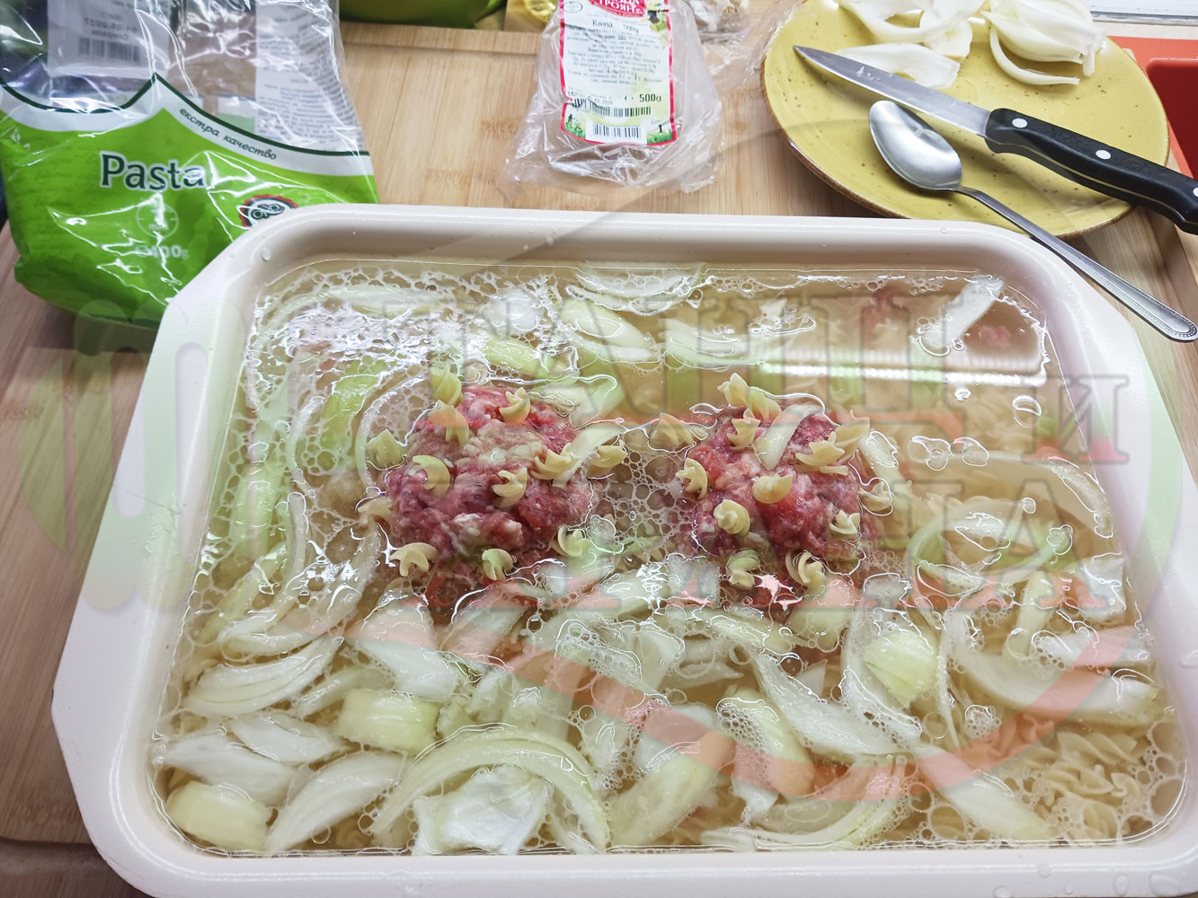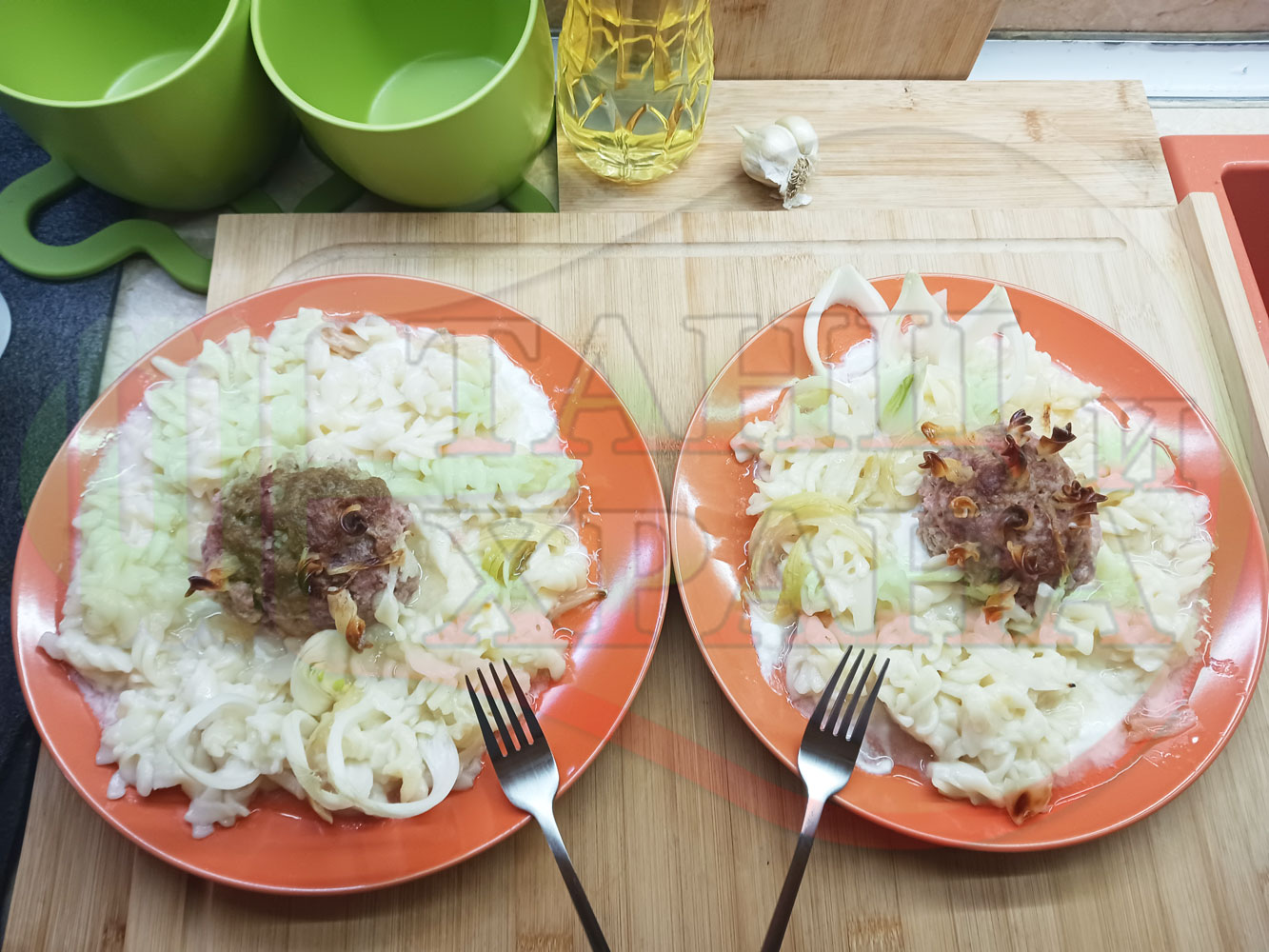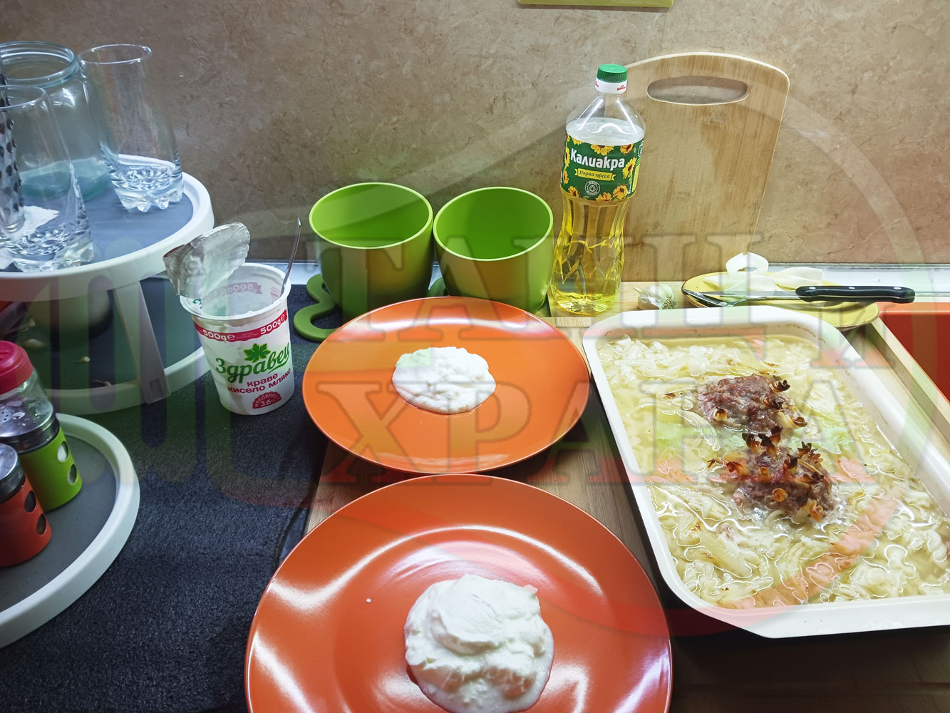 Спретнах изключително вкусни макарони с каймяни топчести кюфтета от неовкусена кайма, които набодох с малка част от витите макарони. Сварих и леко запекох топчестите макарони на фурна с кромид лук и ги гарнирах с млечна основа с българско кисело мляко от България. Макароните се получиха изключително вкусни, обогатени от соковете на каймата и сладостта на леко карамелизирания кромид лук и отново се получи невероятна вкусно, вкусна, вкусотия (вкуснотия). ![]()
