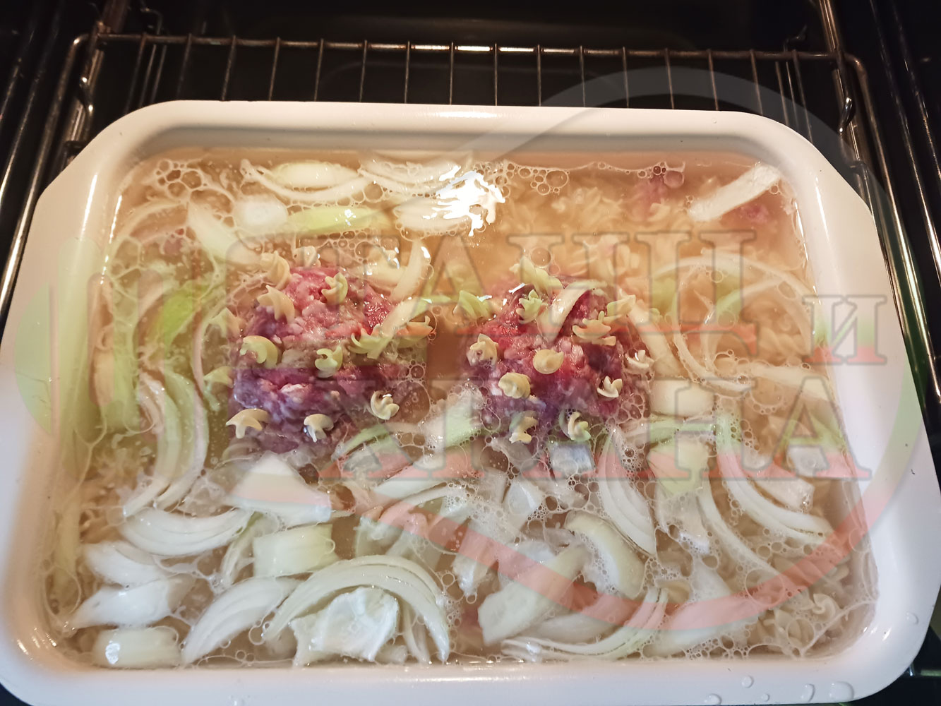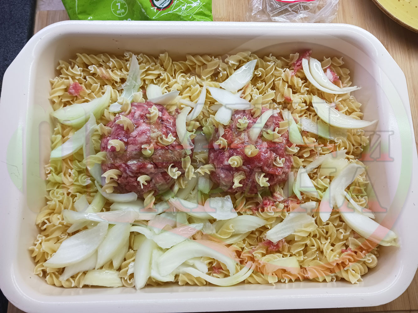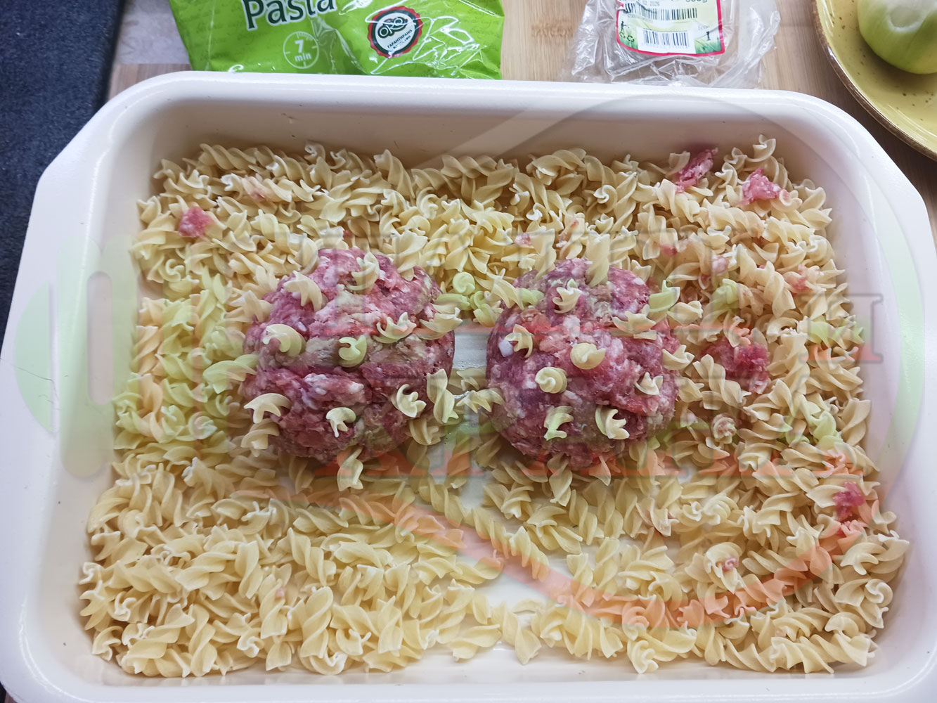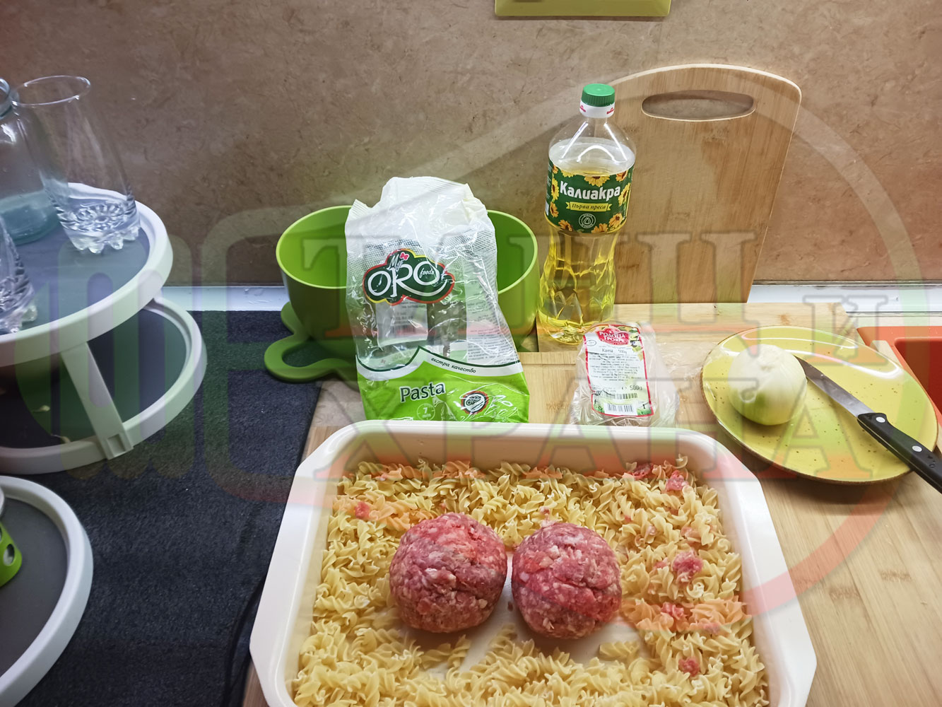ВНИМАНИЕ: Фурните са различни и съответно времето за сваряване и запичане е ориентировъчно. Наблюдавайте процеса на запичане и при необходимост покрийте с капак или отстранете тавата от фурната. Разбърквайте често макароните и обливайте със соса кюфтетата за да се запекат равномерно и макароните върху тях да се сварят и запекат до желаната от вас степен (средно запечени кюфтета или по-запечени кюфтета и разварени и запечени макарони).