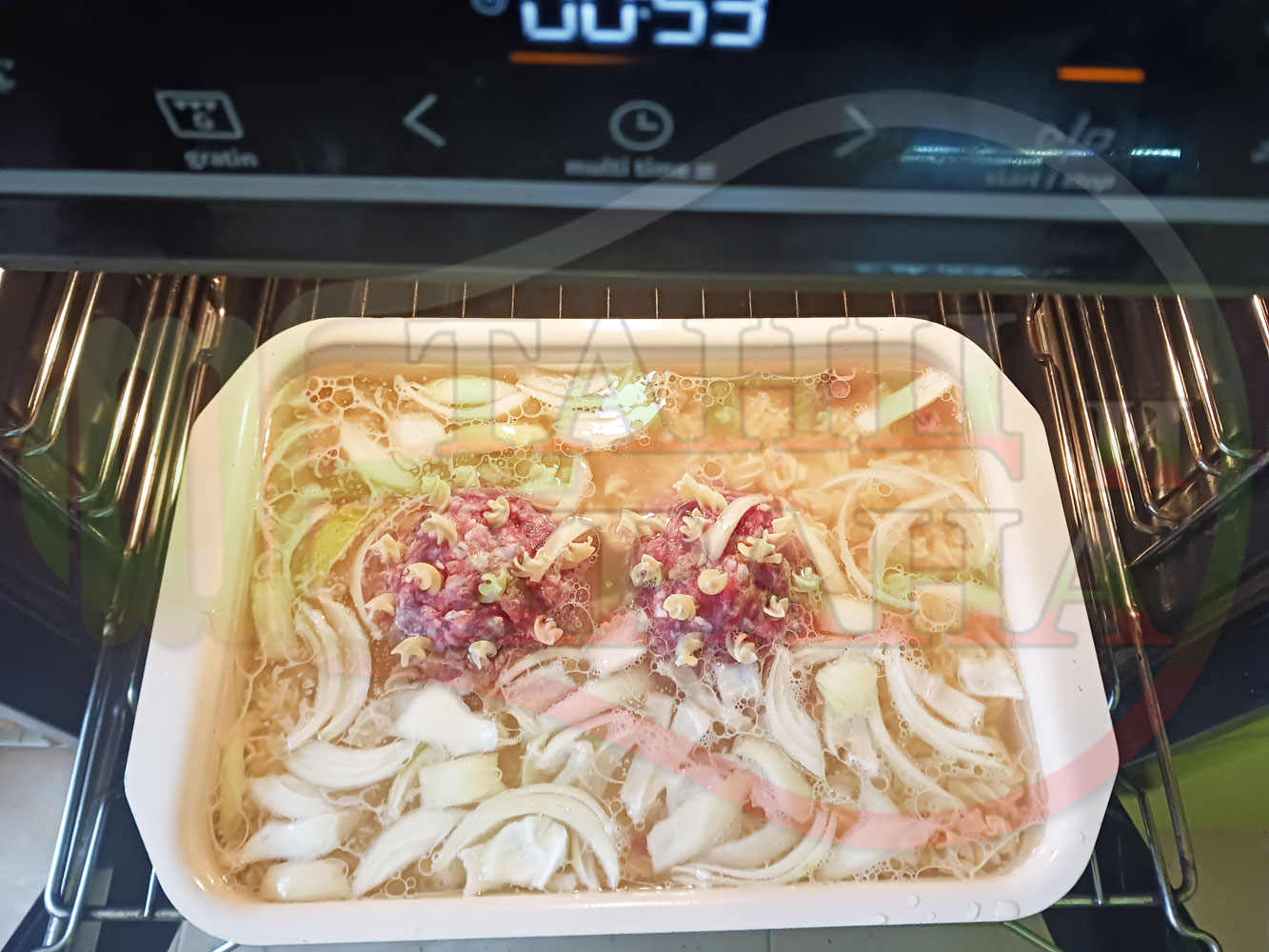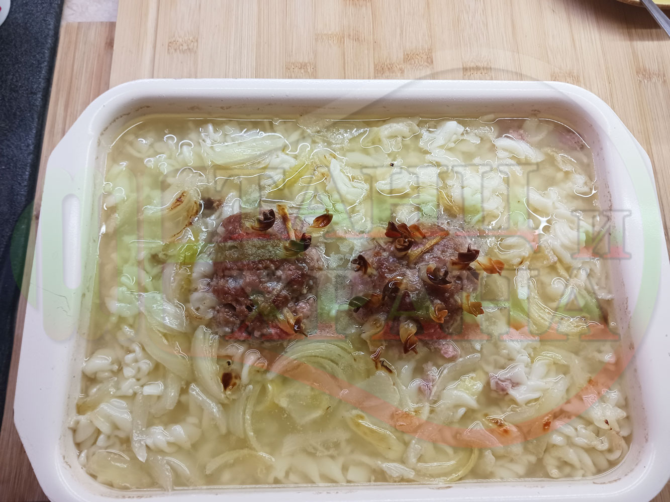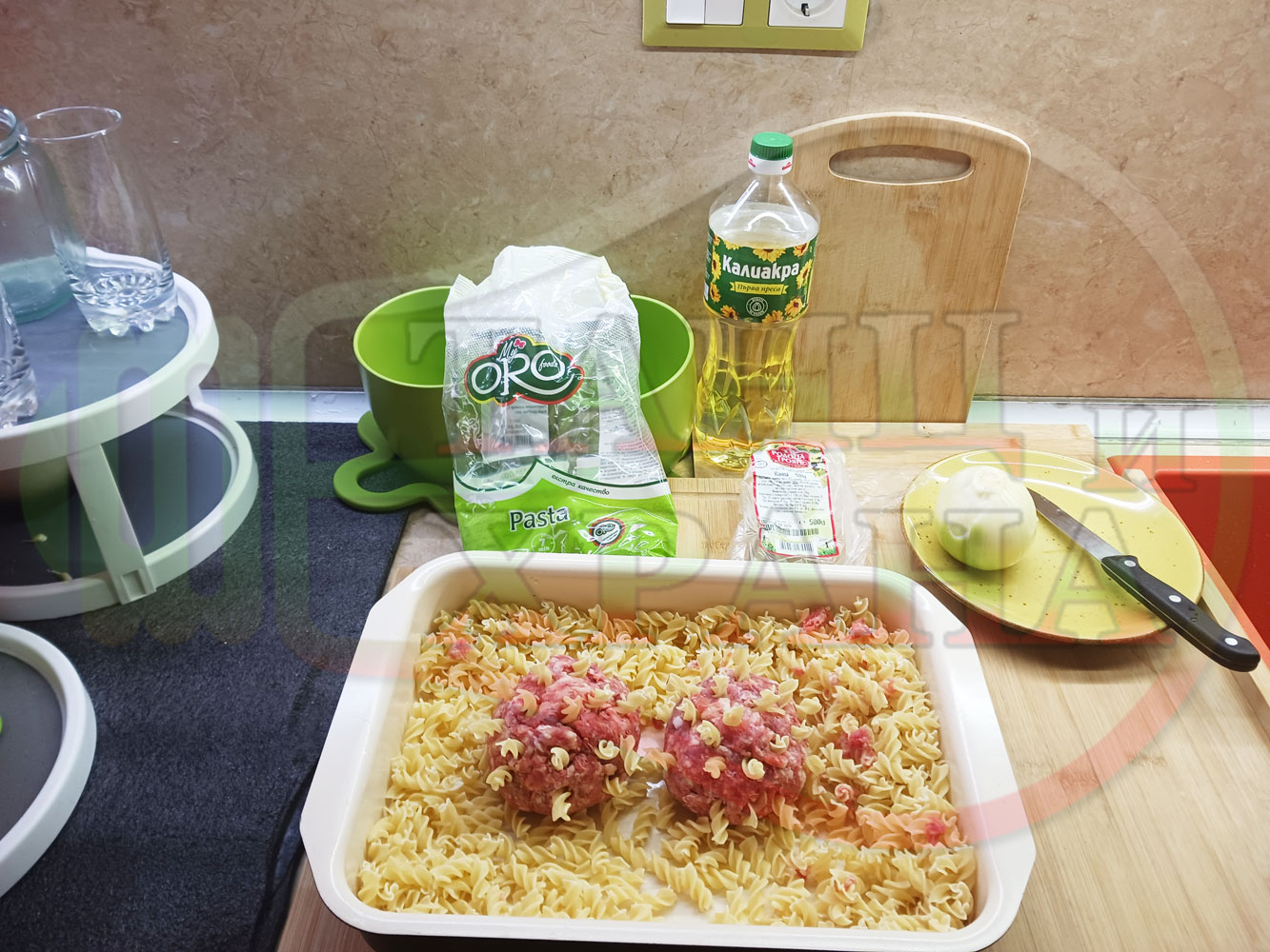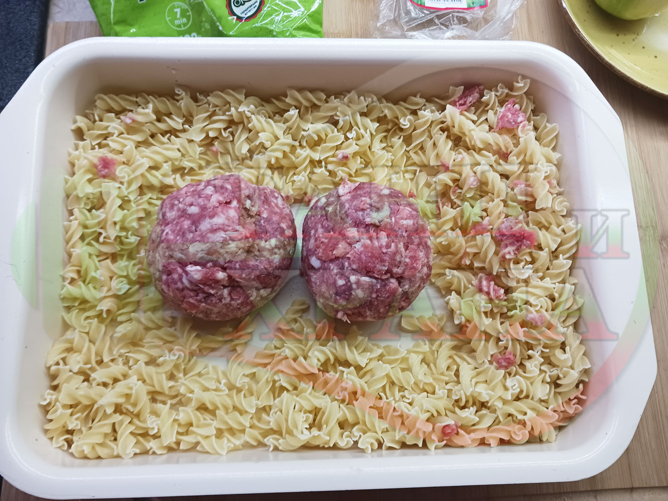 ВНИМАНИЕ: Фурните са различни и съответно времето за сваряване и запичане е ориентировъчно. Наблюдавайте процеса на запичане и при необходимост покрийте с капак или отстранете тавата от фурната. Разбърквайте често макароните и обливайте със соса кюфтетата за да се запекат равномерно и макароните върху тях да се сварят и запекат до желаната от вас степен (средно запечени кюфтета или по-запечени кюфтета и разварени и запечени макарони).