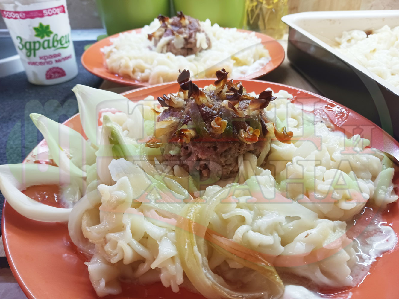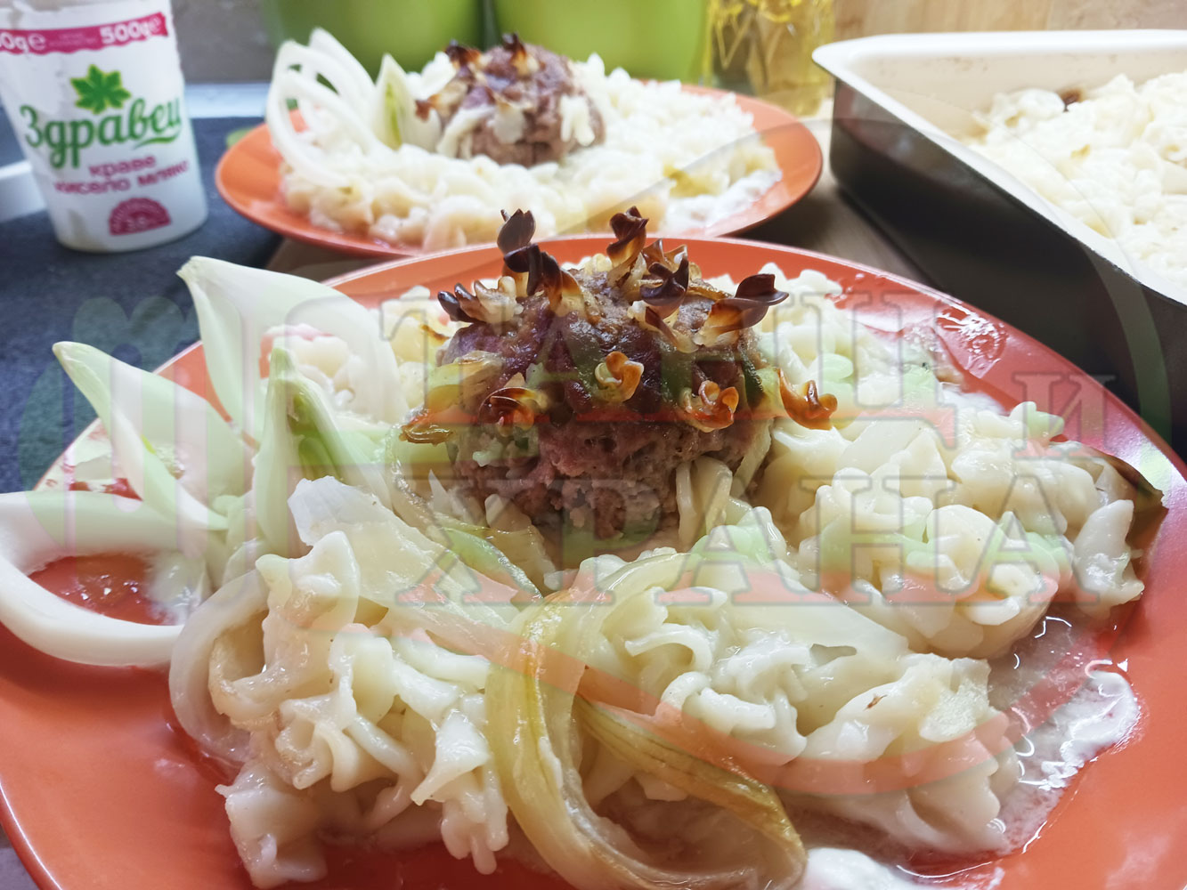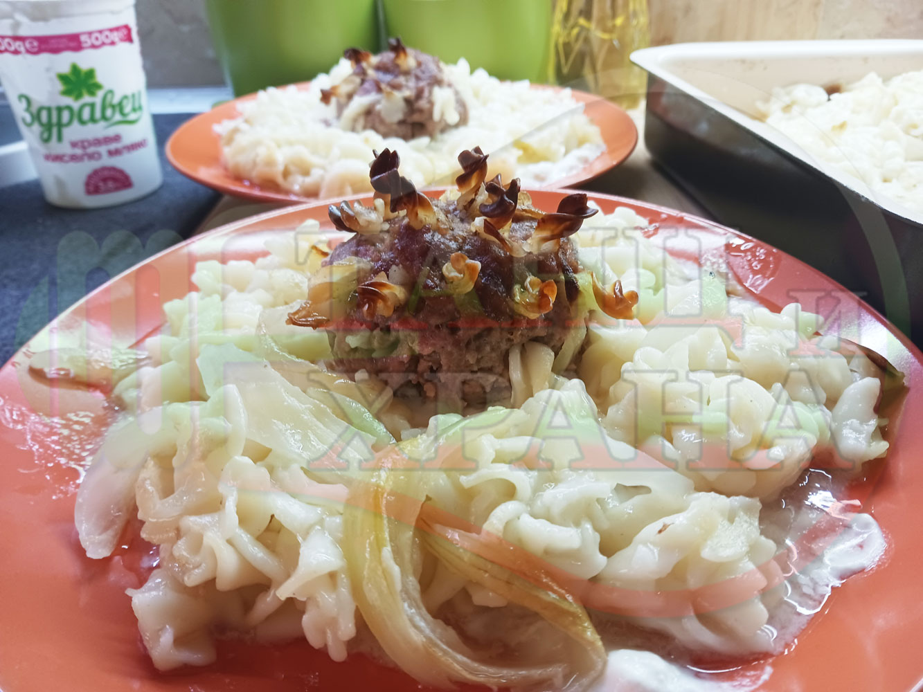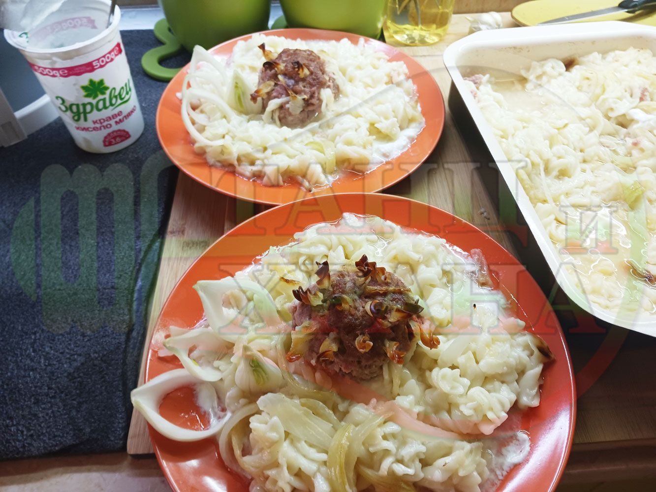 Български вити макарони "Каймяни топчестопрободни кромидлучени киселомлечни" сварени на фурна с топчести кюфтета от кайма и кромид лук гарнирани с млечна основа с кисело мляко от България