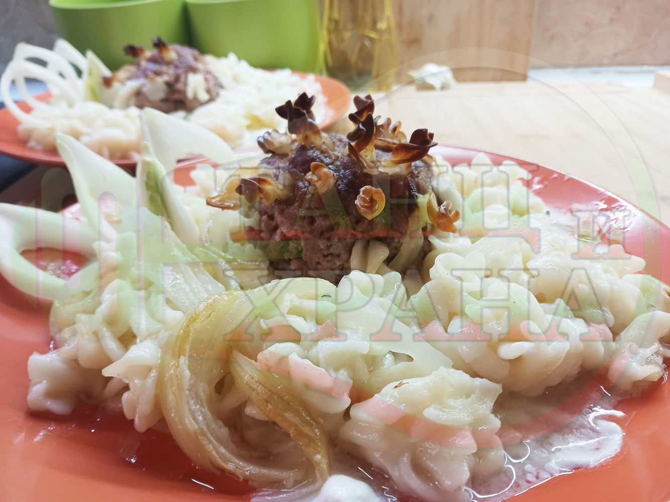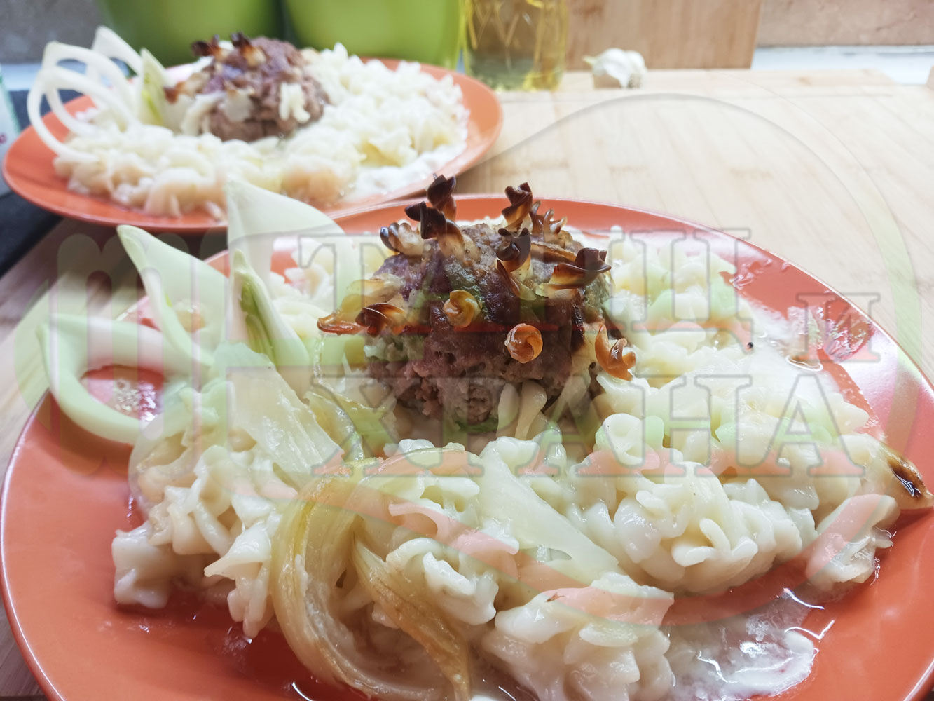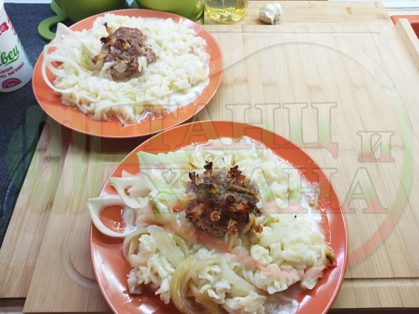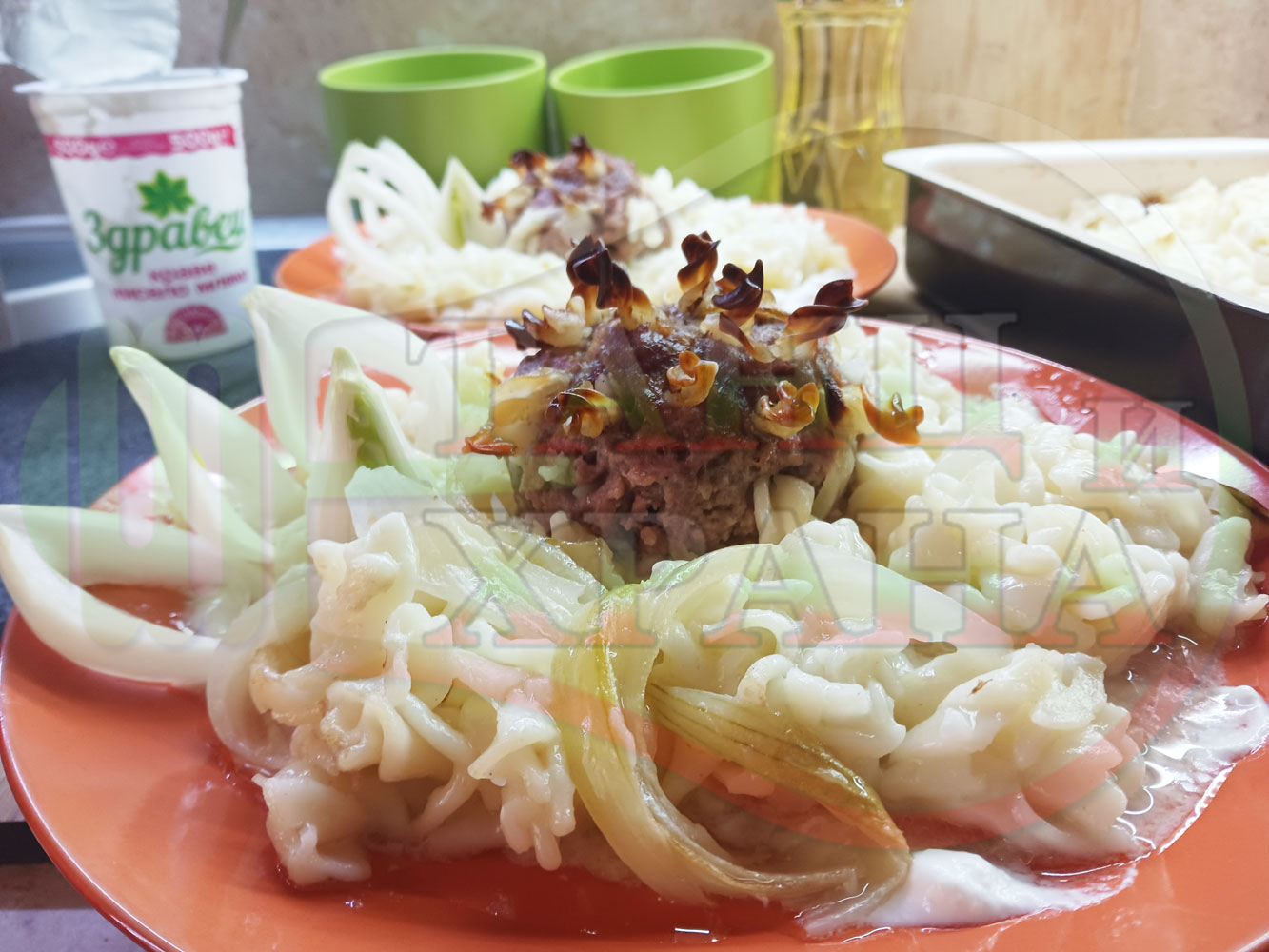 Български вити макарони "Каймяни топчестопрободни кромидлучени киселомлечни" сварени на фурна с топчести кюфтета от кайма и кромид лук гарнирани с млечна основа с кисело мляко от България