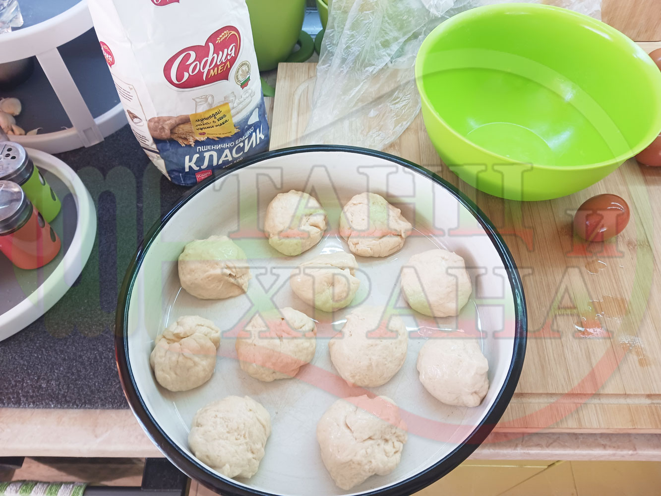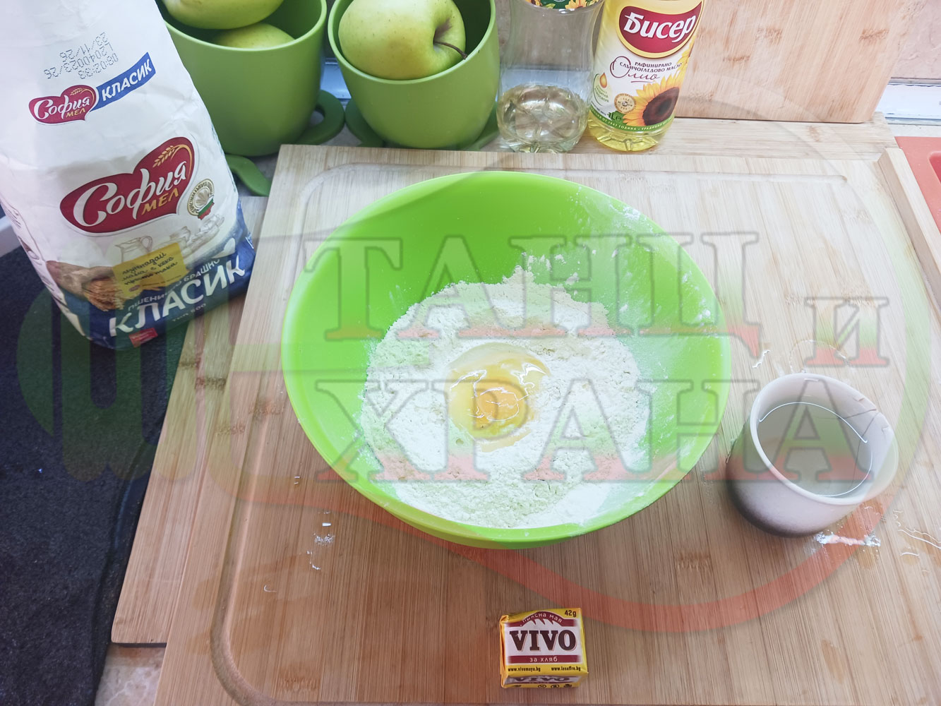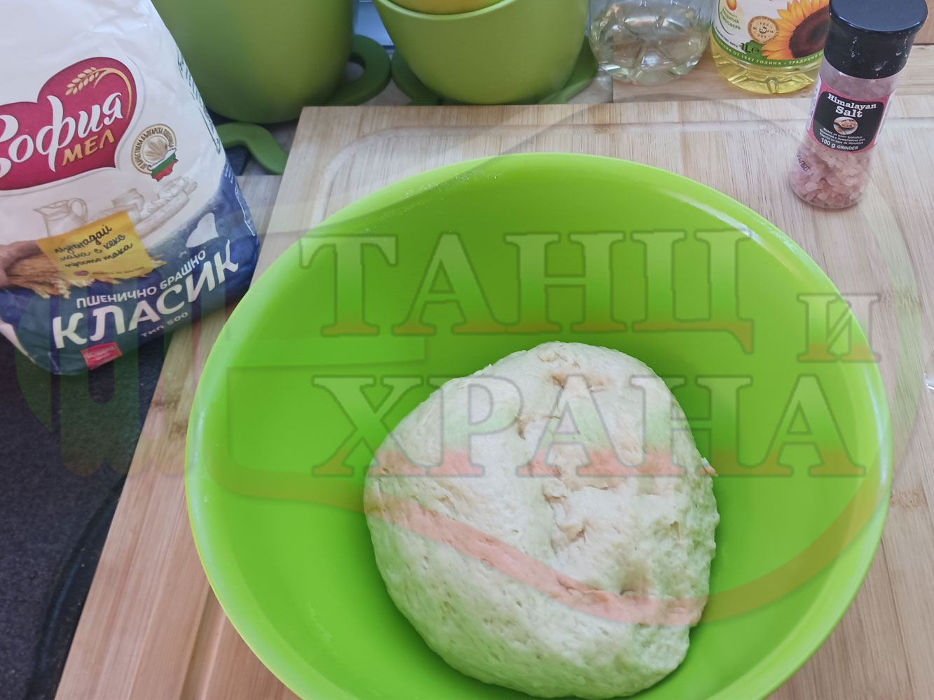 Сипете брашното в купа, направете "кладенче" в средата и добавете яйцето, захарта и хималайската сол в кладенчето. Налейте хладка вода от чешмата в чаша, добавете маята и разбъркайте до пълното разтваряне на маята (разтварянето на маята гарантира по-доброто и по-бързото й активиране и усвояване от брашното). Сипете разтворената мая в кладенчето и започнете да замесвате тестото от средата на кладенчето до пълното отлепяне на тестото от купата и намаляване на лепкавостта му (поръсвайте и добавяйте брашно при необходимост, докато замесвате). Сипете слънчогледовото олио, доомесете тестото с олиото и оформете "топка" от тестото. Намажете купата и тестото с олио, покрийте купата с прозрачен найлонов плик и оставете отвор в единия край на плика за да "диша" тестото докато втасва. Поставете купата на топло място за около 30 минути за да втаса тестото и удвои и дори утрои обема си (времето за втасване зависи от топлината в кухнята и вида и количеството на маята в зависимост от количеството на брашното и включените продукти при замесването).