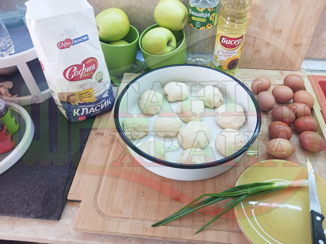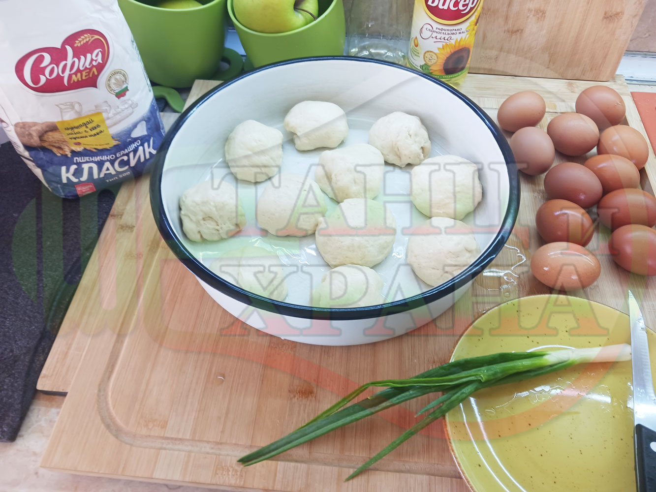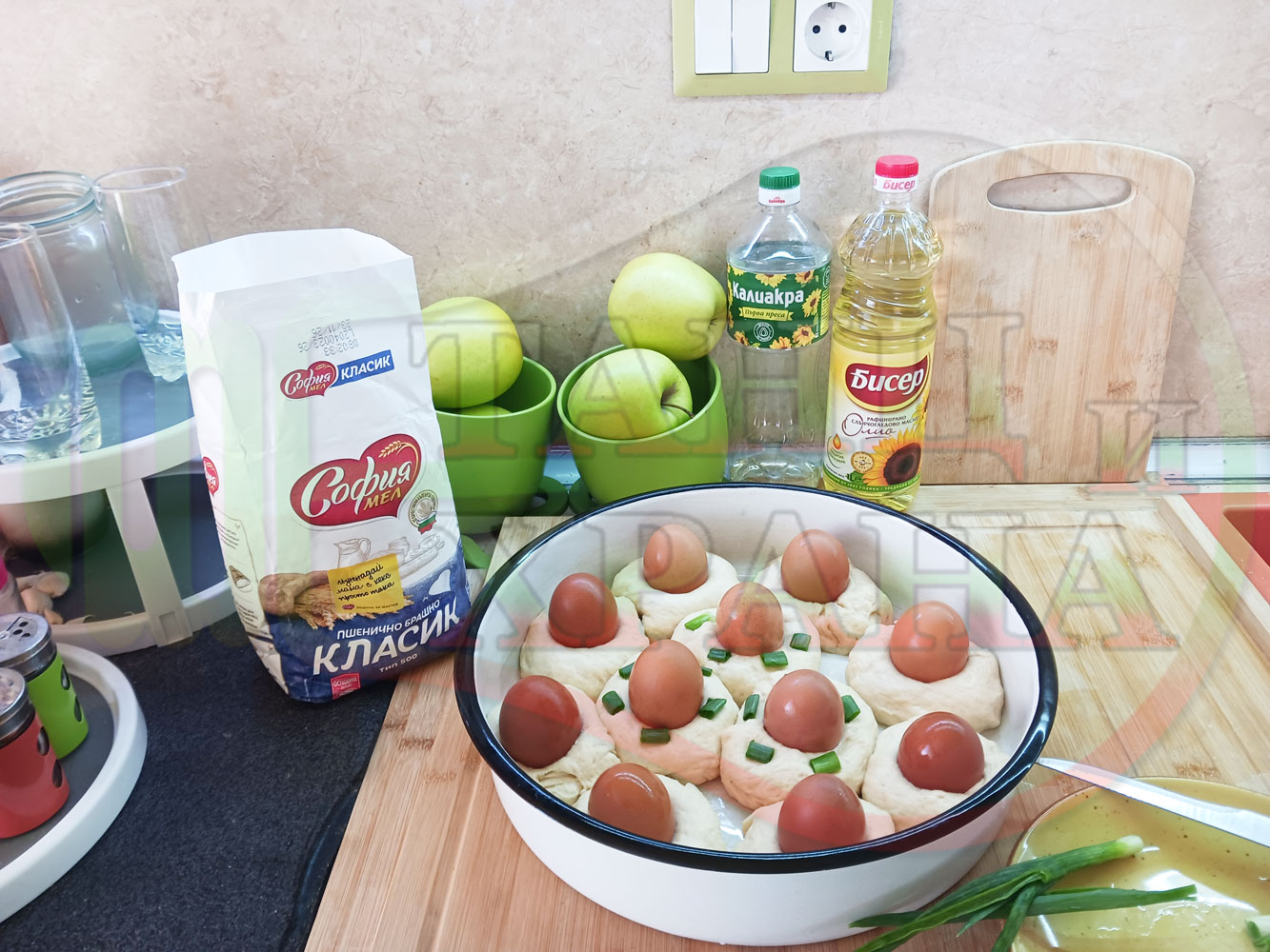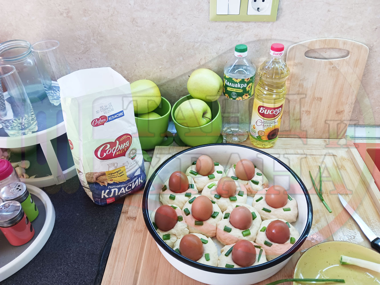 ПРОДУКТИ: Приблизителни количества за български коколници "Зеленопряснолучени" запечени на фурна с перца от пресен зелен лук и сурови цели небоядисани яйца в средата омесени с непостно тесто със жива мая и слънчогледово олио за Великден 2026 г.