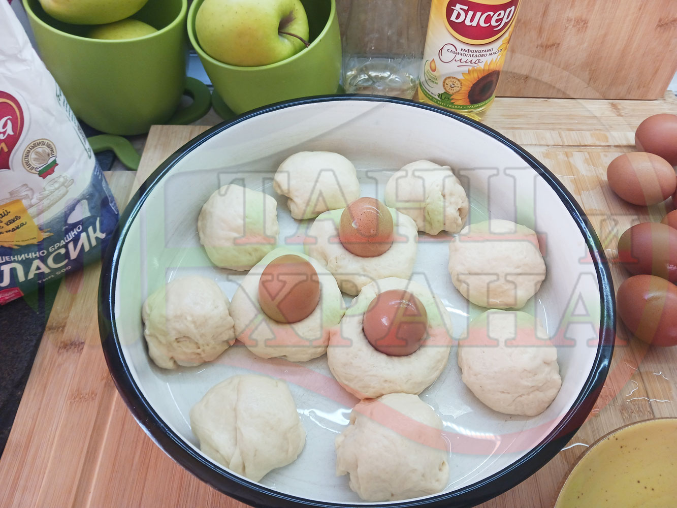 Откъснете или отрежете от втасалото тесто приблизително еднакви парчета, оформете ги на малки топки с въртеливи движения и ги подредете в намазана със слънчогледово олио тава за печене (големината на парчетата и броя са според броя на коколниците, които искате да оформите). Измийте суровите яйца с мека гъба и малко веро под течаща, хладка към леко топла вода от чешмата, оставете яйцата да се отцедят от водата или ги забършете с кухненска хартия, кърпа или др. и поставете внимателно по едно яйце в центъра на всяка оформена топка от тестото. Притиснете внимателно всяко яйце в тестените топки за да се захванат по-здраво и да не се разместят при изпичането и надигането на тестото (коколниците (имайте предвид, че яйцата се разместват в по-голяма или малка степен при изпичането и някои от тях може да се пукнат)).