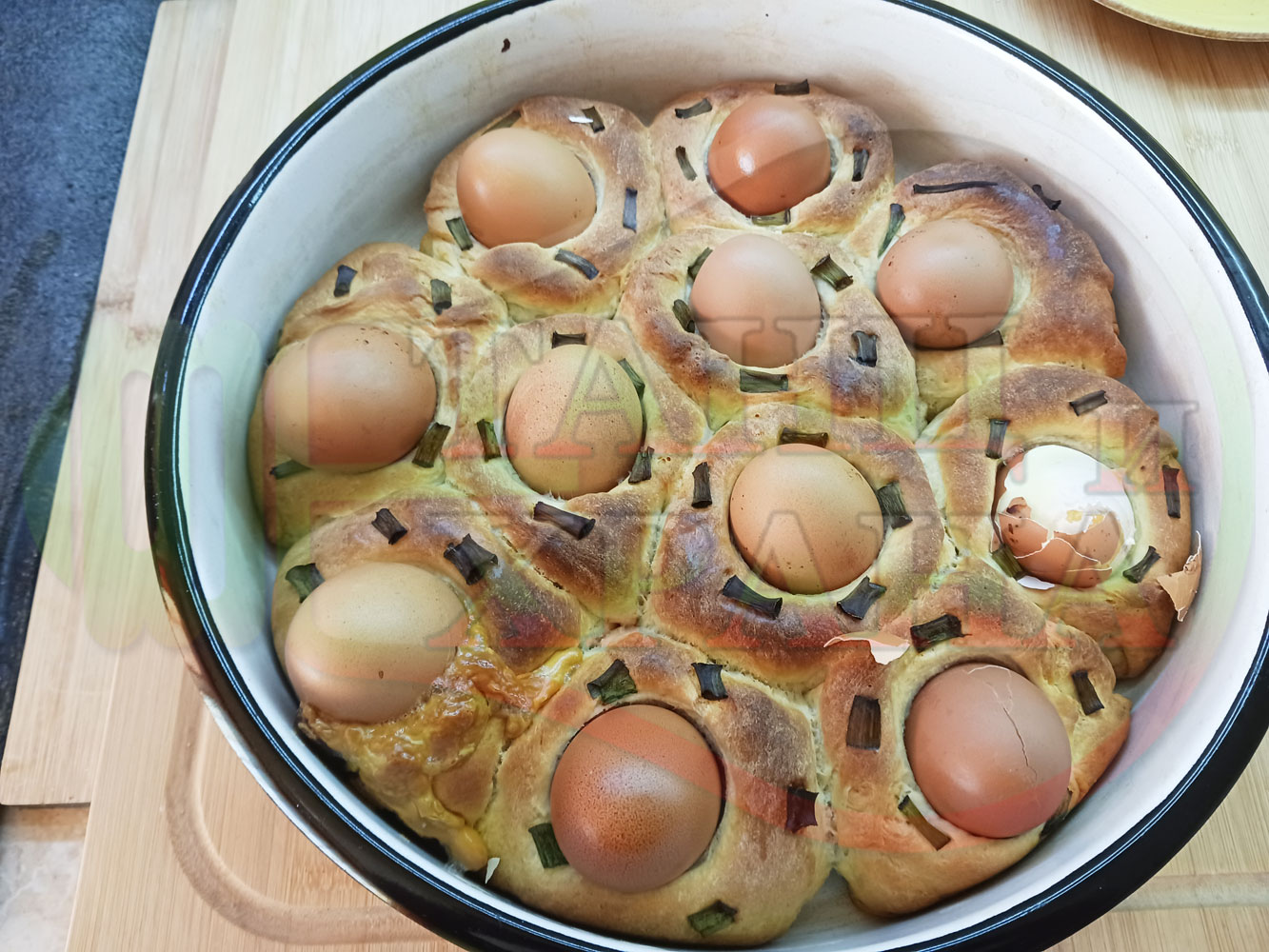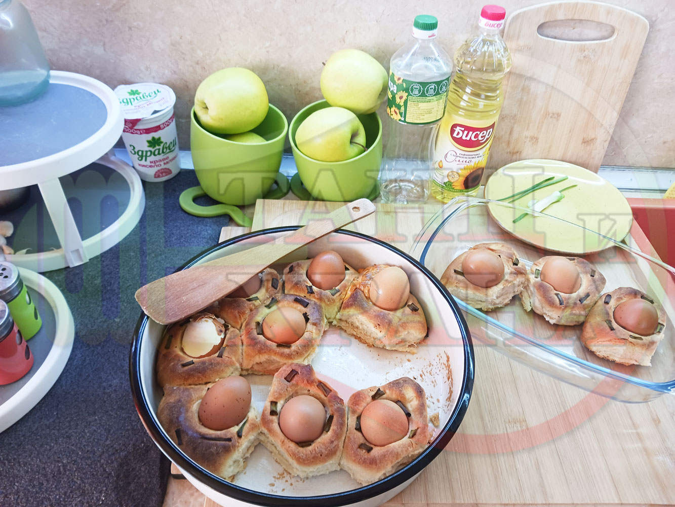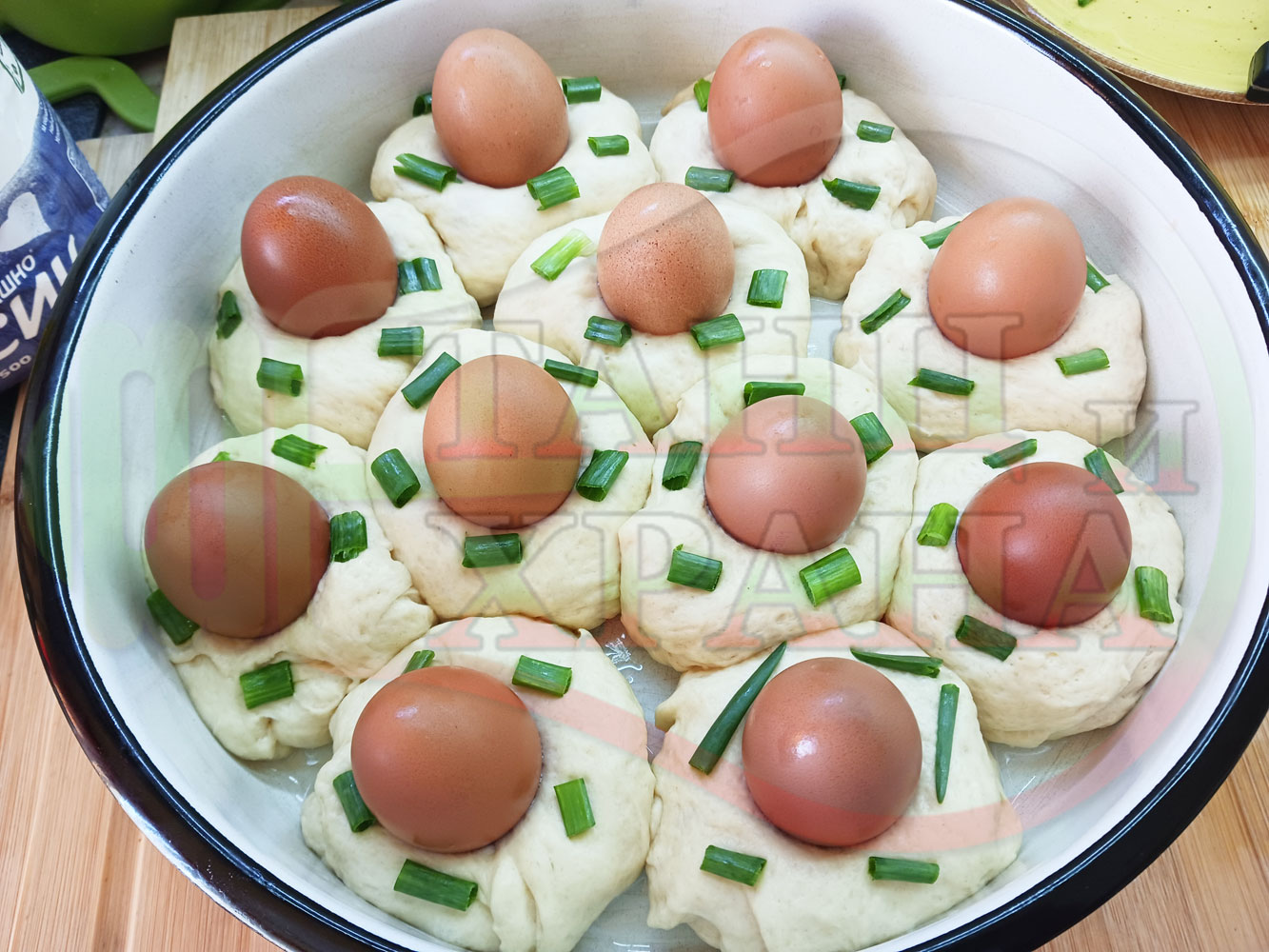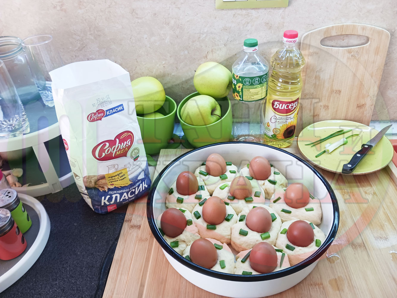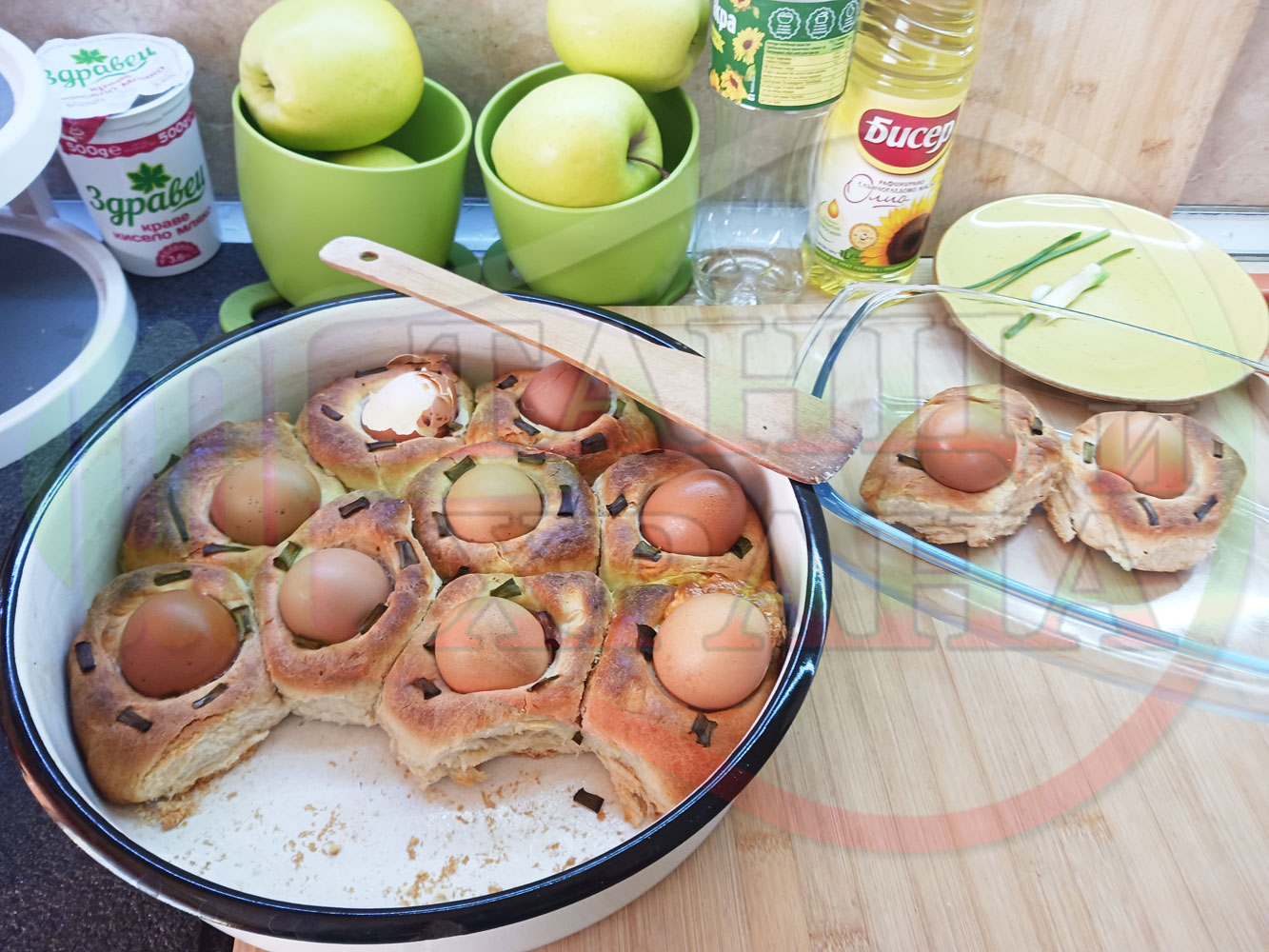 Спретнах вкусни, ароматни, меки и пухкави коколници с цели сурови, небоядисани яйца, запечени с перца от пресен зелен лук за Великден (2026 г.). Омесих тестото за коколниците с яйце и жива мая и в кухнята се носи аромат на запечени лучени перца и великденски хлебчета с хрупкава коричка. Отново се получи невероятна вкусно, вкусна, вкусотия (вкуснотия)... ![]()