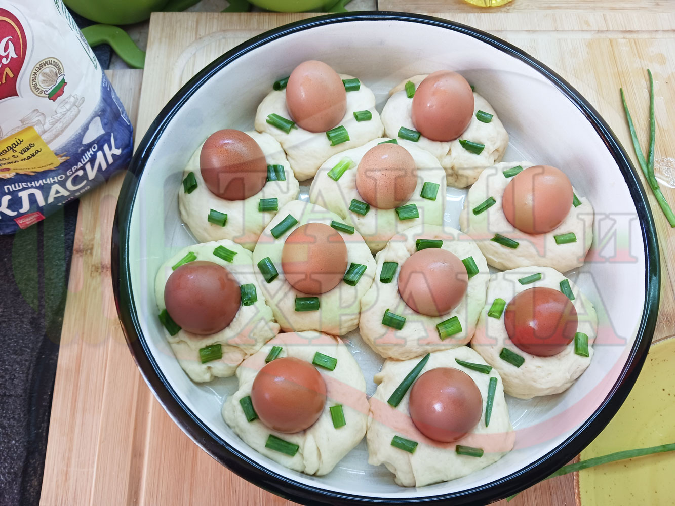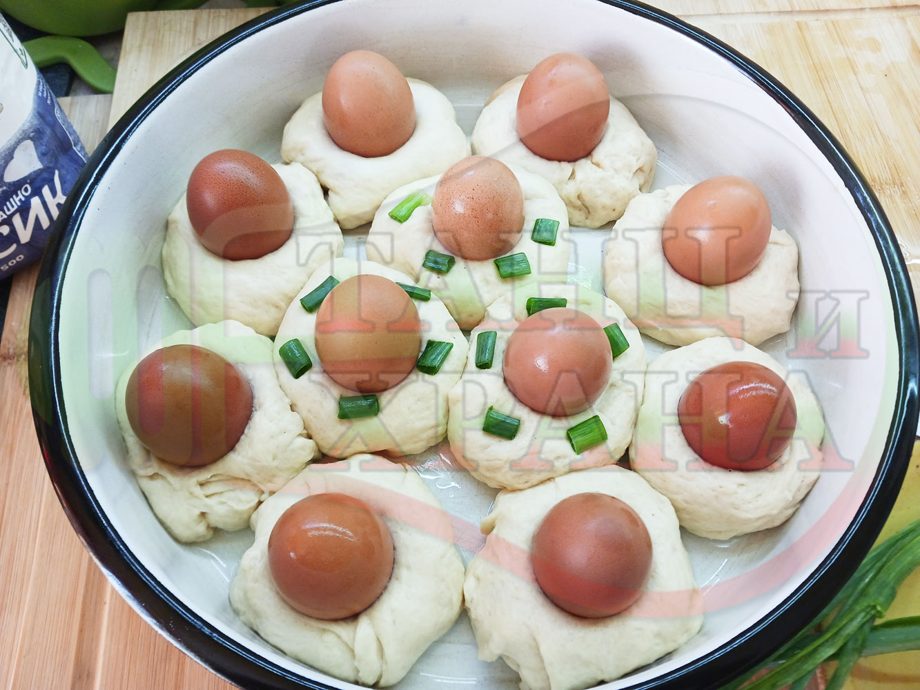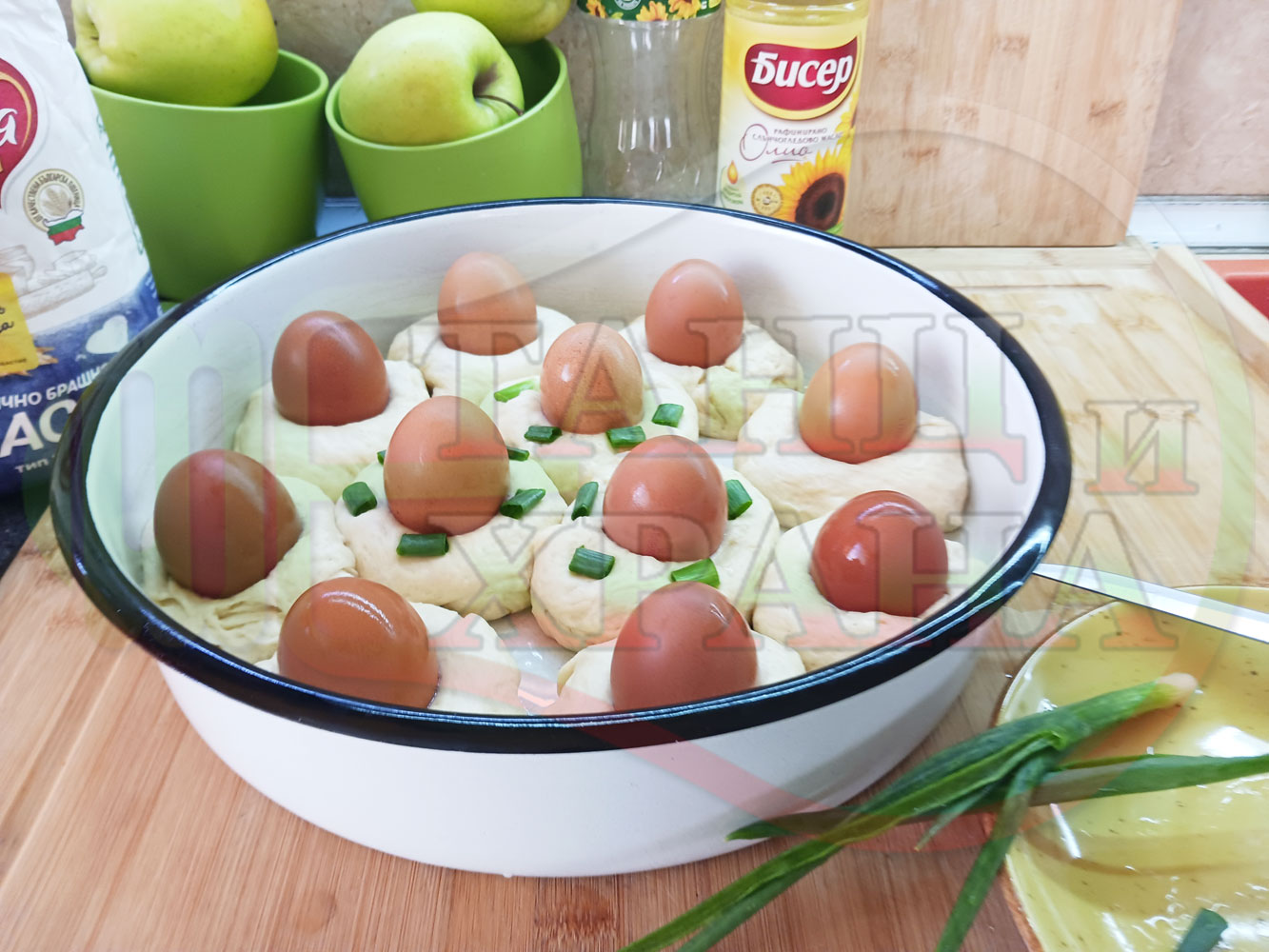 Измийте пресния лук между перата под течаща вода, нарежте перцата муна приблизително еднакви парченца и подредете парченцата в тестото около всяко яйце в коколниците (броят на нарязаните парченца от перцата на лука е произволен и зависи от броя, големината и формата на коколниците). Поставете тавата с коколниците на топло за около 20 минути за повторно втасване докато коколниците удвоят обема си (при по-студена кухня или въздушна студена струя от климатик е желателно да покриете тавата с коколниците с кърпа или найлонов плик за по-бързо втасване).