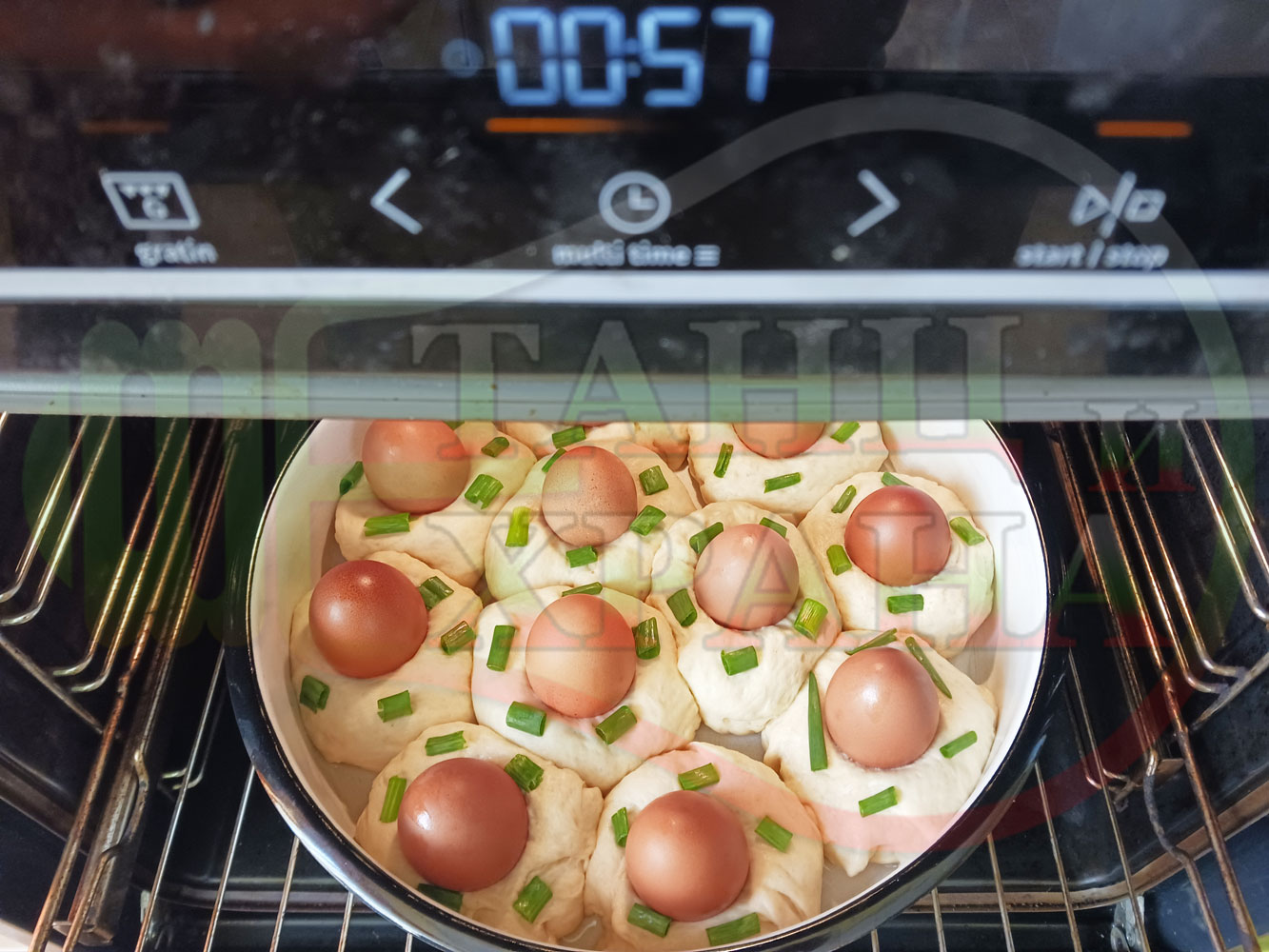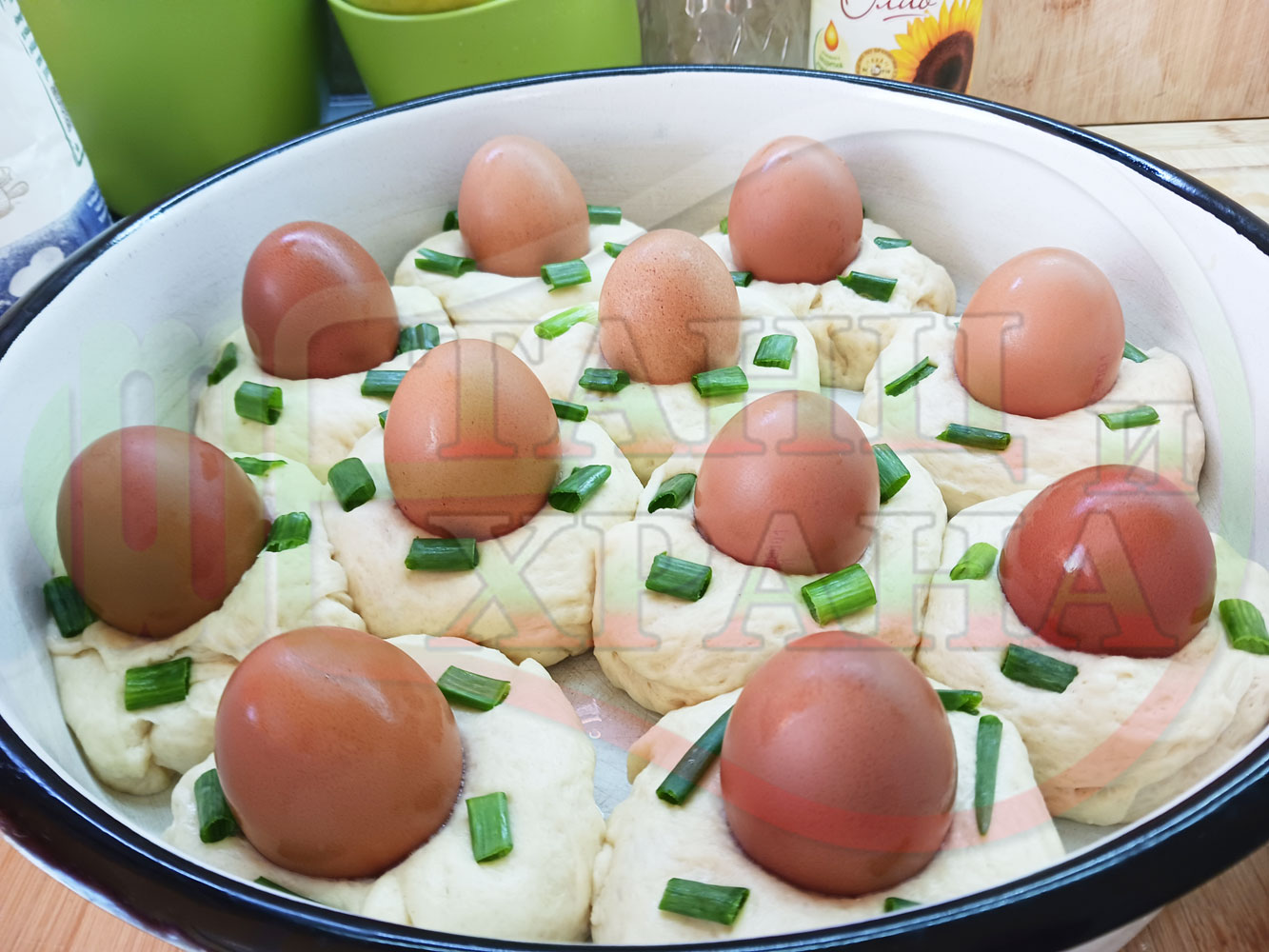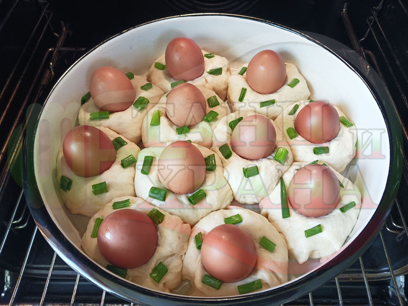 Измийте пресния лук между перата под течаща вода, нарежте перцата муна приблизително еднакви парченца и подредете парченцата в тестото около всяко яйце в коколниците (броят на нарязаните парченца от перцата на лука е произволен и зависи от броя, големината и формата на коколниците). Поставете тавата с коколниците на топло за около 20 минути за повторно втасване докато коколниците удвоят обема си (при по-студена кухня или въздушна студена струя от климатик е желателно да покриете тавата с коколниците с кърпа или найлонов плик за по-бързо втасване).
