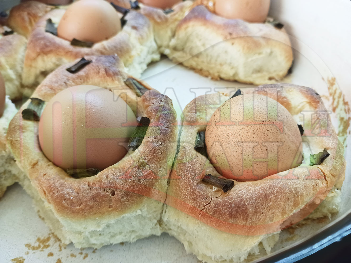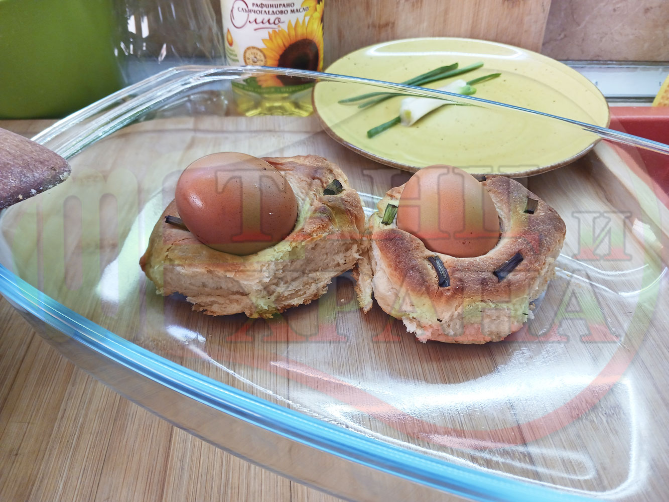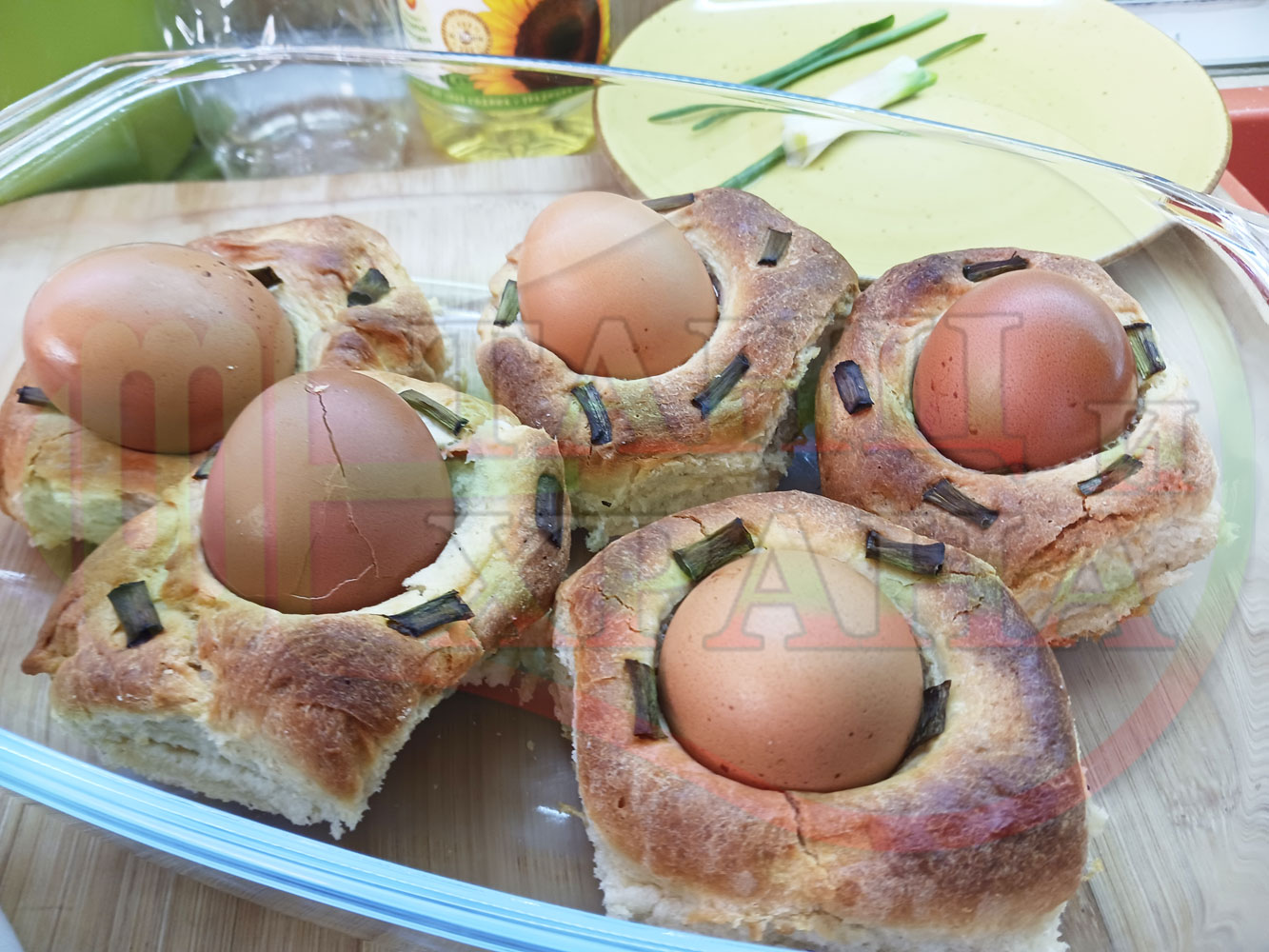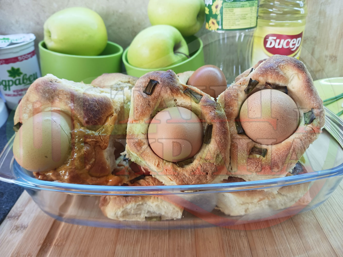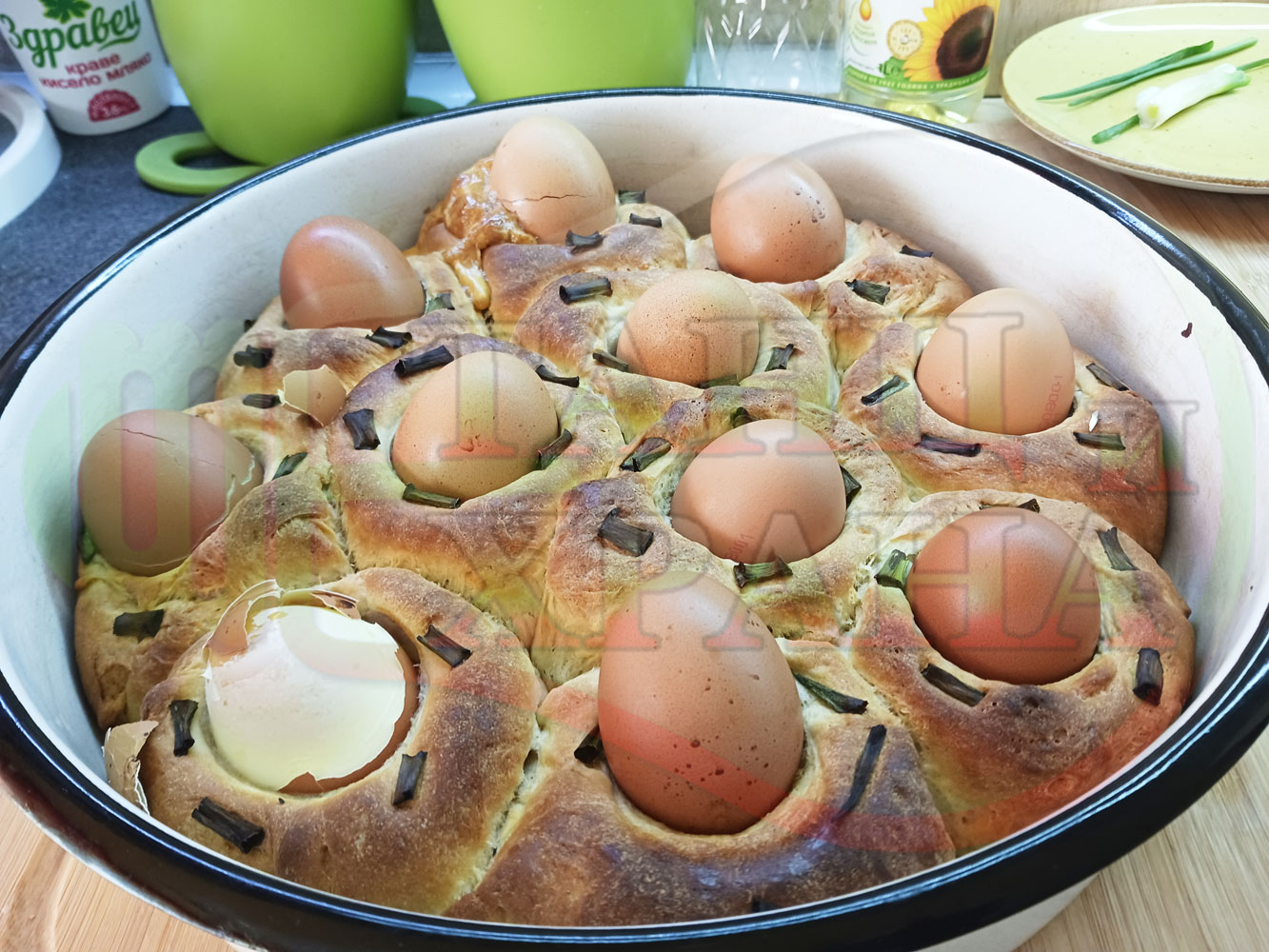 Български коколници "Зеленопряснолучени" запечени на фурна с перца от пресен зелен лук и сурови цели небоядисани яйца в средата омесени с непостно тесто със жива мая и слънчогледово олио за Великден 2026 г.