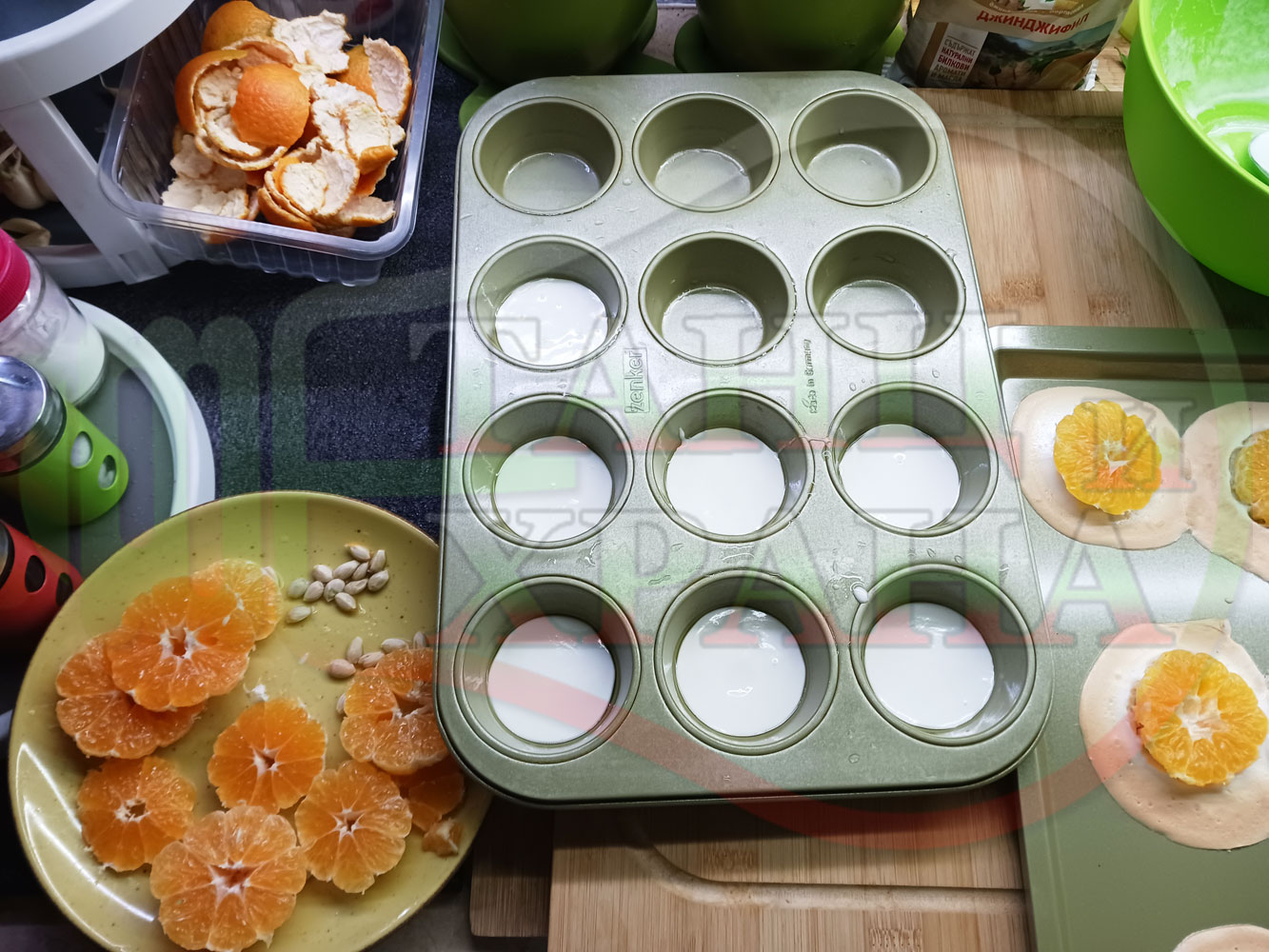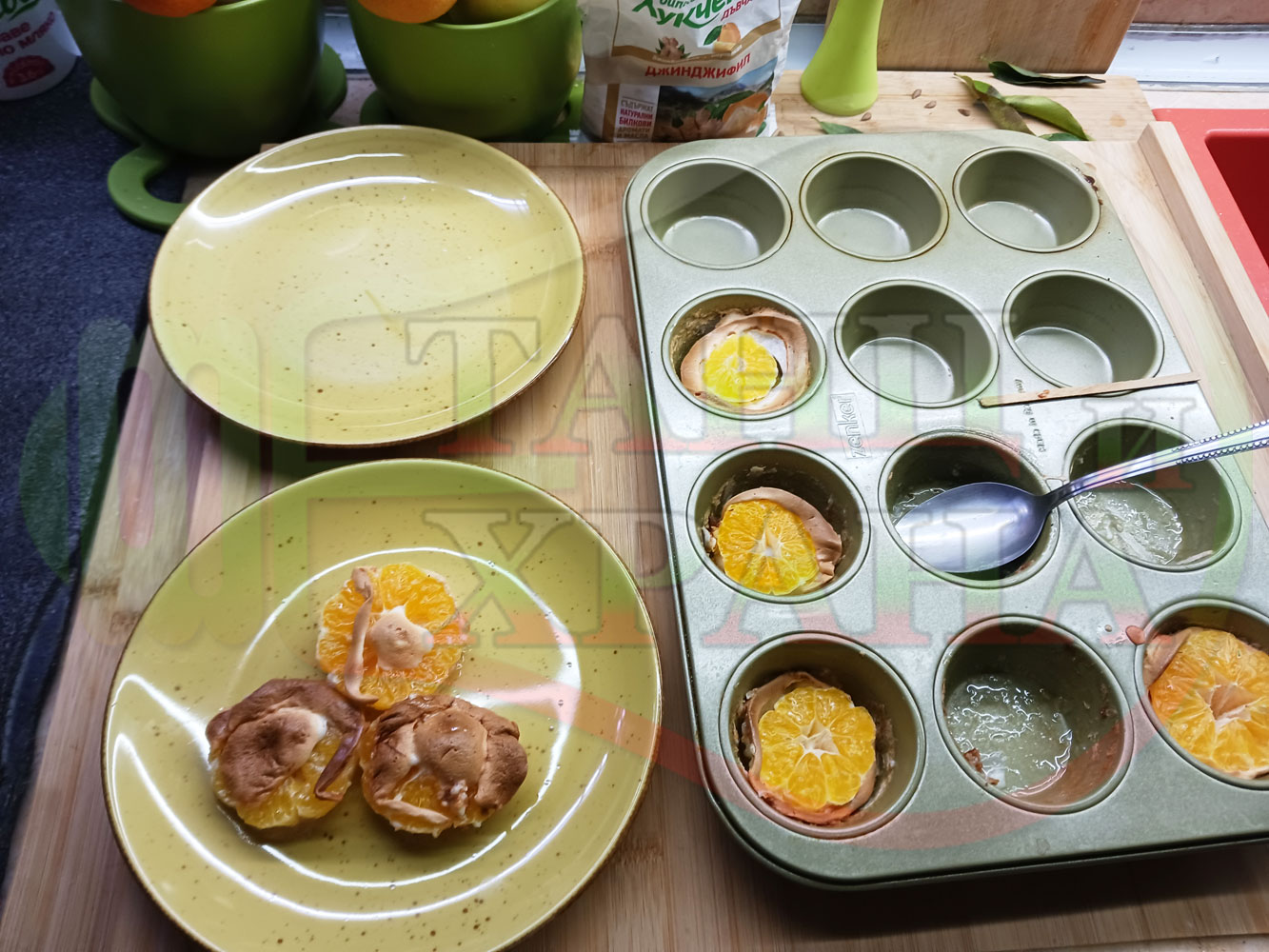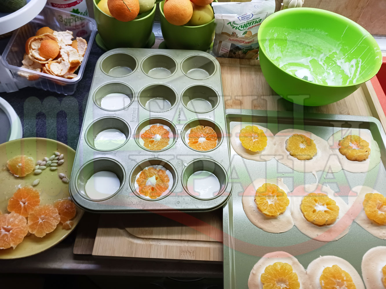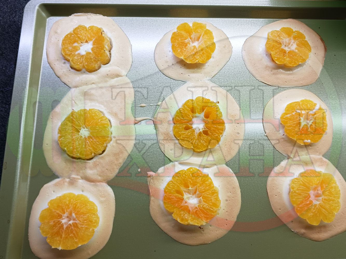 Сипете слънчогледово олио в тава за печене на курабии и във форма за печене на кексчета и размажте олиото равномерно. Измийте мандарините с гъба и веро, изплакнете ги хубаво, обелете ги и почистете от семките (измийте мандарините с веро, в случай че желаете да изсушите корите за приготвянето на различни сладкиши). Нарежете всяка мандарина на кръгли 3 части. Сипете по 1 супена лъжица от белтъчната смес в плоската тава и във формата за печене на кексове и поставете по 1 кръгче от нарязаните мандарини. Поставете тавата и формата за печене на кексове в предварително загрятата фурна (загрейте я за поне 5 минути). Запечете на фурна без вентилатор на 180 градуса за около 15 минути.