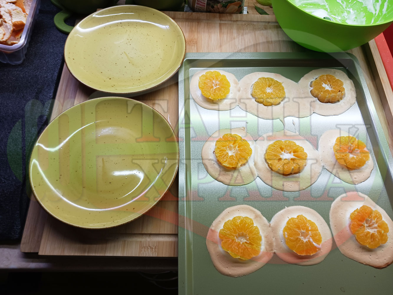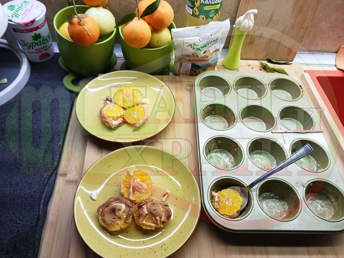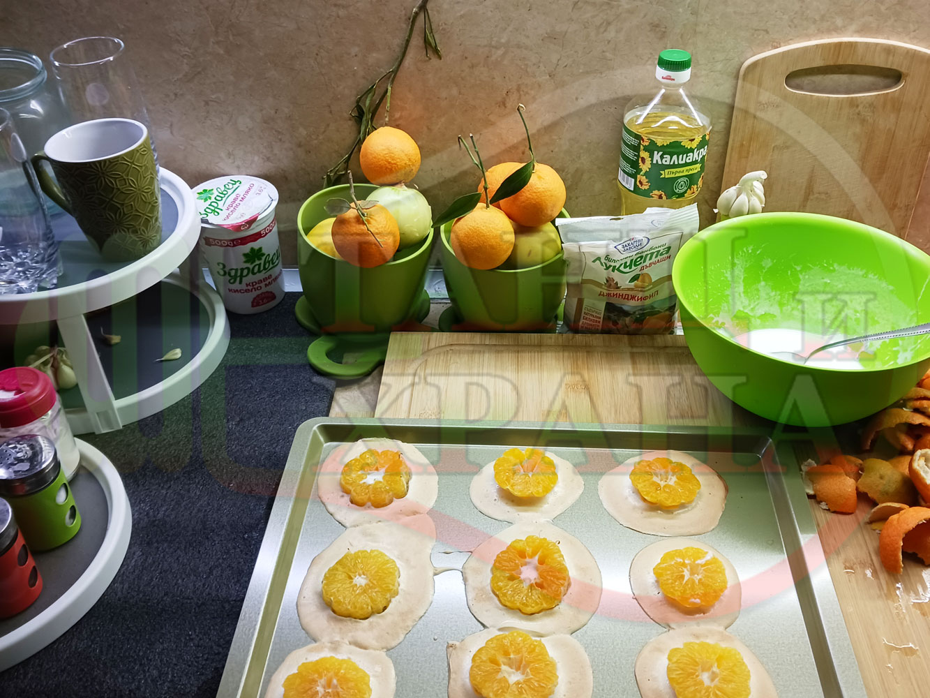 Сипете слънчогледово олио в тава за печене на курабии и във форма за печене на кексчета и размажте олиото равномерно. Измийте мандарините с гъба и веро, изплакнете ги хубаво, обелете ги и почистете от семките (измийте мандарините с веро, в случай че желаете да изсушите корите за приготвянето на различни сладкиши). Нарежете всяка мандарина на кръгли 3 части. Сипете по 1 супена лъжица от белтъчната смес в плоската тава и във формата за печене на кексове и поставете по 1 кръгче от нарязаните мандарини. Поставете тавата и формата за печене на кексове в предварително загрятата фурна (загрейте я за поне 5 минути). Запечете на фурна без вентилатор на 180 градуса за около 15 минути.