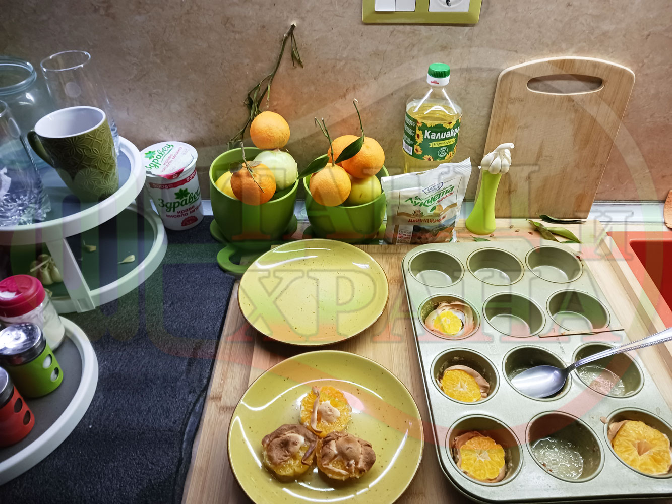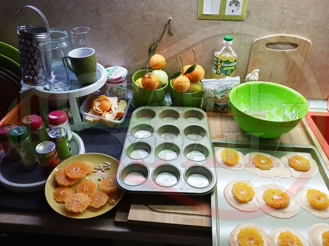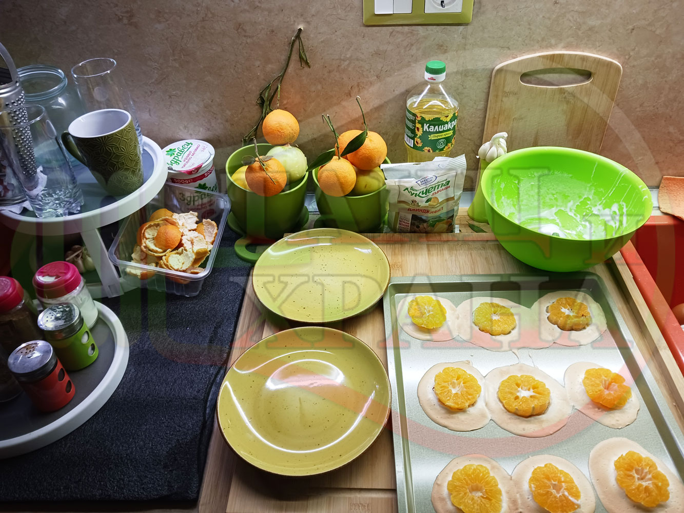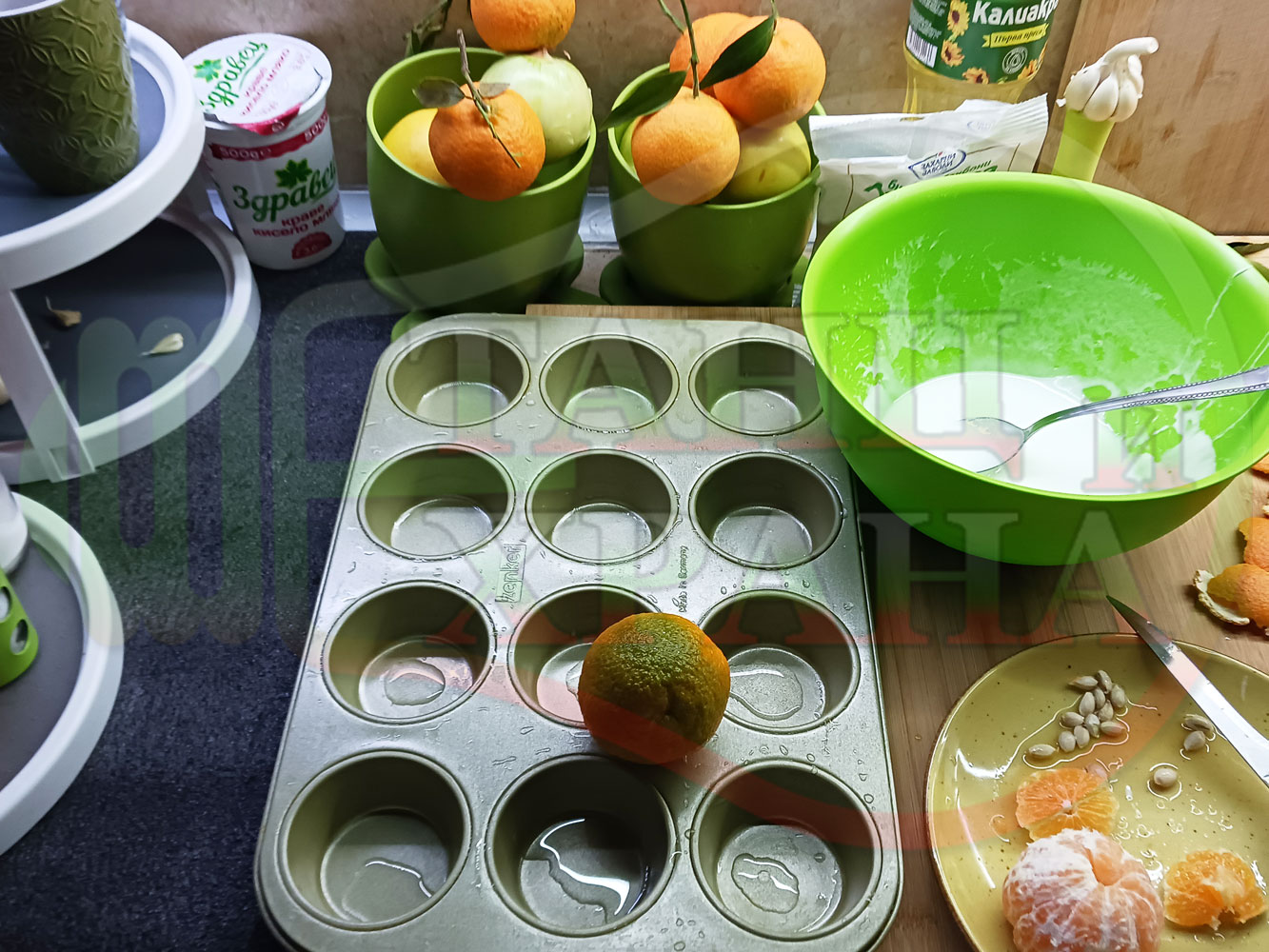 Сипете слънчогледово олио в тава за печене на курабии и във форма за печене на кексчета и размажте олиото равномерно. Измийте мандарините с гъба и веро, изплакнете ги хубаво, обелете ги и почистете от семките (измийте мандарините с веро, в случай че желаете да изсушите корите за приготвянето на различни сладкиши). Нарежете всяка мандарина на кръгли 3 части. Сипете по 1 супена лъжица от белтъчната смес в плоската тава и във формата за печене на кексове и поставете по 1 кръгче от нарязаните мандарини. Поставете тавата и формата за печене на кексове в предварително загрятата фурна (загрейте я за поне 5 минути). Запечете на фурна без вентилатор на 180 градуса за около 15 минути.