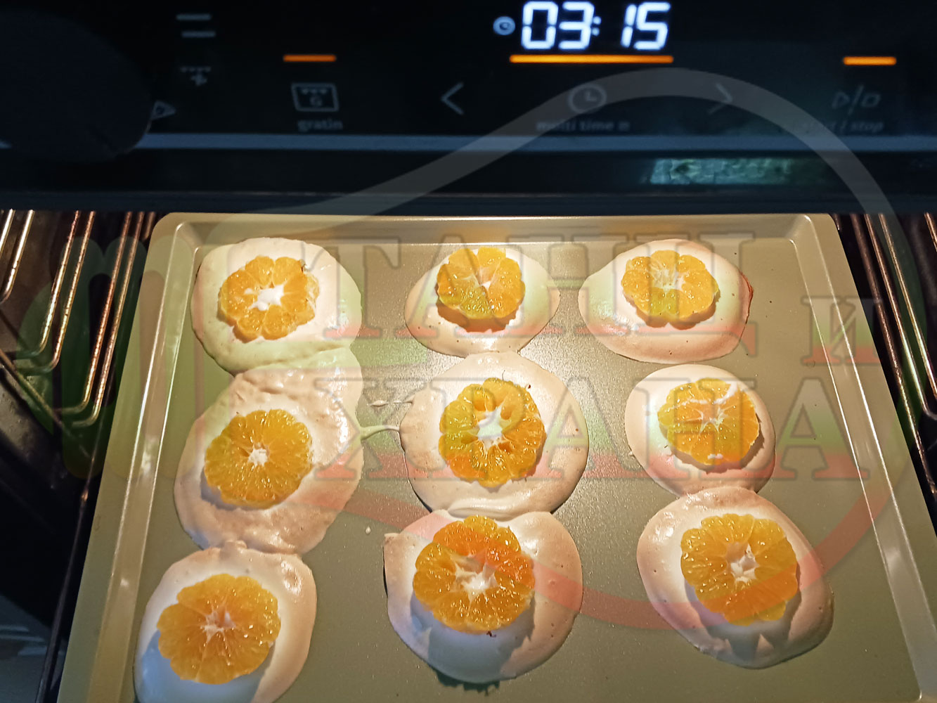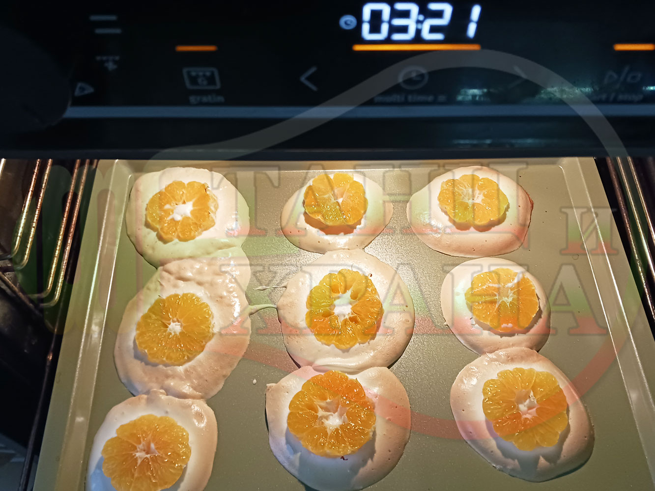 Белтъчен кремообразен плодов десерт "Мандаринов белтъчнозахарен" приготвен с яйчени белтъци, кристална захар и щипка готварска сол запечен с пресни мандарини