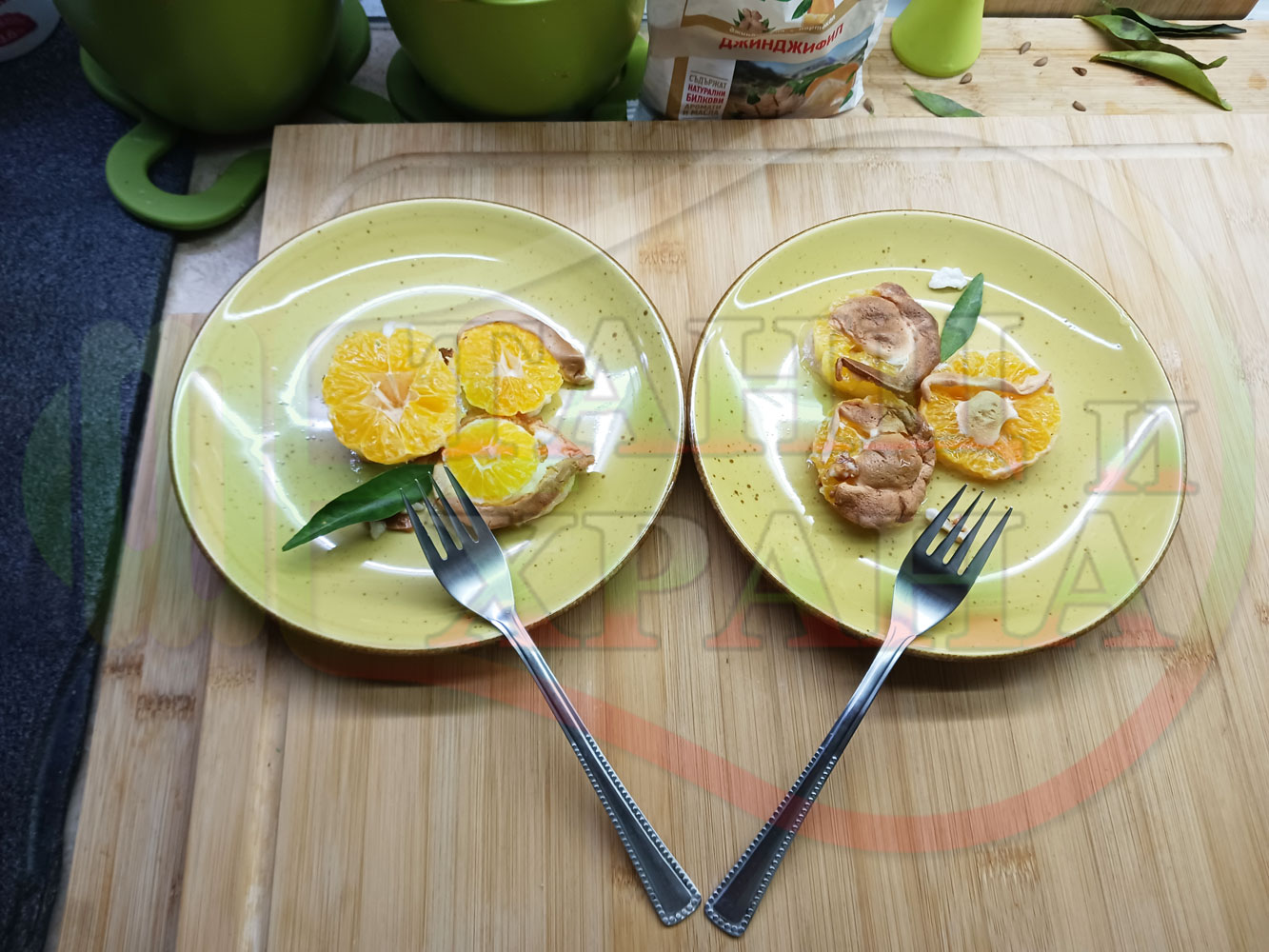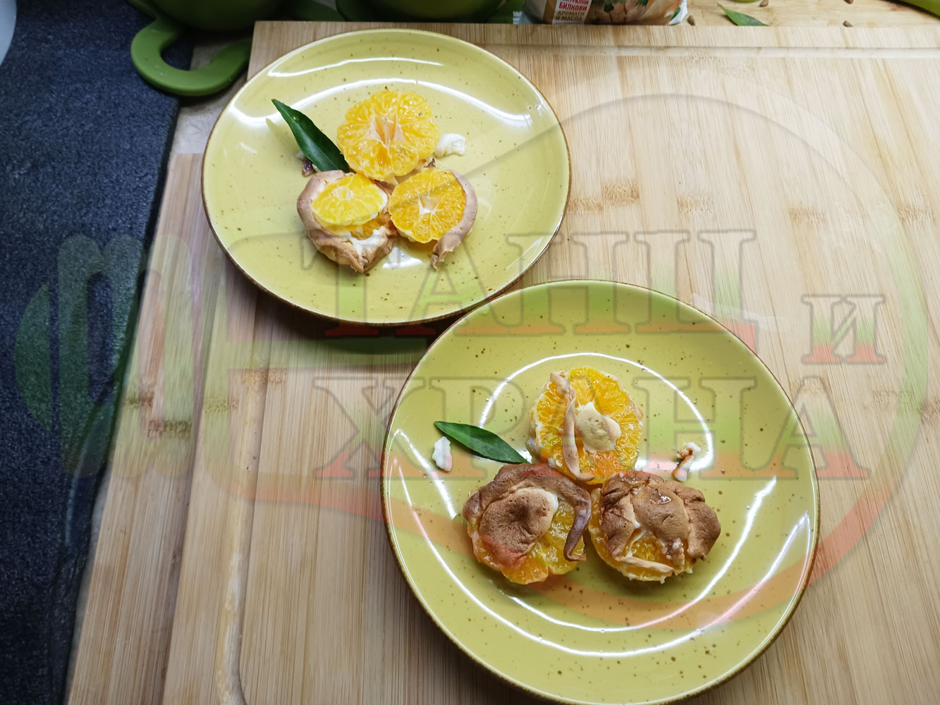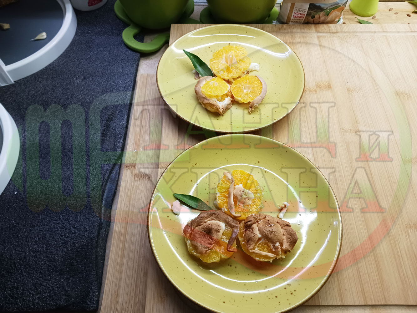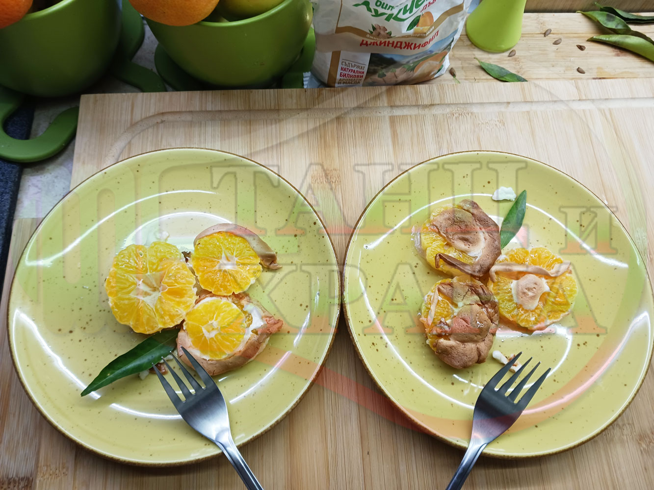 П. С. Листата на мандарината не са ядливи, горчат и ги поставяйте по-далече от мини плодовите десерти, без да се допират до мандарините за да не ги вгорчат.