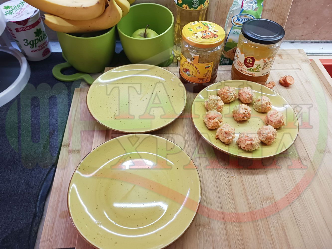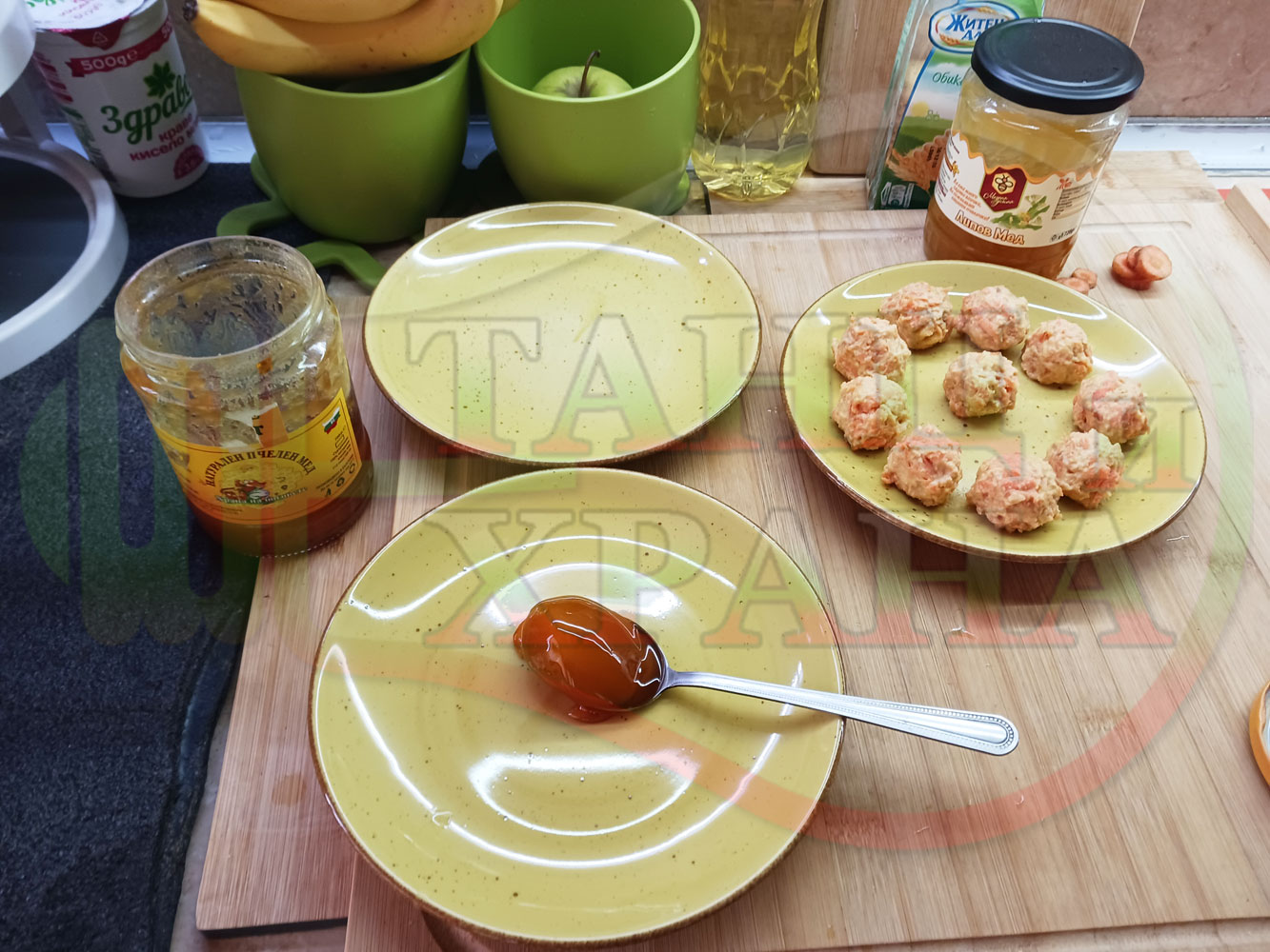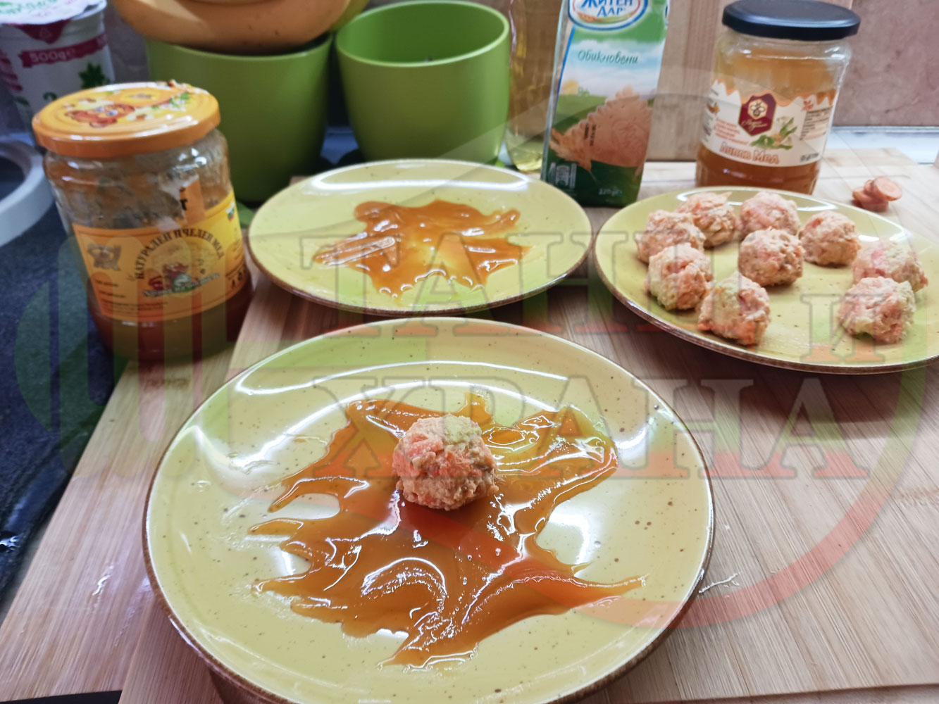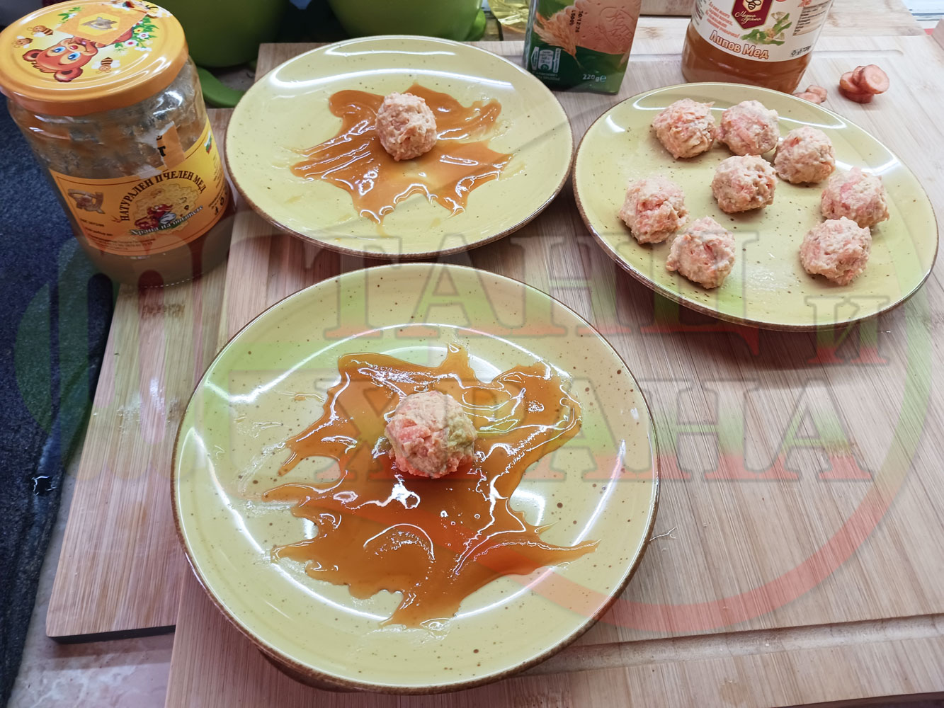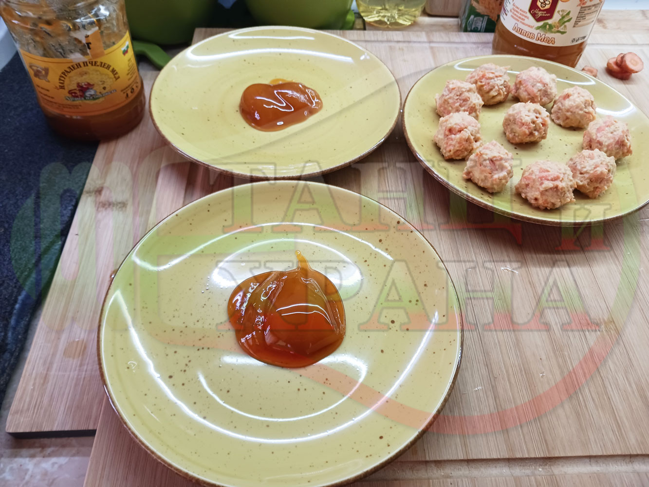 В случай, че бисквитеното тесто се получи прекалено гъсто и стегнато, настържете на едро част от измит морков за да го разредите или сгъстете прекалено рядкото бисквитено тесто с прясно мляко (винаги имайте под ръка някакво малко парченце (количество) от дадения продукт за доовкусяване и прецезиране на гъстотата). Разбърквайте и намачквайте с вилица след добавянето на съответния продукт (за сгъстяване или разреждане) за да прецените гъстотата и вкуса на бисквитеното тесто (зависи от големината и водното съдържание на моркова/ите и вида и големината на бисквитите). Съобразявайте и според вида на продукта, с който ще гарнирате и неговите особености (в случая е пчелния мед).