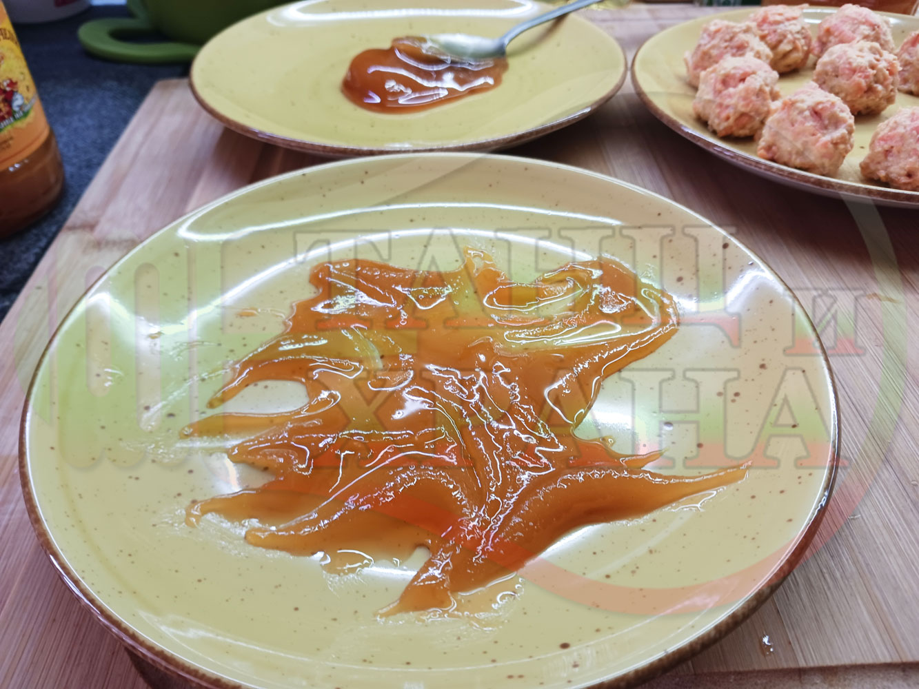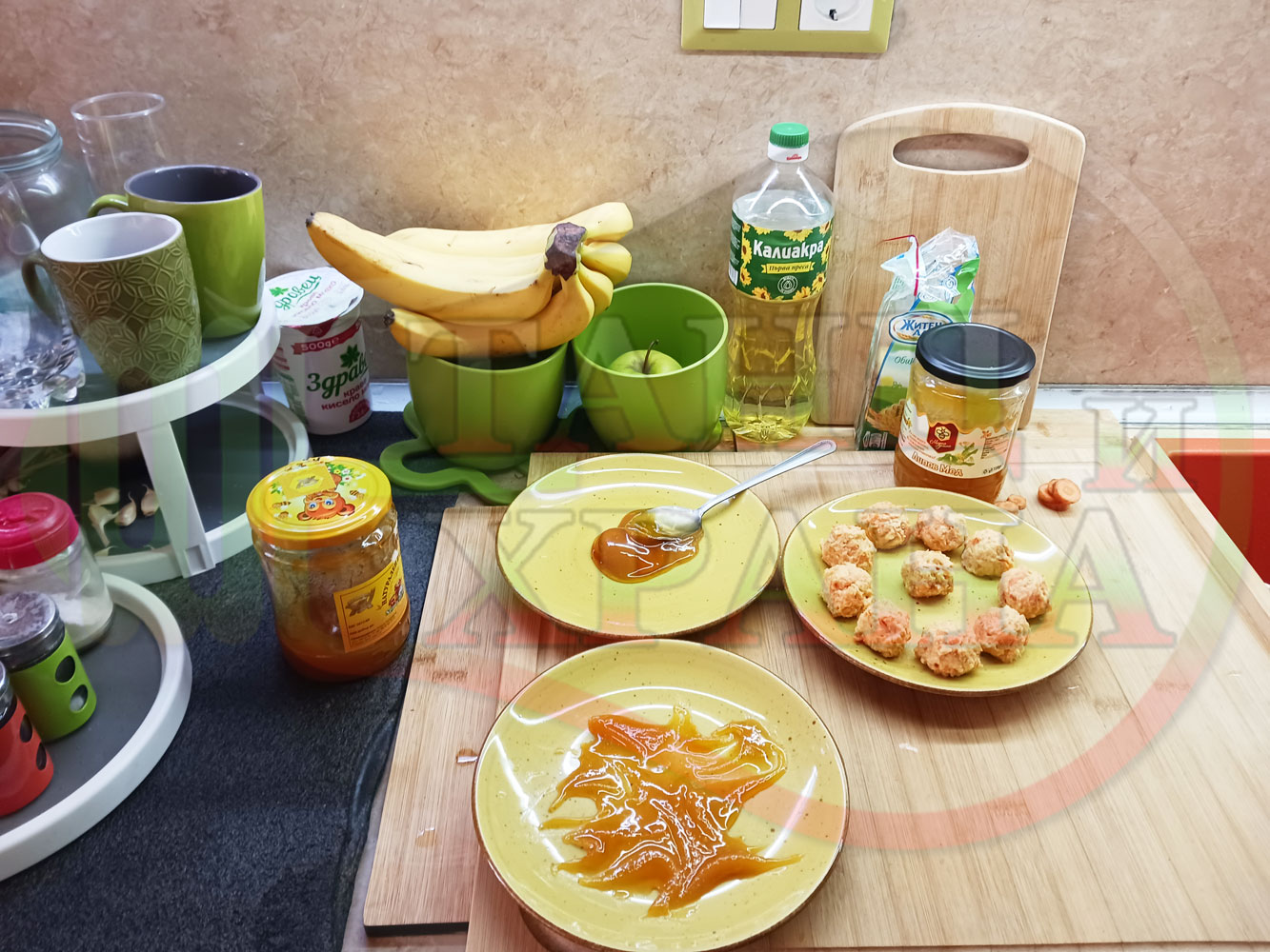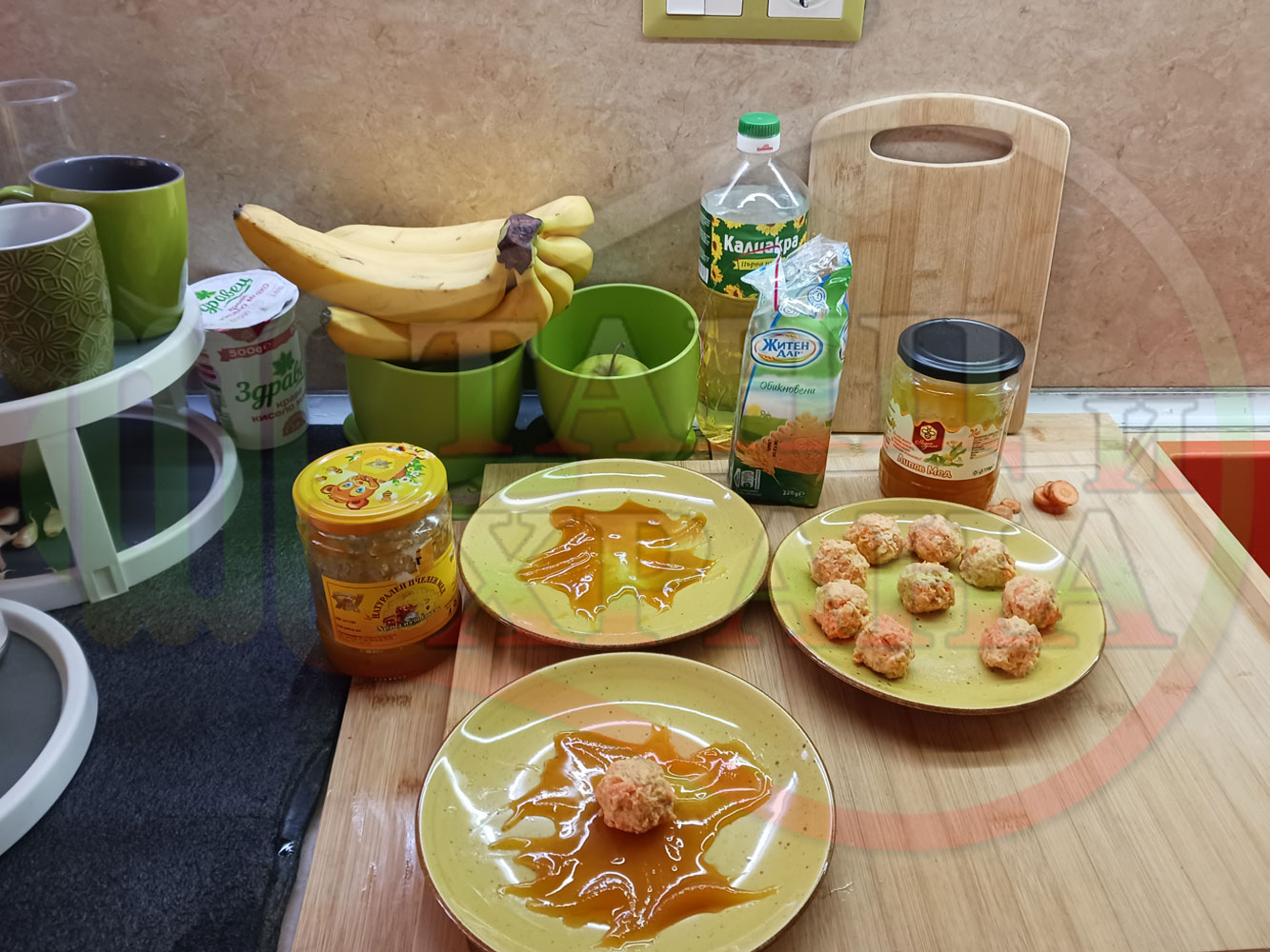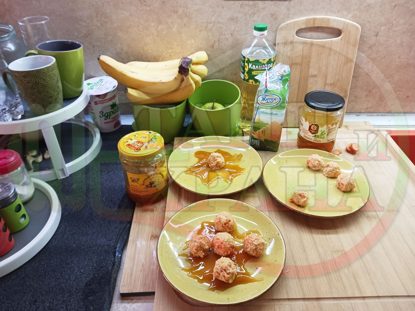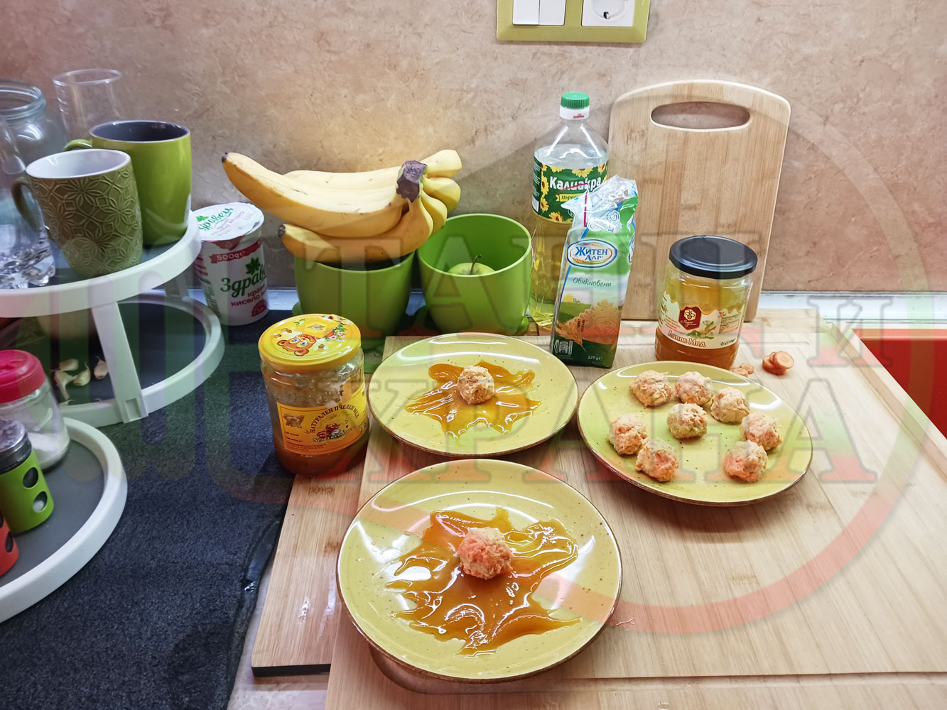 В случай, че бисквитеното тесто се получи прекалено гъсто и стегнато, настържете на едро част от измит морков за да го разредите или сгъстете прекалено рядкото бисквитено тесто с прясно мляко (винаги имайте под ръка някакво малко парченце (количество) от дадения продукт за доовкусяване и прецезиране на гъстотата). Разбърквайте и намачквайте с вилица след добавянето на съответния продукт (за сгъстяване или разреждане) за да прецените гъстотата и вкуса на бисквитеното тесто (зависи от големината и водното съдържание на моркова/ите и вида и големината на бисквитите). Съобразявайте и според вида на продукта, с който ще гарнирате и неговите особености (в случая е пчелния мед).