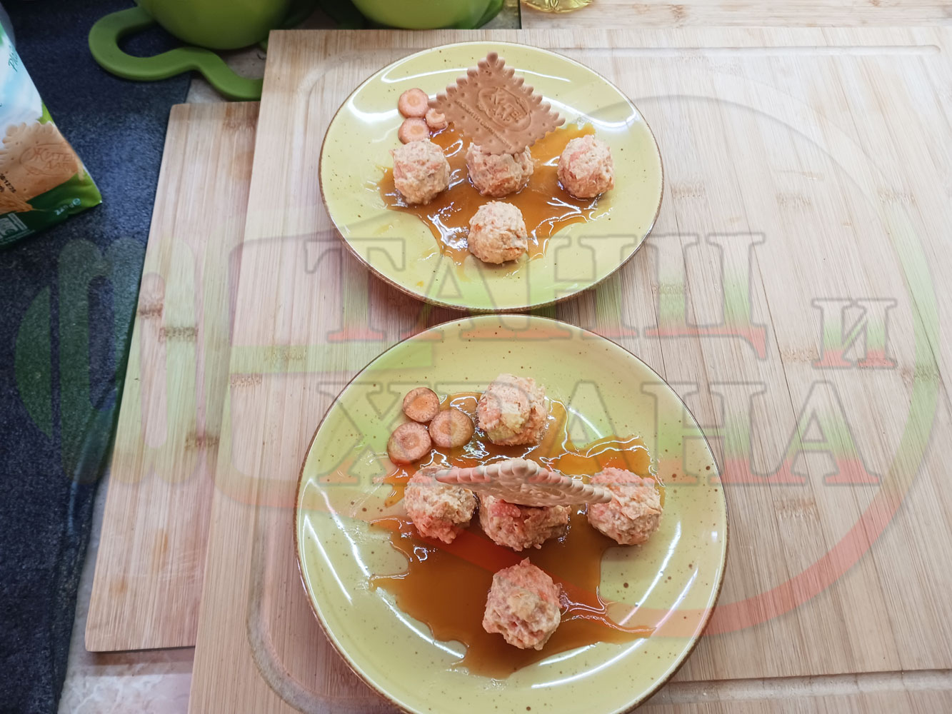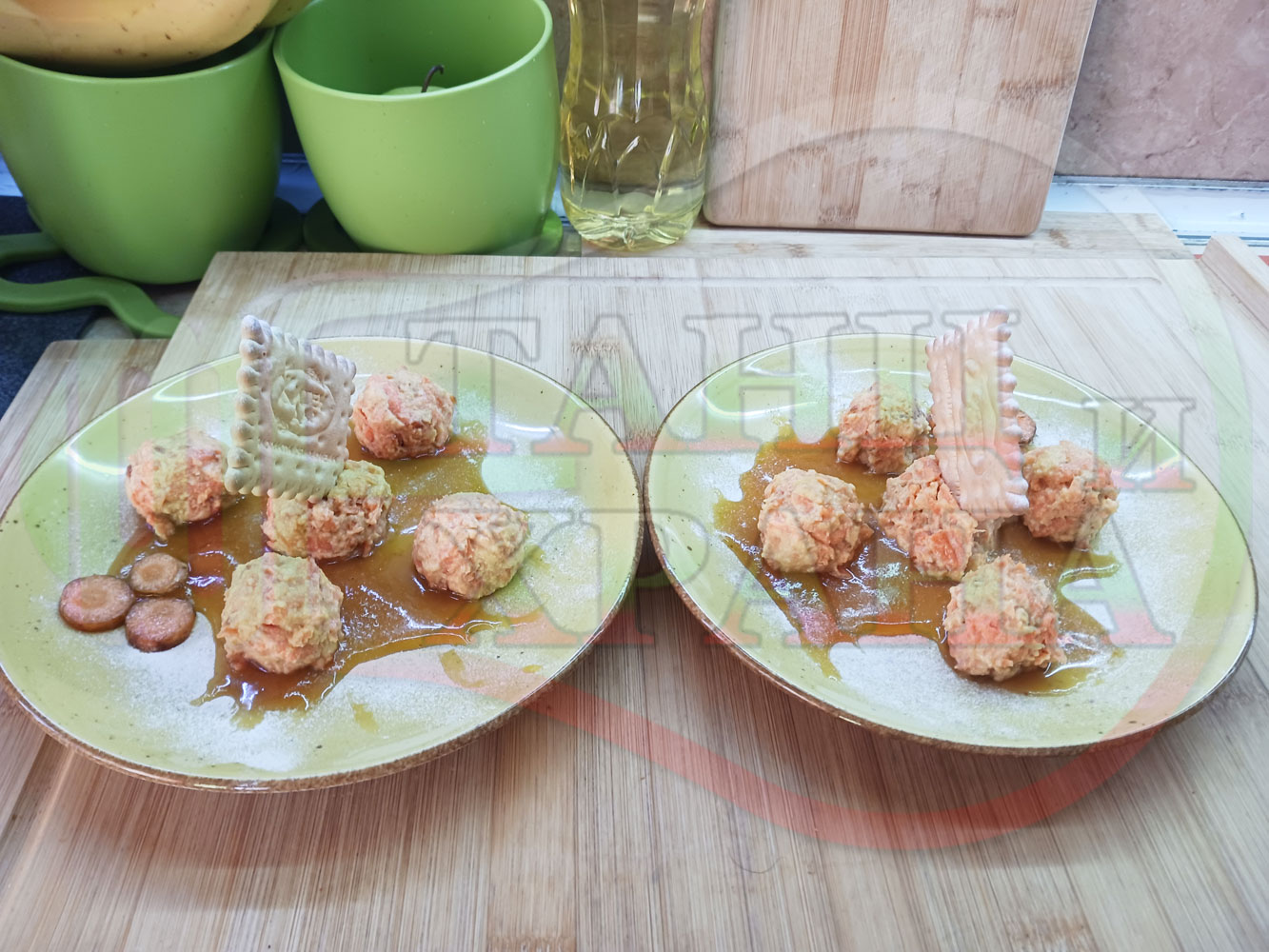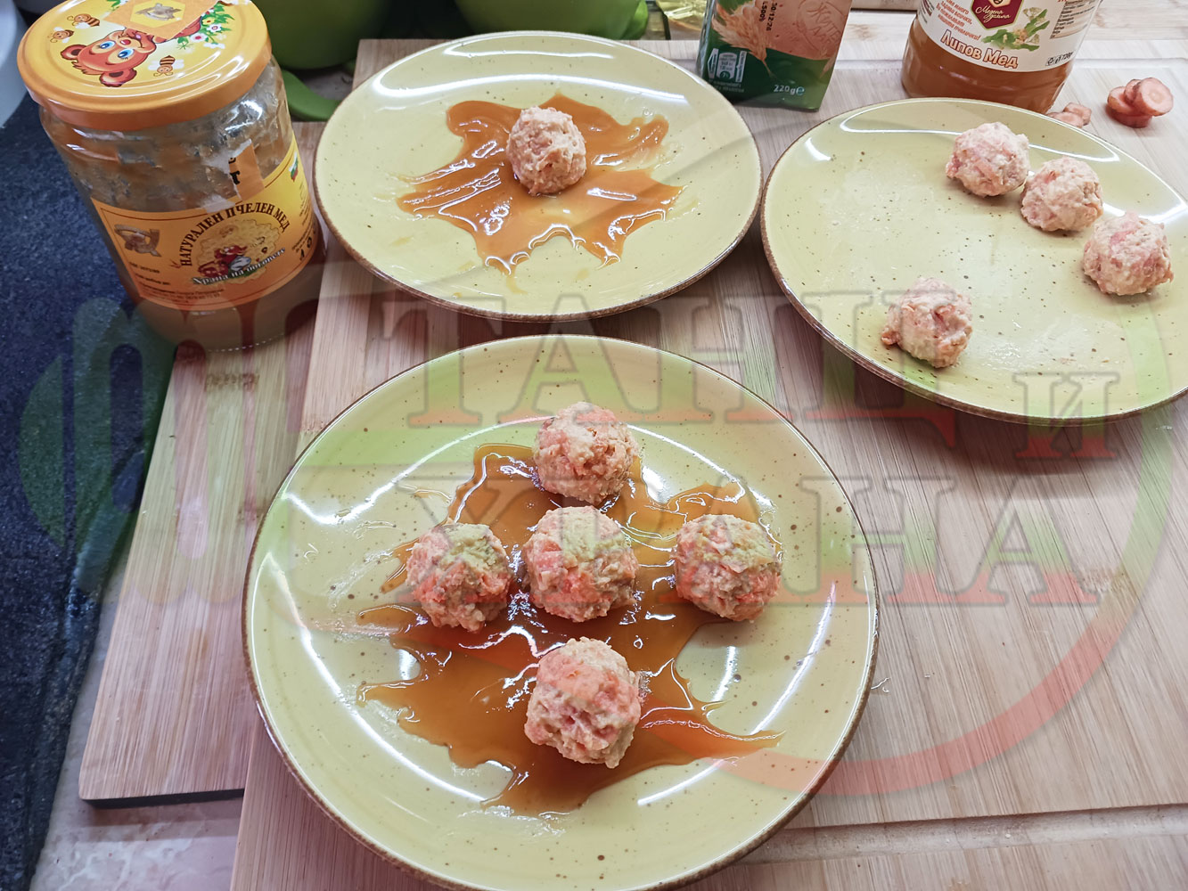 Сипете по 1 супена лъжица пчелен мед в средата на чиниите и го размажете по дъното в произволни форми или фигури. Подредете по 5 бисквитенотрюфелни морковени бонбона върху меда във всяка порция и украсете порциите с морковени мини кръгчета и с цели бисквитки (гарнирайте и украсете порциите по ваше желание и усмотрение).