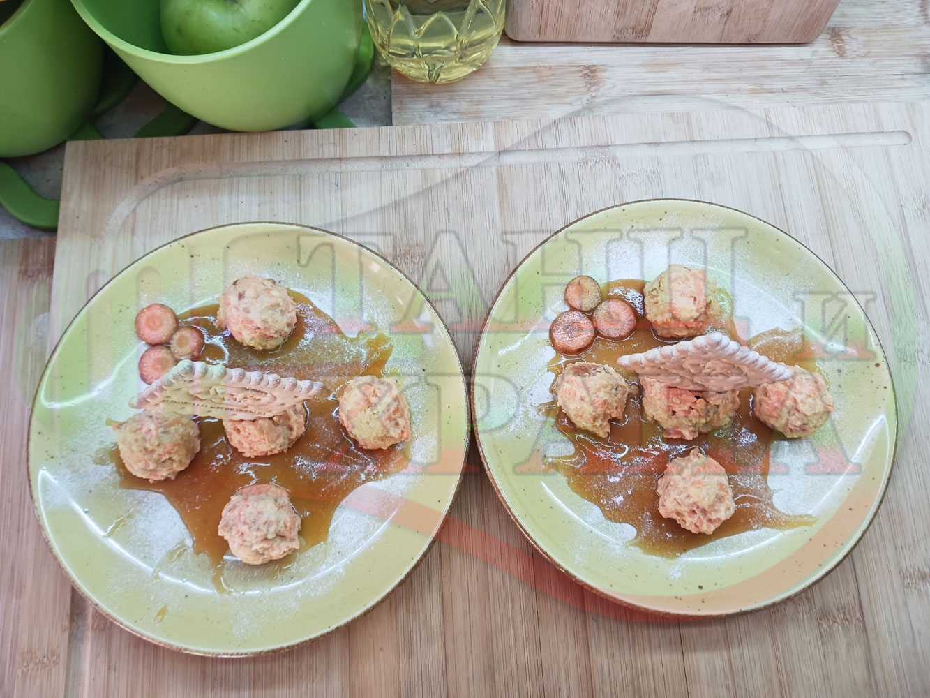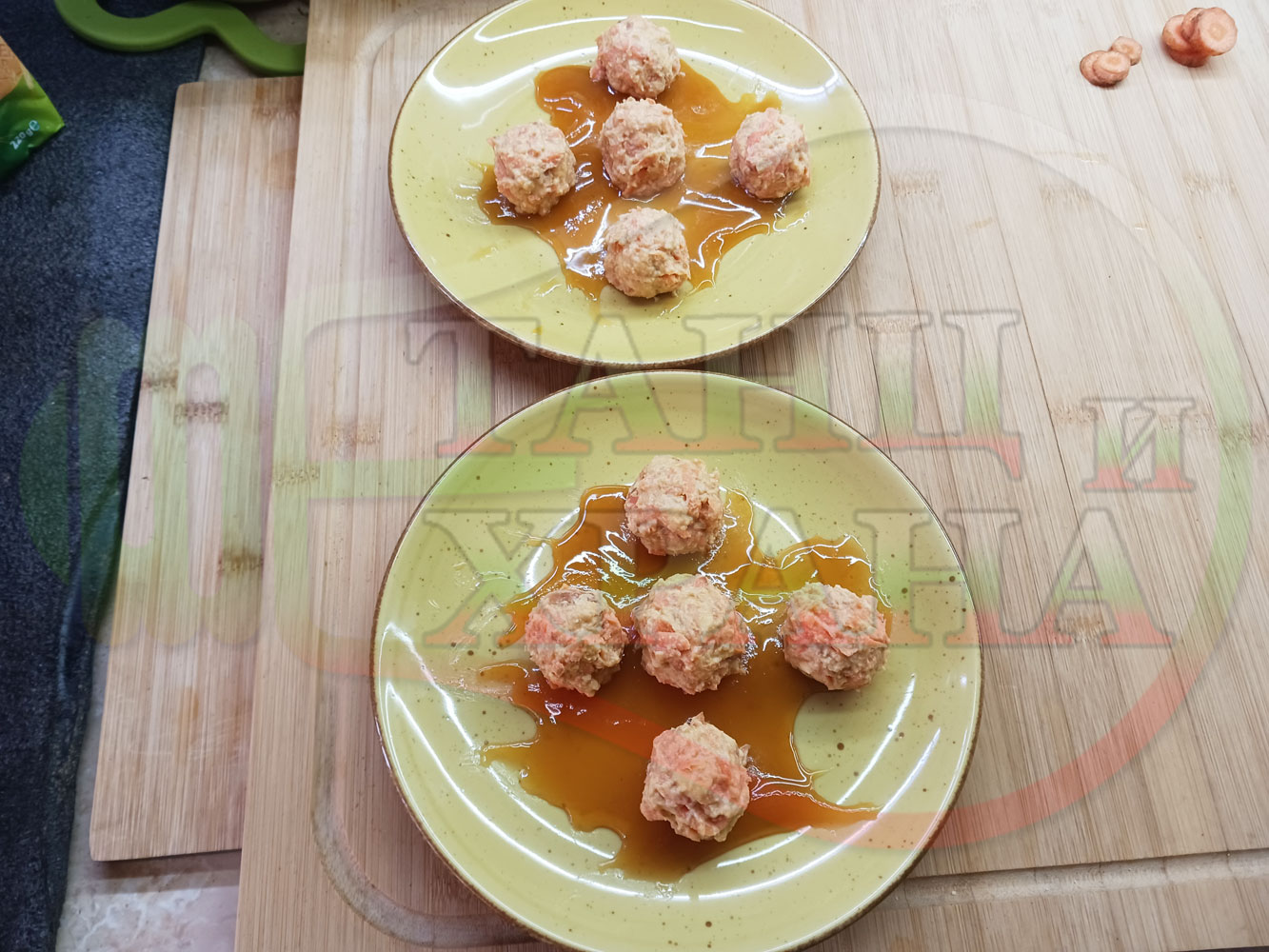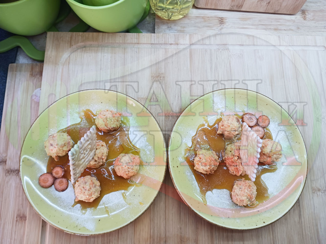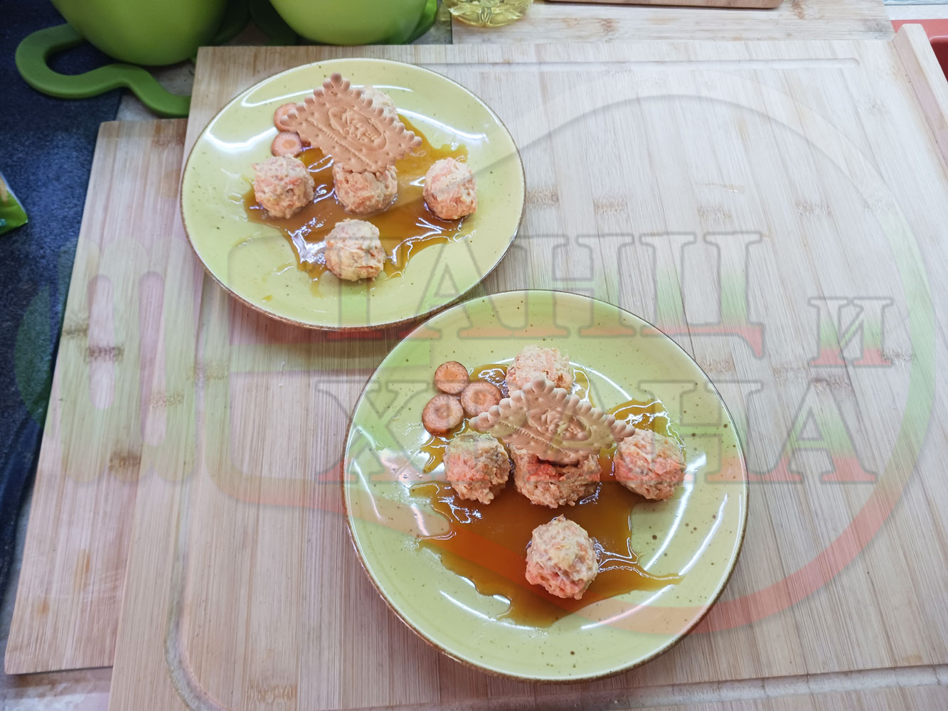 Сипете по 1 супена лъжица пчелен мед в средата на чиниите и го размажете по дъното в произволни форми или фигури. Подредете по 5 бисквитенотрюфелни морковени бонбона върху меда във всяка порция и украсете порциите с морковени мини кръгчета и с цели бисквитки (гарнирайте и украсете порциите по ваше желание и усмотрение).