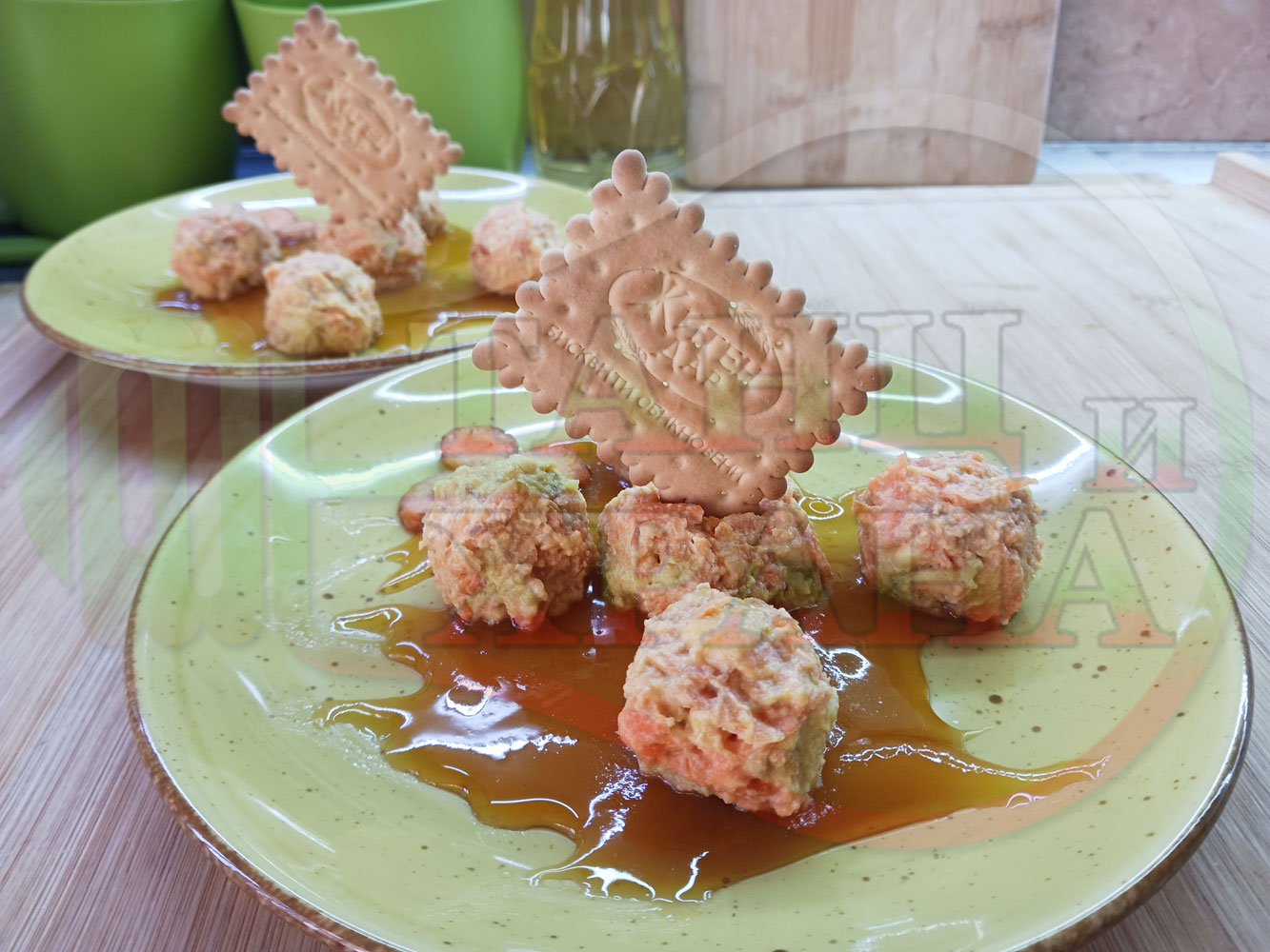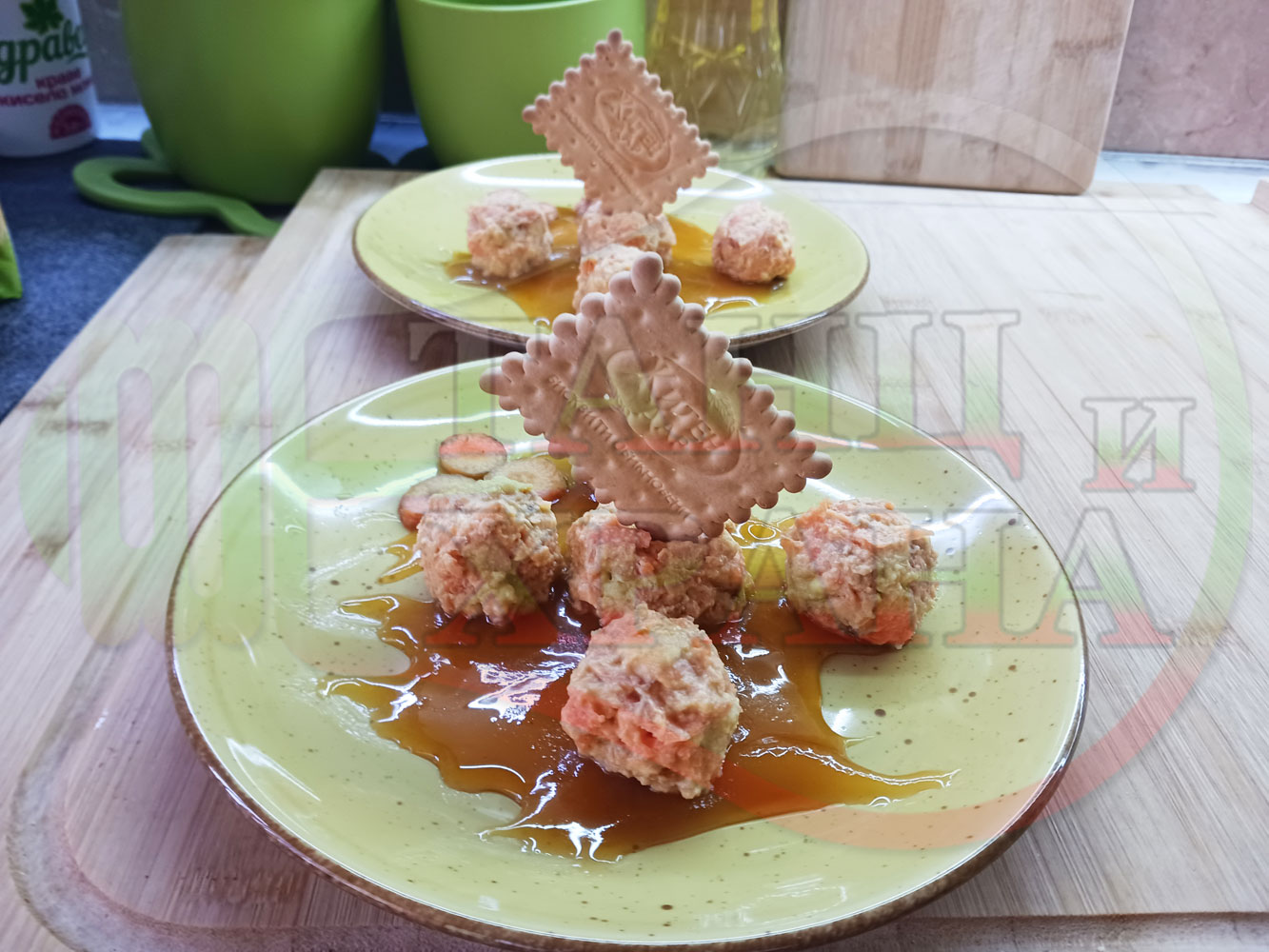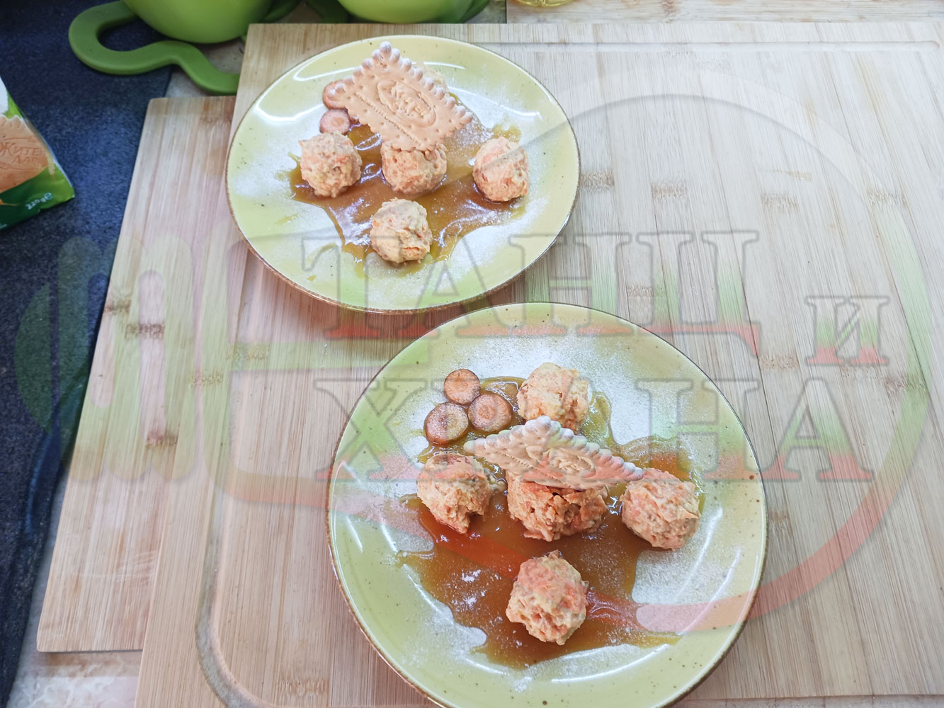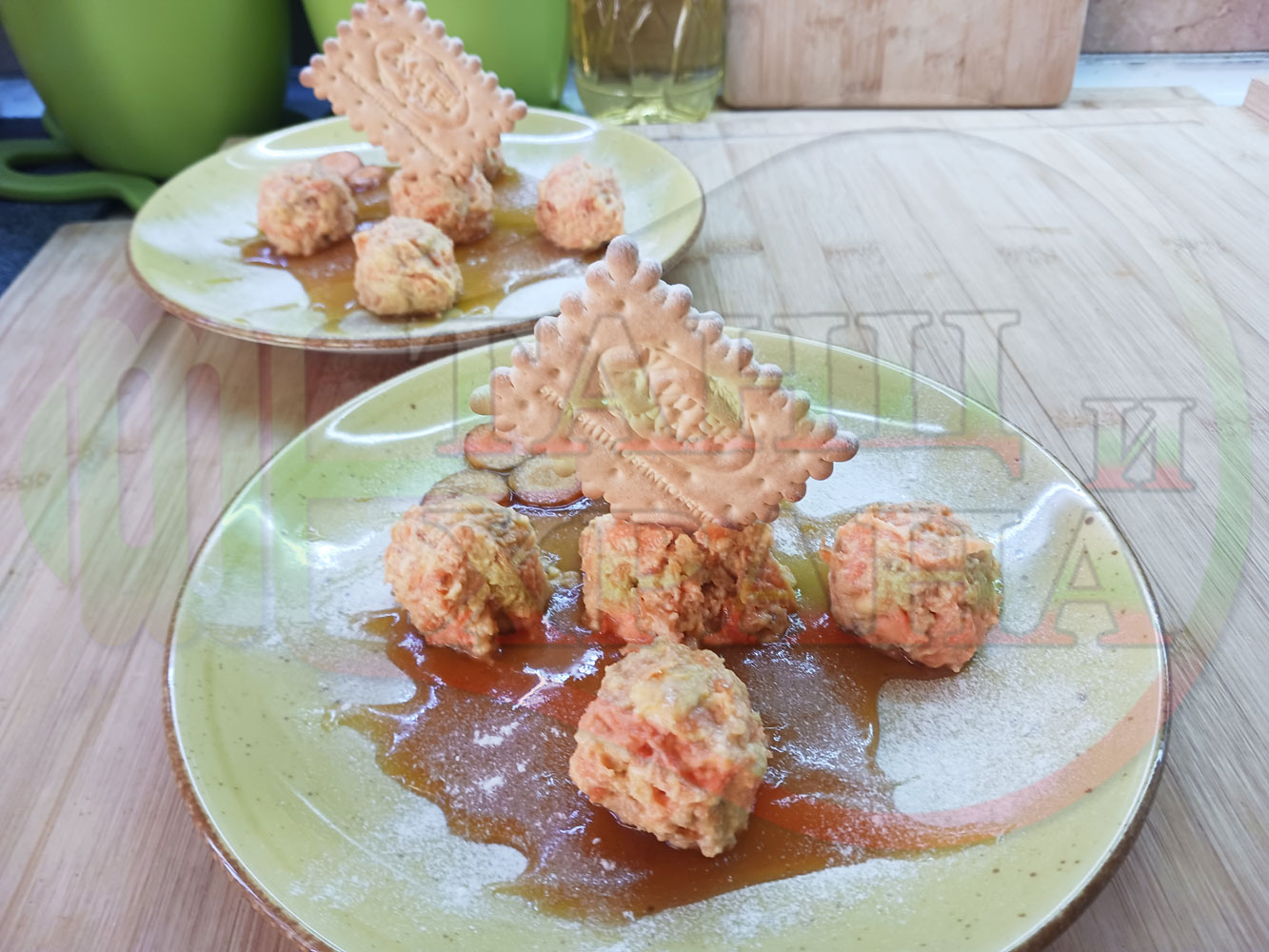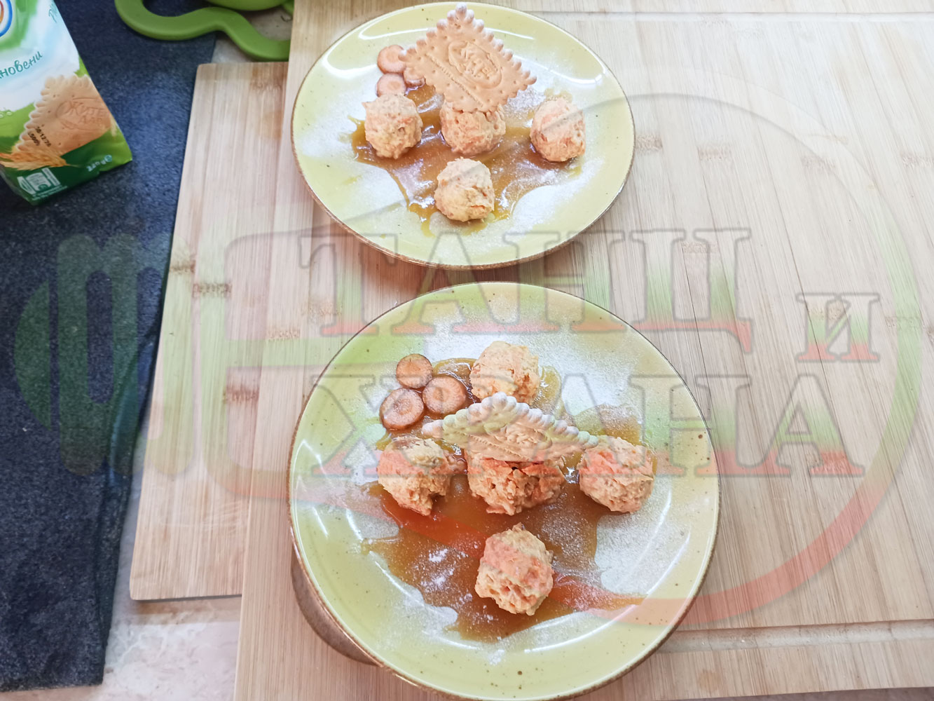 Български бисквитени бонбонени млечни десерти "Морковени бисквитенотрюфелни прясномлечни" приготвен с обикновени бисквити, прясно мляко и пресни моркови гарнирани с медна основа от билков пчелен мед