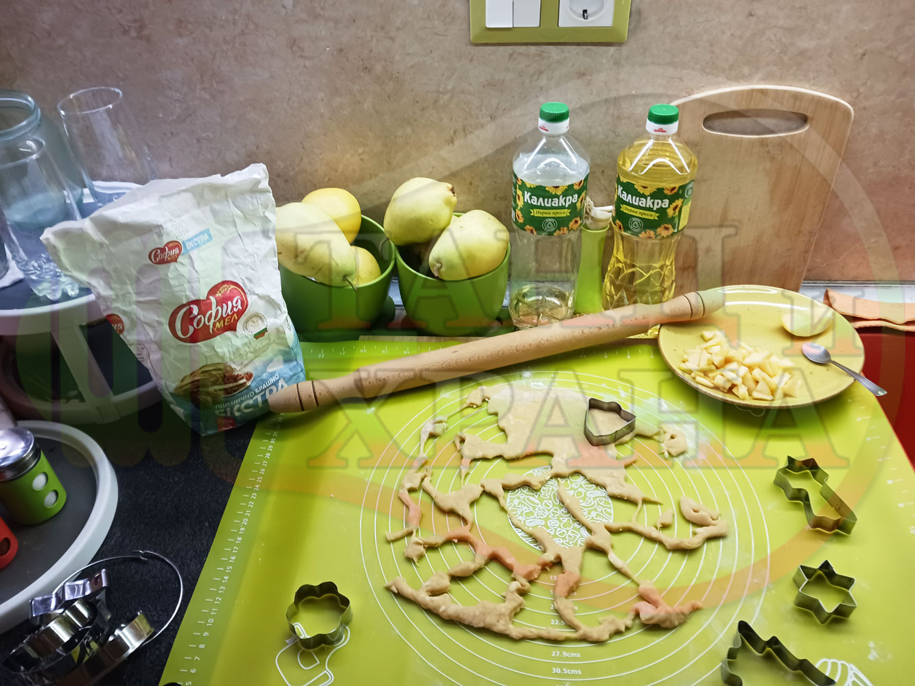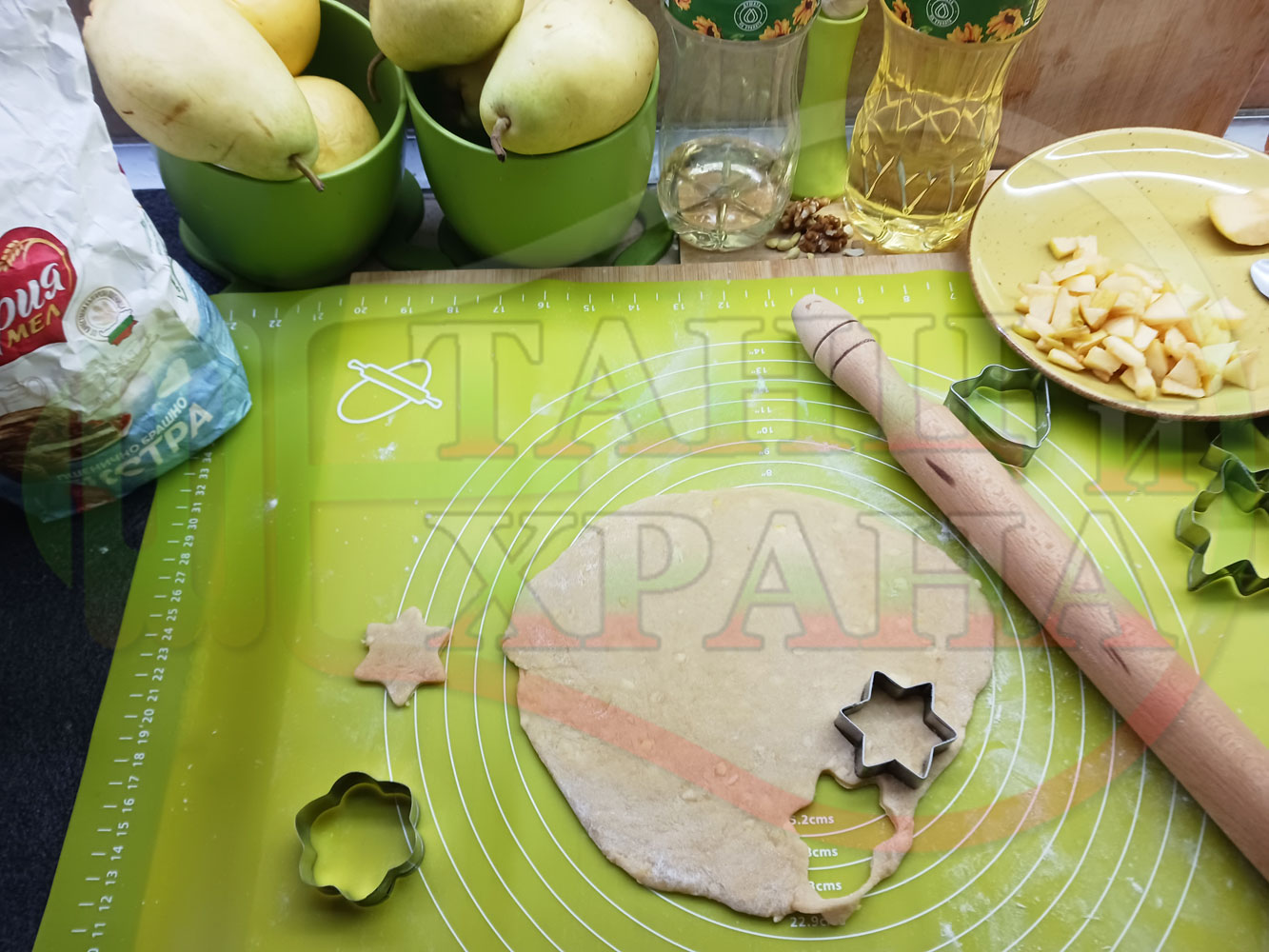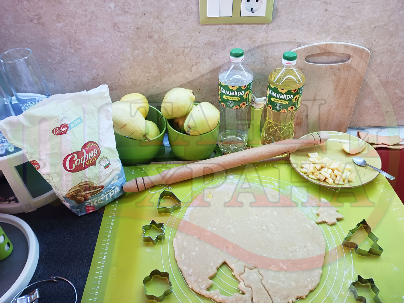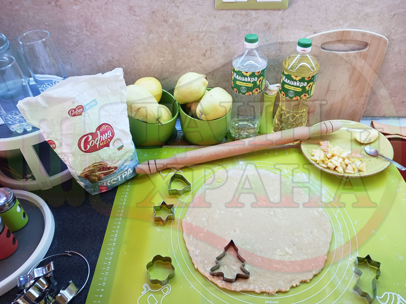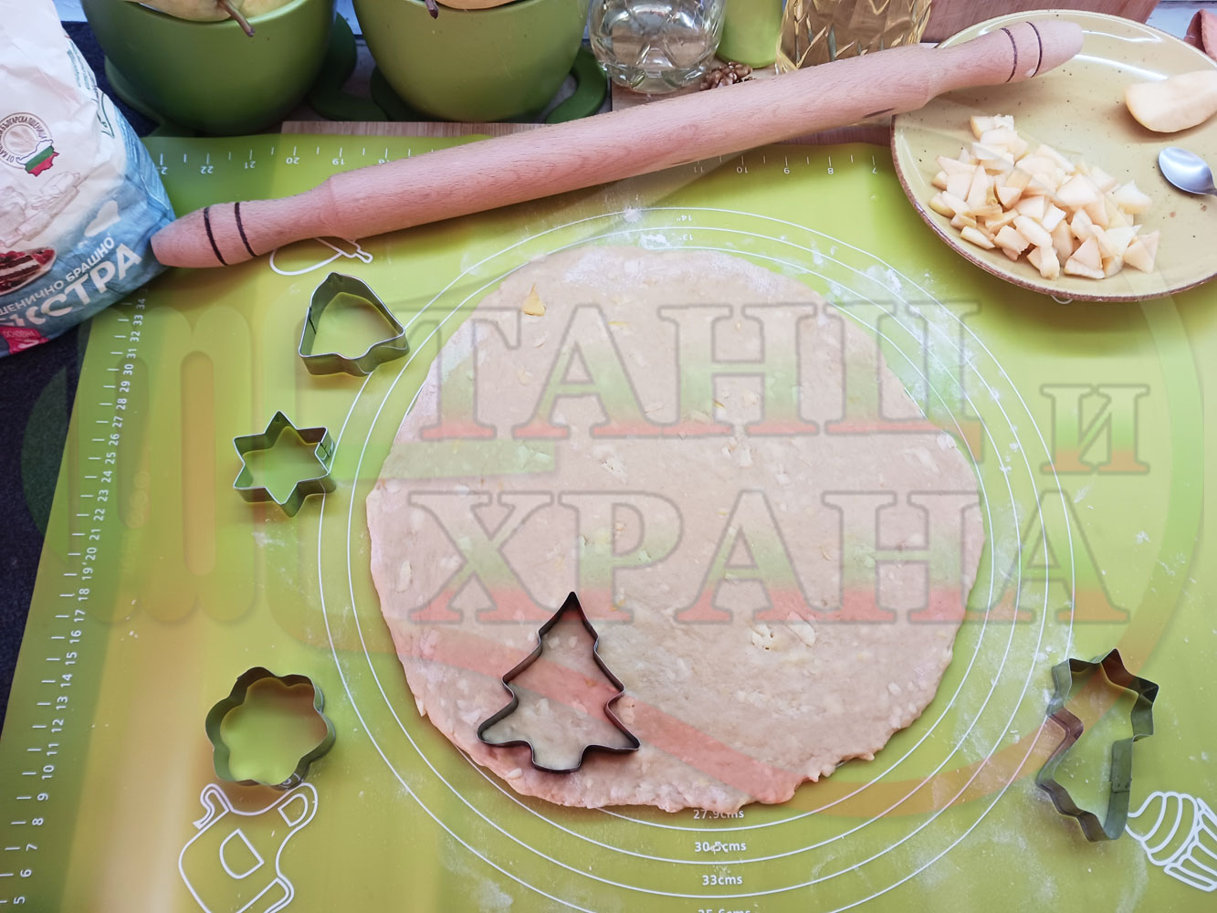 ПРОДУКТИ: Приблизителни количества за български класически коледни курабийки "Ябълкови канелени" приготвени с пресни ябълки и канела за Коледа 2025 г. омесени с брашно, яйца и кристална захар
