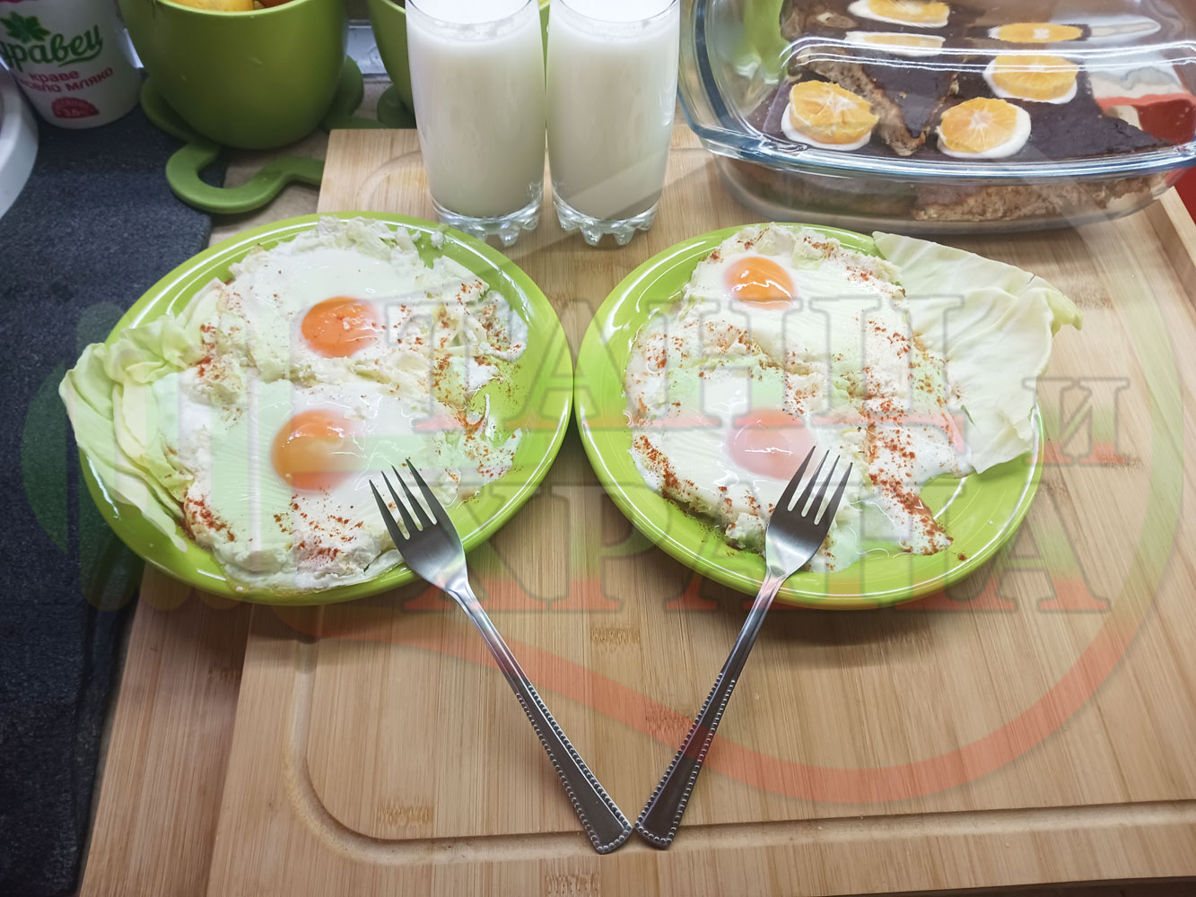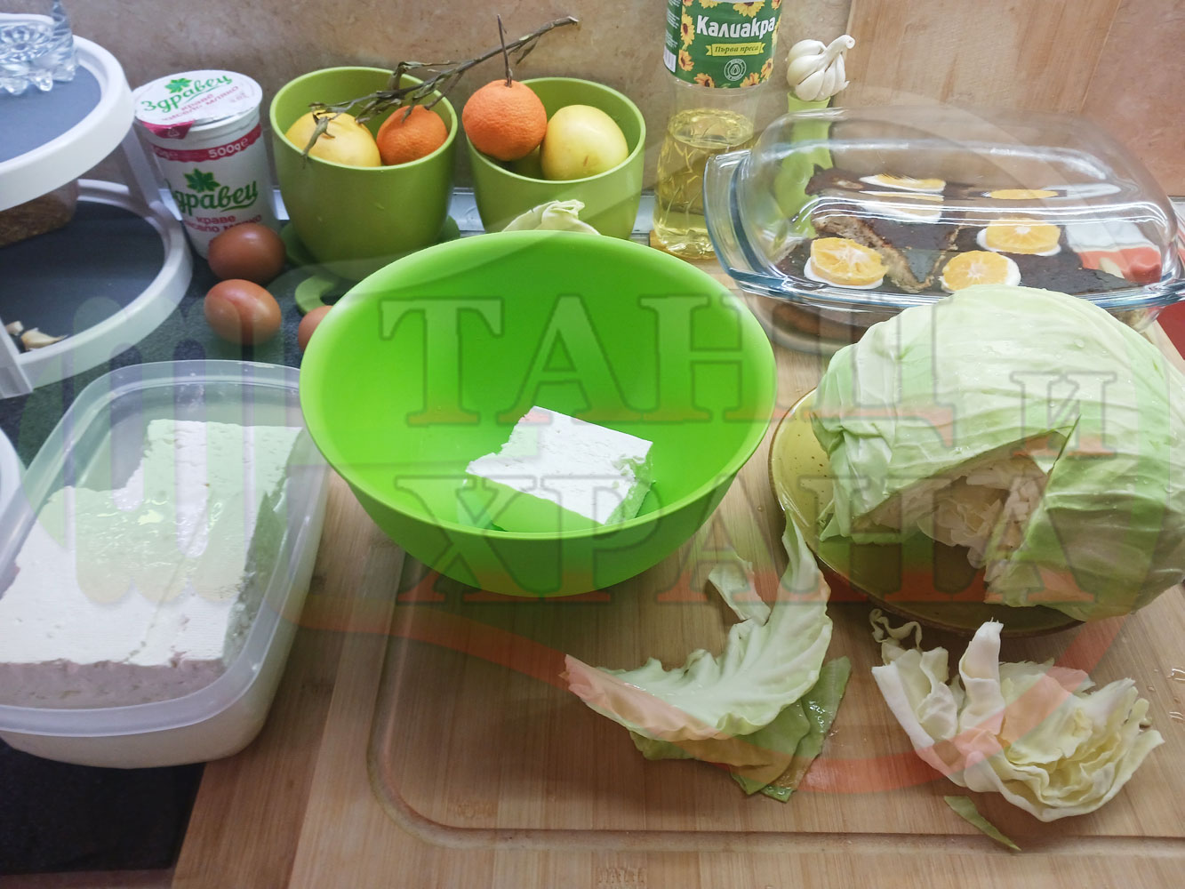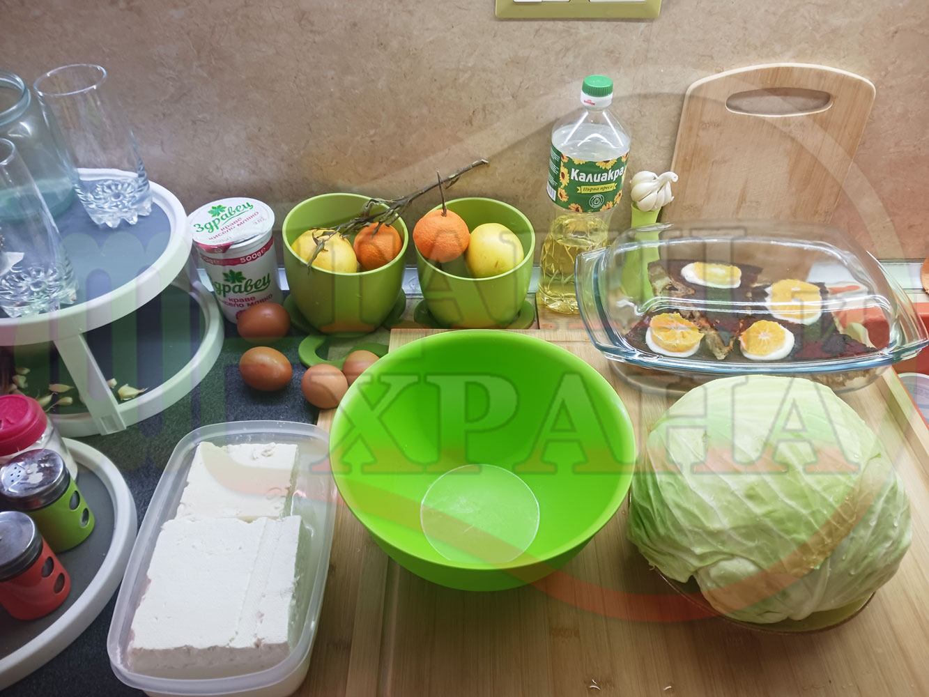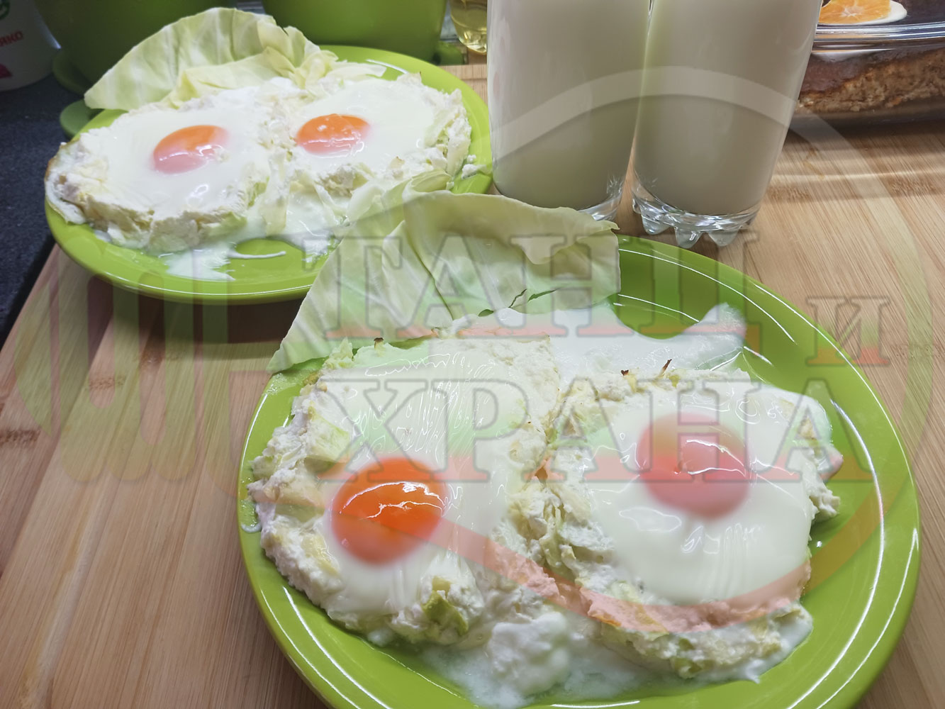 ПРОДУКТИ: Приблизителни количества за българска зеленчукова млечна яйчена салата "Пряснозелева с БГсирене" запечена на фурна със сиреново зелев крем от прясно зеле и краве бяло сирене оформен на кладенчета напълнени с яйца на очи гарнирана с кисело мляко от България - двукомпонентна