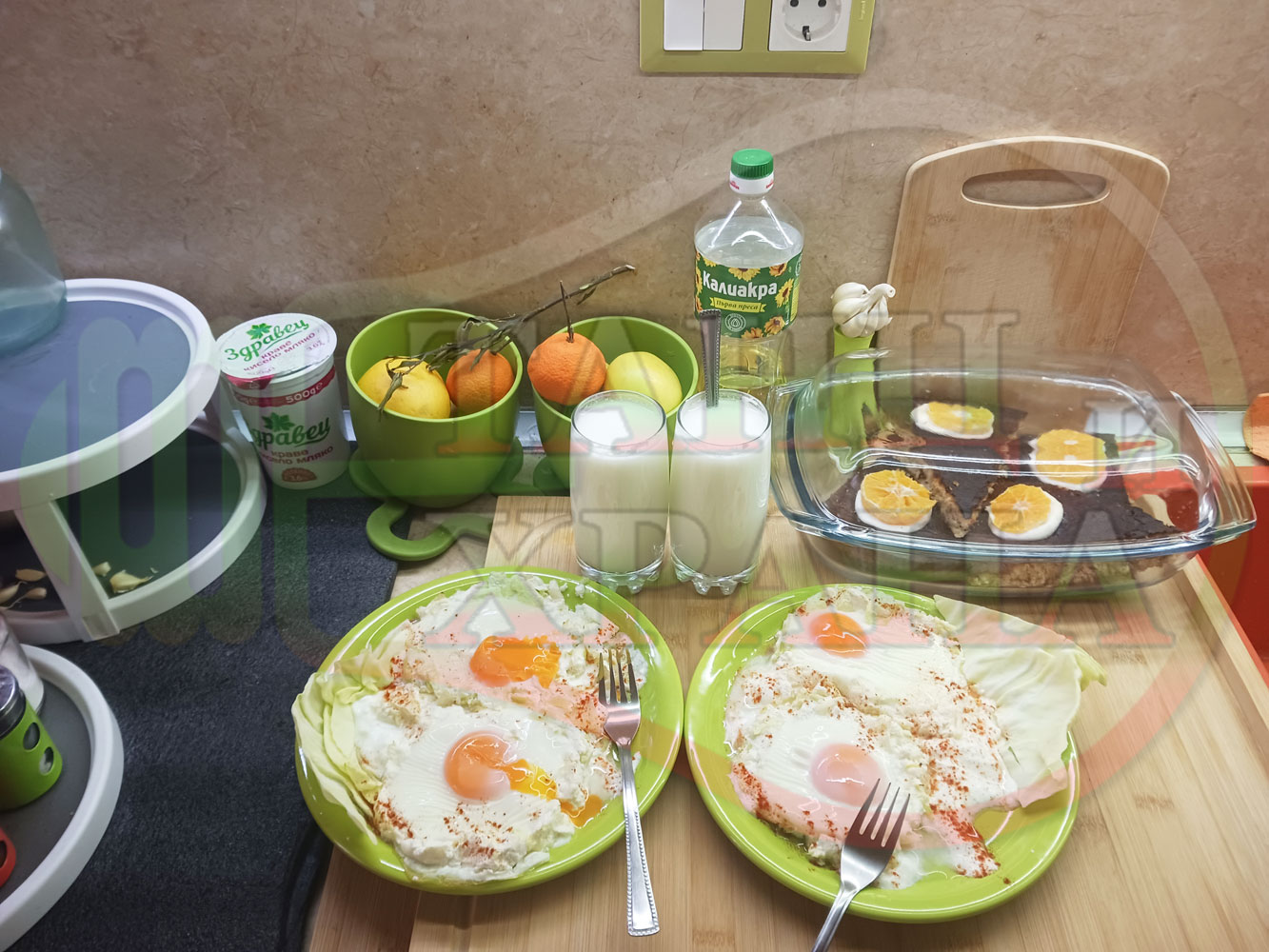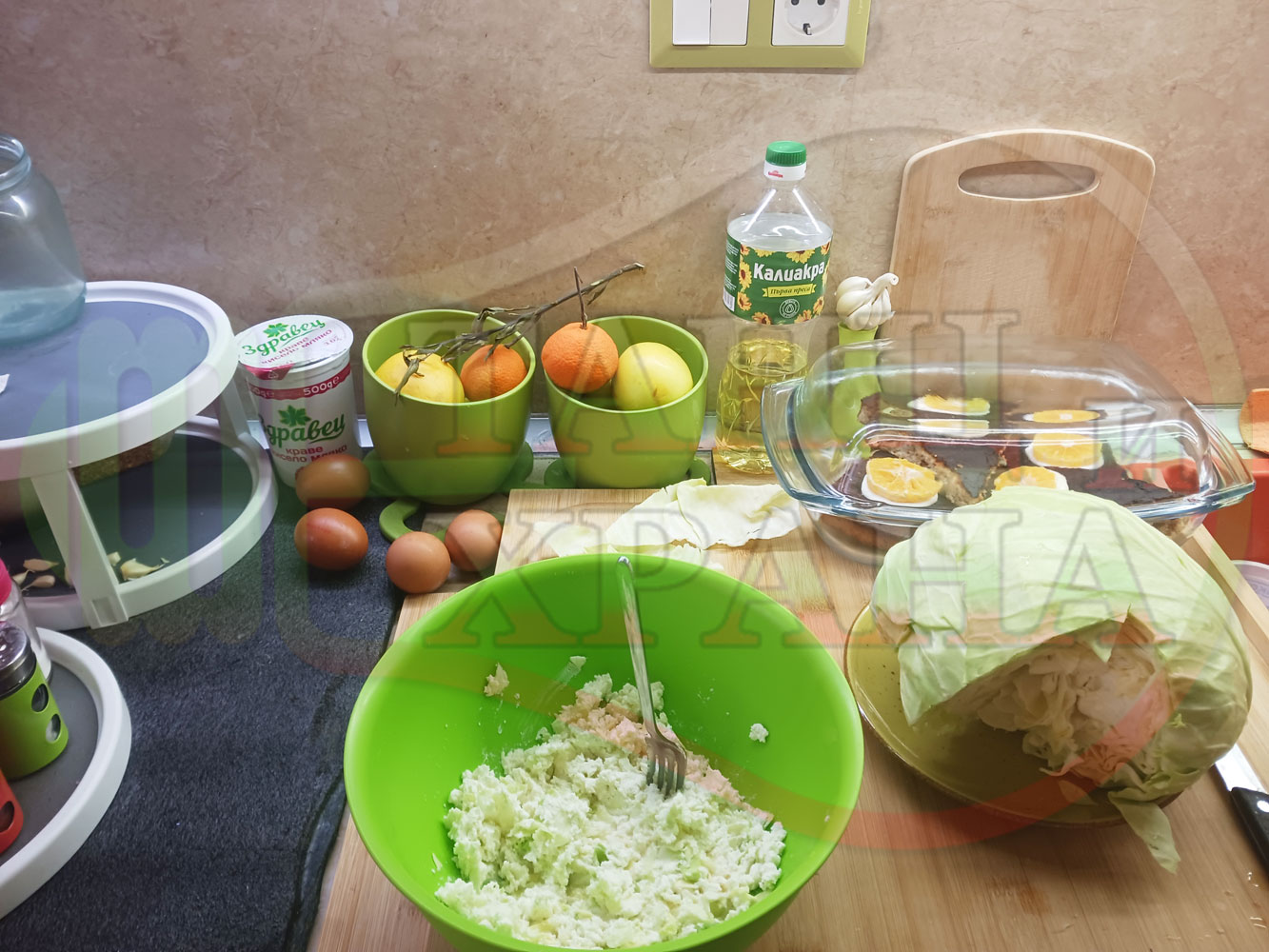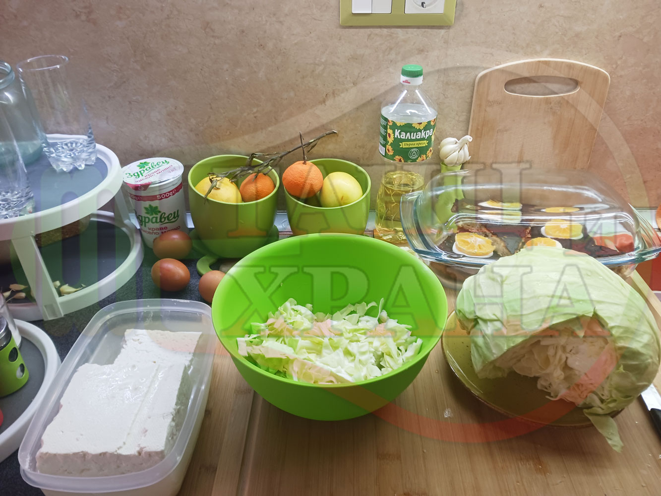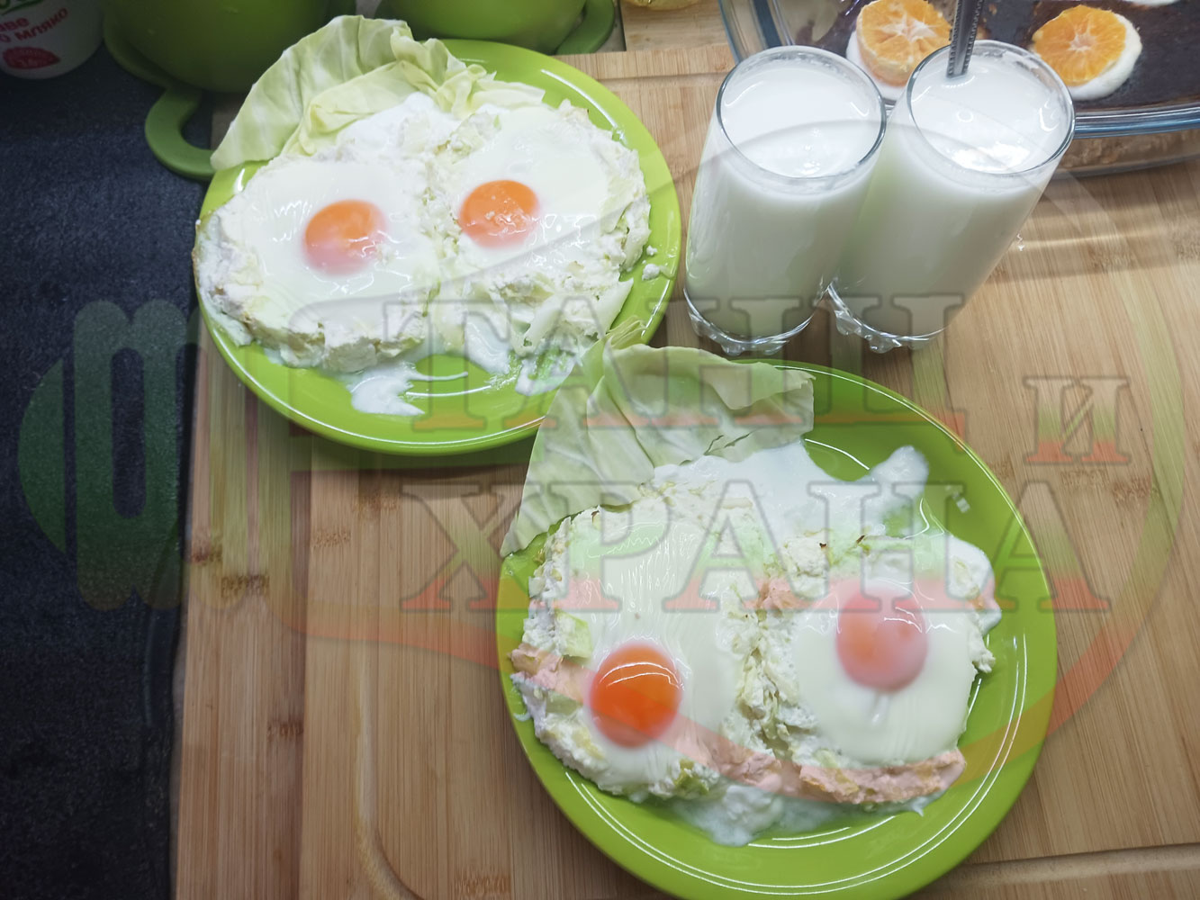 ПРОДУКТИ: Приблизителни количества за българска зеленчукова млечна яйчена салата "Пряснозелева с БГсирене" запечена на фурна със сиреново зелев крем от прясно зеле и краве бяло сирене оформен на кладенчета напълнени с яйца на очи гарнирана с кисело мляко от България - двукомпонентна