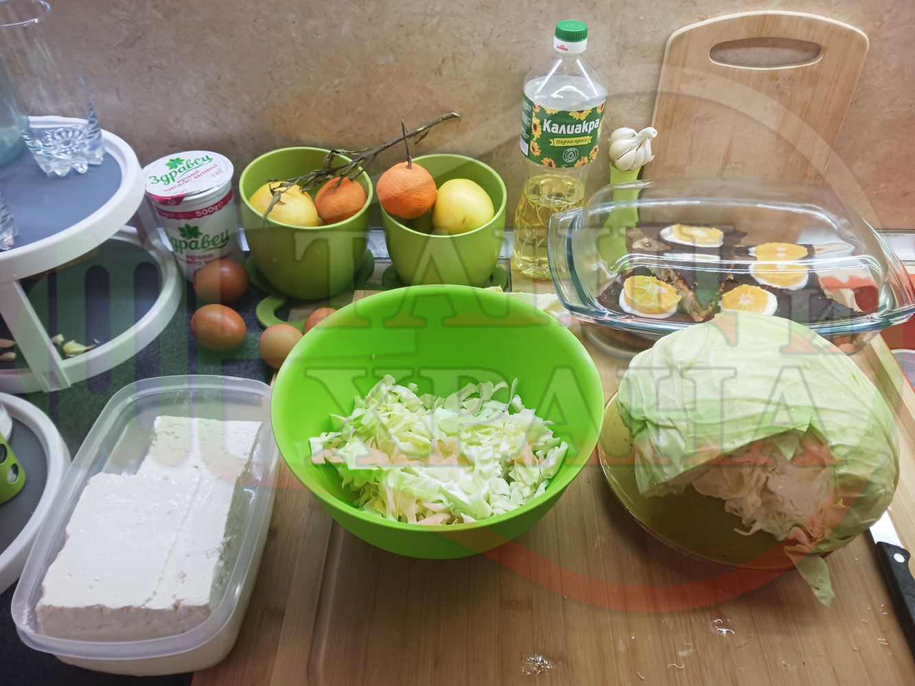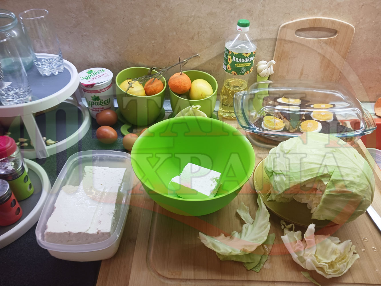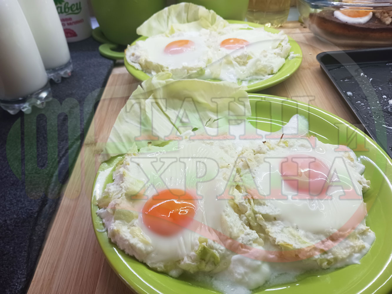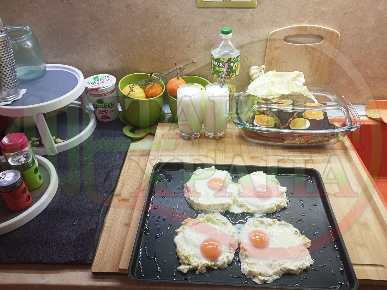 ПРОДУКТИ: Приблизителни количества за българска зеленчукова млечна яйчена салата "Пряснозелева с БГсирене" запечена на фурна със сиреново зелев крем от прясно зеле и краве бяло сирене оформен на кладенчета напълнени с яйца на очи гарнирана с кисело мляко от България - двукомпонентна