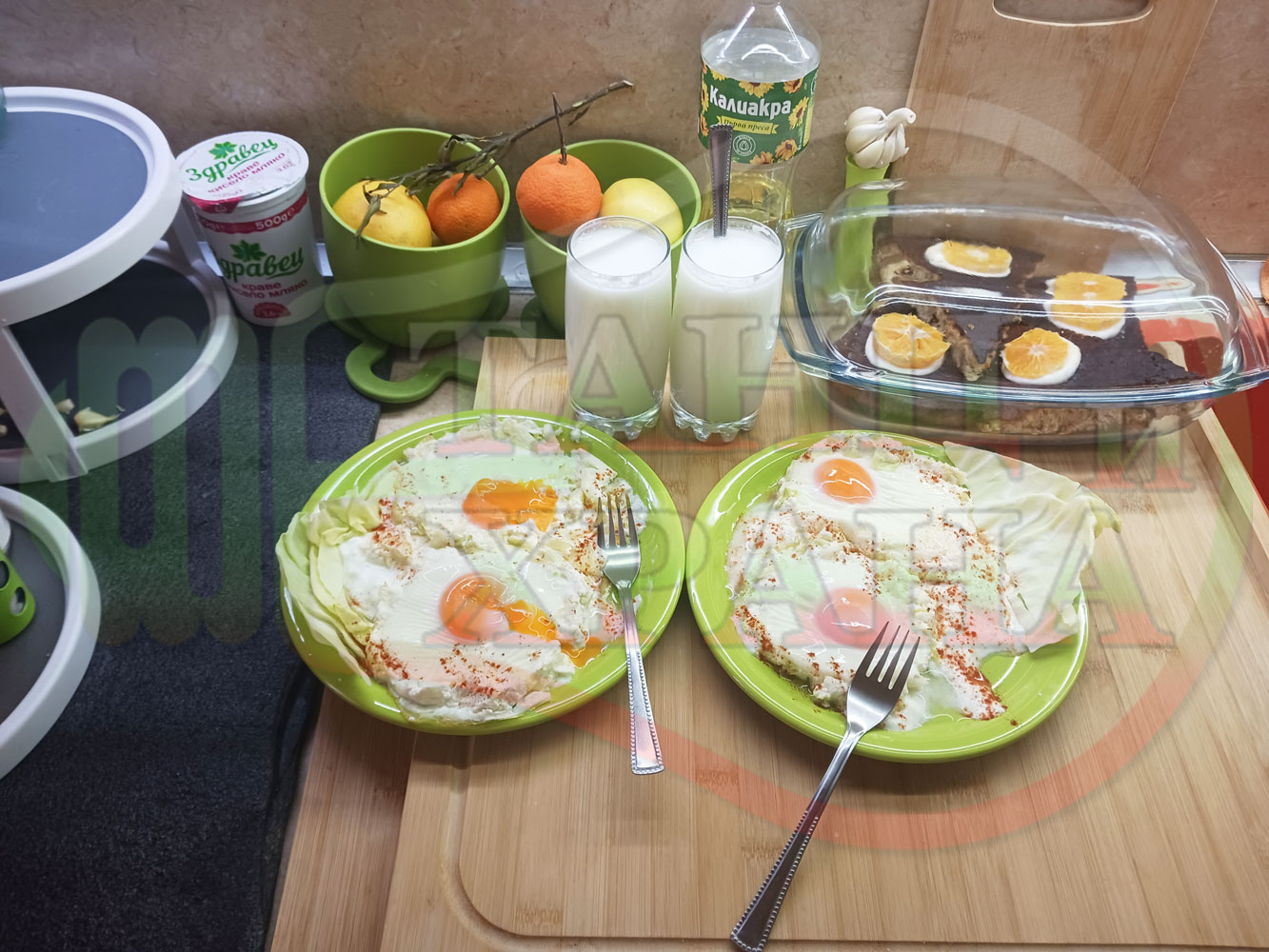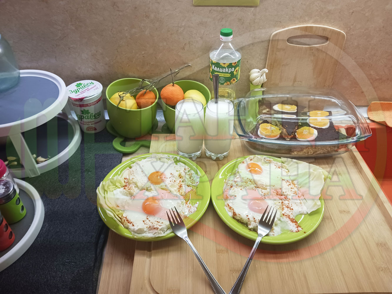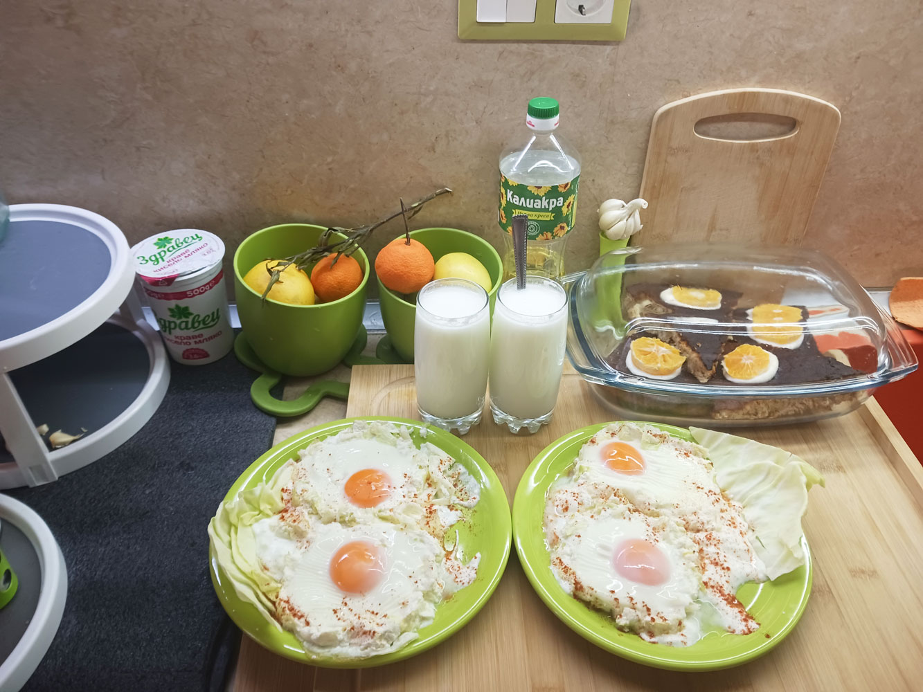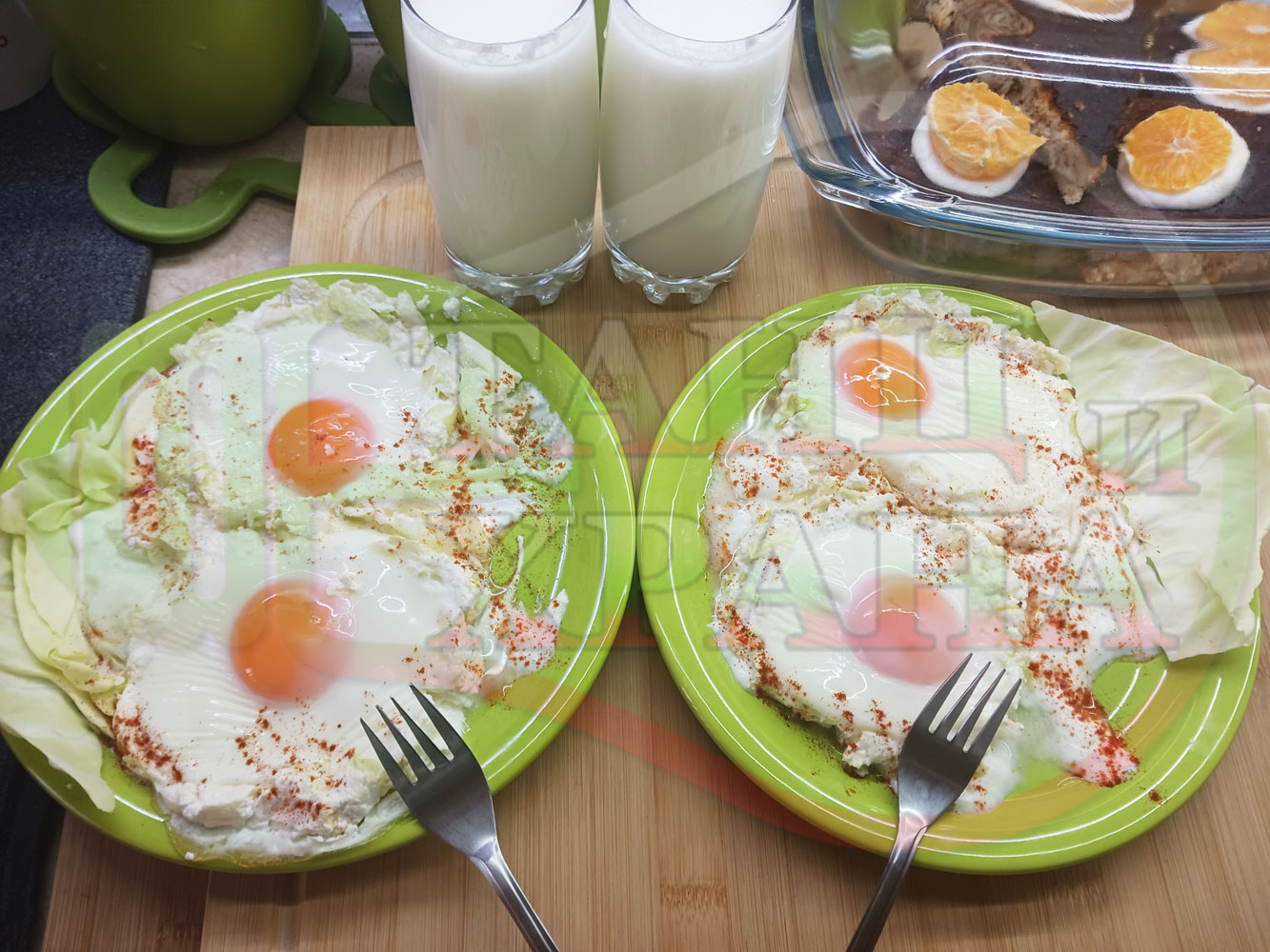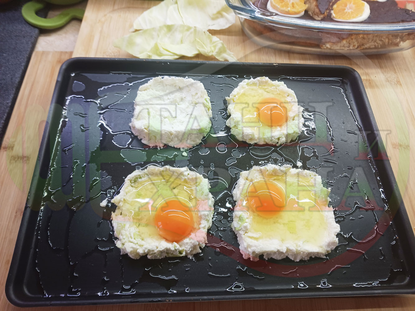 Спретнах изключително вкусна зеленчукова салата с яйца на очи приготвена със сиреново зелев крем с прясно зеле и българско краве бяло, саламурено сирене, запечена на фурна. Ммммм... в кухнята ухае на съвсем леко запечено българско сирене, разтопило се при запичането, усвоило соковете от запеченото прясно зеле и яйцата. При хапване се усеща леката хрупкавина на зелето в идеална хармония и баланс с млечната основа от българското кисело мляко и червения сладък пипер. Киселото мляко обединява, допълва и придава сочност на салатата в комбинация с разтичащия се жълтък от рохко запечените яйца. Получи се голяма вкусно, вкусна, вкусотия (вкуснотия)...laughing полезна и богата на протеини, минерали и микроелементи.