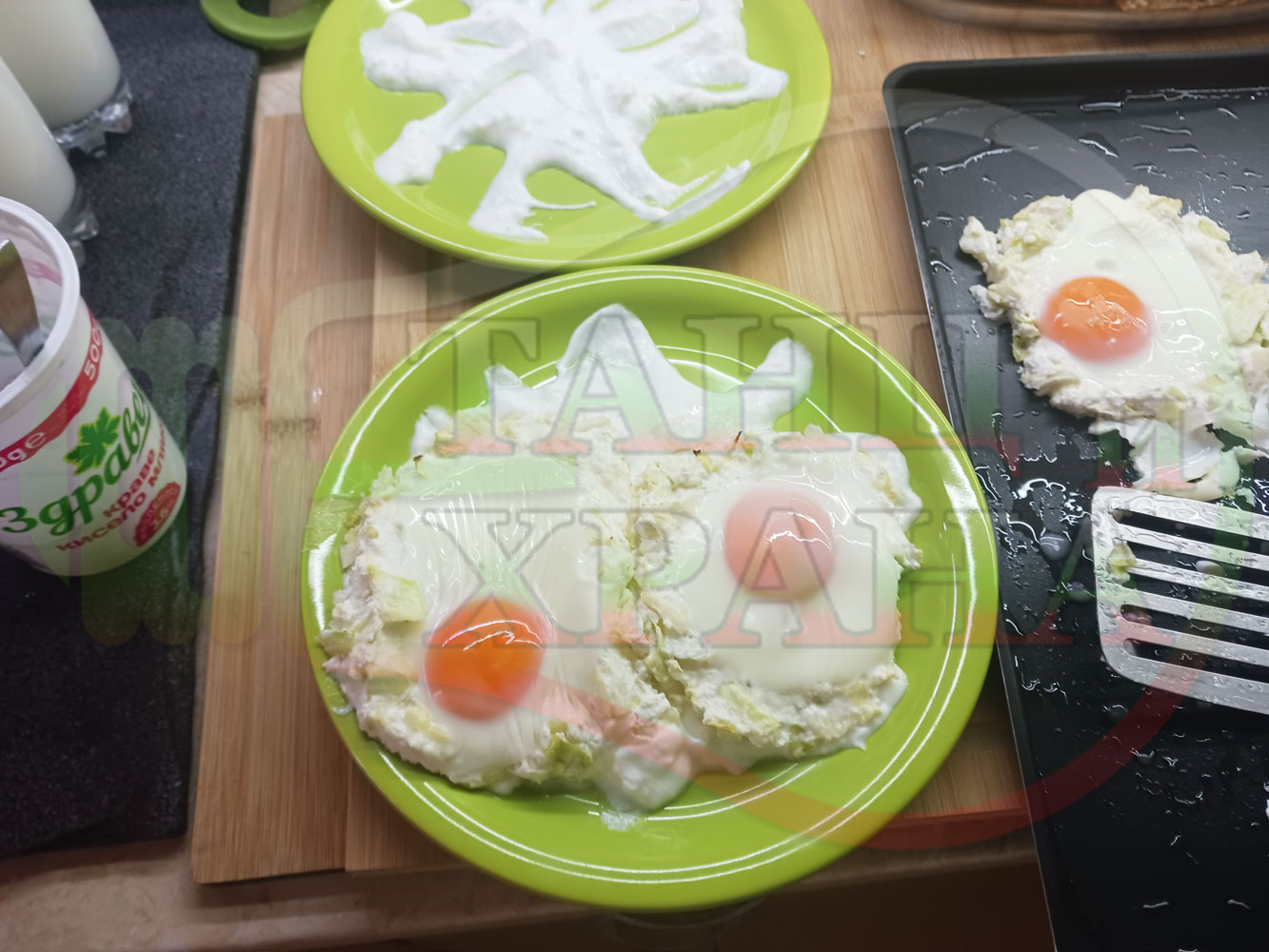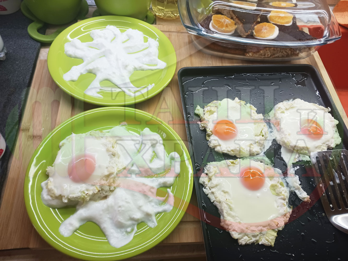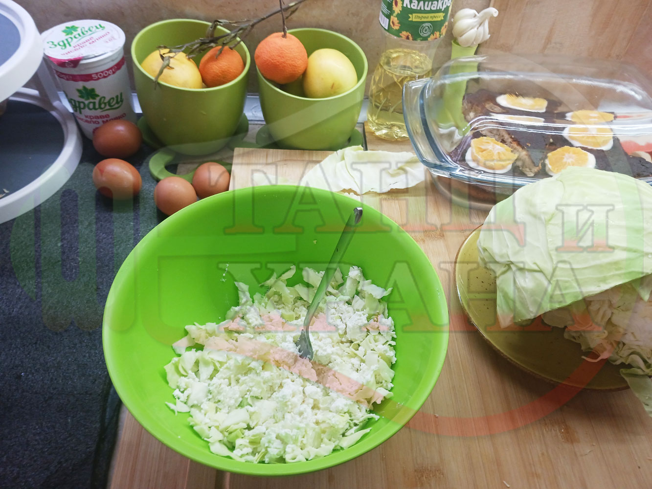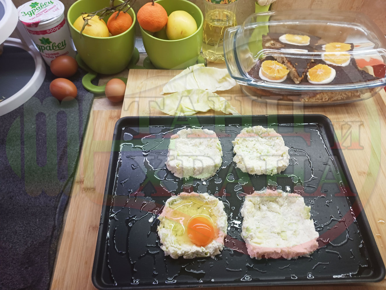 Спретнах изключително вкусна зеленчукова салата с яйца на очи приготвена със сиреново зелев крем с прясно зеле и българско краве бяло, саламурено сирене, запечена на фурна. Ммммм... в кухнята ухае на съвсем леко запечено българско сирене, разтопило се при запичането, усвоило соковете от запеченото прясно зеле и яйцата. При хапване се усеща леката хрупкавина на зелето в идеална хармония и баланс с млечната основа от българското кисело мляко и червения сладък пипер. Киселото мляко обединява, допълва и придава сочност на салатата в комбинация с разтичащия се жълтък от рохко запечените яйца. Получи се голяма вкусно, вкусна, вкусотия (вкуснотия)...laughing полезна и богата на протеини, минерали и микроелементи.