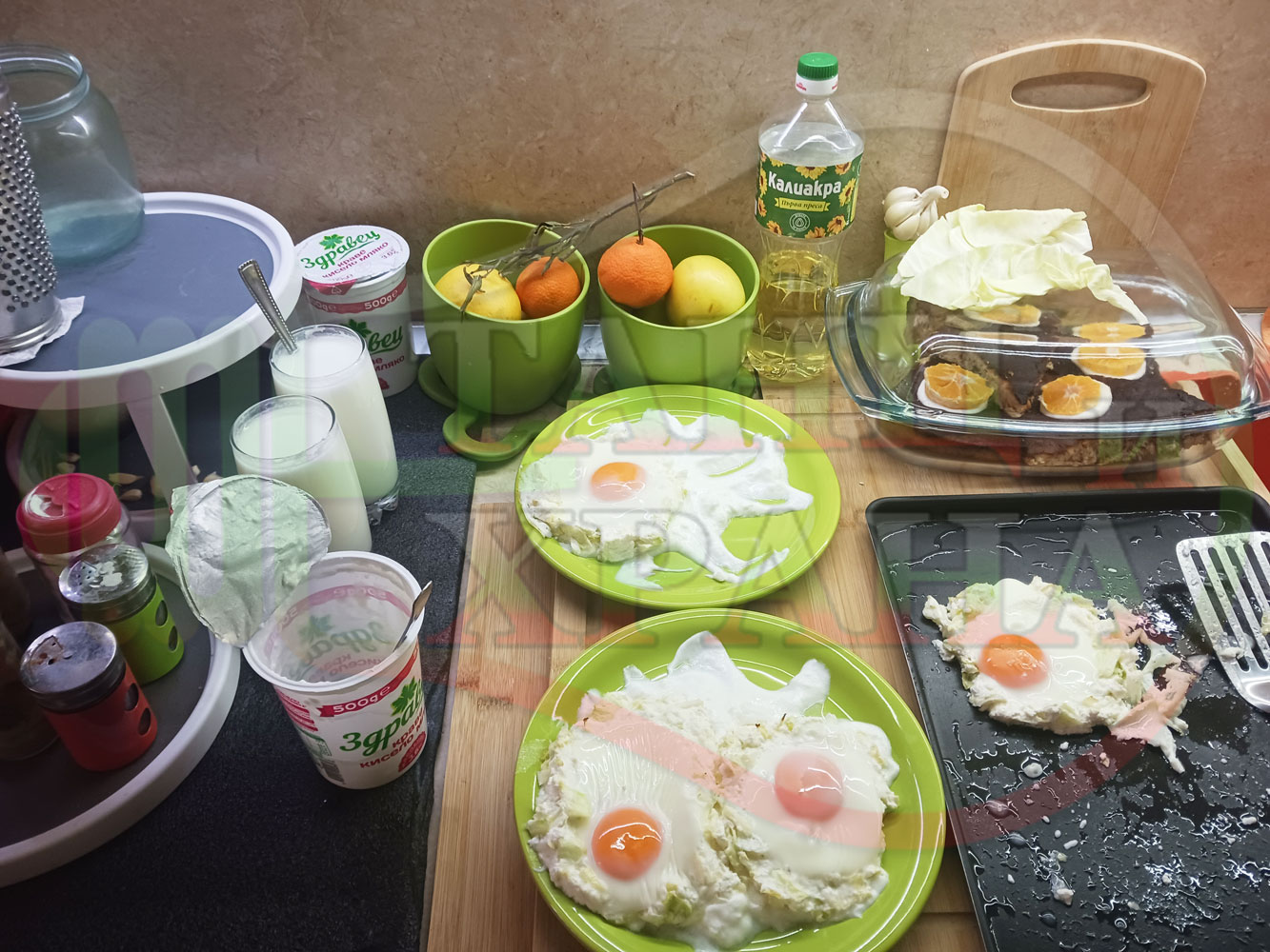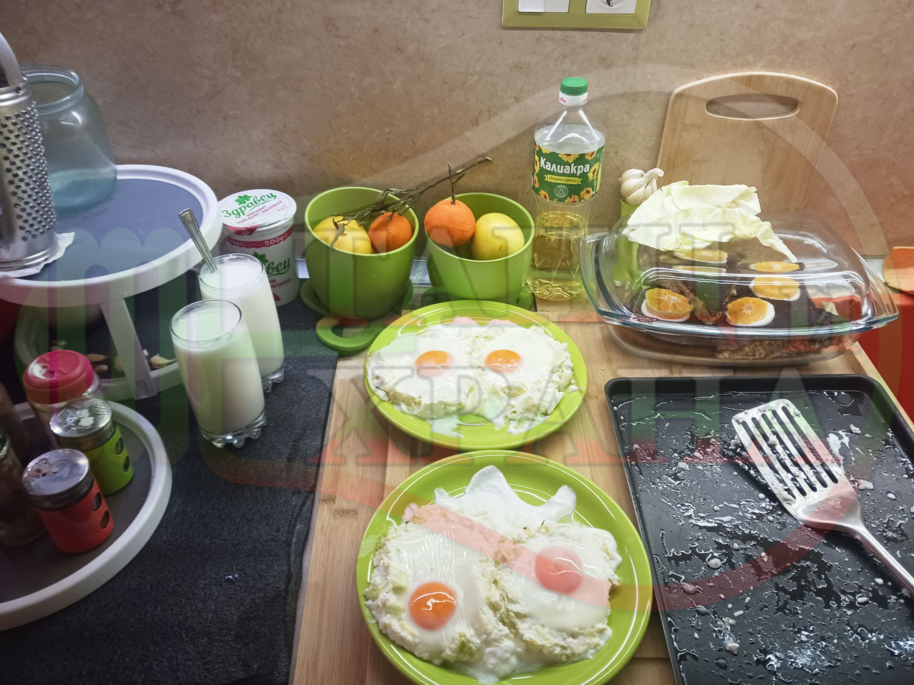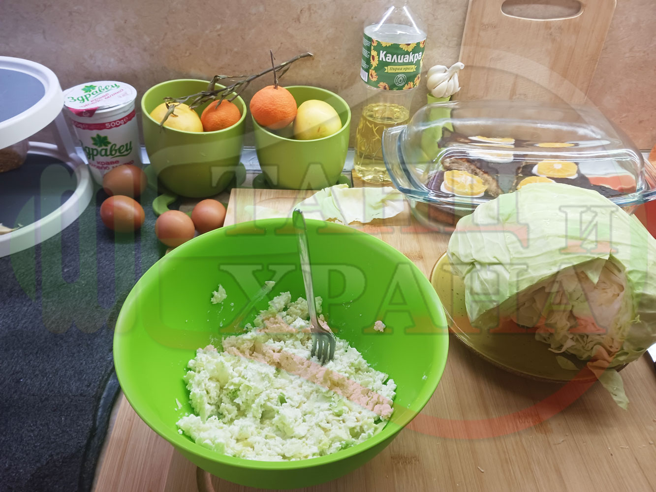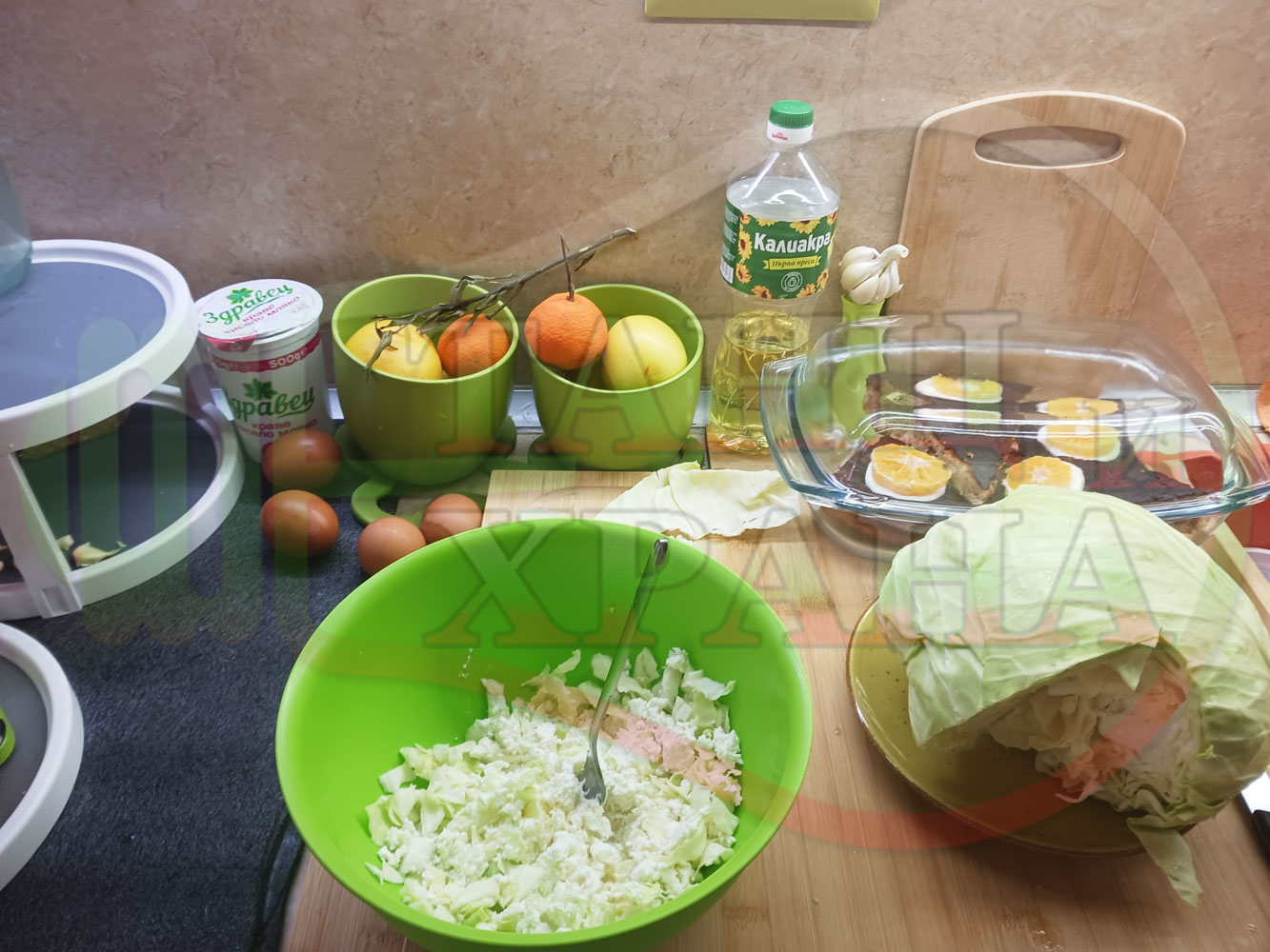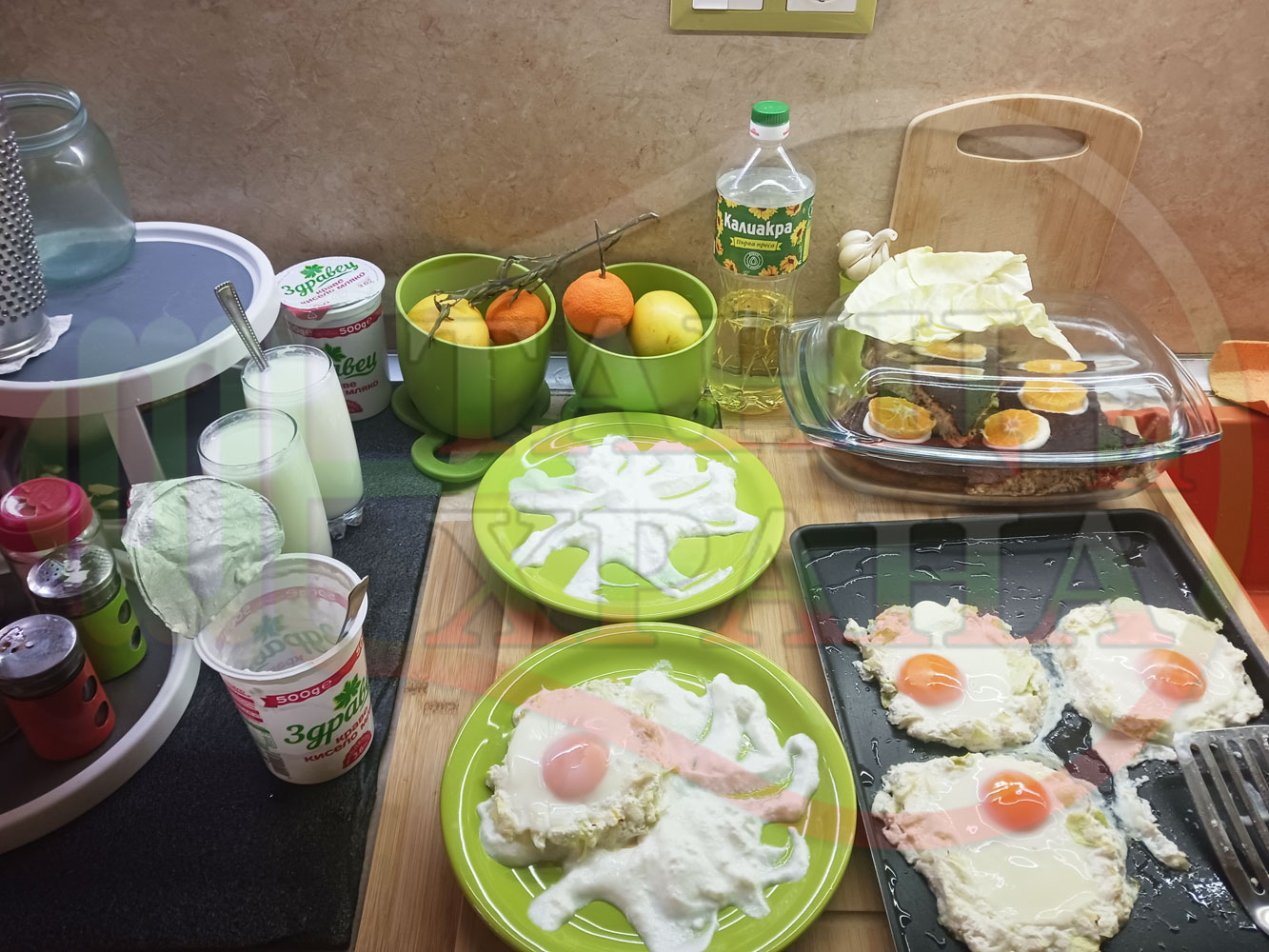 Спретнах изключително вкусна зеленчукова салата с яйца на очи приготвена със сиреново зелев крем с прясно зеле и българско краве бяло, саламурено сирене, запечена на фурна. Ммммм... в кухнята ухае на съвсем леко запечено българско сирене, разтопило се при запичането, усвоило соковете от запеченото прясно зеле и яйцата. При хапване се усеща леката хрупкавина на зелето в идеална хармония и баланс с млечната основа от българското кисело мляко и червения сладък пипер. Киселото мляко обединява, допълва и придава сочност на салатата в комбинация с разтичащия се жълтък от рохко запечените яйца. Получи се голяма вкусно, вкусна, вкусотия (вкуснотия)...laughing полезна и богата на протеини, минерали и микроелементи.