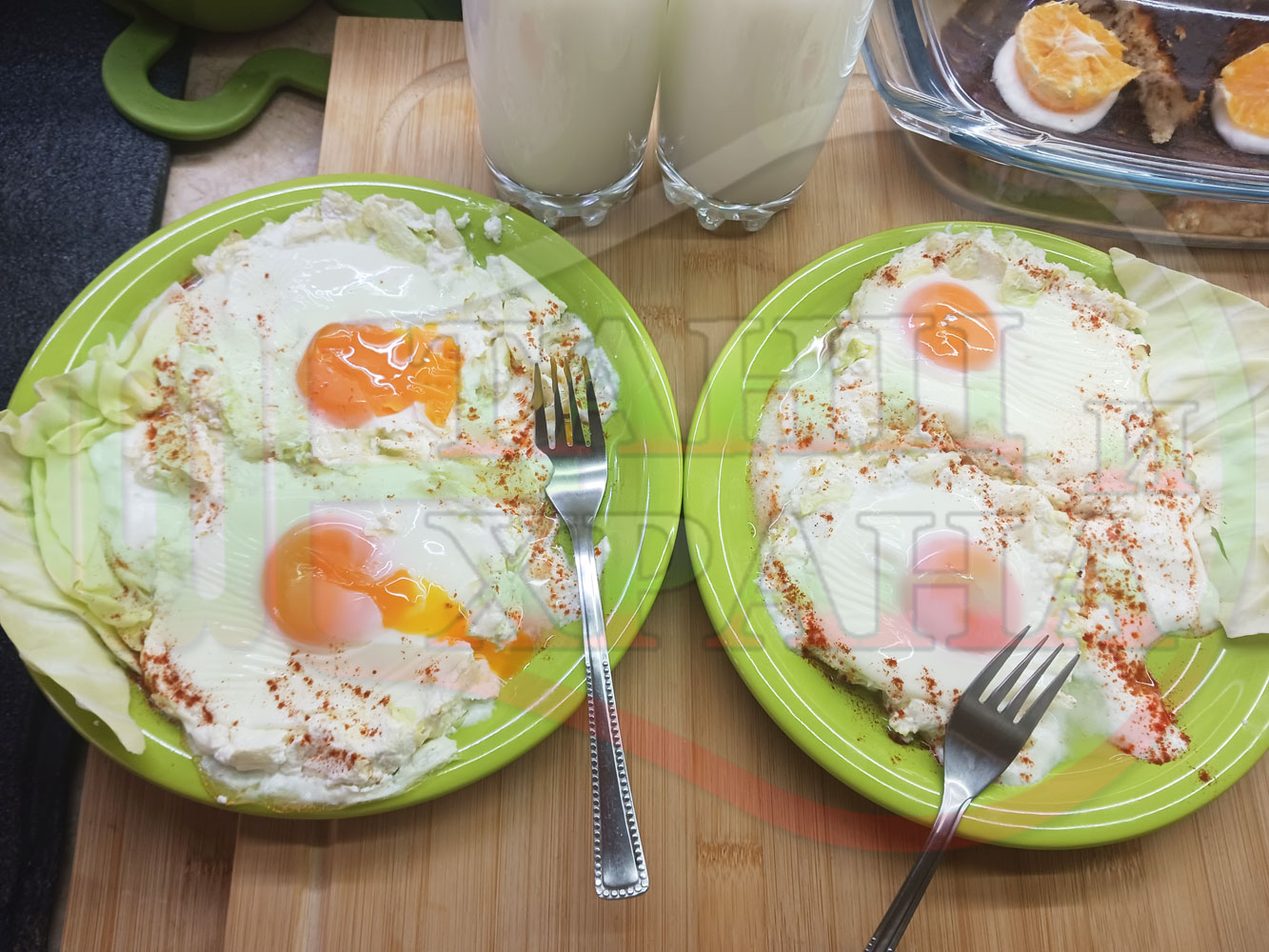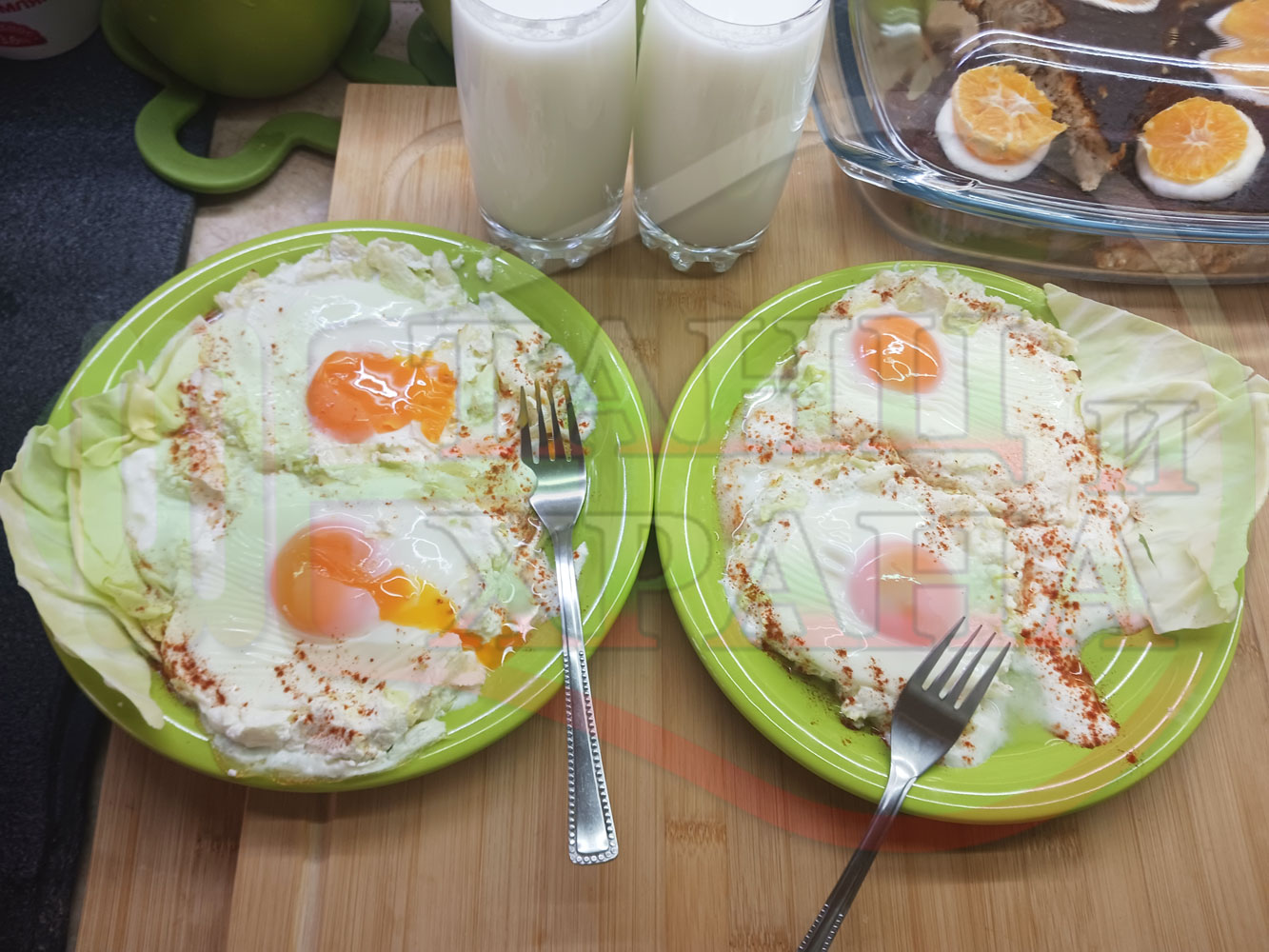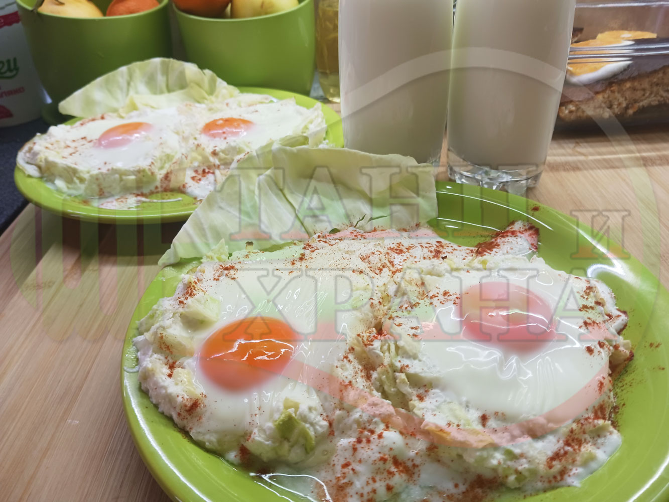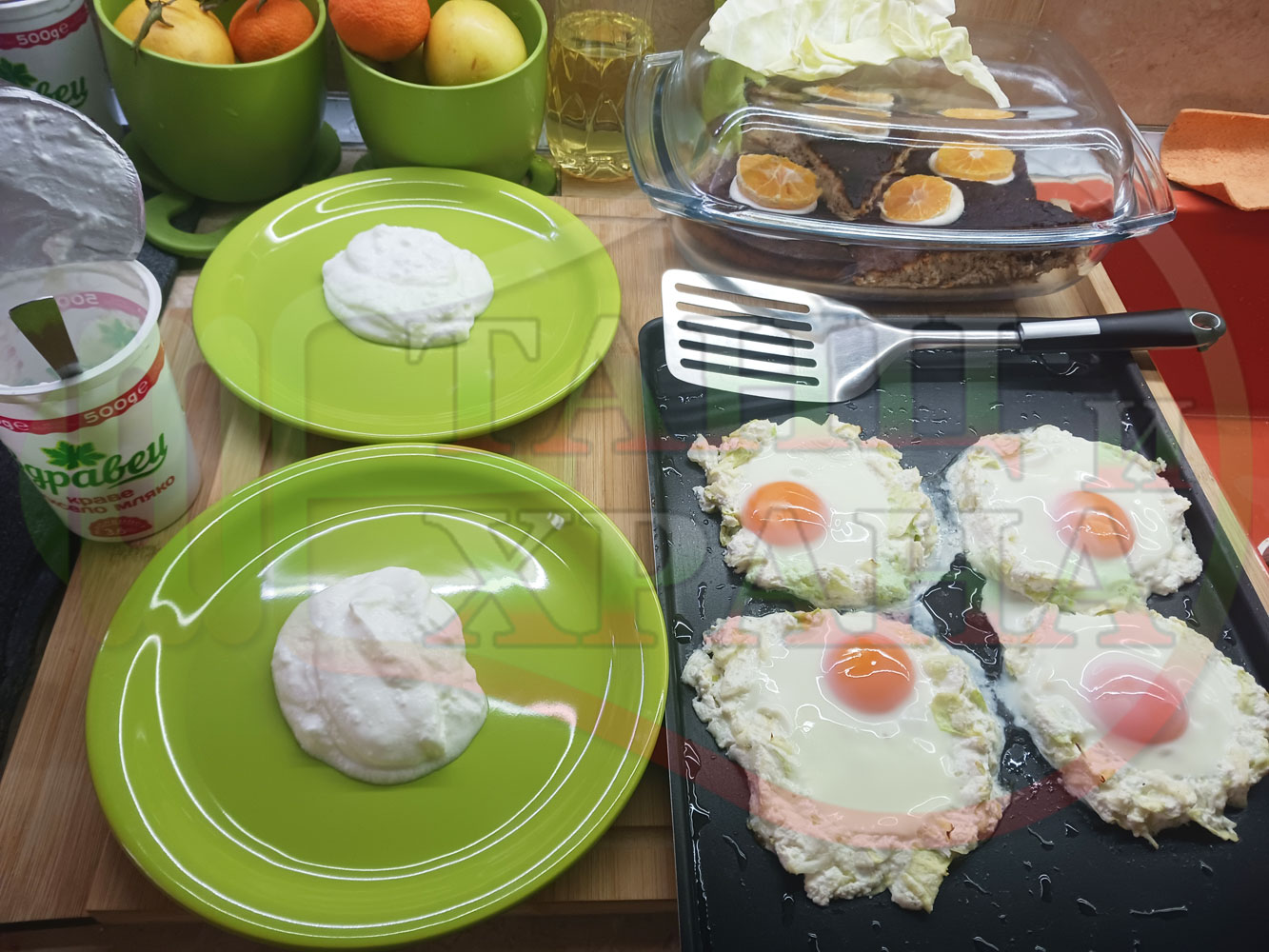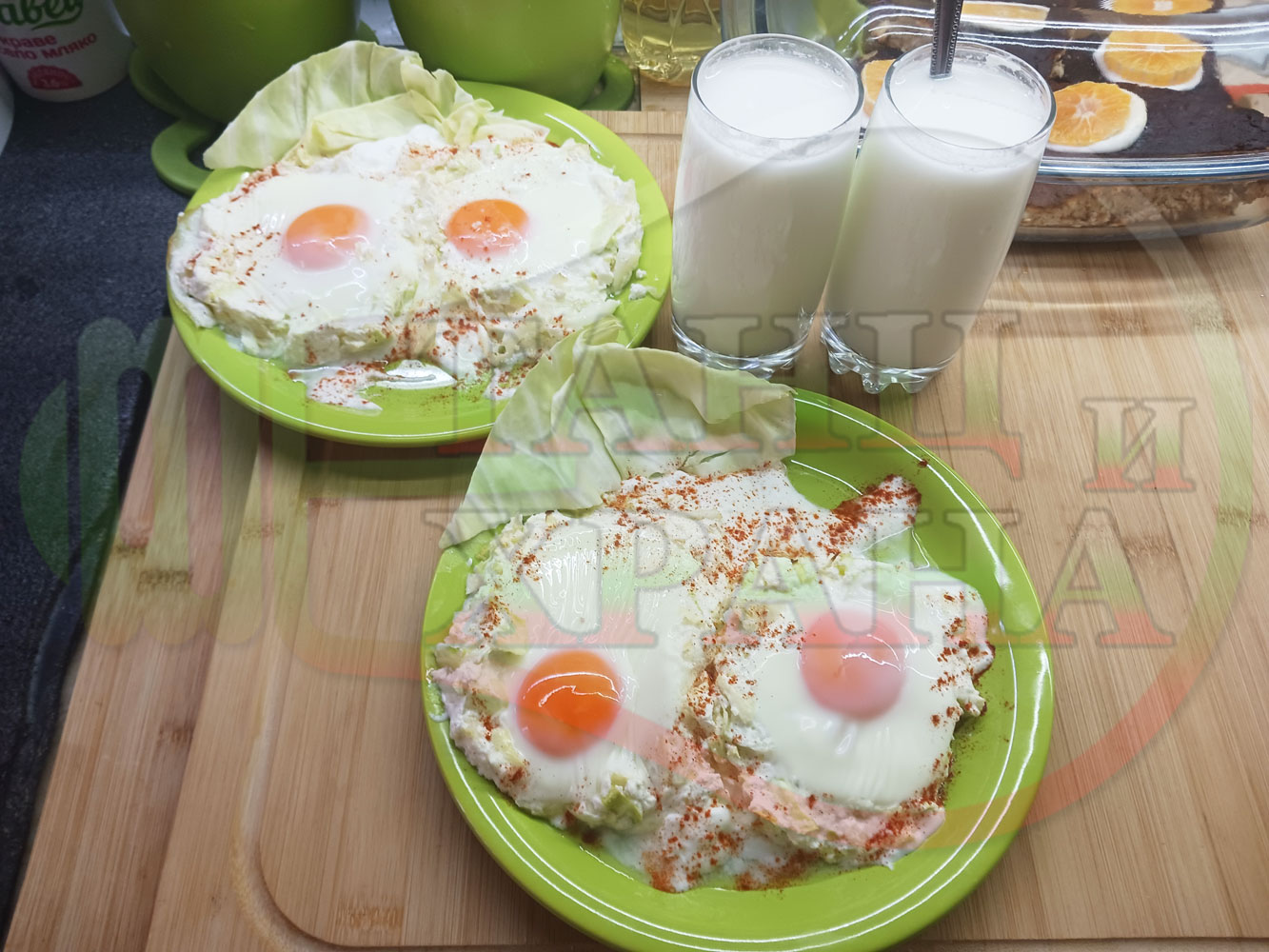 Българска зеленчукова млечна яйчена салата "Пряснозелева с БГсирене" запечена на фурна със сиреново зелев крем от прясно зеле и краве бяло сирене оформен на кладенчета напълнени с яйца на очи гарнирана с кисело мляко от България - двукомпонентна