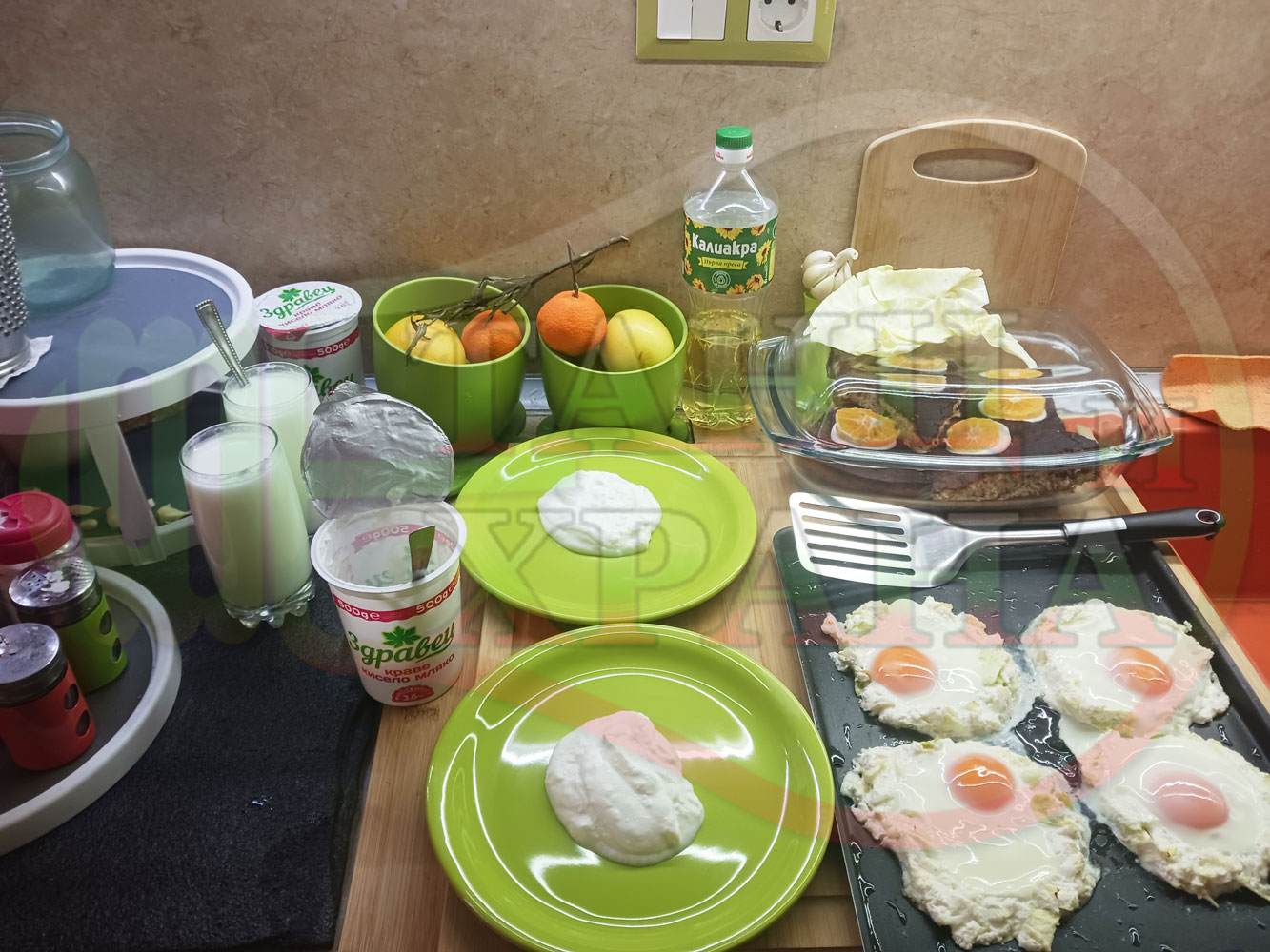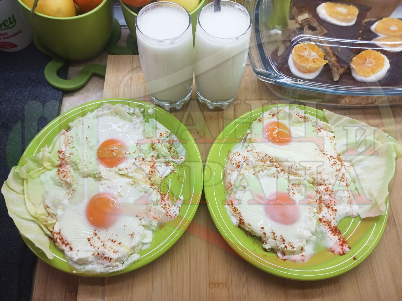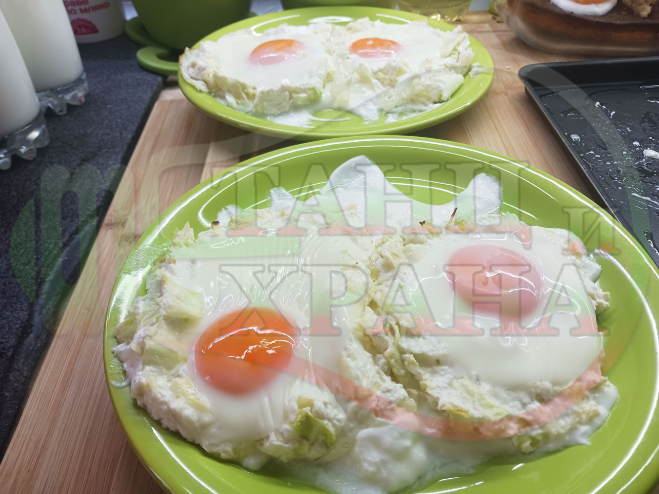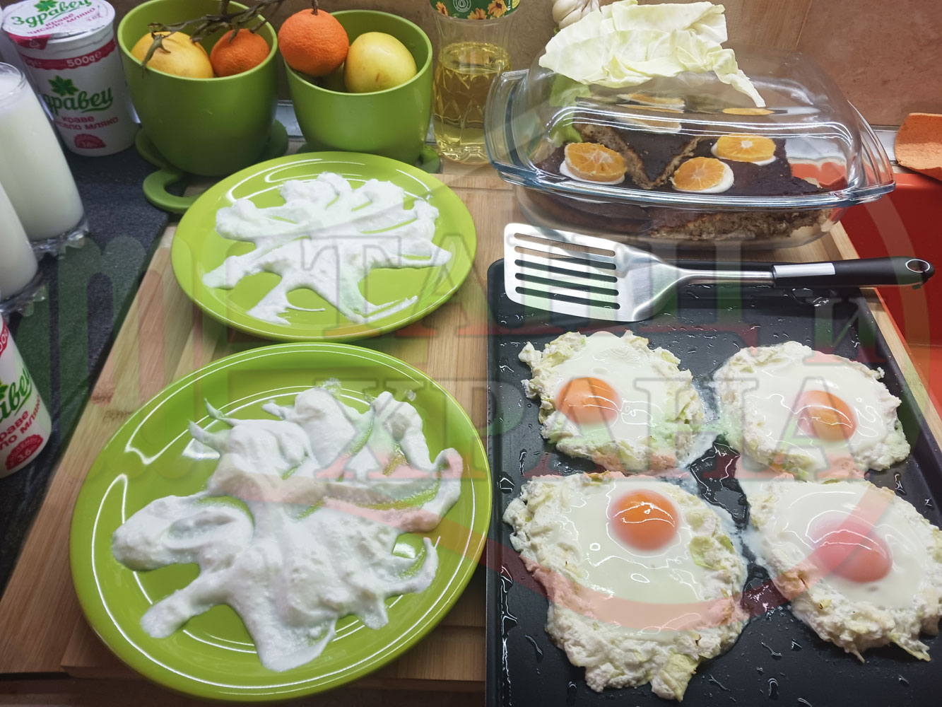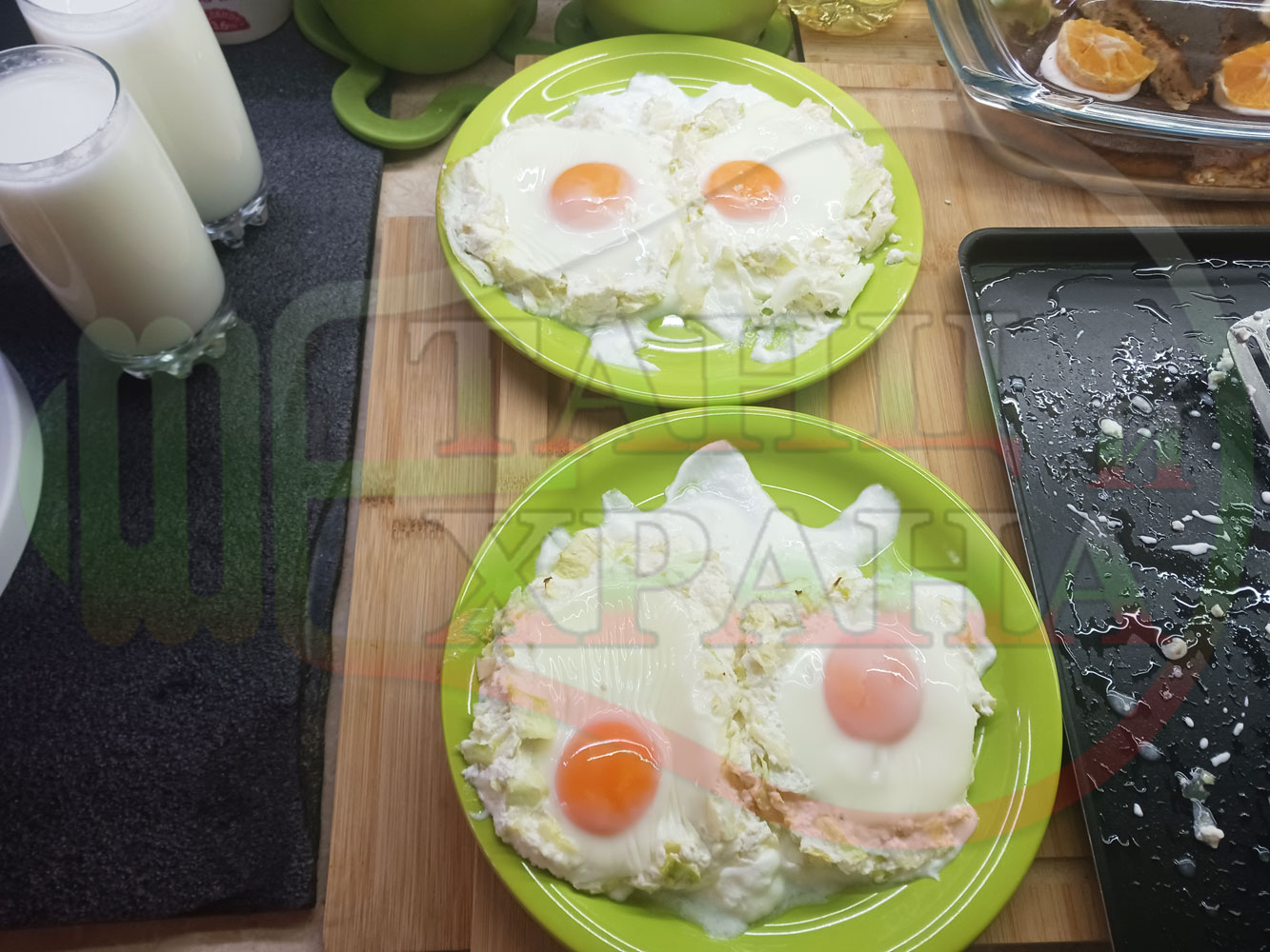 Българска зеленчукова млечна яйчена салата "Пряснозелева с БГсирене" запечена на фурна със сиреново зелев крем от прясно зеле и краве бяло сирене оформен на кладенчета напълнени с яйца на очи гарнирана с кисело мляко от България - двукомпонентна