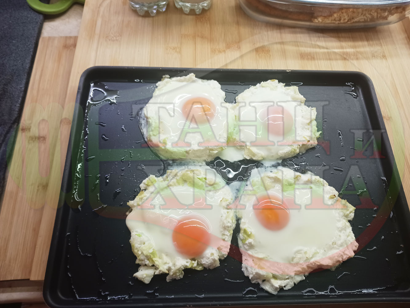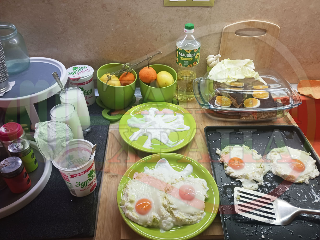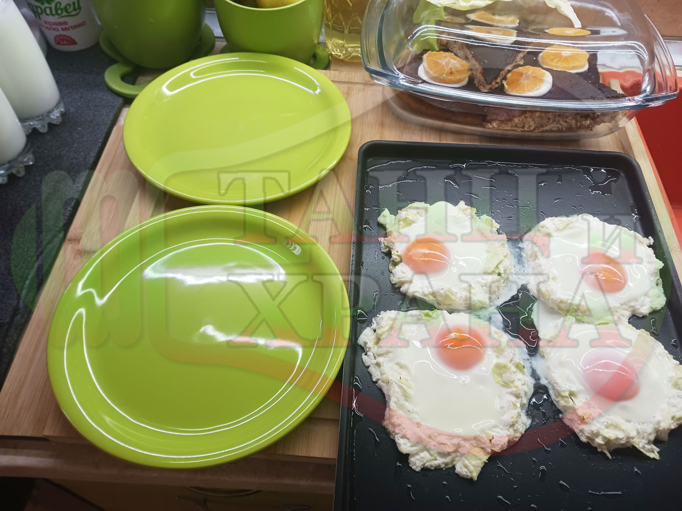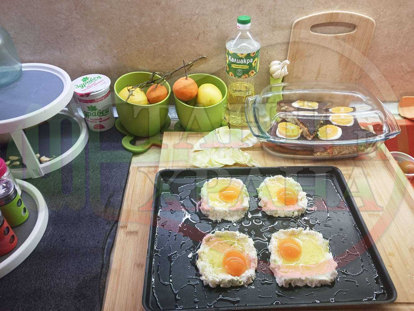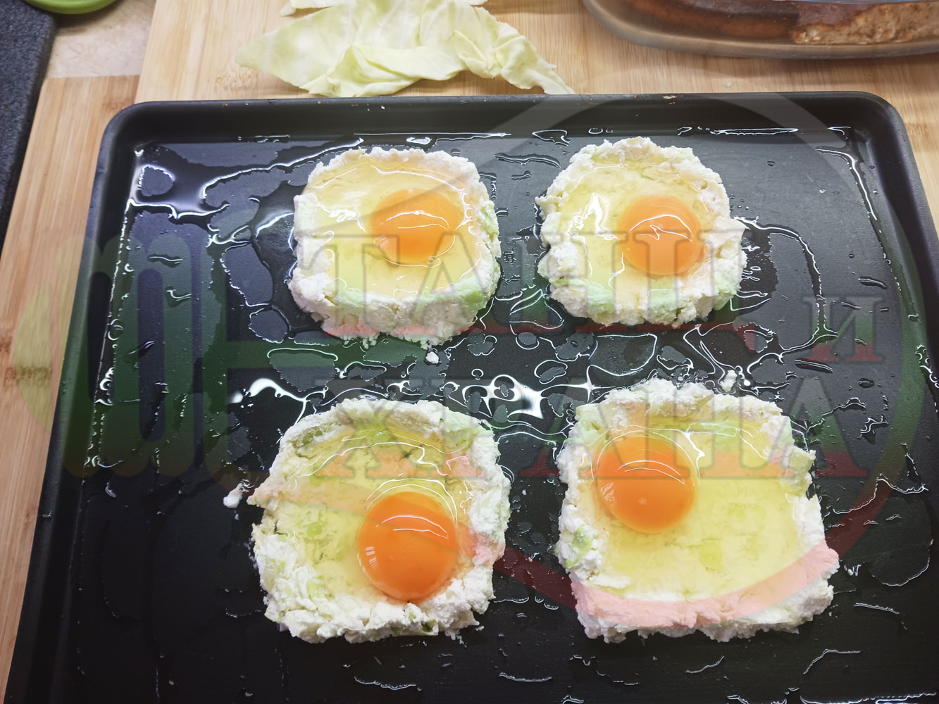 Българска зеленчукова млечна яйчена салата "Пряснозелева с БГсирене" запечена на фурна със сиреново зелев крем от прясно зеле и краве бяло сирене оформен на кладенчета напълнени с яйца на очи гарнирана с кисело мляко от България - двукомпонентна