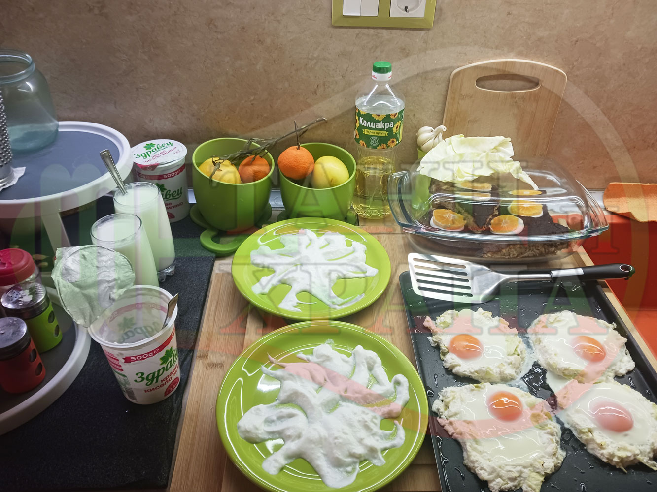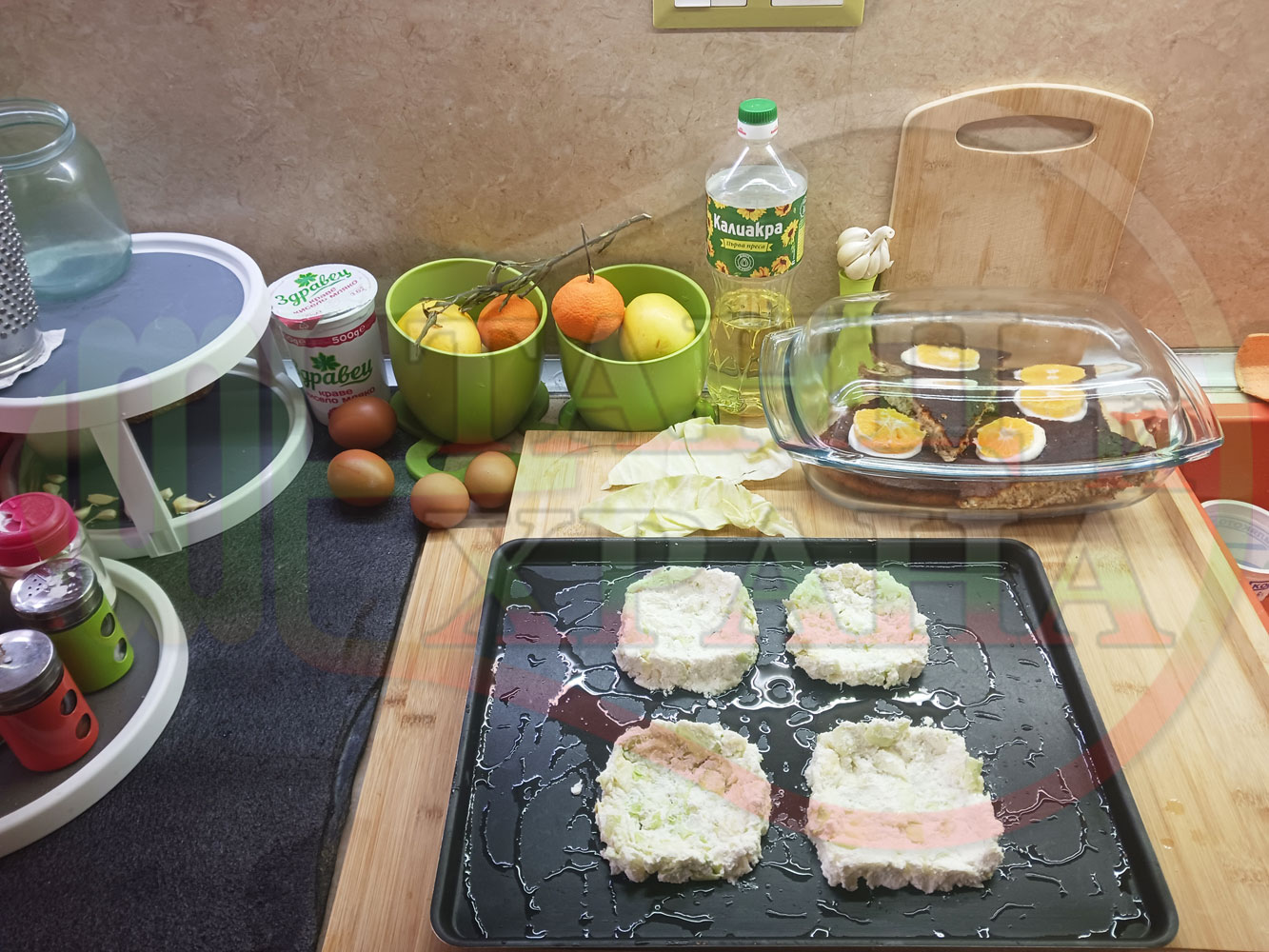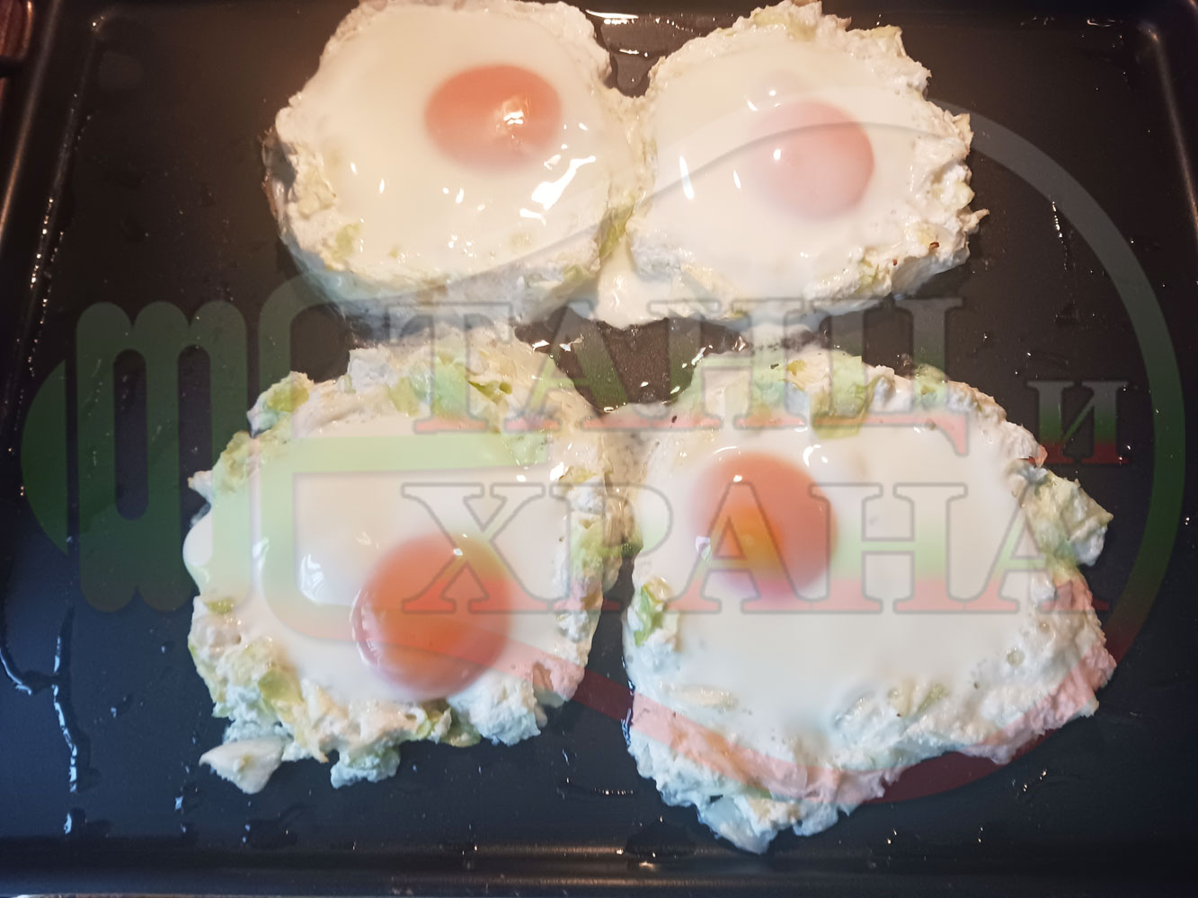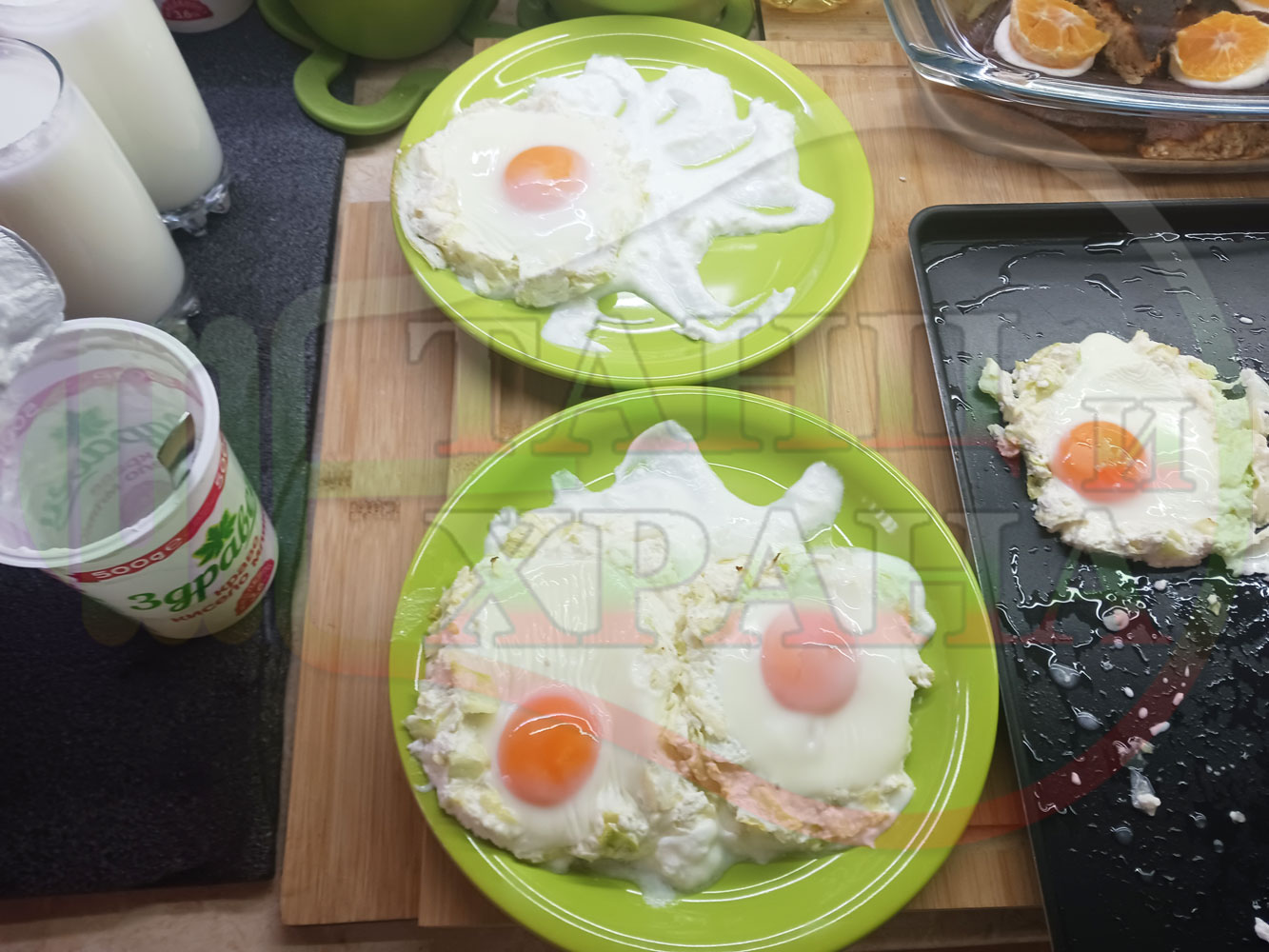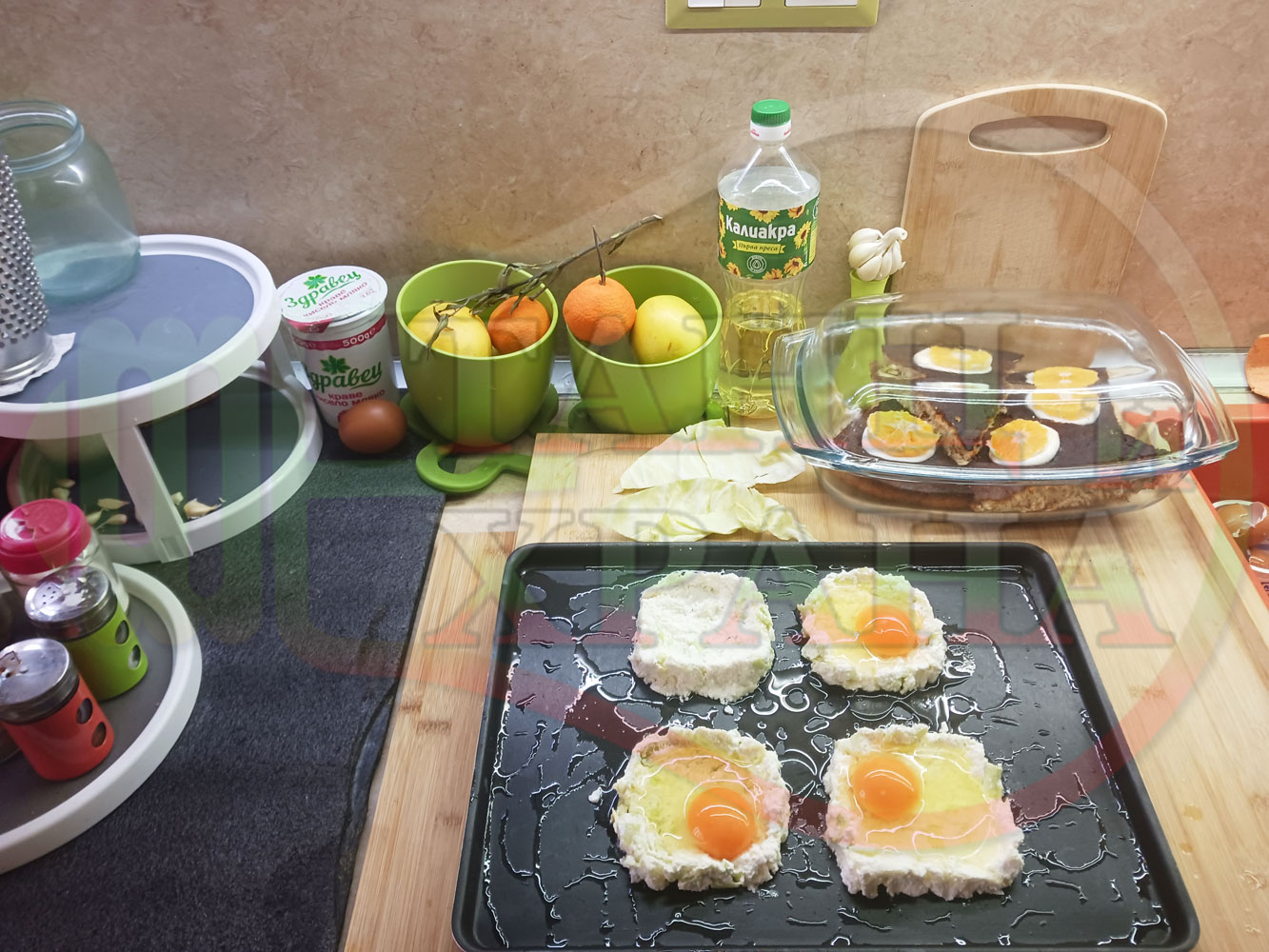 Българска зеленчукова млечна яйчена салата "Пряснозелева с БГсирене" запечена на фурна със сиреново зелев крем от прясно зеле и краве бяло сирене оформен на кладенчета напълнени с яйца на очи гарнирана с кисело мляко от България - двукомпонентна