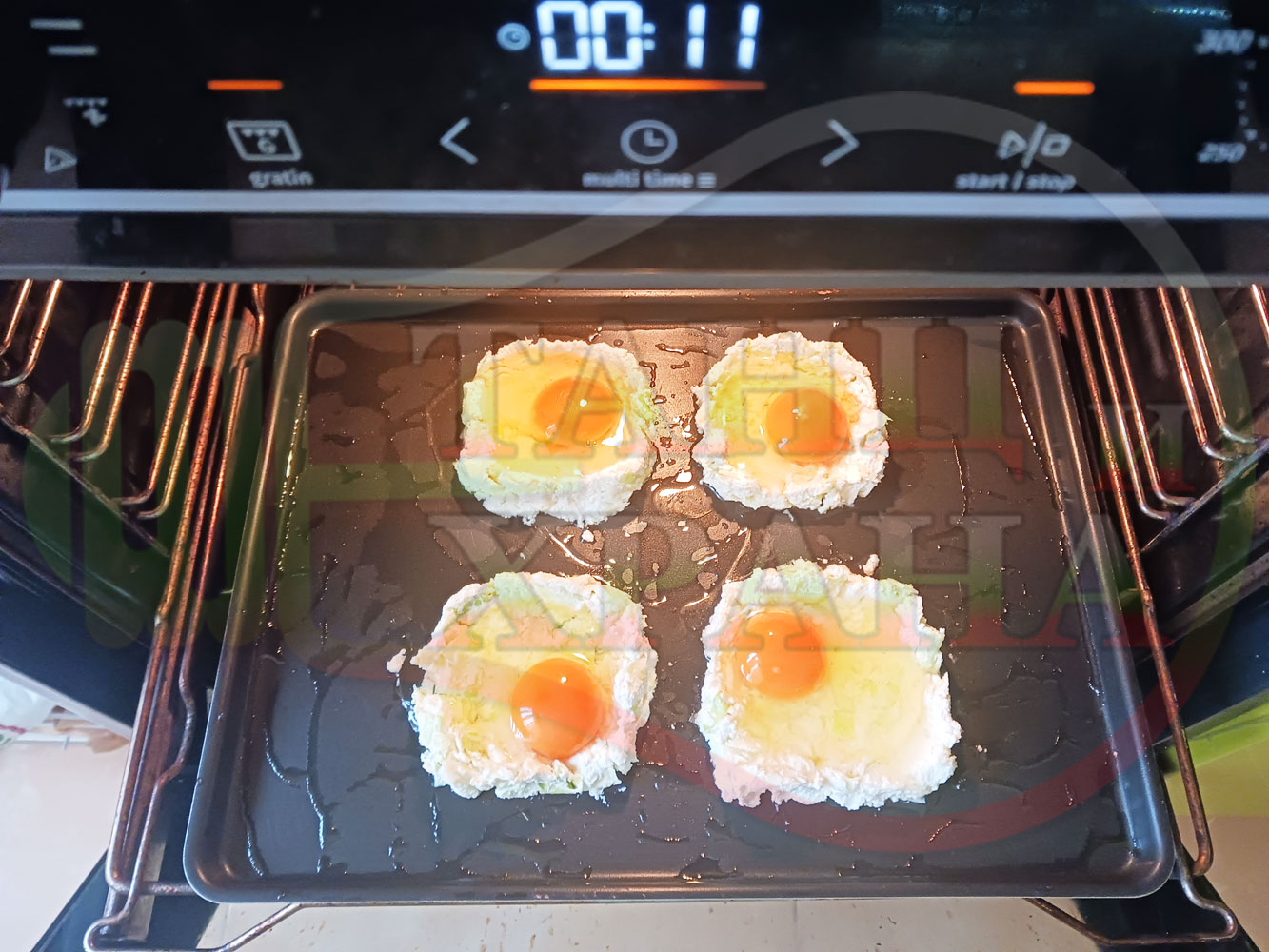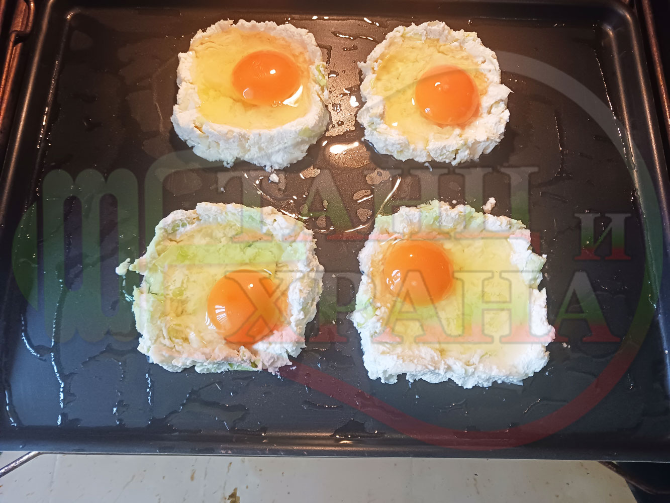 Сипете слънчогледовото олио в тава за печене и го размажете с четка или чрез накланяне на тавата във всички посоки. Оформете 4 средно големи топки от сиреновия крем, поставете ги в тавата и с ръце ги дооформете на средно широки и дълбоки "кладенчета", така че да зъдържат яйцата. Поставете по 1 яйце внимателно във всяко кладенче, така че да не изтече белтъка извън кладенчето и жълтъка да се разлее. Поставете тавата в предварително загрятата фурна (загрейте я за поне 5 минути). Запечете на фурна без вентилатор на 180 градуса за около 12 минути (стремете се яйцата да останат рохки, с разтичащ се жълтък при хапване).
