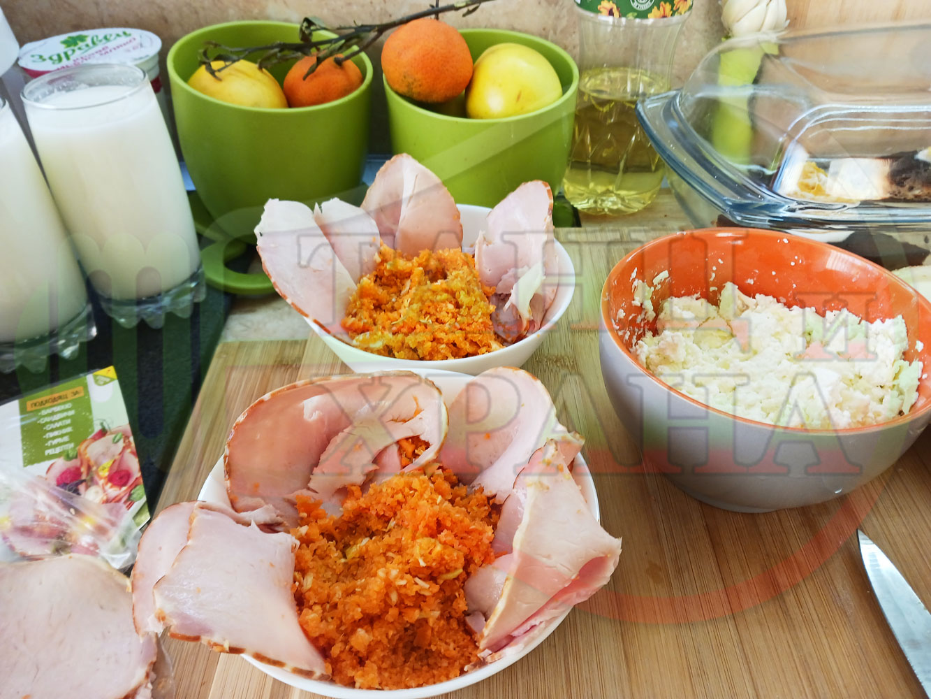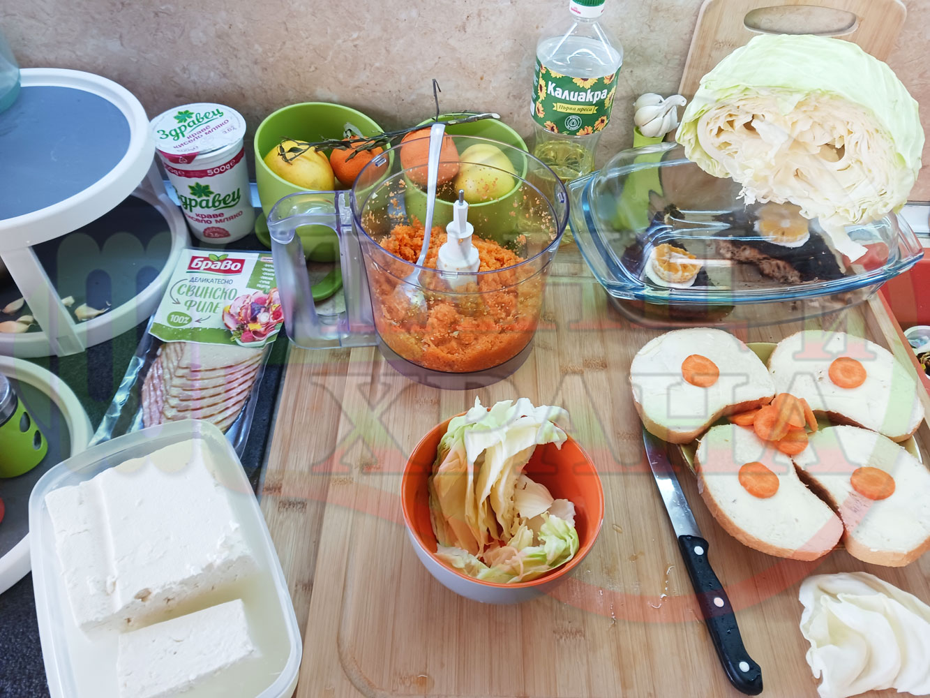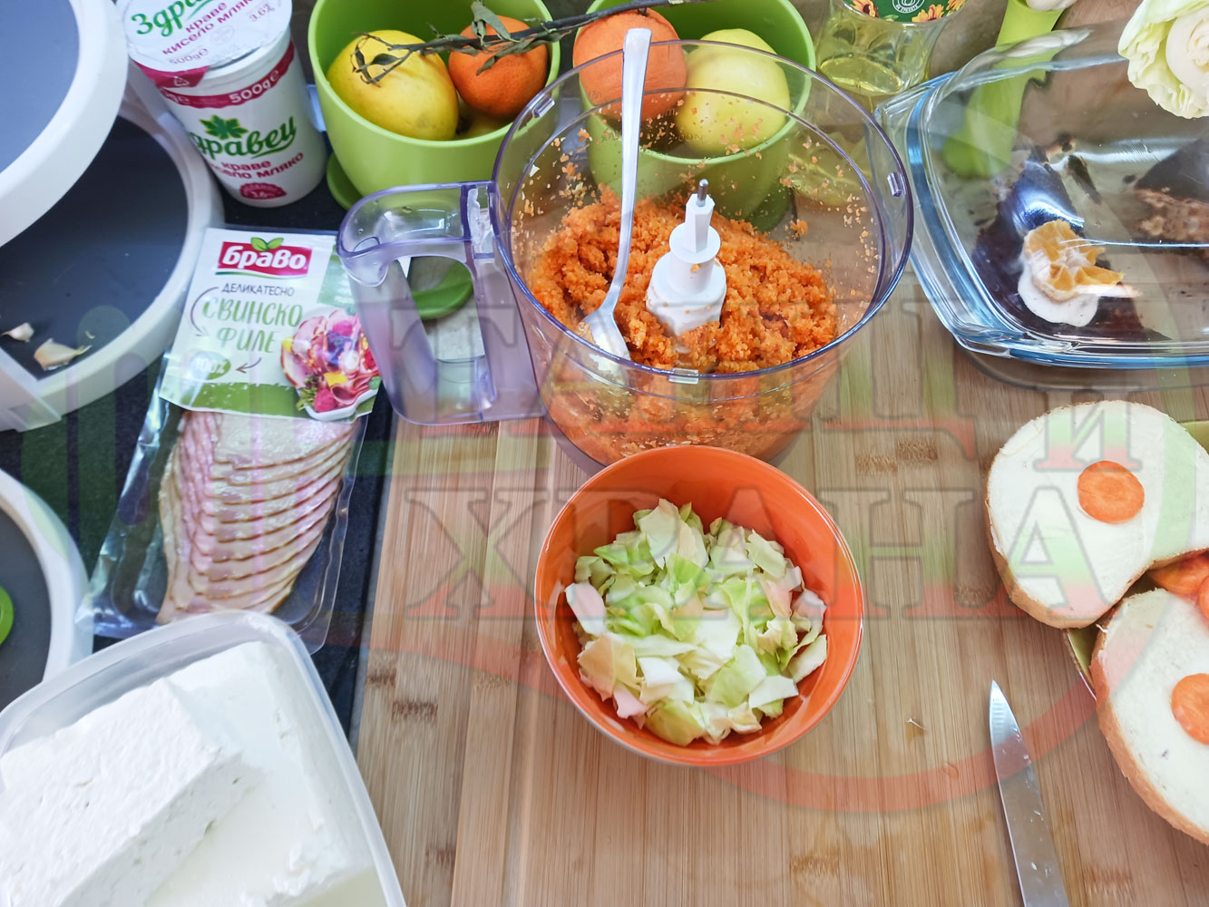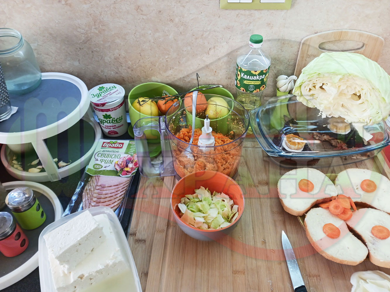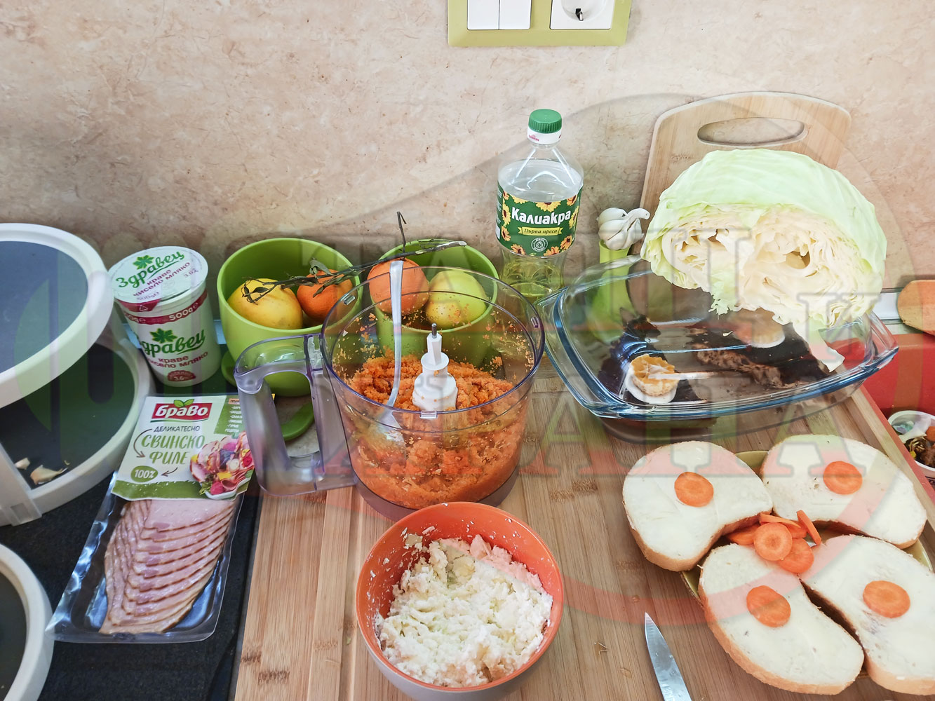 ПРОДУКТИ: Приблизителни количества за българска салата "Морковенозелева филеделикатесна с БГсирене" приготвена от моркови и прясно зеле гарнирана със свинско деликатесно филе, топчета от сиреново зелев крем с краве бяло сирене и кисело мляко от България - двукомпонентна