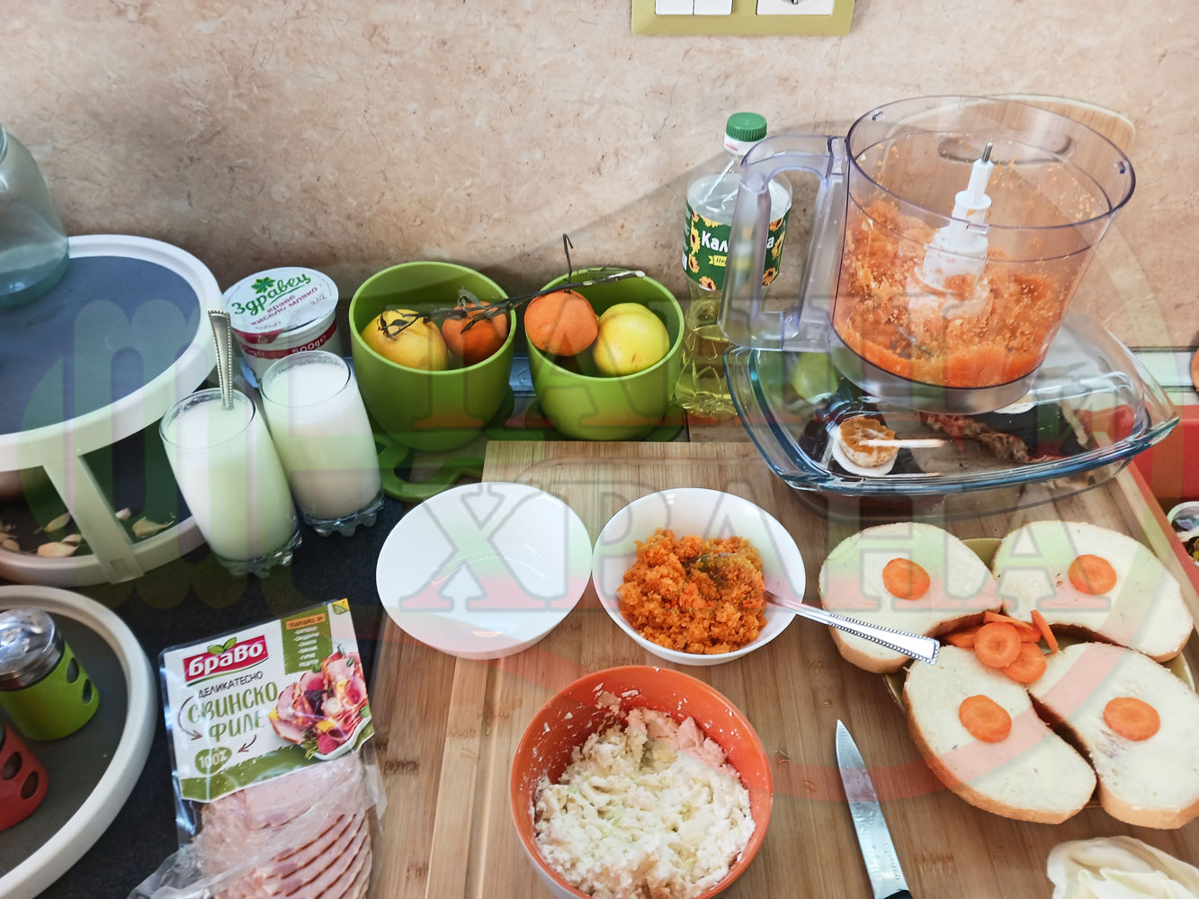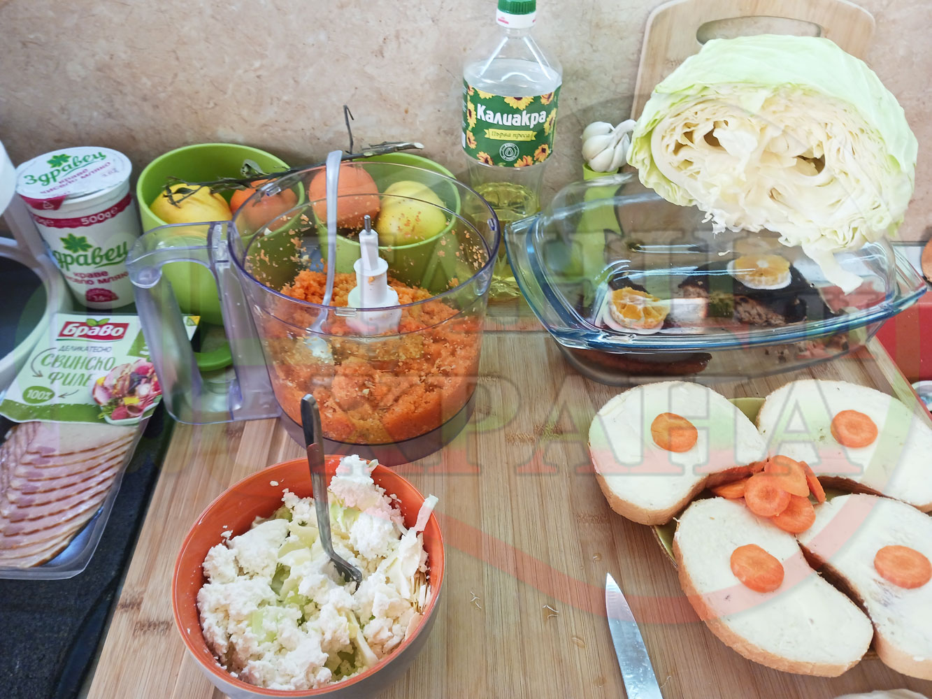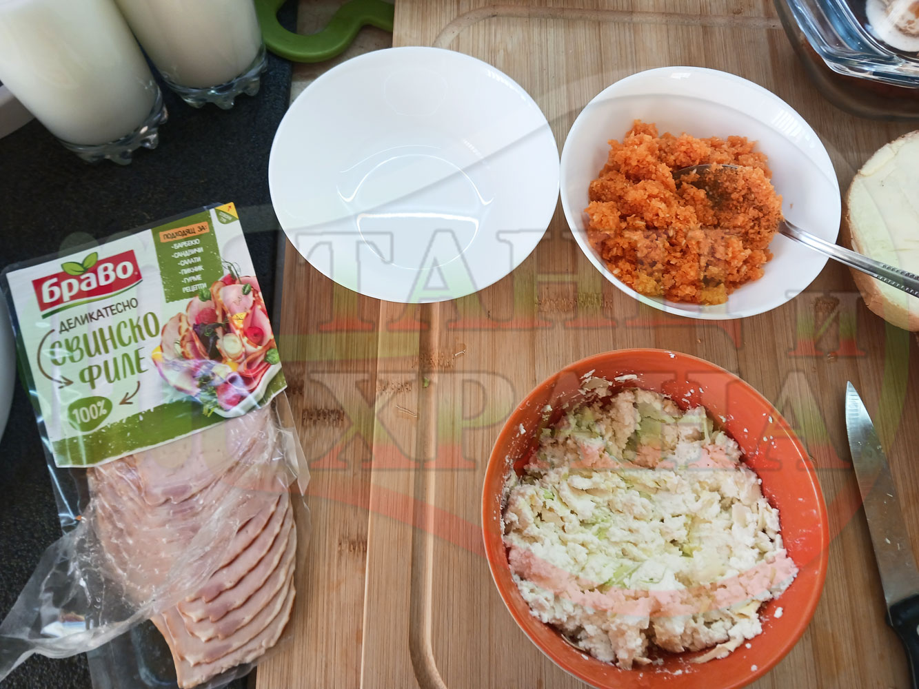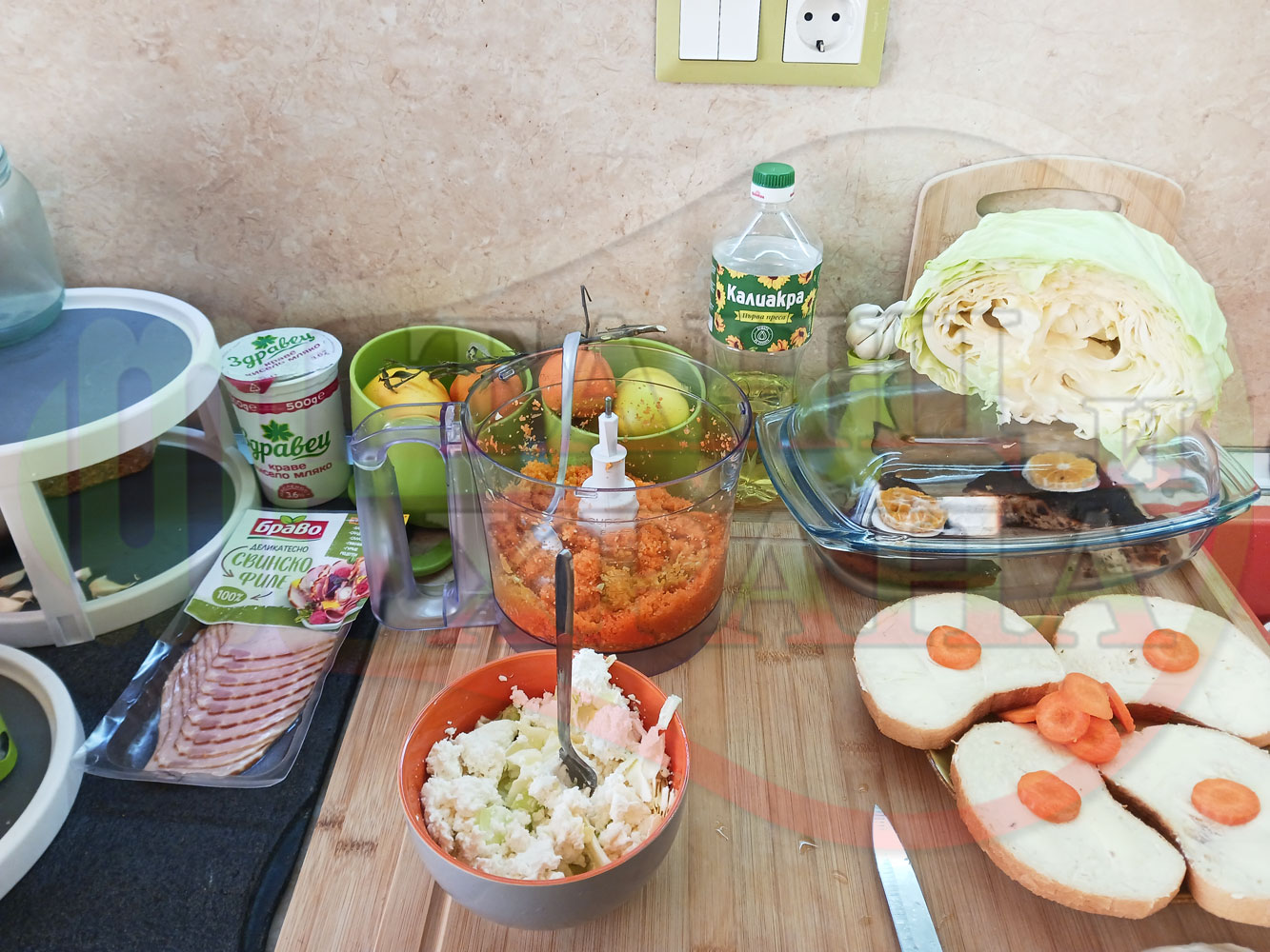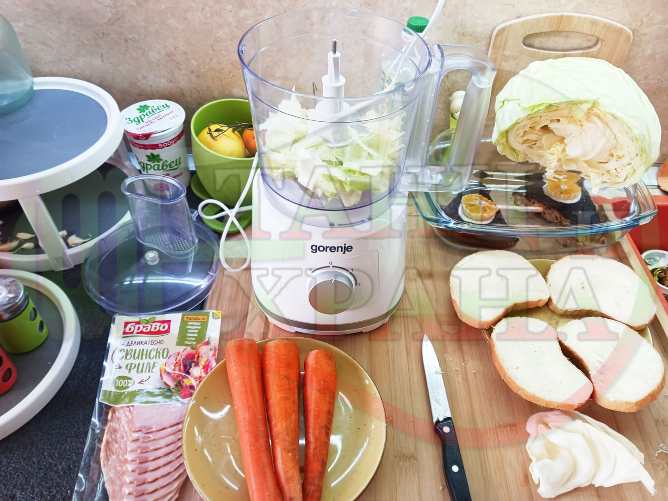 ПРОДУКТИ: Приблизителни количества за българска салата "Морковенозелева филеделикатесна с БГсирене" приготвена от моркови и прясно зеле гарнирана със свинско деликатесно филе, топчета от сиреново зелев крем с краве бяло сирене и кисело мляко от България - двукомпонентна