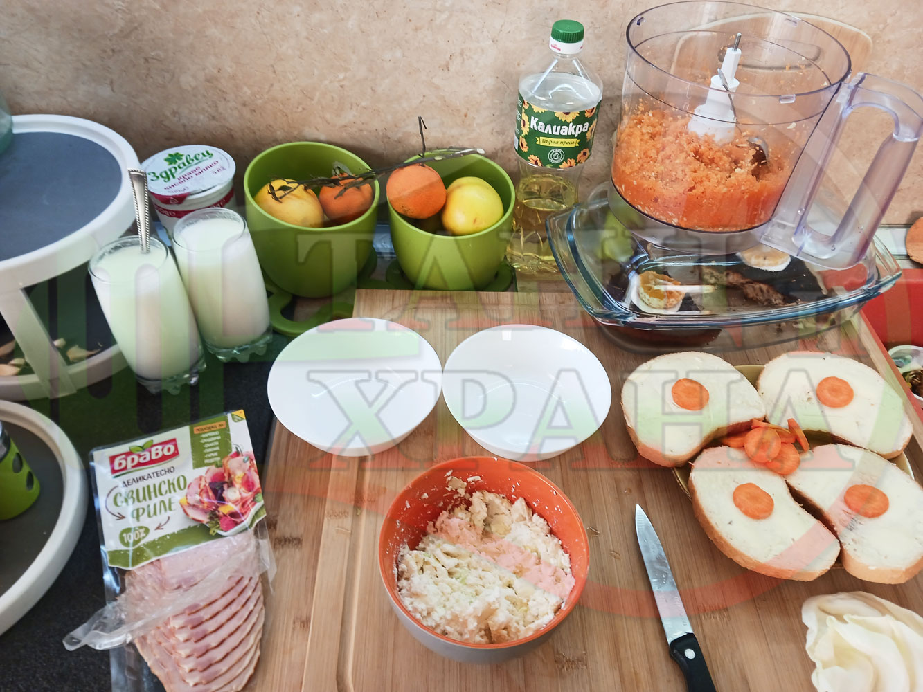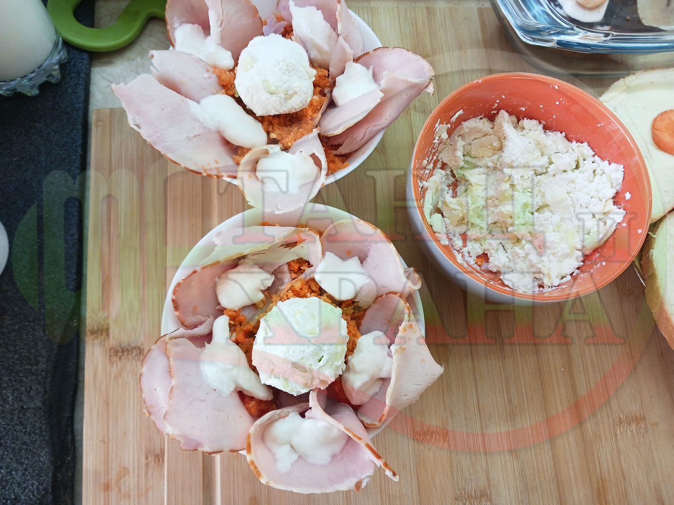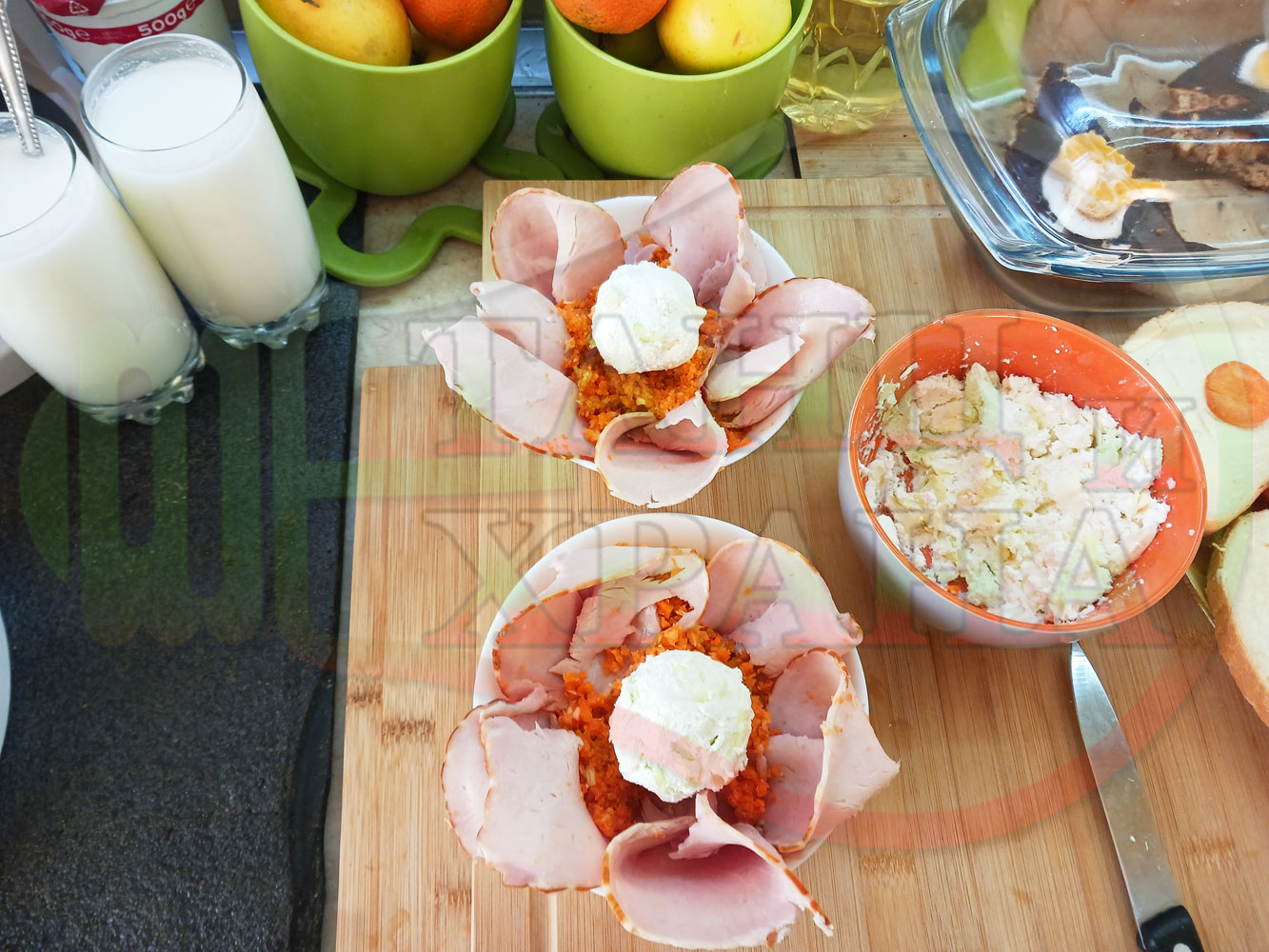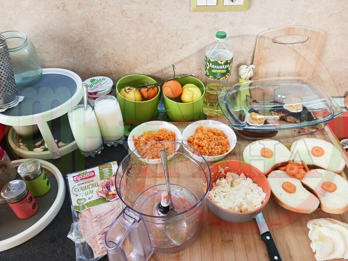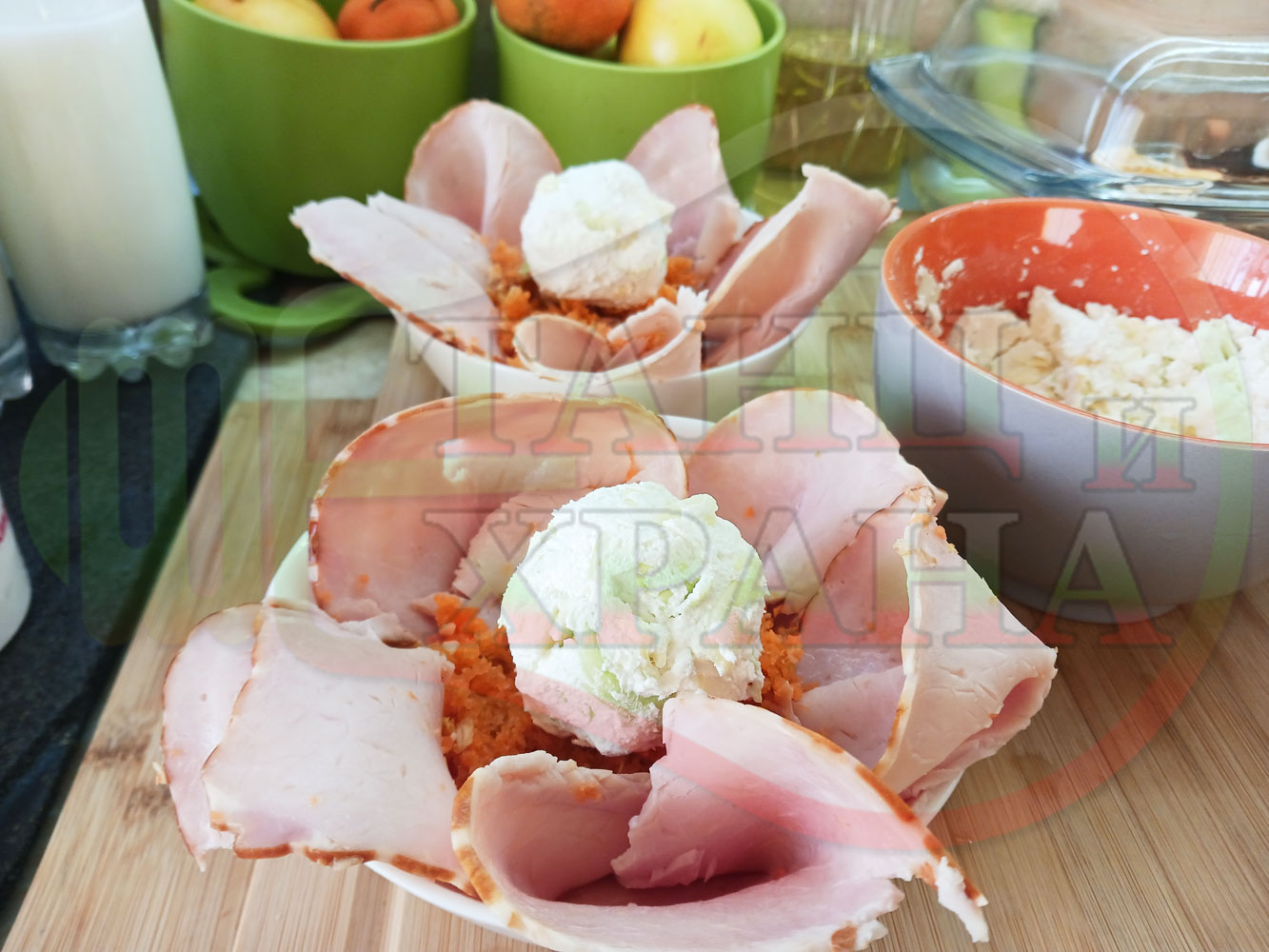 ПРОДУКТИ: Приблизителни количества за българска салата "Морковенозелева филеделикатесна с БГсирене" приготвена от моркови и прясно зеле гарнирана със свинско деликатесно филе, топчета от сиреново зелев крем с краве бяло сирене и кисело мляко от България - двукомпонентна