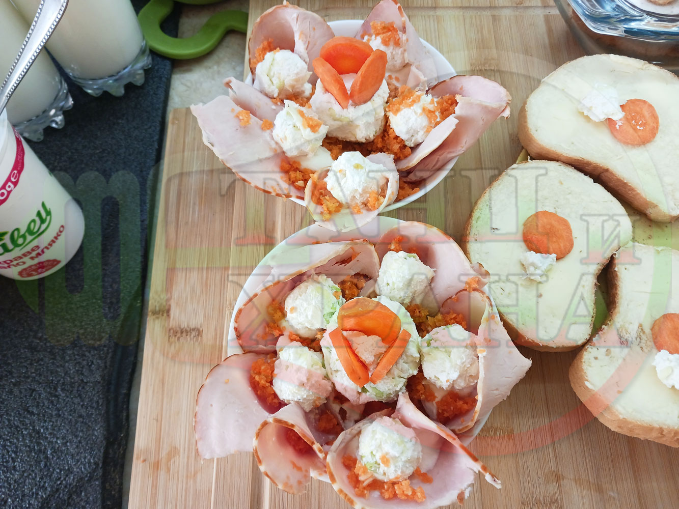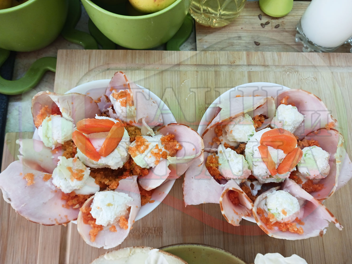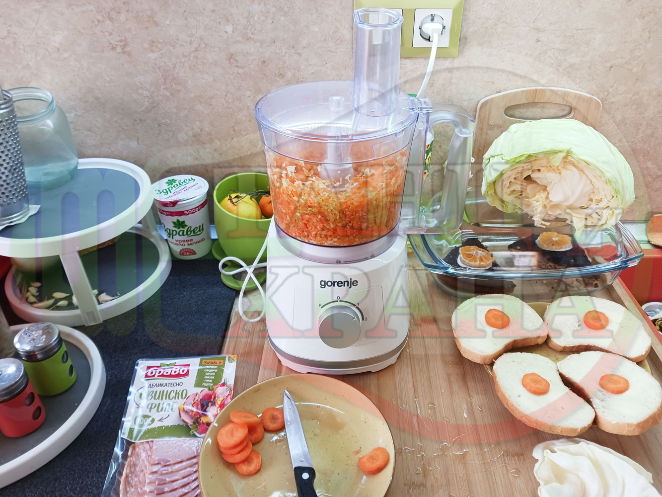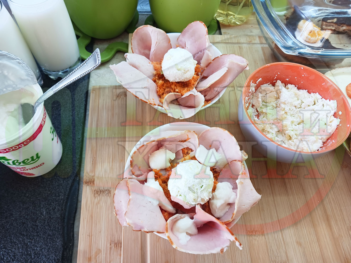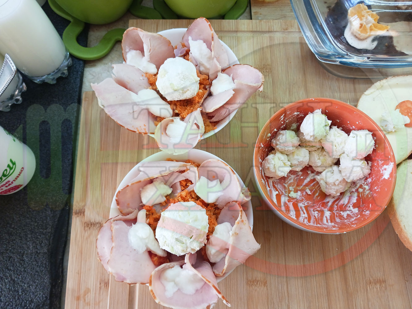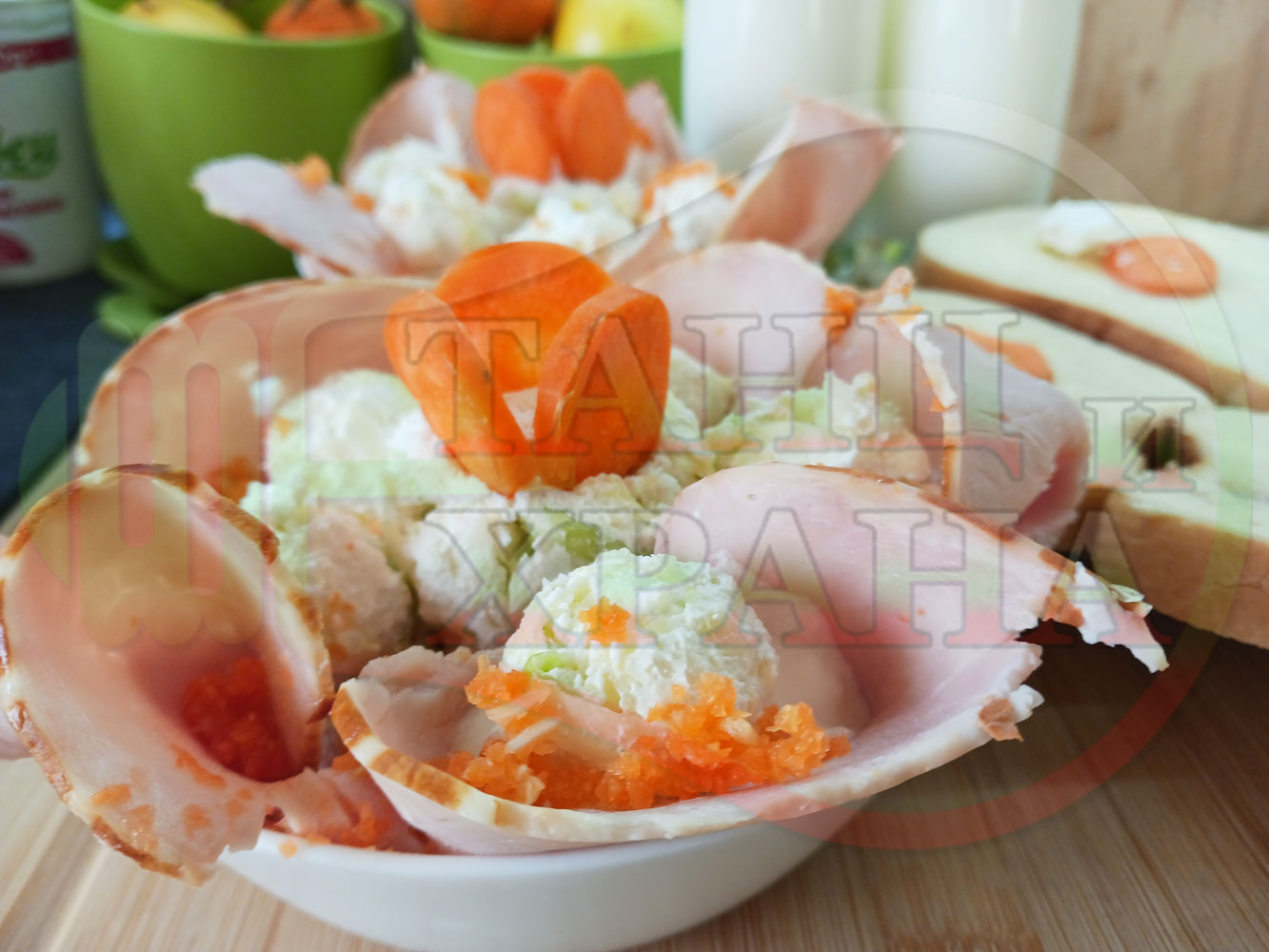 ПРОДУКТИ: Приблизителни количества за българска салата "Морковенозелева филеделикатесна с БГсирене" приготвена от моркови и прясно зеле гарнирана със свинско деликатесно филе, топчета от сиреново зелев крем с краве бяло сирене и кисело мляко от България - двукомпонентна