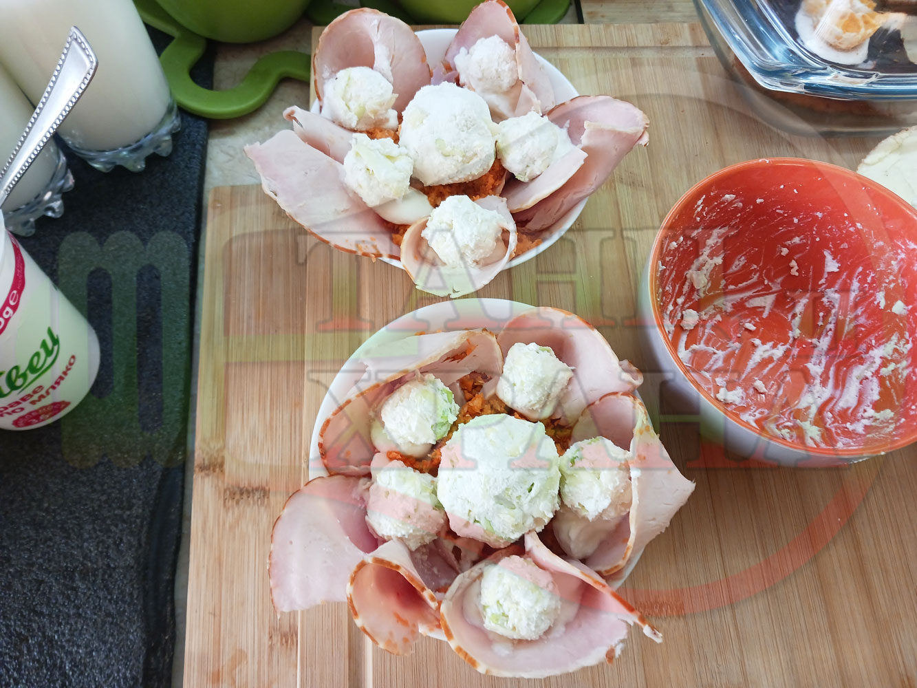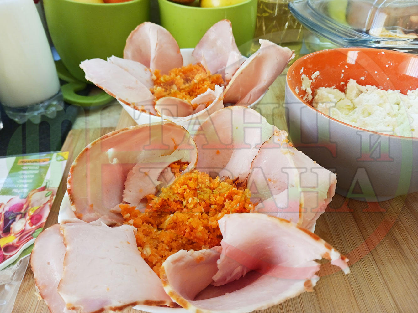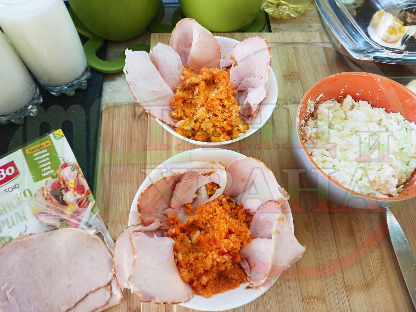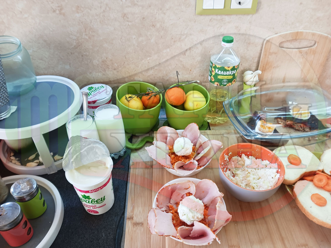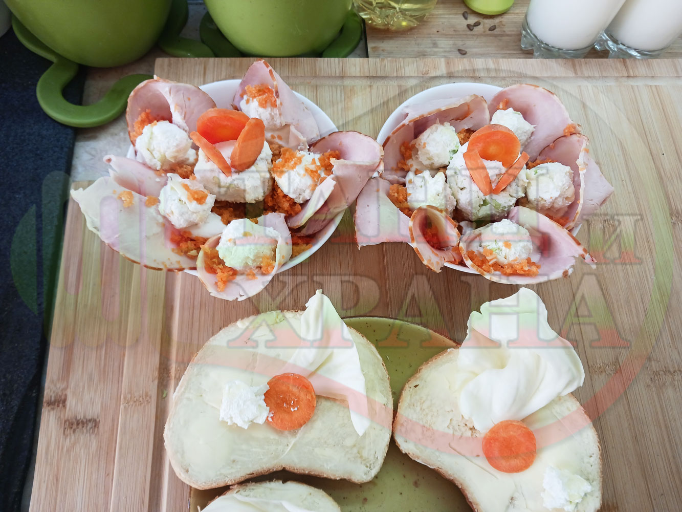 ПРОДУКТИ: Приблизителни количества за българска салата "Морковенозелева филеделикатесна с БГсирене" приготвена от моркови и прясно зеле гарнирана със свинско деликатесно филе, топчета от сиреново зелев крем с краве бяло сирене и кисело мляко от България - двукомпонентна