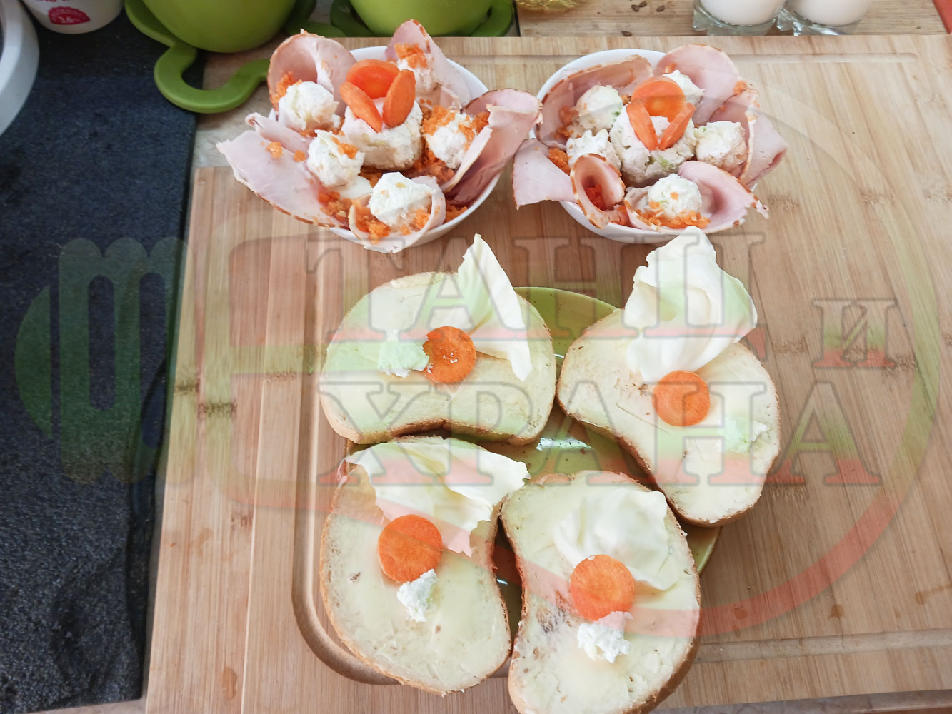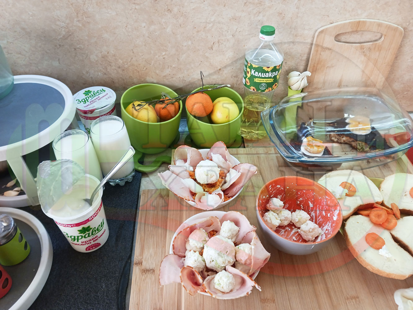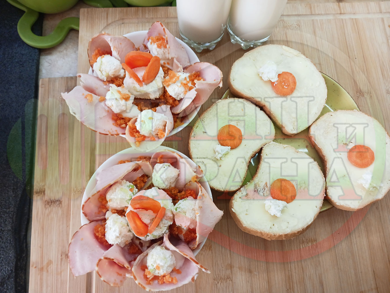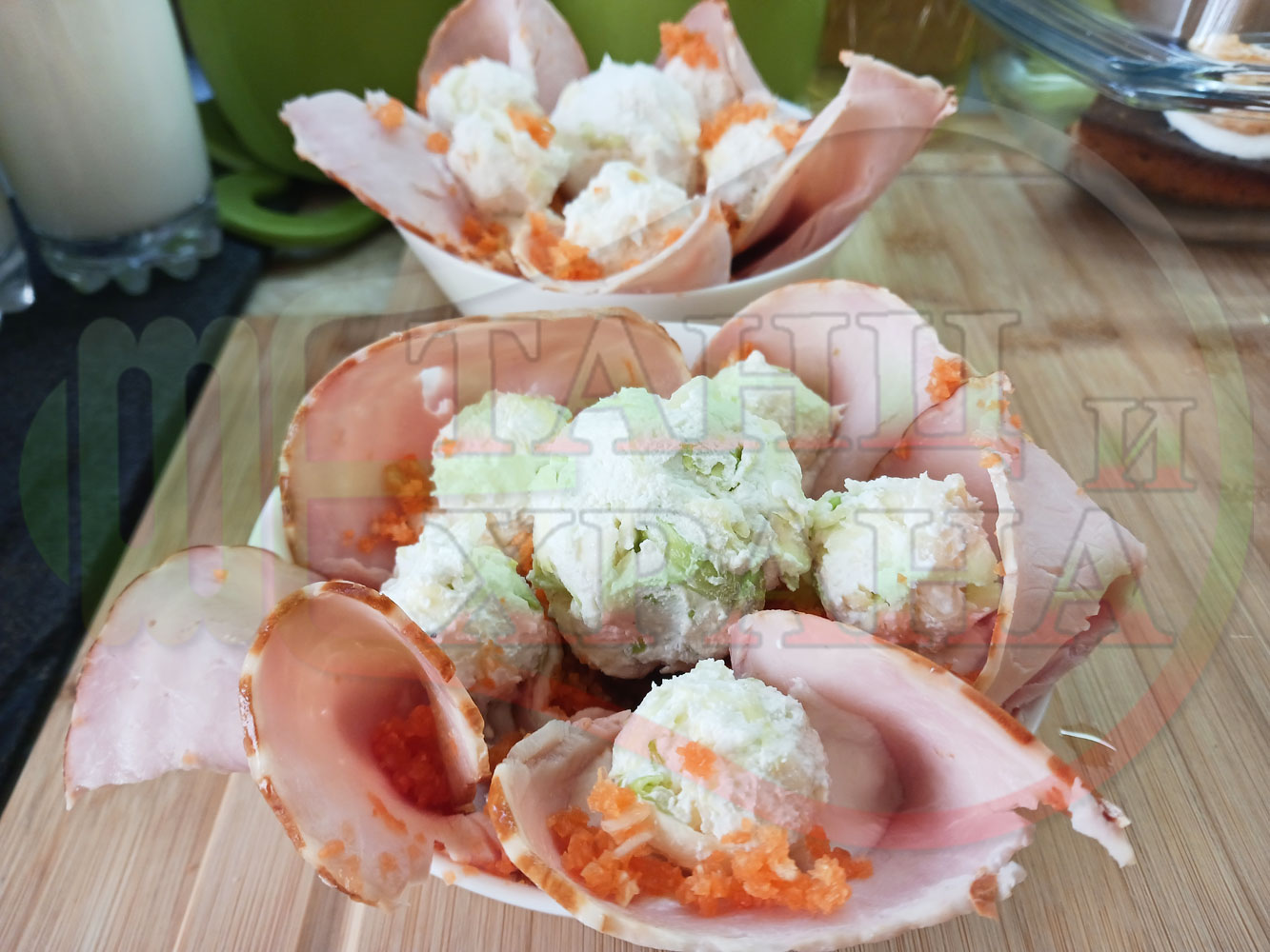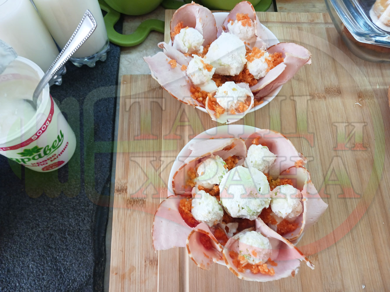 ПРОДУКТИ: Приблизителни количества за българска салата "Морковенозелева филеделикатесна с БГсирене" приготвена от моркови и прясно зеле гарнирана със свинско деликатесно филе, топчета от сиреново зелев крем с краве бяло сирене и кисело мляко от България - двукомпонентна