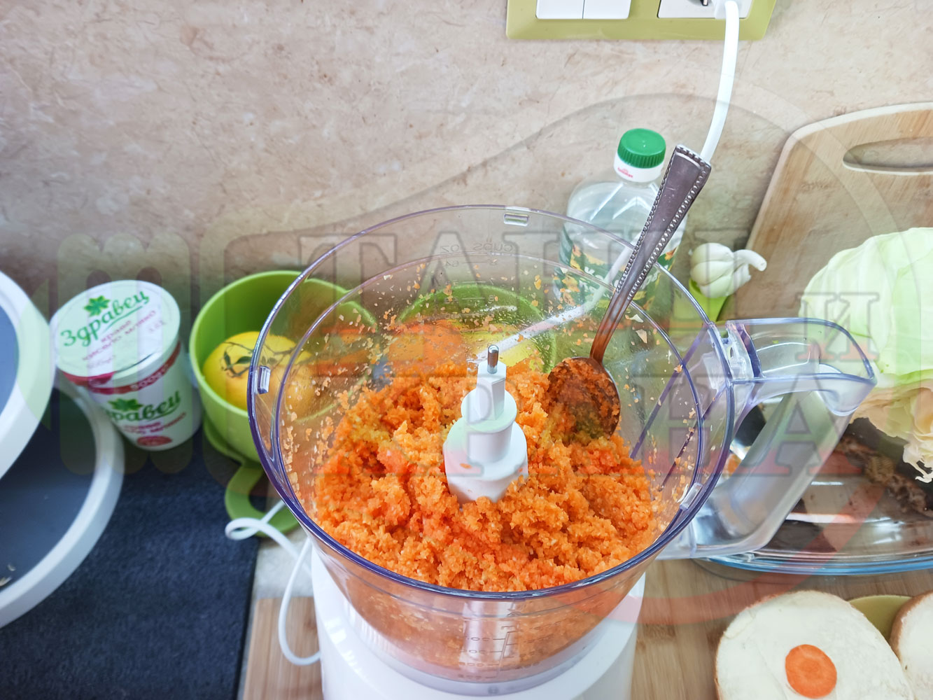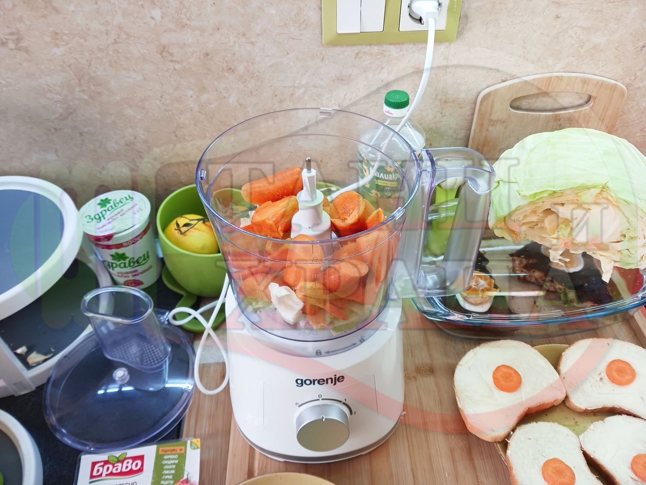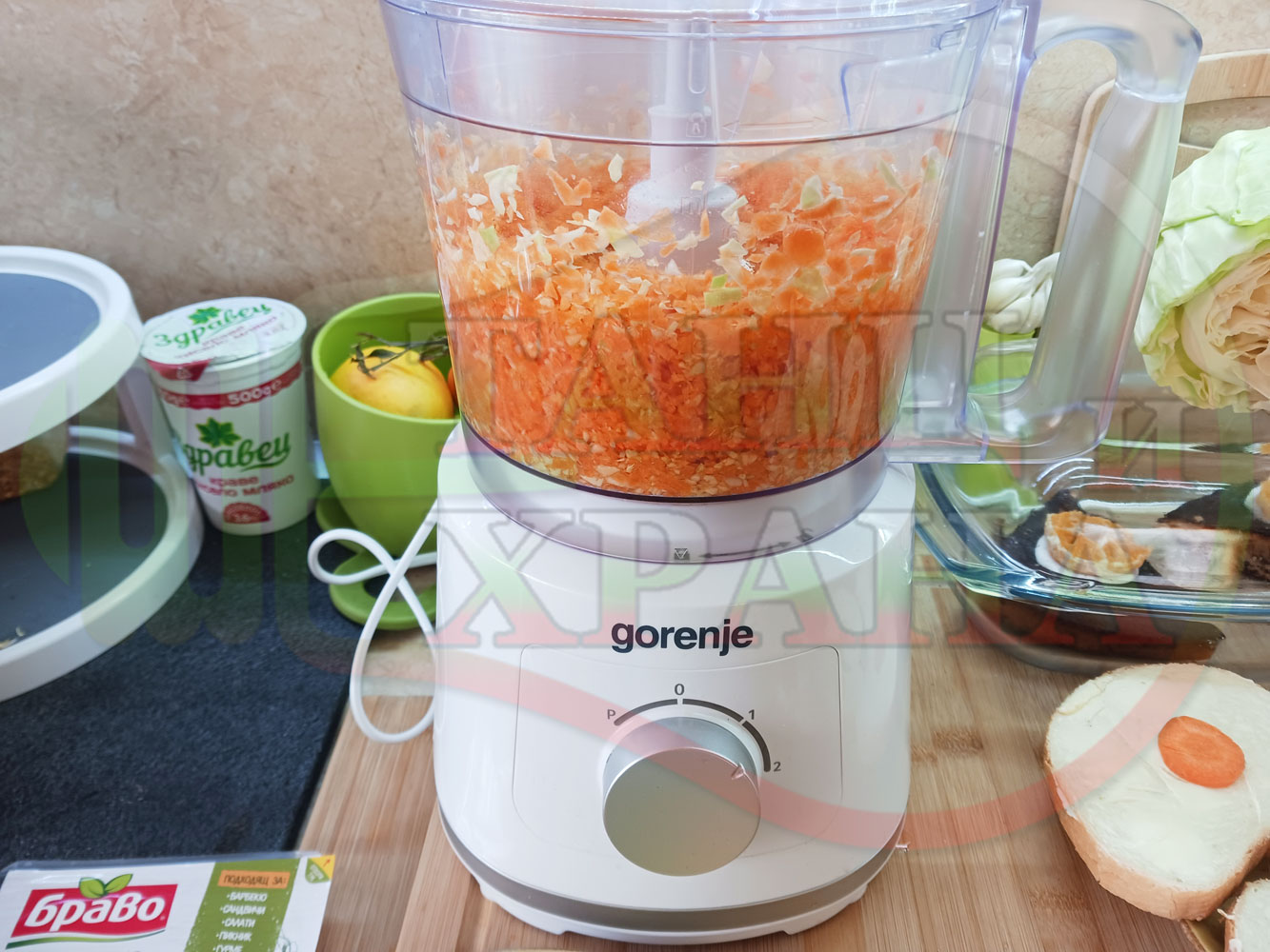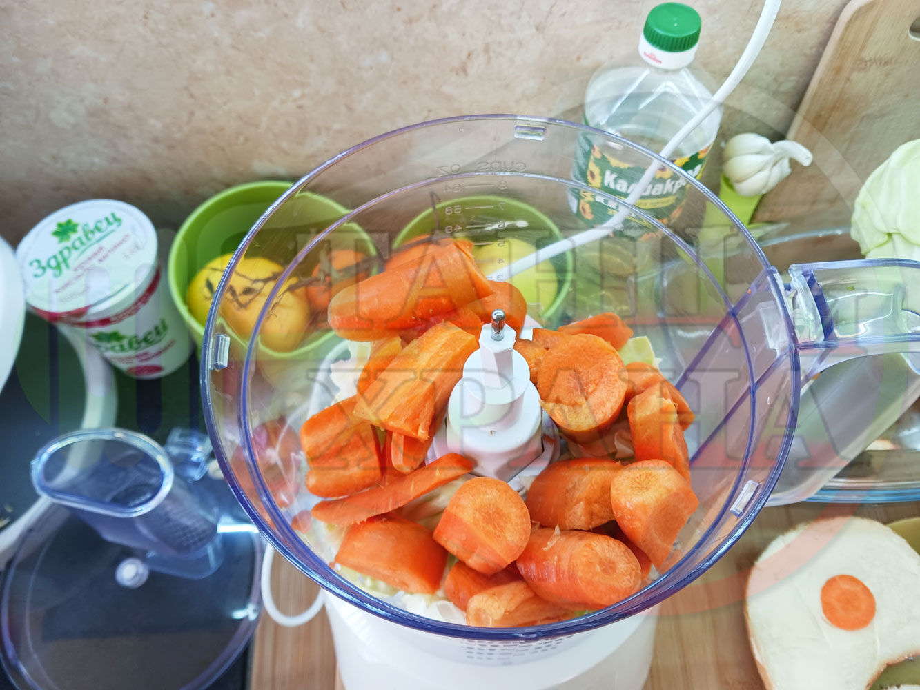 Измийте зелето и морковите, нарежете ги на едро и ги сипете в чопър (заделете част от листата на зелето и нарежете част от морковите на кръгчета за украса). Разбийте с чопъра продуктите за да се овкусят взаимно, сипете водата и отново разбийте с чопъра до образуване на сравнително гъста морковенозелева, хомогенизирана салата (морковена салата).