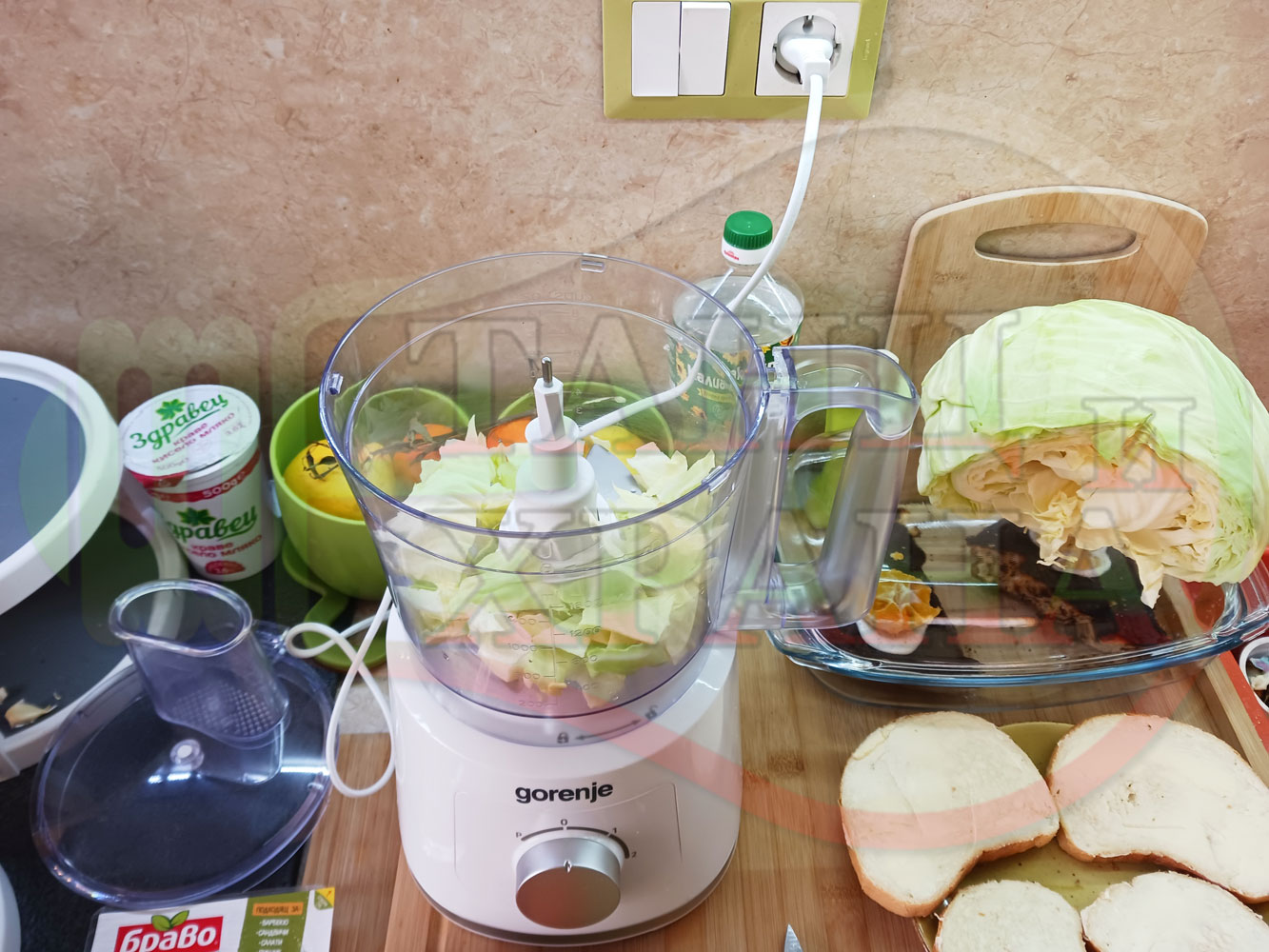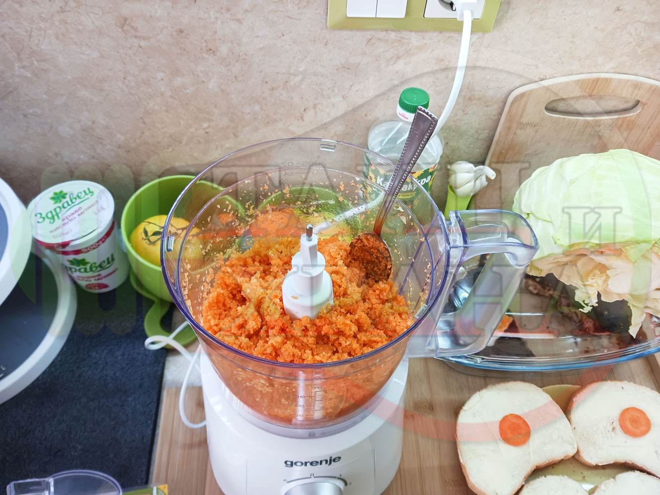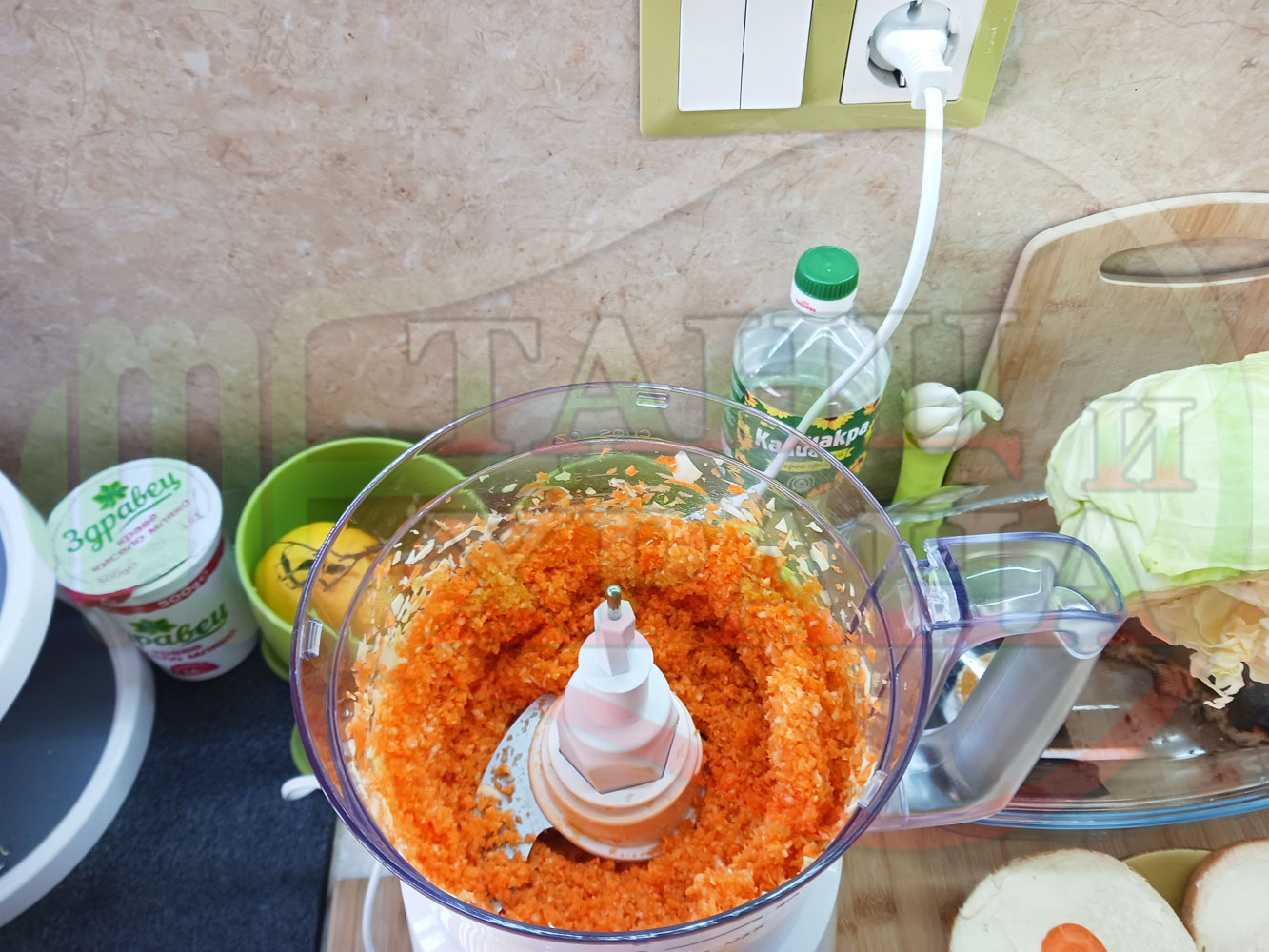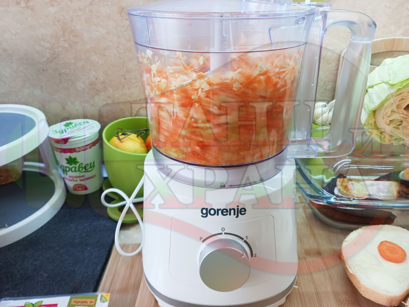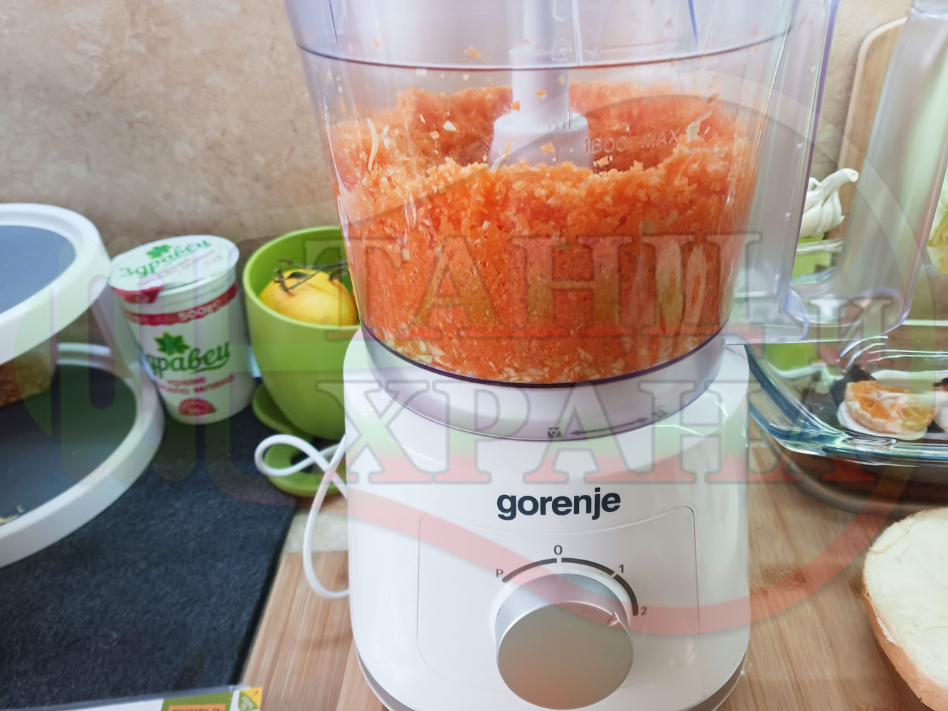 Измийте зелето и морковите, нарежете ги на едро и ги сипете в чопър (заделете част от листата на зелето и нарежете част от морковите на кръгчета за украса). Разбийте с чопъра продуктите за да се овкусят взаимно, сипете водата и отново разбийте с чопъра до образуване на сравнително гъста морковенозелева, хомогенизирана салата (морковена салата).