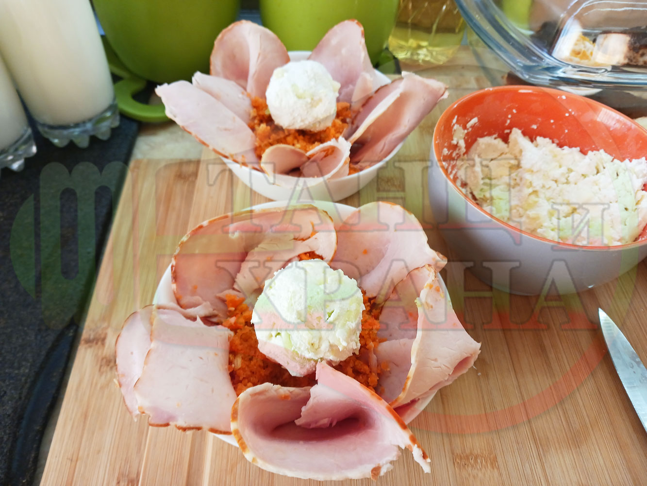 Българска салата "Морковенозелева филеделикатесна с БГсирене" приготвена от моркови и прясно зеле гарнирана със свинско деликатесно филе, топчета от сиреново зелев крем с краве бяло сирене и кисело мляко от България - двукомпонентна