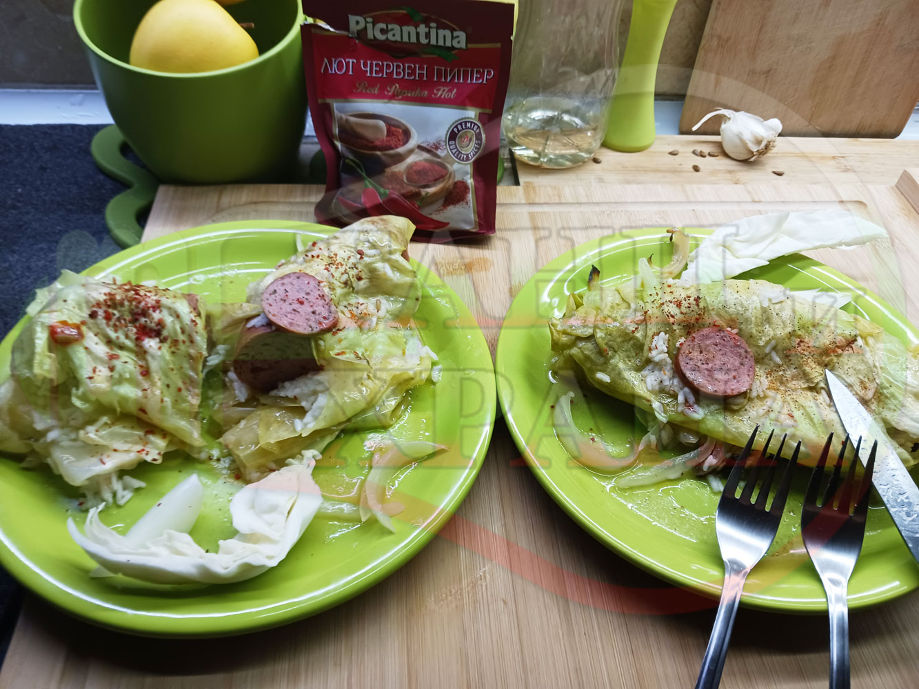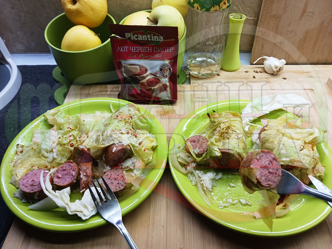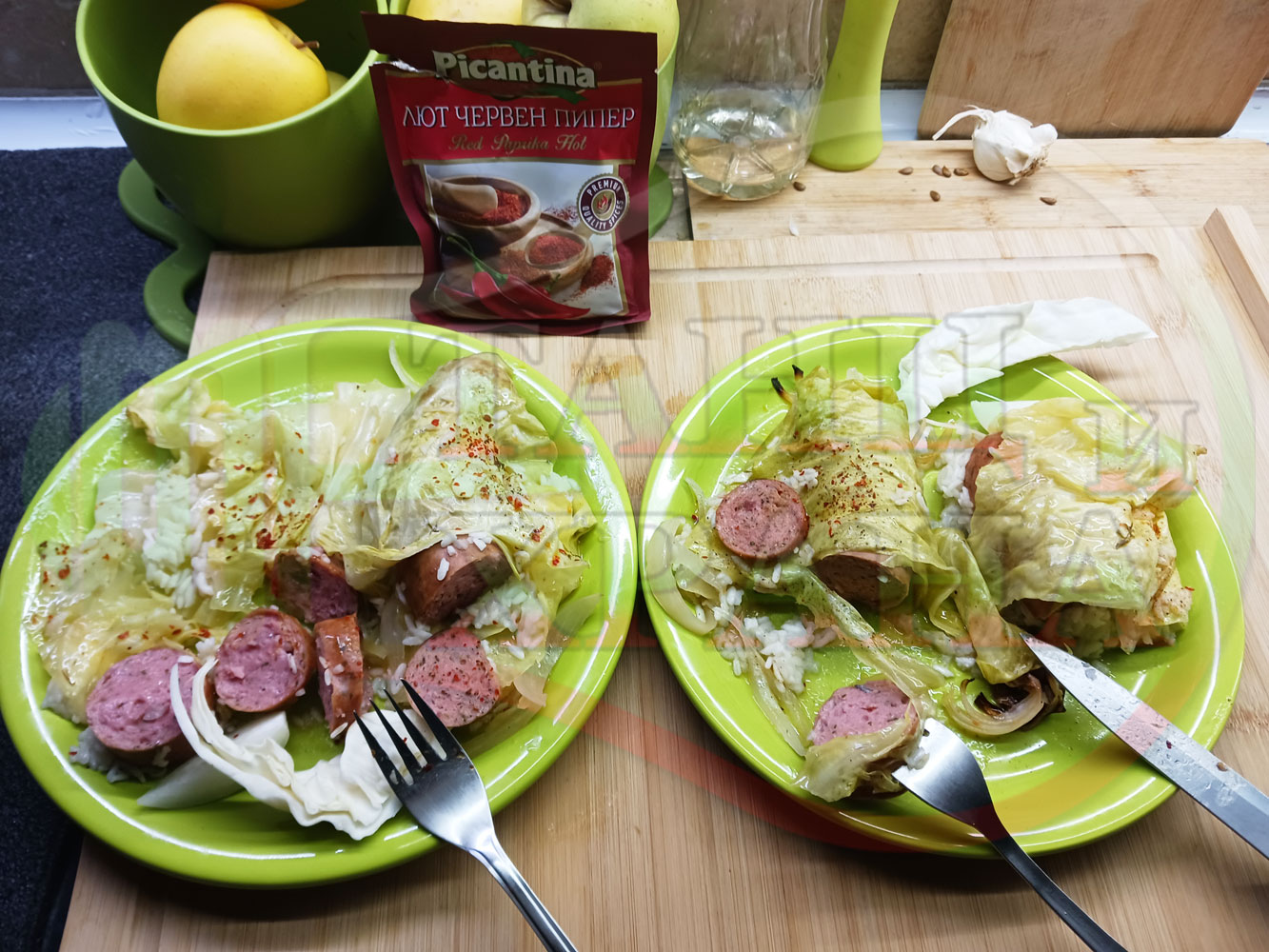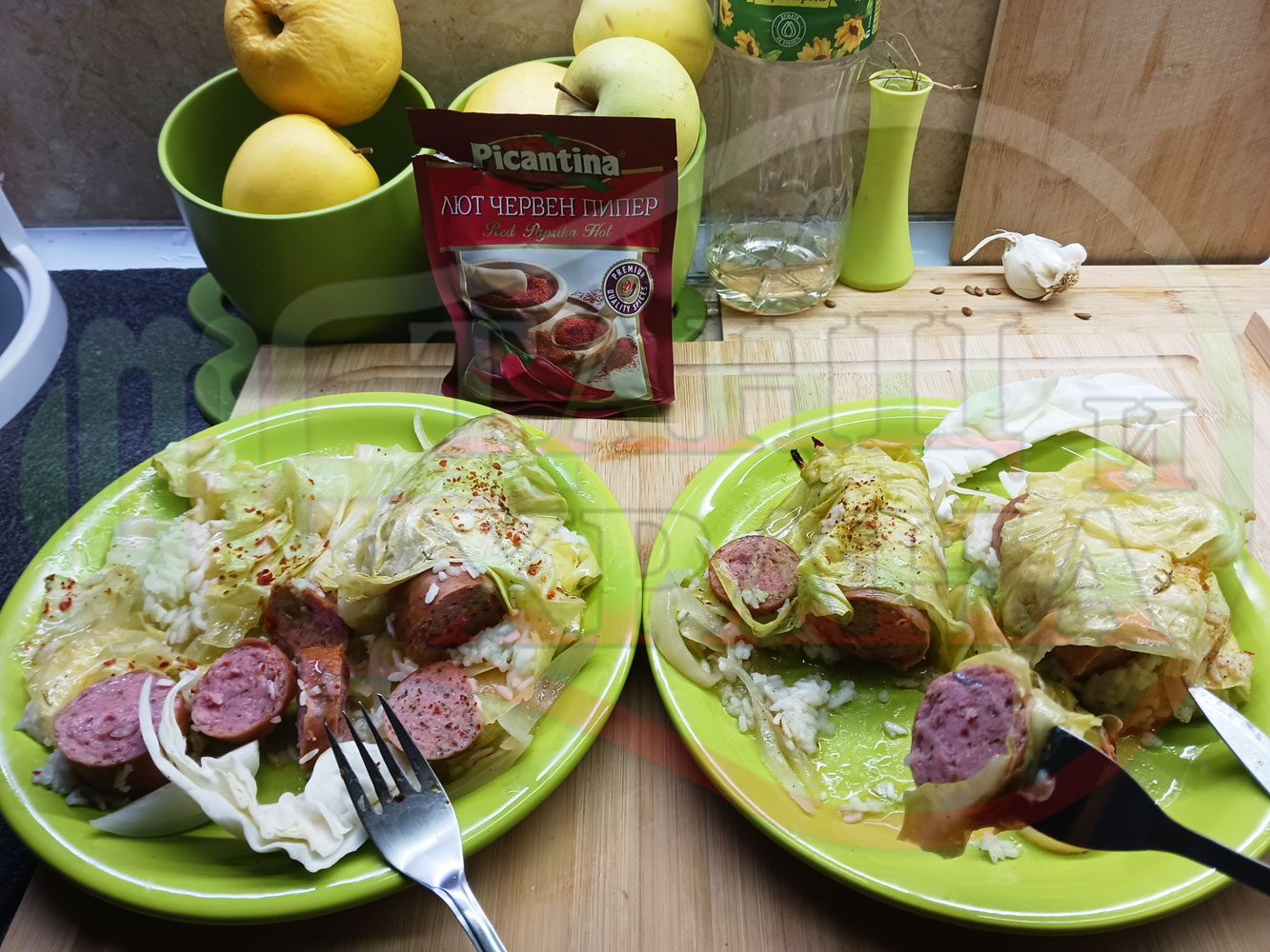 Често в главата ми се въртят повече от една рецепта и всеки път се чудя коя точно да спретна. В крайна сметка реших да приготвя зелеви сарми с ориз с необичайна плънка от родопска наденица (с цели наденици и нарязани на едро парчета), ориз, кромид лук и краве масло без предварително запичане (запържване) на плънката и без сушени мерудии. Овкусих водата с едросмляна лютеница, в която сварих и запекох големите, зелеви сарми и отново се получи невероятна вкусно, вкусна, вкусотия (вкуснотия). ![]()