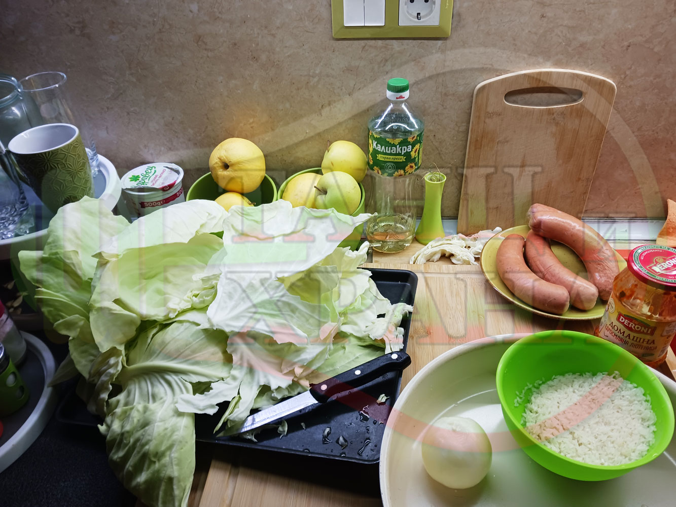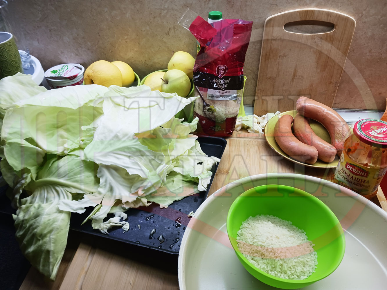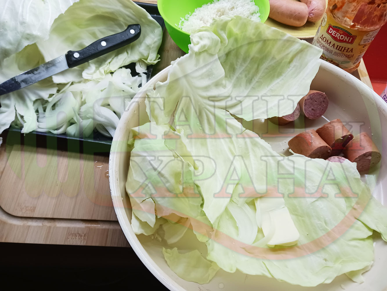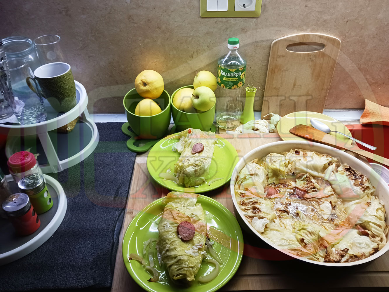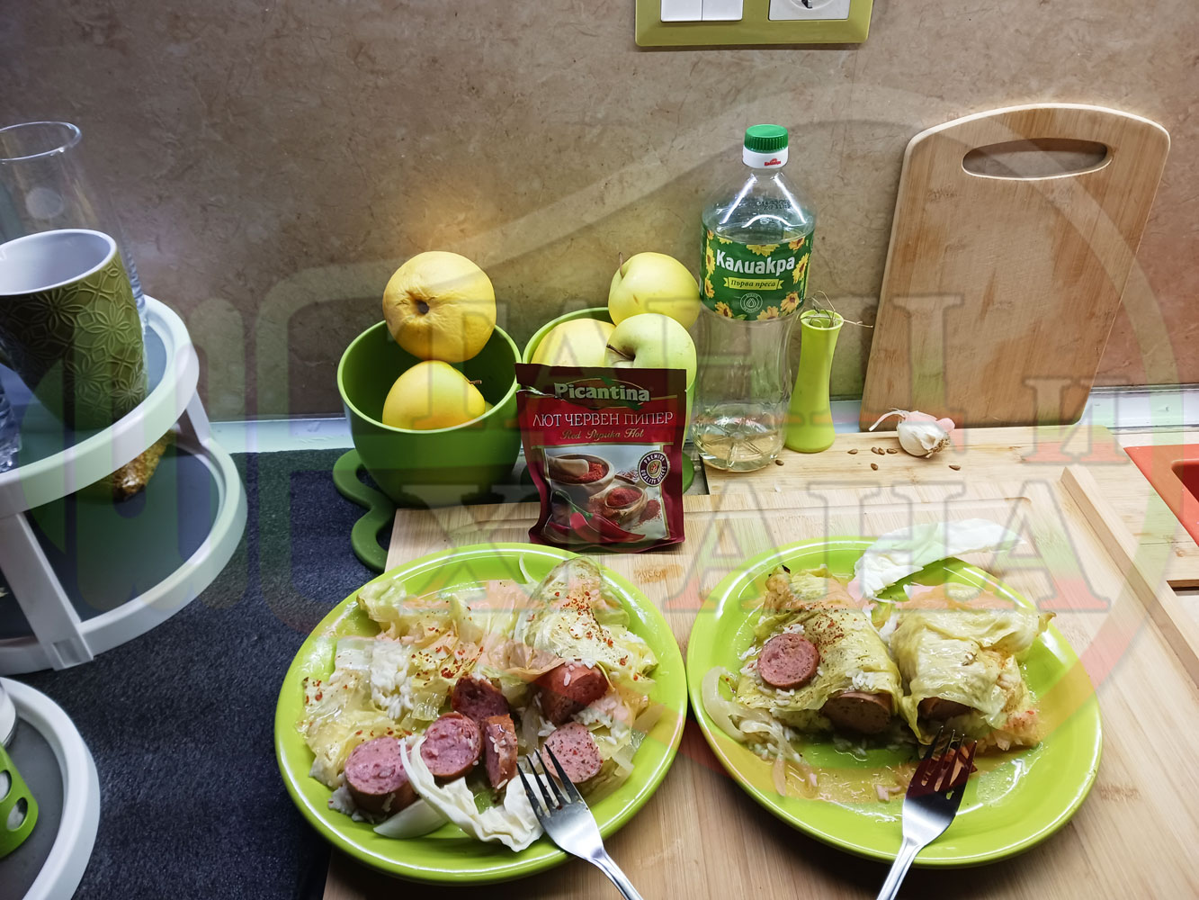 Често в главата ми се въртят повече от една рецепта и всеки път се чудя коя точно да спретна. В крайна сметка реших да приготвя зелеви сарми с ориз с необичайна плънка от родопска наденица (с цели наденици и нарязани на едро парчета), ориз, кромид лук и краве масло без предварително запичане (запържване) на плънката и без сушени мерудии. Овкусих водата с едросмляна лютеница, в която сварих и запекох големите, зелеви сарми и отново се получи невероятна вкусно, вкусна, вкусотия (вкуснотия). ![]()