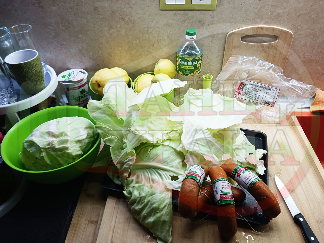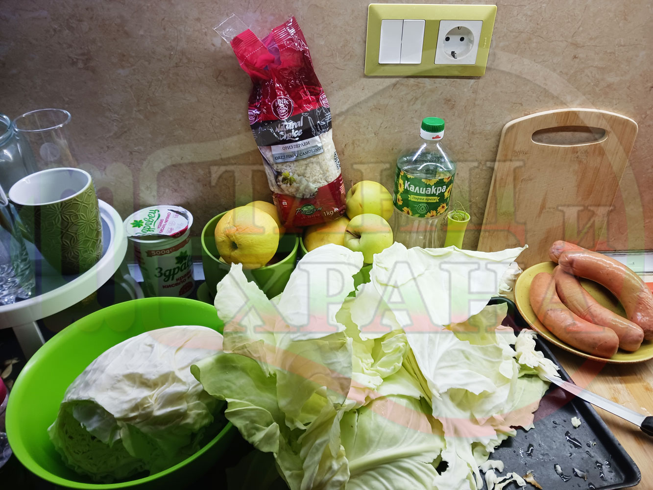 ПРОДУКТИ: Приблизителни количества за зелеви големи сарми "Родопсконаденицови оризови кромидлучени" приготвени с прясно зеле и едросмляна лютеница, запечени на фурна с плънка от ориз, краве масло, кромид лук и цели и нарязани парчета от родопска наденица