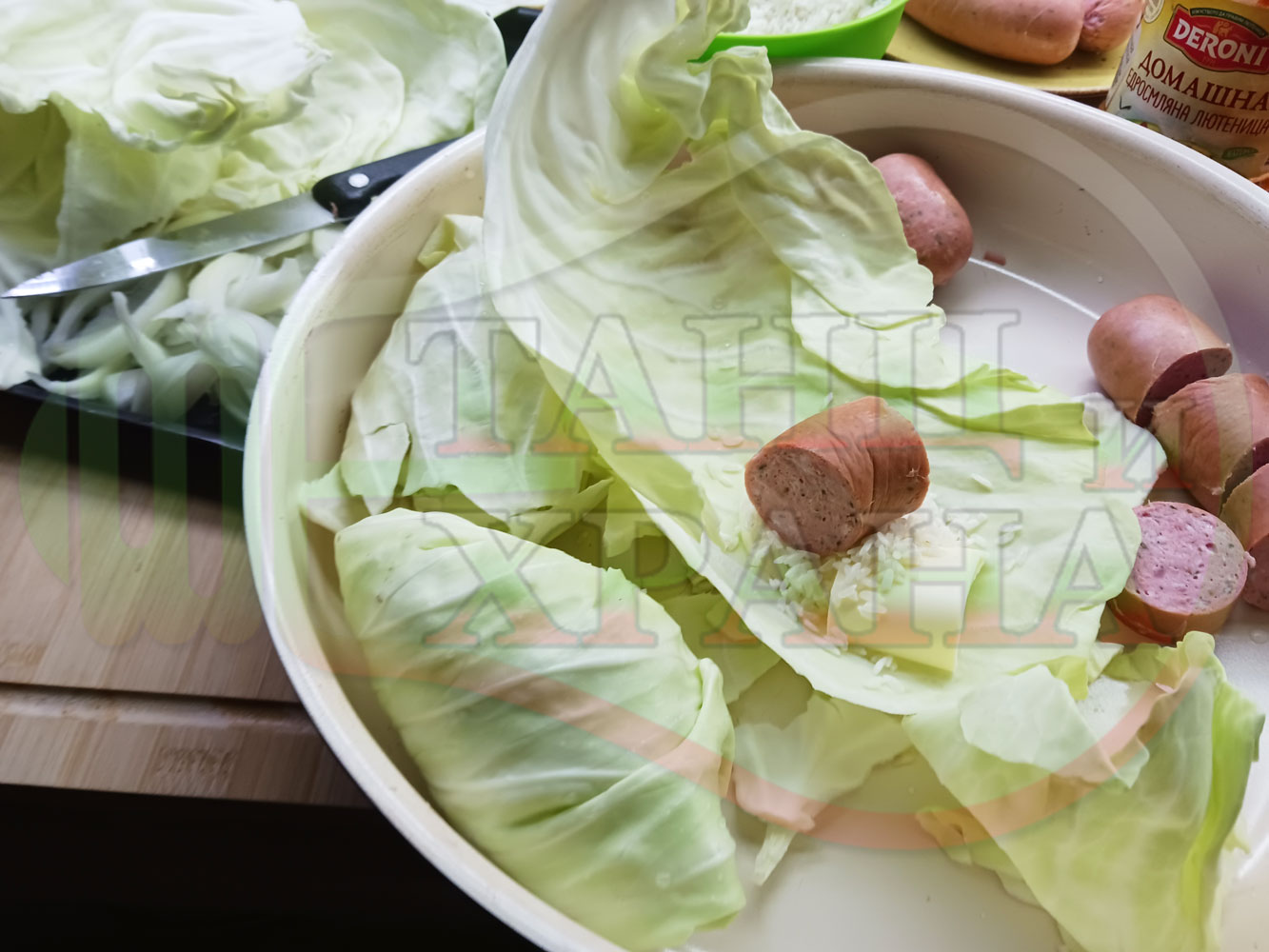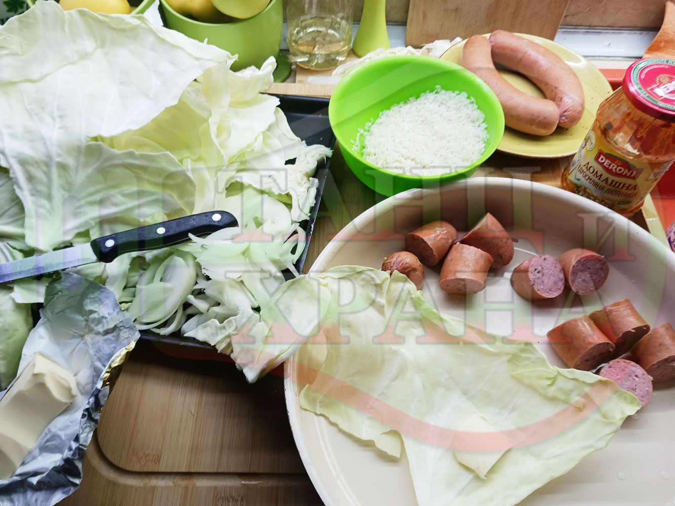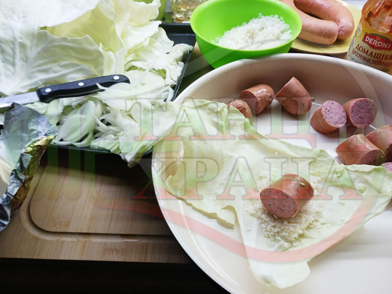 Измийте зелето и отделете внимателно по-големите и цели, предимно външни листа (имайте предвид, че листата от прясно зеле се начупват лесно, в случай че не са предварително омекотени и преминали през термична обработка). Подгответе си по 2 или 3 листа за увиване на сармите заради необичайната плънка (от цели и нарязана на големи парчета наденица). Обелете наденицата от тънката обвивка, измийте я и нарежете 2 от надениците на 5 приблизително равни парчета, а останалите 2 наденици ги оставете цели (подгответе по-големи листа за целите наденици). Измийте ориза с топла към гореща вода от чешмата поне 1 или повече пъти и изхвърлете водата след всяко измиване. Накиснете ориза в гореща вода за поне 10 минути за да се омекоти и леко да набъбне. Обелете, измийте и нарежете кромид лука на ивички и оставете кравето масло на стайна температура за поне 5 минути (заделете вътрешната част на лука и от зелето за украса).